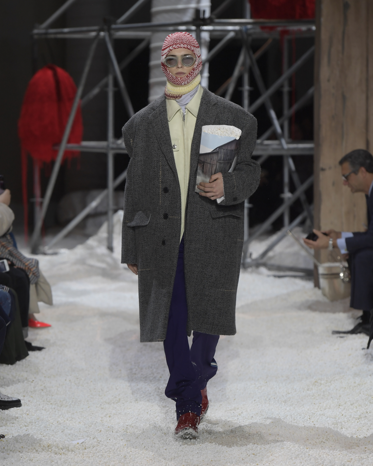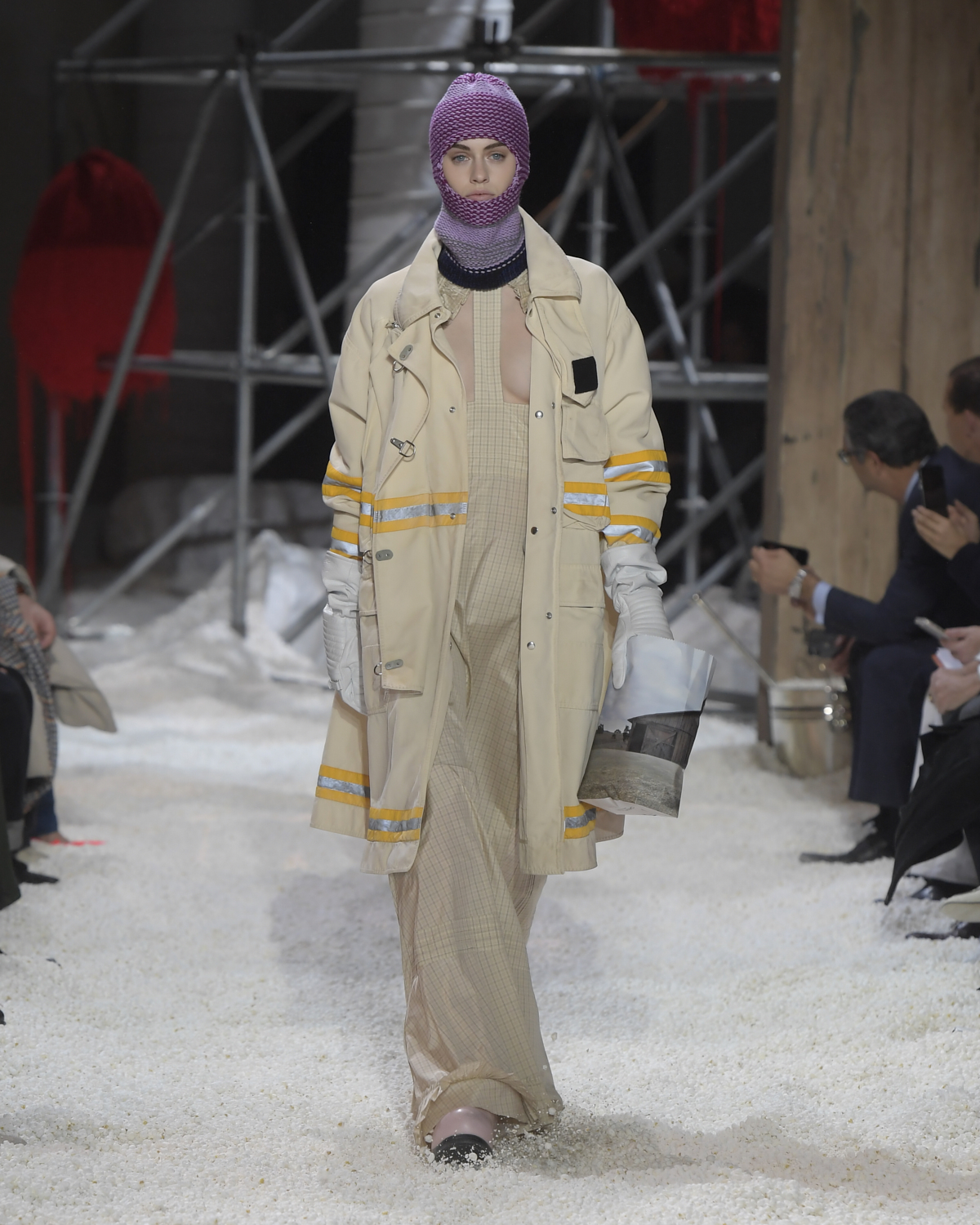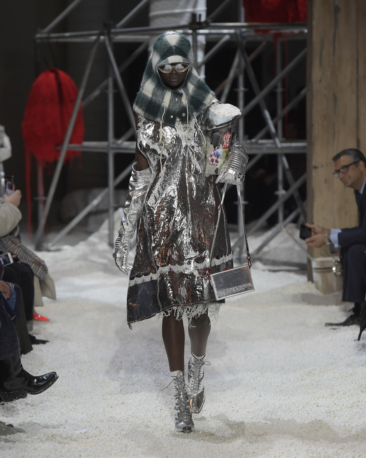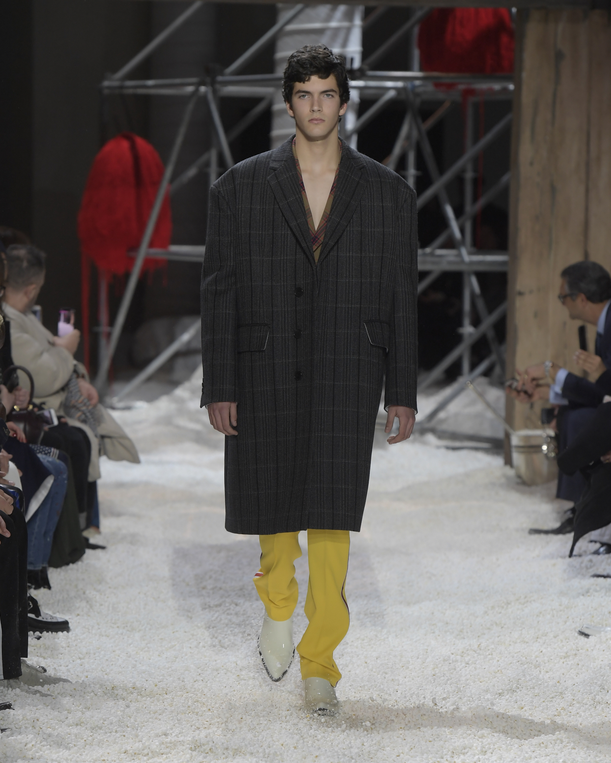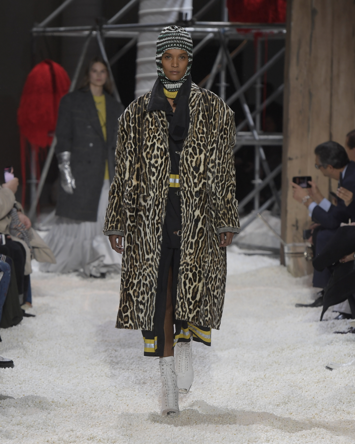 Titled LANDSCAPES, the Fall 2018 CALVIN KLEIN 205W39NYC show was staged in an epic and unreal terrain simultaneously recalling a cinematic soundstage. The backdrop draws on CALVIN KLEIN’S recent history, but reconfigured: fragments of Sterling Ruby’s installations for the brand appeared against parts of the nineteenth century prairie barn featured in the CALVIN KLEIN 205W39NYC Spring 2018 campaign; the barn walls are papered with billboard-scale images of the artworks by Andy Warhol used in the same collection; beside them, air-duct tubing emerges, an alien touch of the scientific or laboratorial. The floor is carpeted with deep drifts of popcorn: from a distance, it resembles snow.