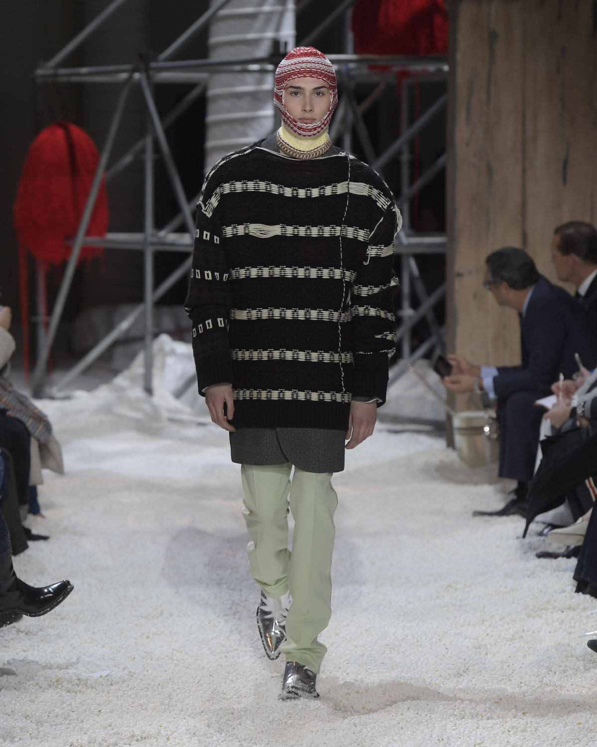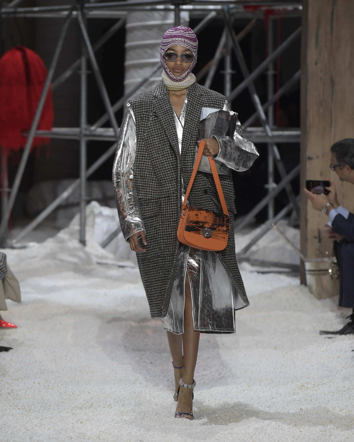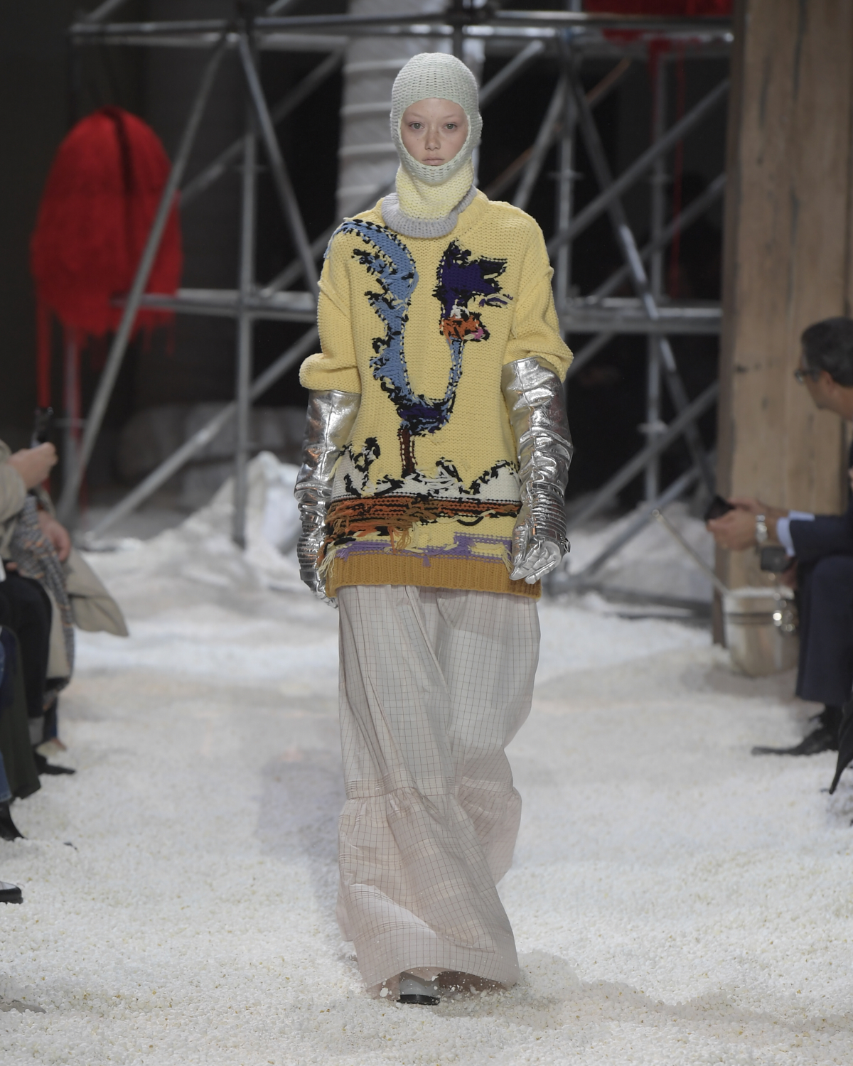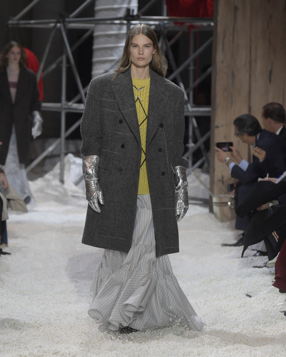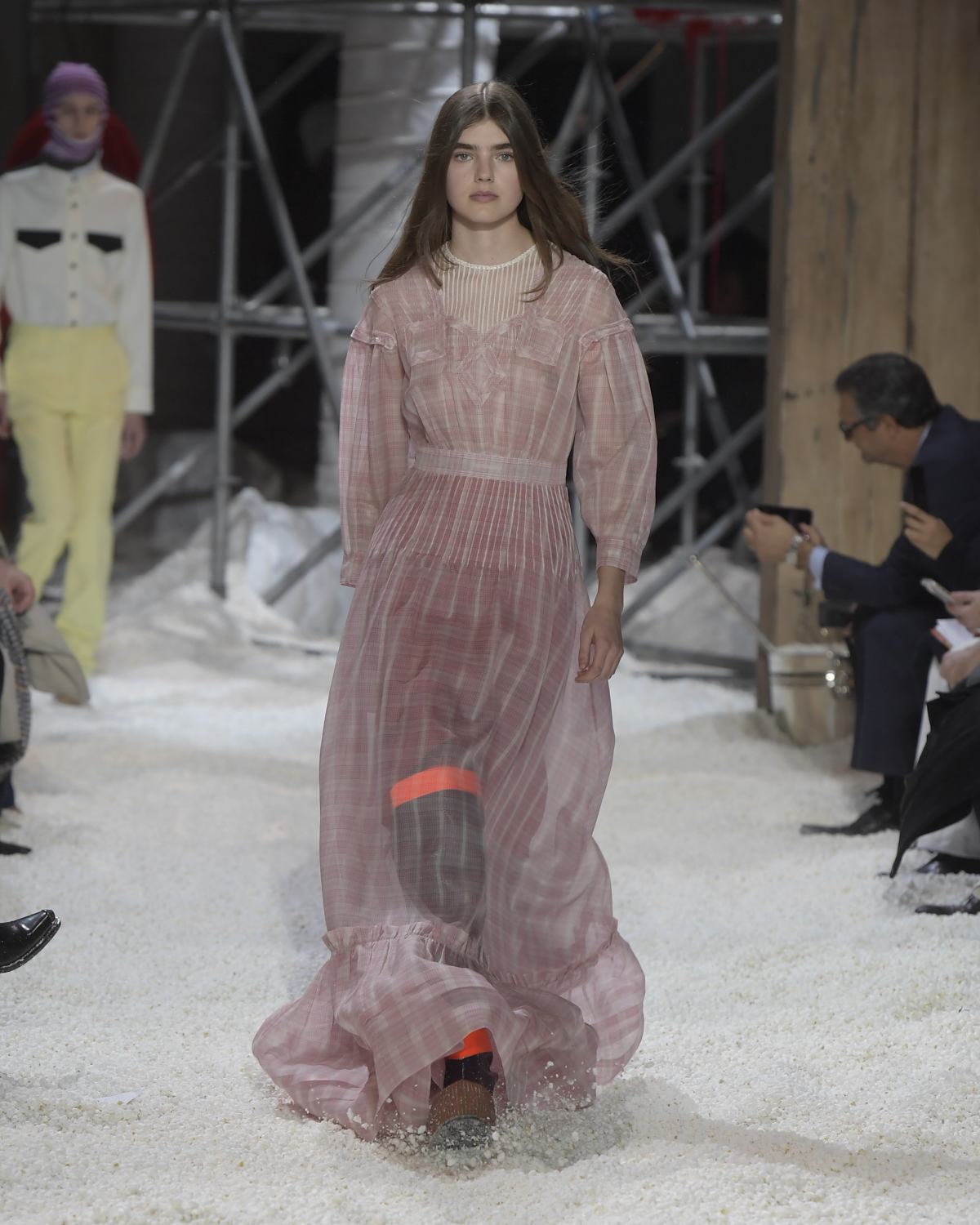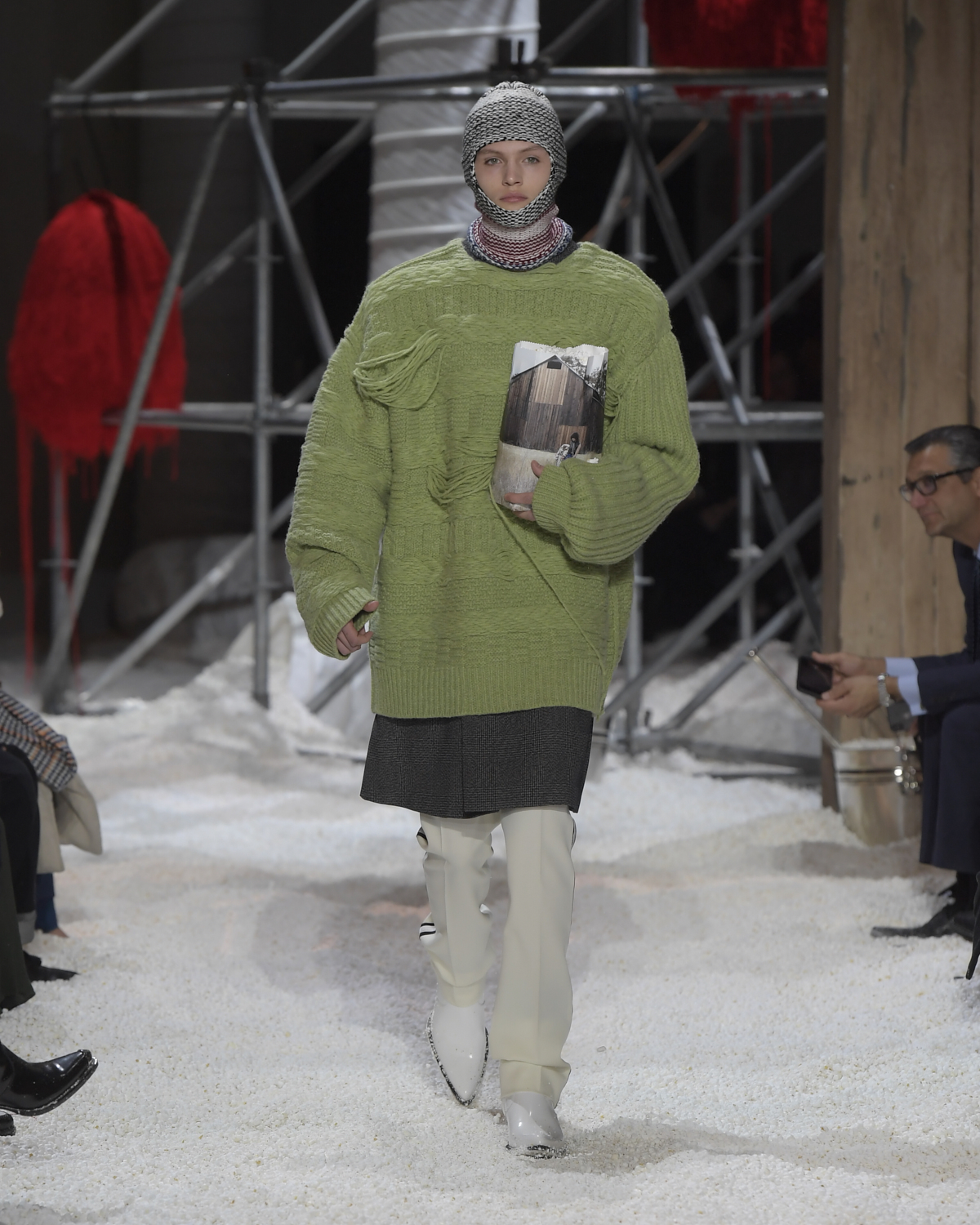 Titled LANDSCAPES, the Fall 2018 CALVIN KLEIN 205W39NYC show was staged in an epic and unreal terrain simultaneously recalling a cinematic soundstage. The backdrop draws on CALVIN KLEIN’S recent history, but reconfigured: fragments of Sterling Ruby’s installations for the brand appeared against parts of the nineteenth century prairie barn featured in the CALVIN KLEIN 205W39NYC Spring 2018 campaign; the barn walls are papered with billboard-scale images of the artworks by Andy Warhol used in the same collection; beside them, air-duct tubing emerges, an alien touch of the scientific or laboratorial. The floor is carpeted with deep drifts of popcorn: from a distance, it resembles snow.