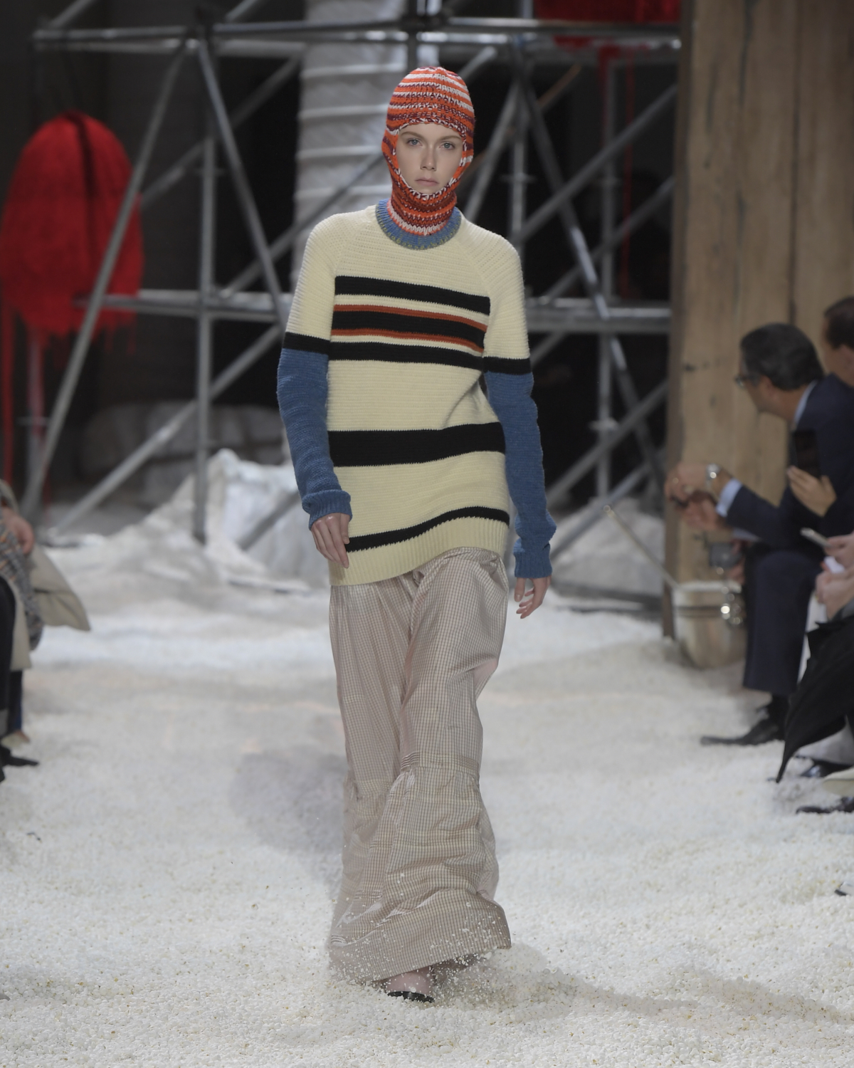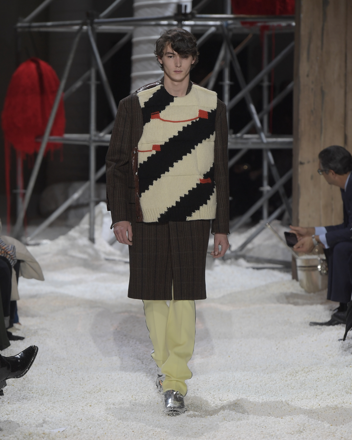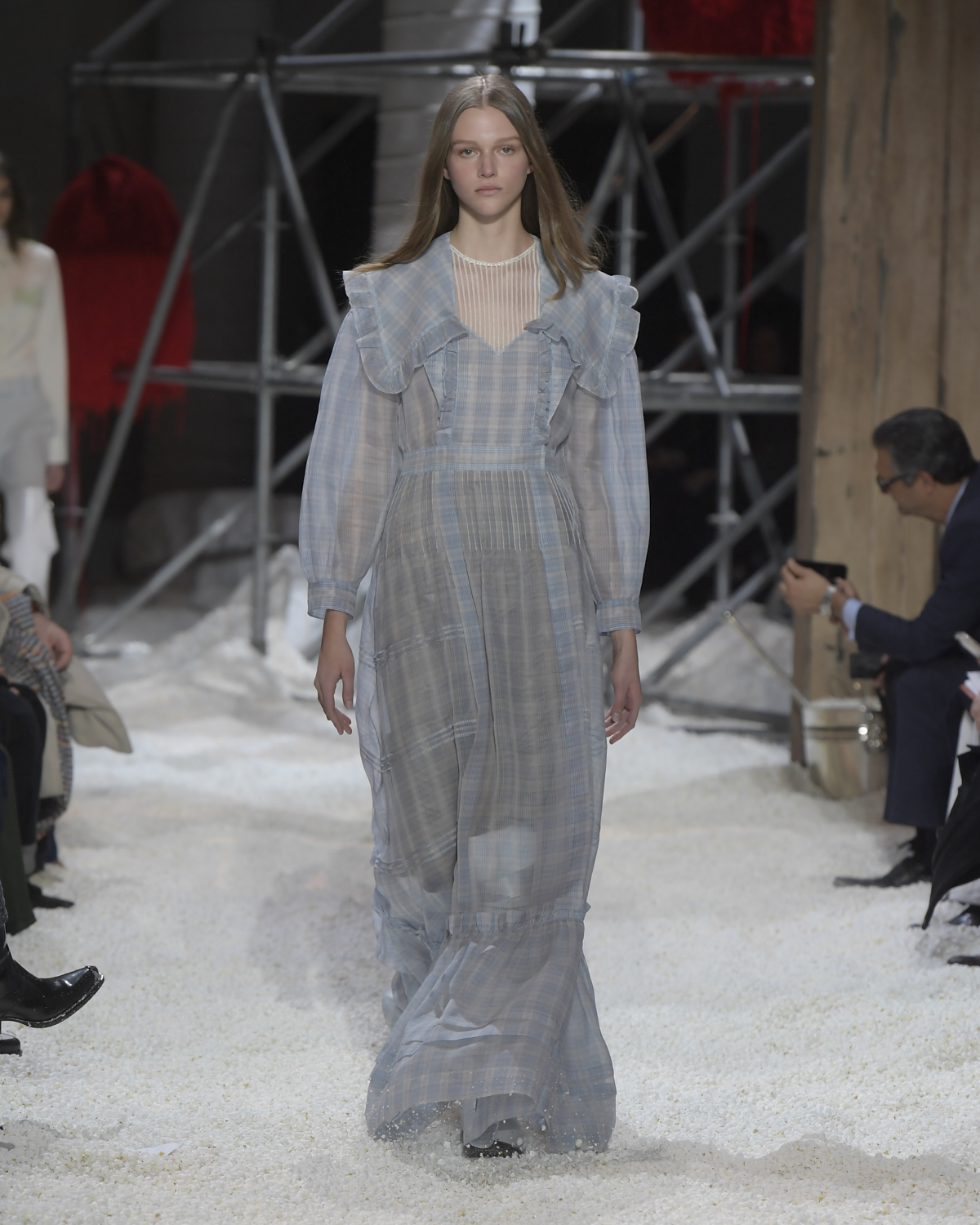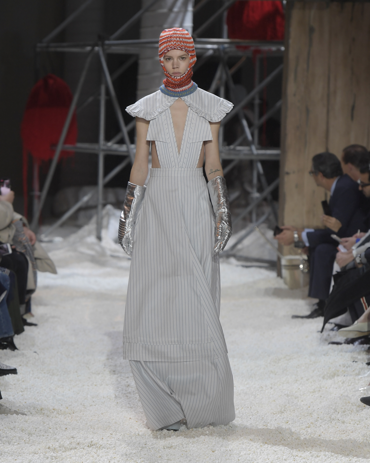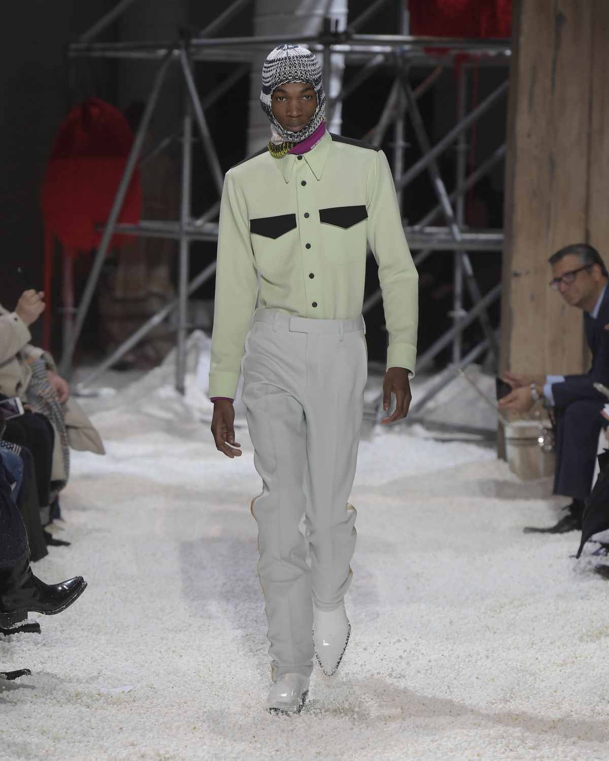 Titled LANDSCAPES, the Fall 2018 CALVIN KLEIN 205W39NYC show was staged in an epic and unreal terrain simultaneously recalling a cinematic soundstage. The backdrop draws on CALVIN KLEIN’S recent history, but reconfigured: fragments of Sterling Ruby’s installations for the brand appeared against parts of the nineteenth century prairie barn featured in the CALVIN KLEIN 205W39NYC Spring 2018 campaign; the barn walls are papered with billboard-scale images of the artworks by Andy Warhol used in the same collection; beside them, air-duct tubing emerges, an alien touch of the scientific or laboratorial. The floor is carpeted with deep drifts of popcorn: from a distance, it resembles snow.