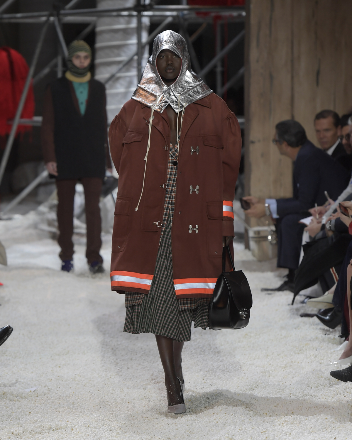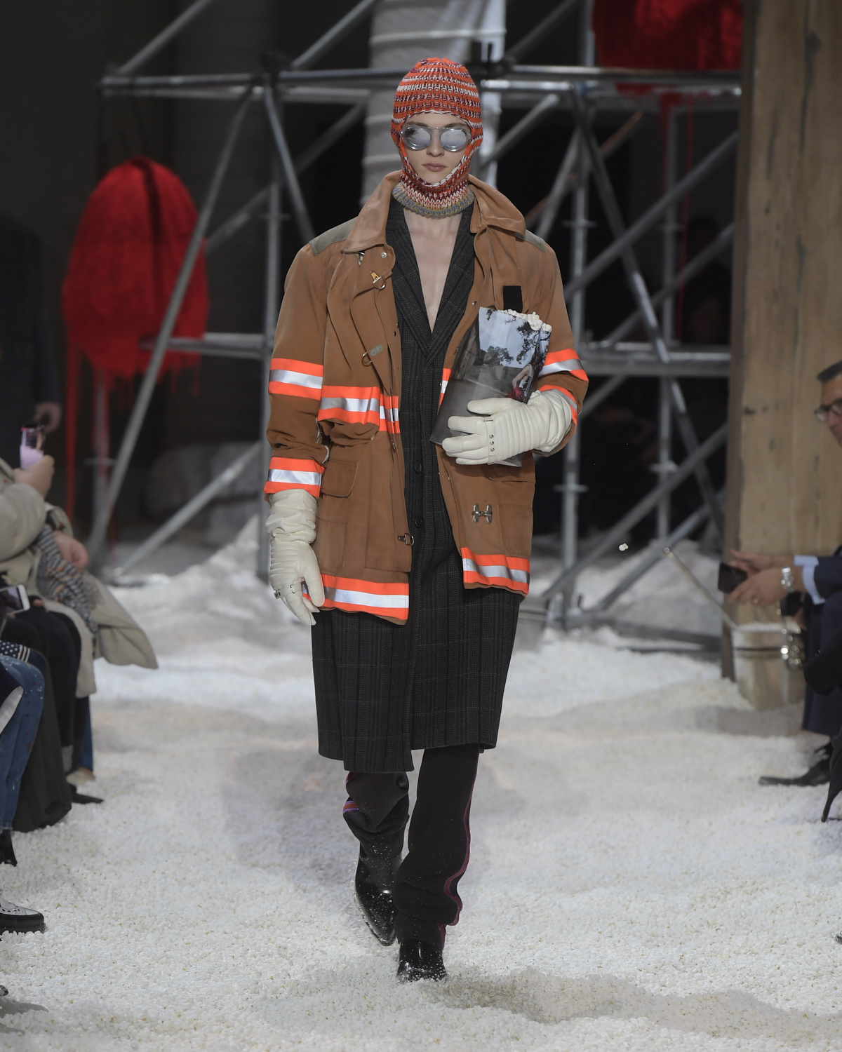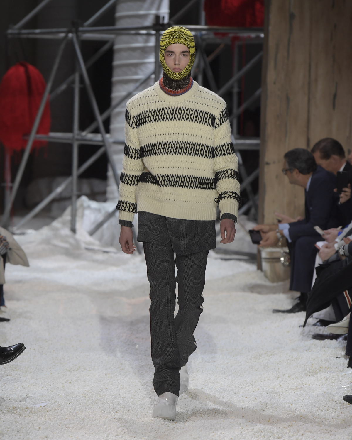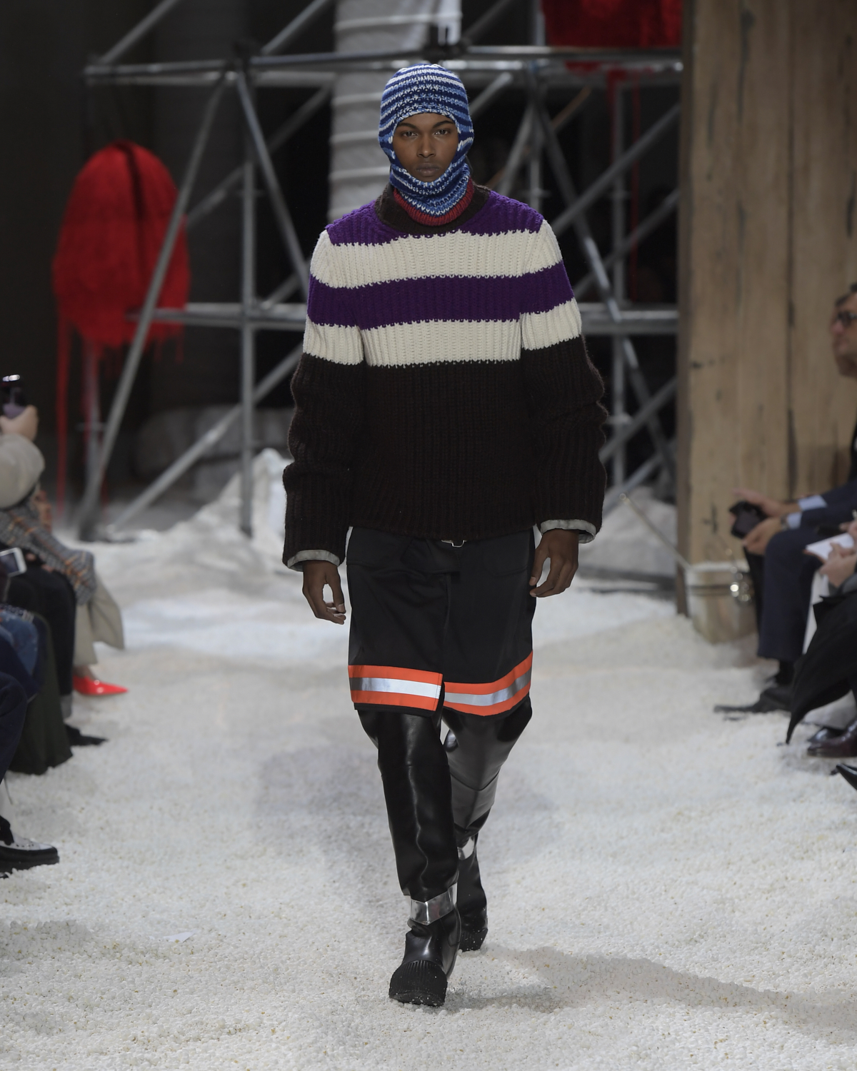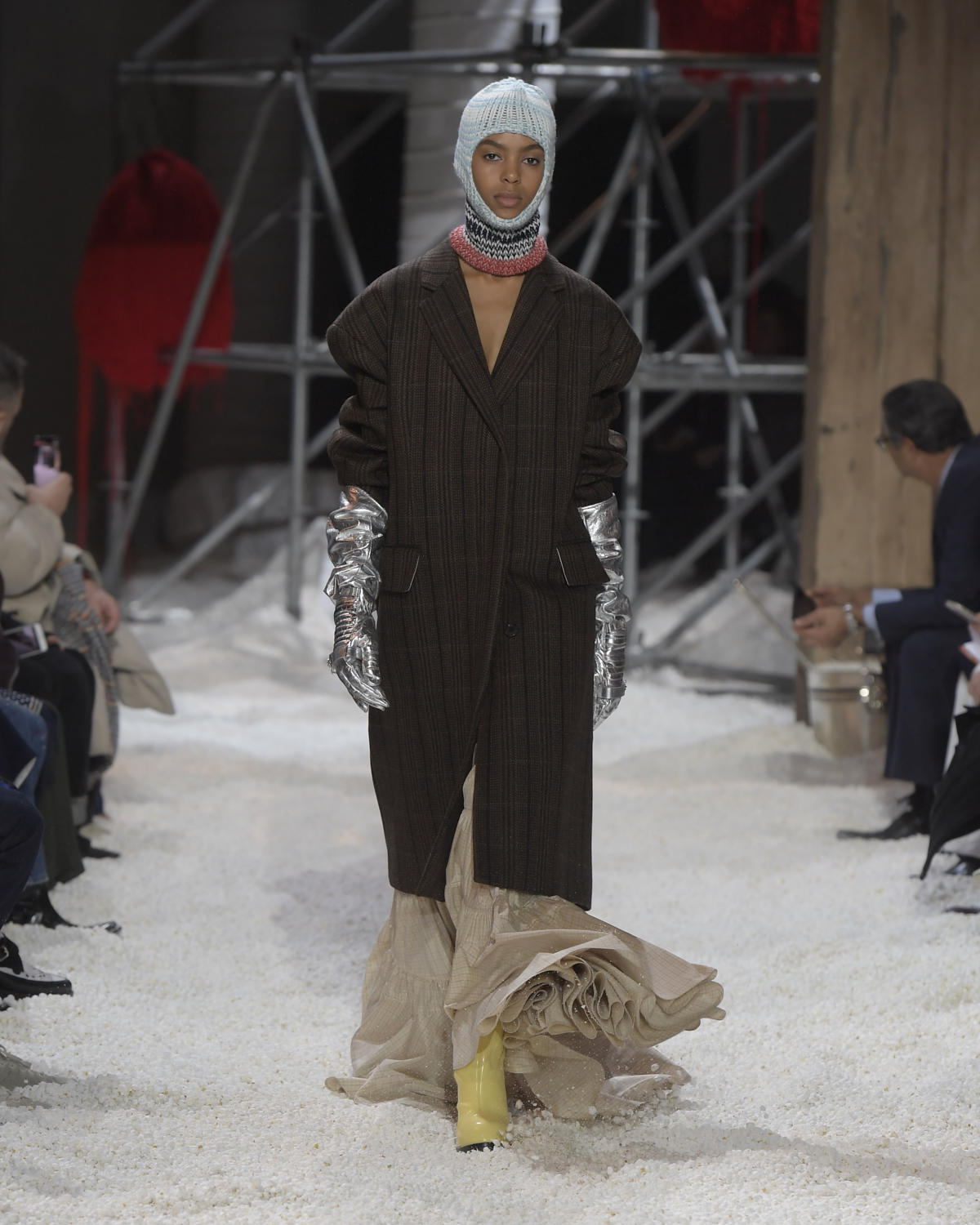 Titled LANDSCAPES, the Fall 2018 CALVIN KLEIN 205W39NYC show was staged in an epic and unreal terrain simultaneously recalling a cinematic soundstage. The backdrop draws on CALVIN KLEIN’S recent history, but reconfigured: fragments of Sterling Ruby’s installations for the brand appeared against parts of the nineteenth century prairie barn featured in the CALVIN KLEIN 205W39NYC Spring 2018 campaign; the barn walls are papered with billboard-scale images of the artworks by Andy Warhol used in the same collection; beside them, air-duct tubing emerges, an alien touch of the scientific or laboratorial. The floor is carpeted with deep drifts of popcorn: from a distance, it resembles snow.