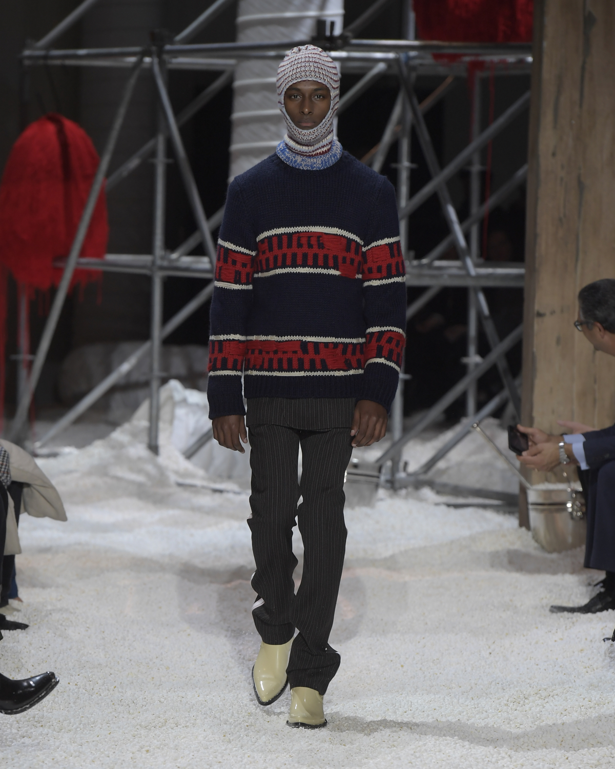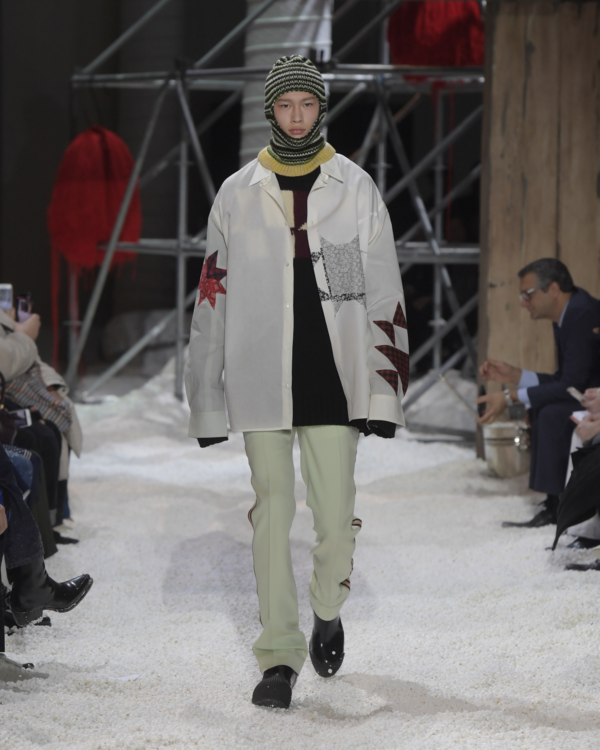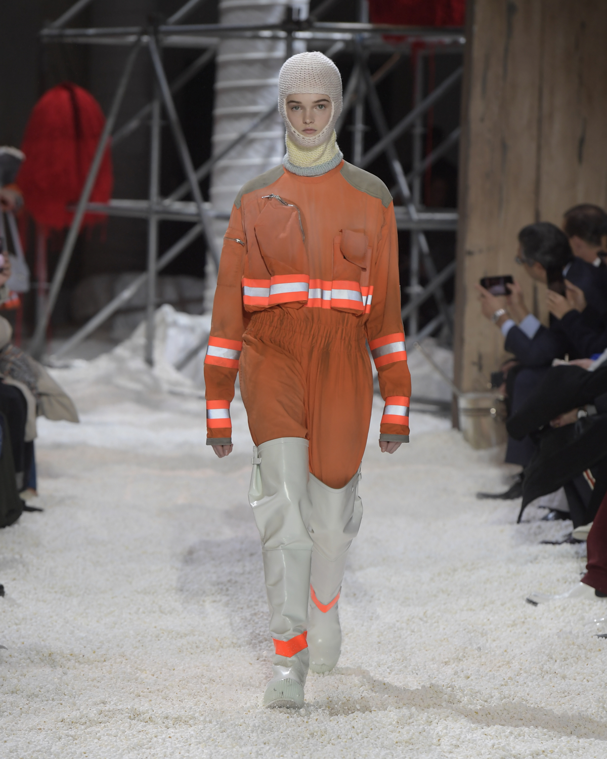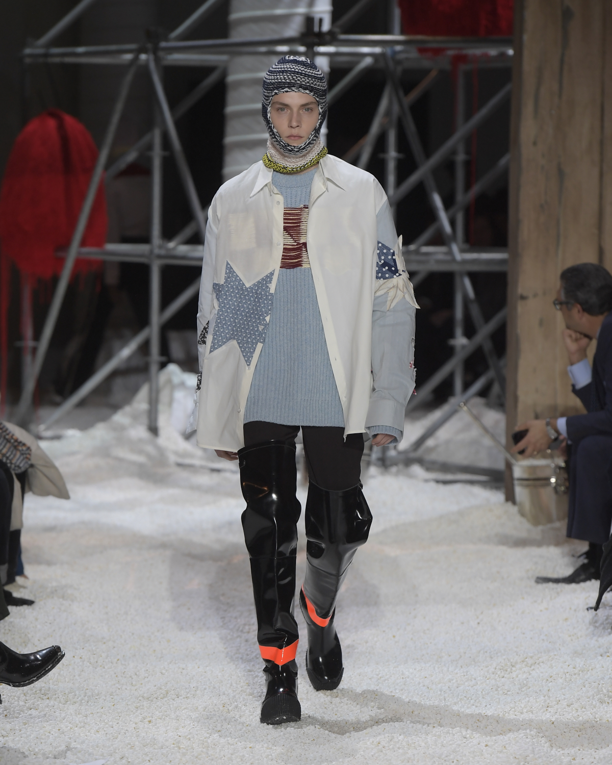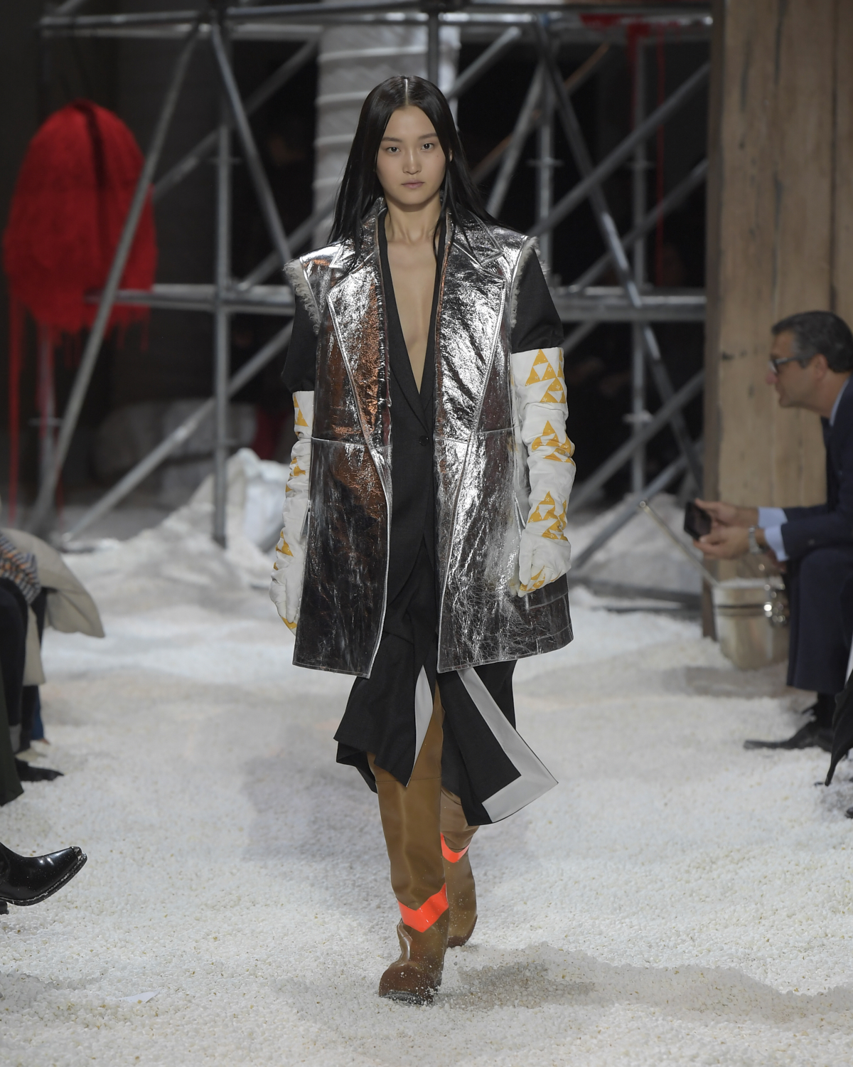 Titled LANDSCAPES, the Fall 2018 CALVIN KLEIN 205W39NYC show was staged in an epic and unreal terrain simultaneously recalling a cinematic soundstage. The backdrop draws on CALVIN KLEIN’S recent history, but reconfigured: fragments of Sterling Ruby’s installations for the brand appeared against parts of the nineteenth century prairie barn featured in the CALVIN KLEIN 205W39NYC Spring 2018 campaign; the barn walls are papered with billboard-scale images of the artworks by Andy Warhol used in the same collection; beside them, air-duct tubing emerges, an alien touch of the scientific or laboratorial. The floor is carpeted with deep drifts of popcorn: from a distance, it resembles snow.