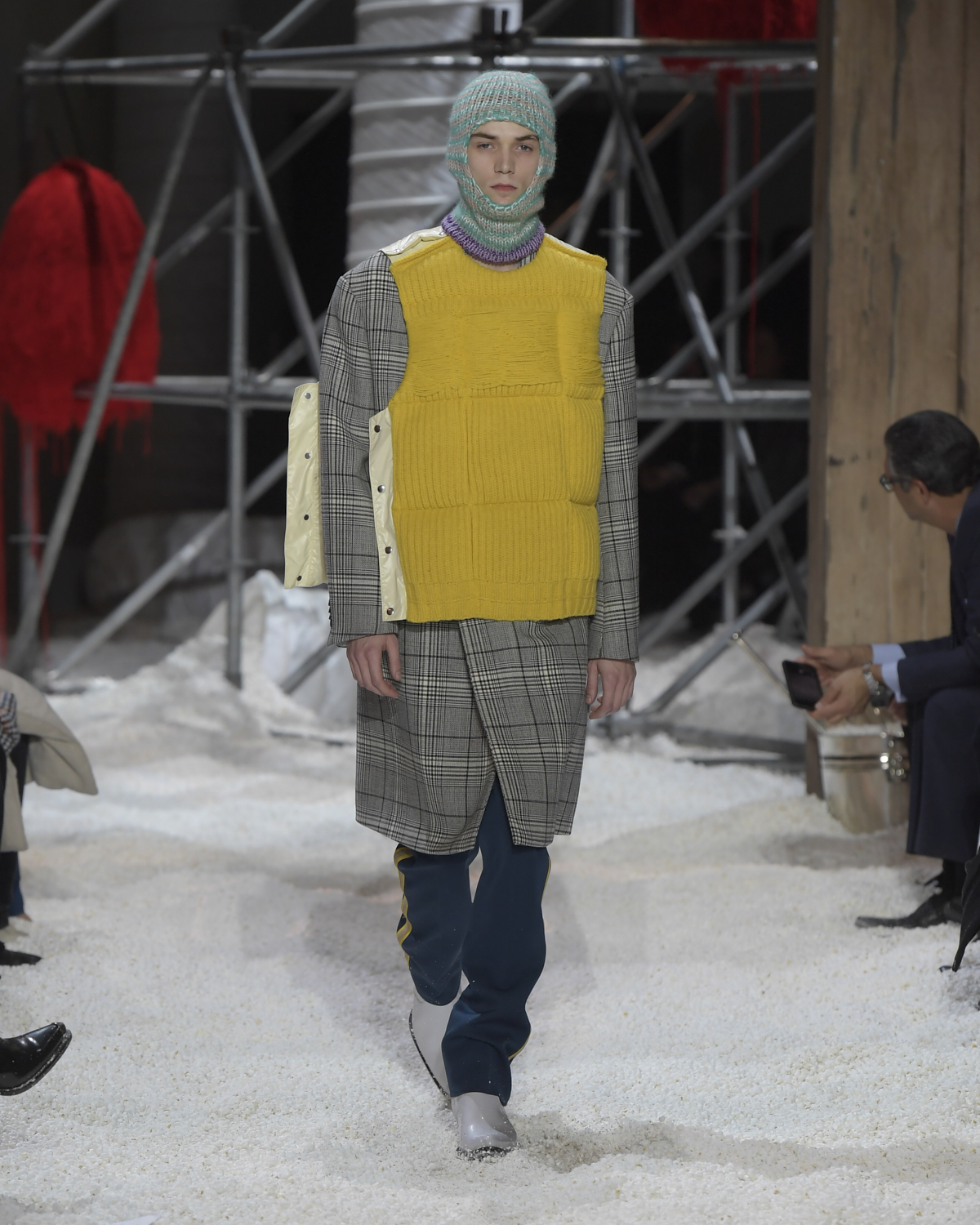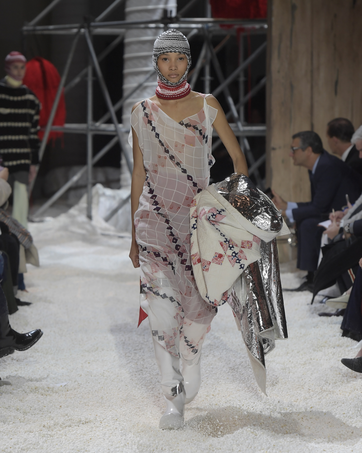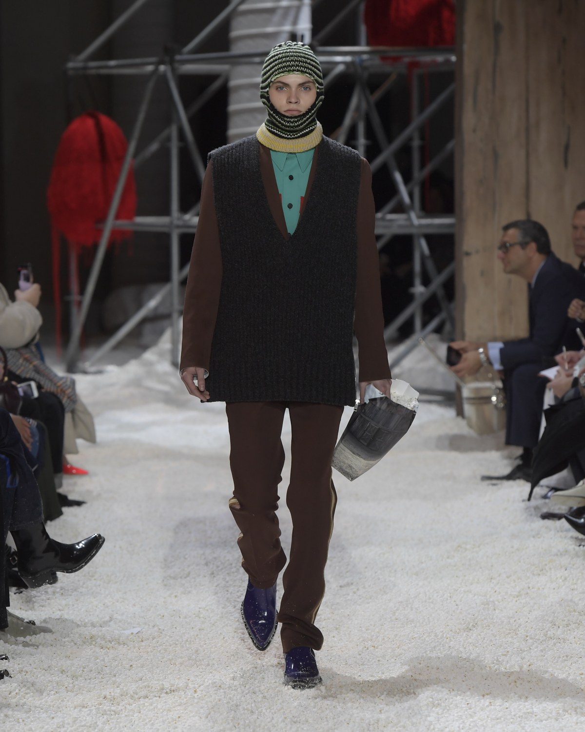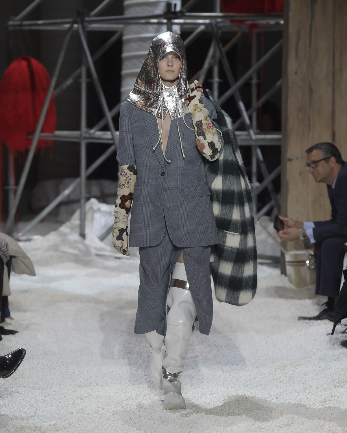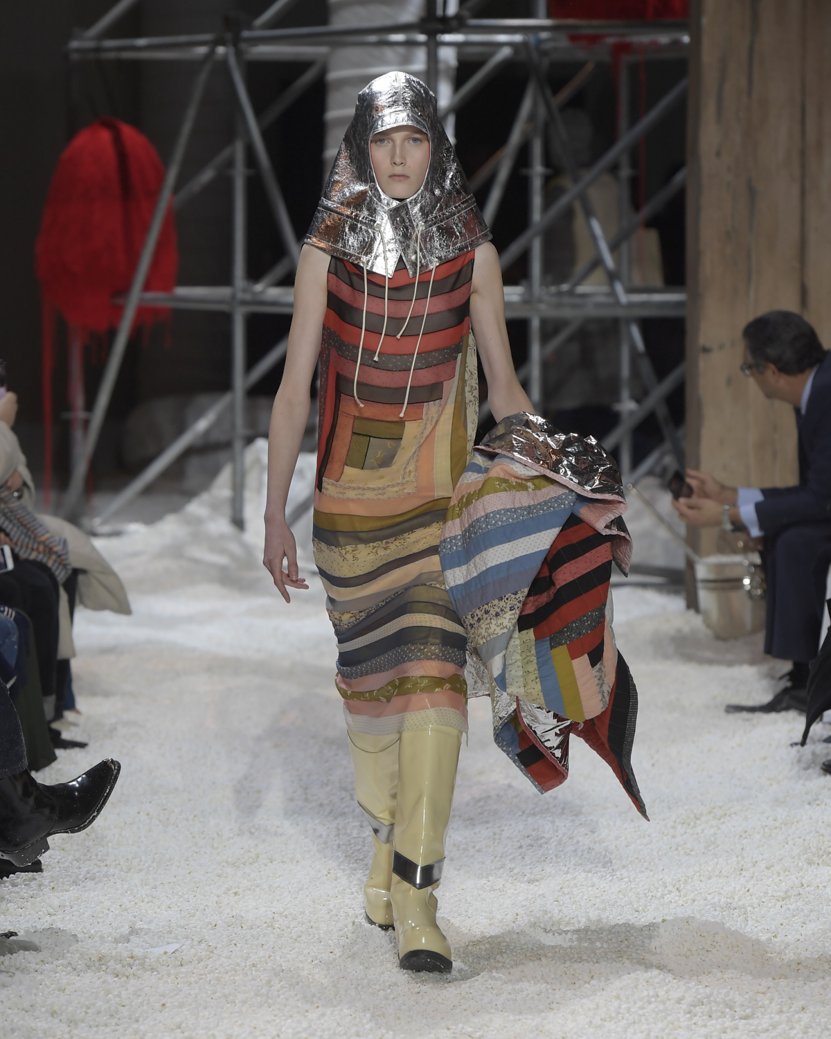 Titled LANDSCAPES, the Fall 2018 CALVIN KLEIN 205W39NYC show was staged in an epic and unreal terrain simultaneously recalling a cinematic soundstage. The backdrop draws on CALVIN KLEIN’S recent history, but reconfigured: fragments of Sterling Ruby’s installations for the brand appeared against parts of the nineteenth century prairie barn featured in the CALVIN KLEIN 205W39NYC Spring 2018 campaign; the barn walls are papered with billboard-scale images of the artworks by Andy Warhol used in the same collection; beside them, air-duct tubing emerges, an alien touch of the scientific or laboratorial. The floor is carpeted with deep drifts of popcorn: from a distance, it resembles snow.