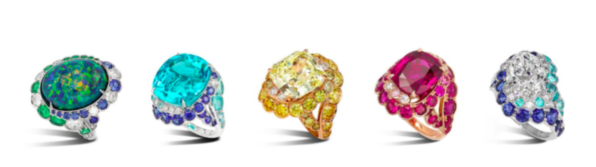 Cinq anneaux exceptionnels présentant fièrement les plus précieuses colorées, en un exquis tourbillon coloré.