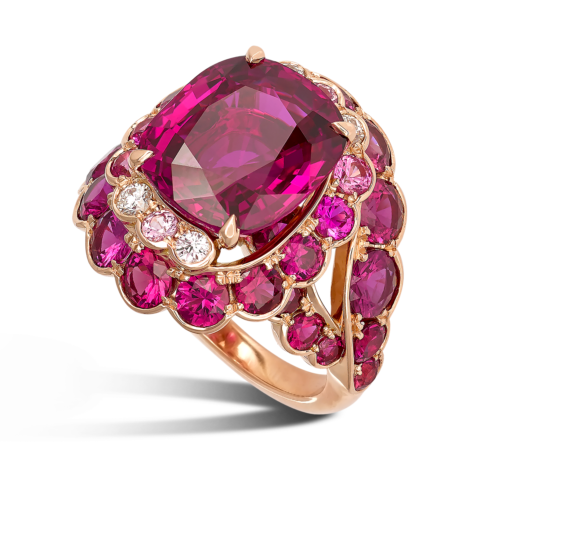 Un rubis coussin de 7.13ct de couleur intense, symbole de l’amour et de la passion. Ici son rouge framboise joue avec quelques diamants blancs et saphirs roses. Serti sur or rose.