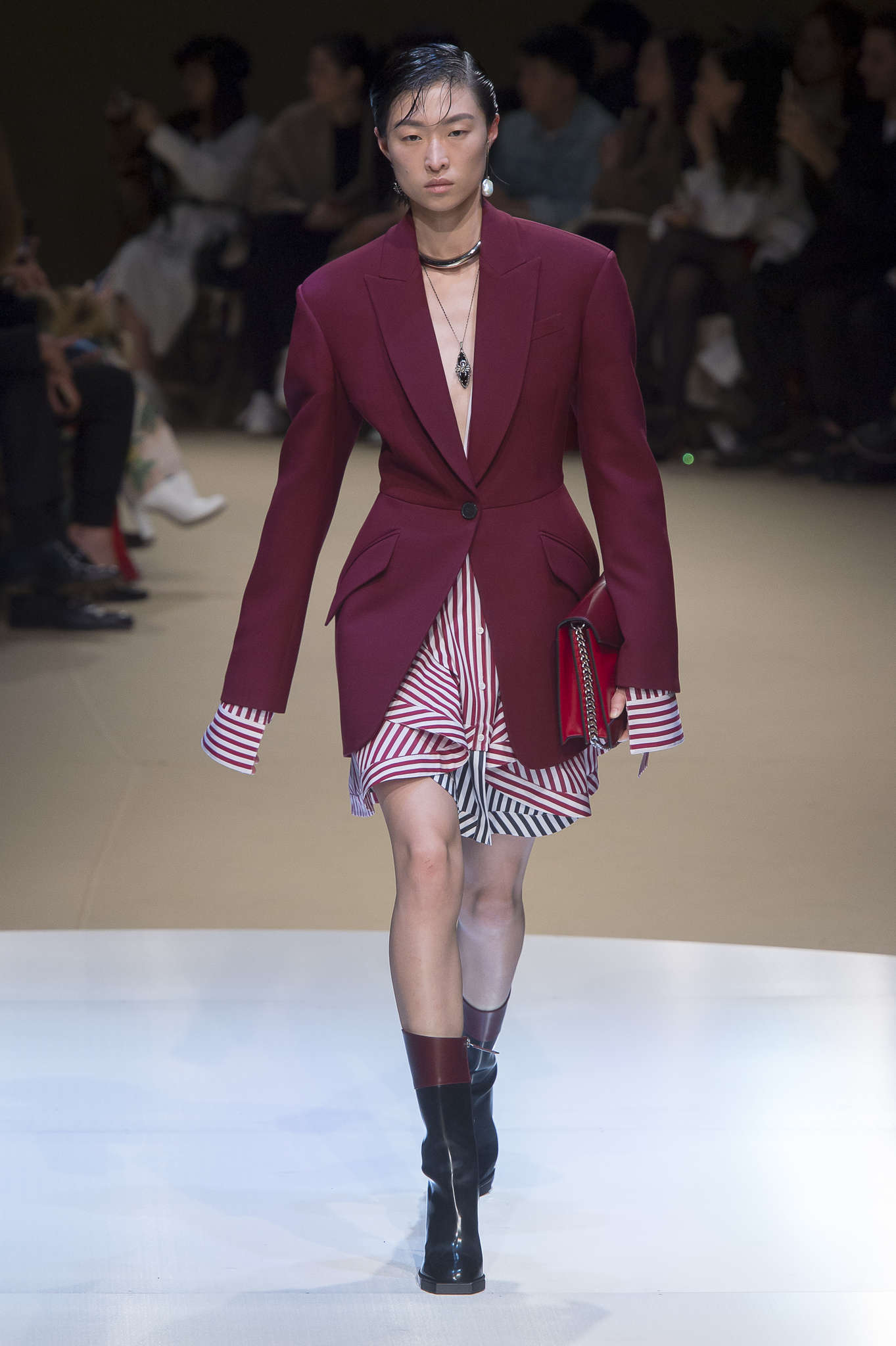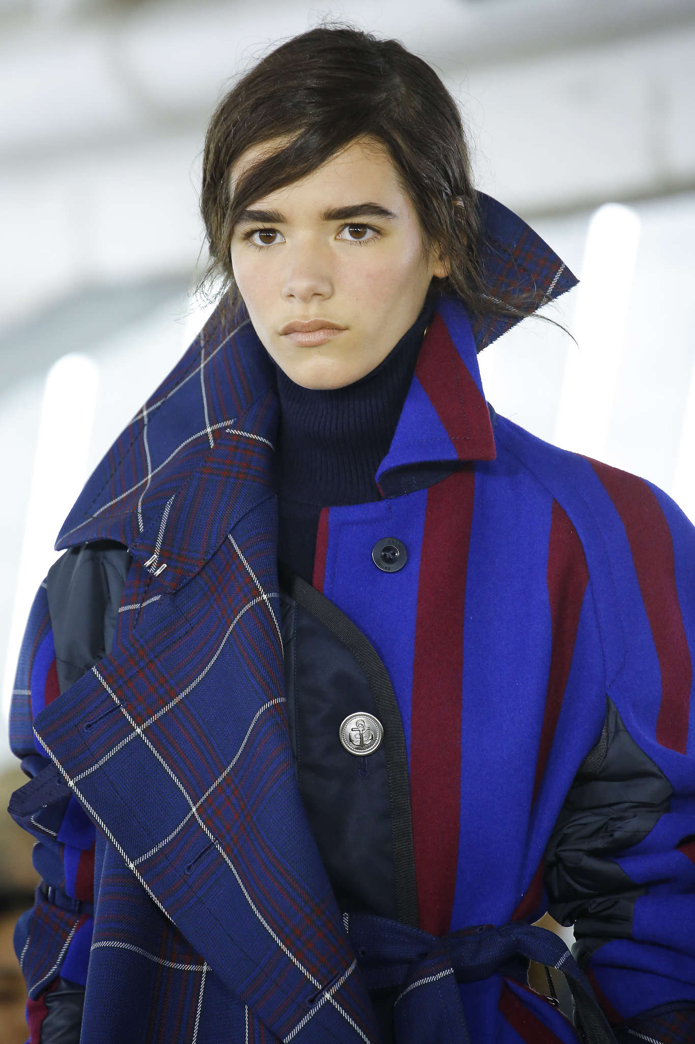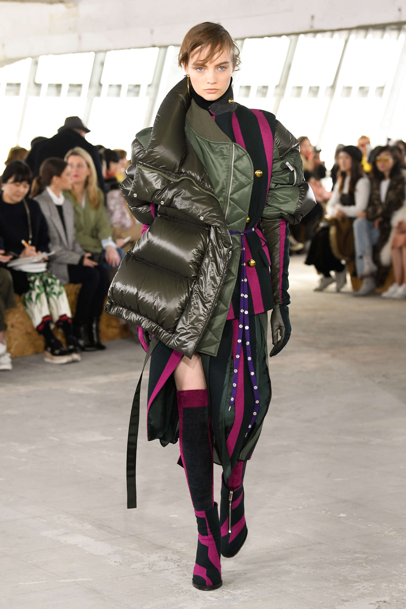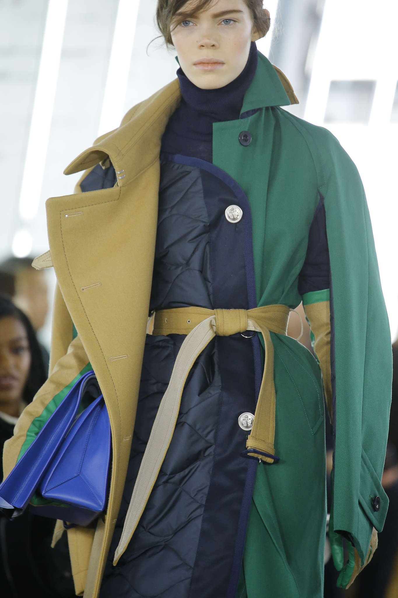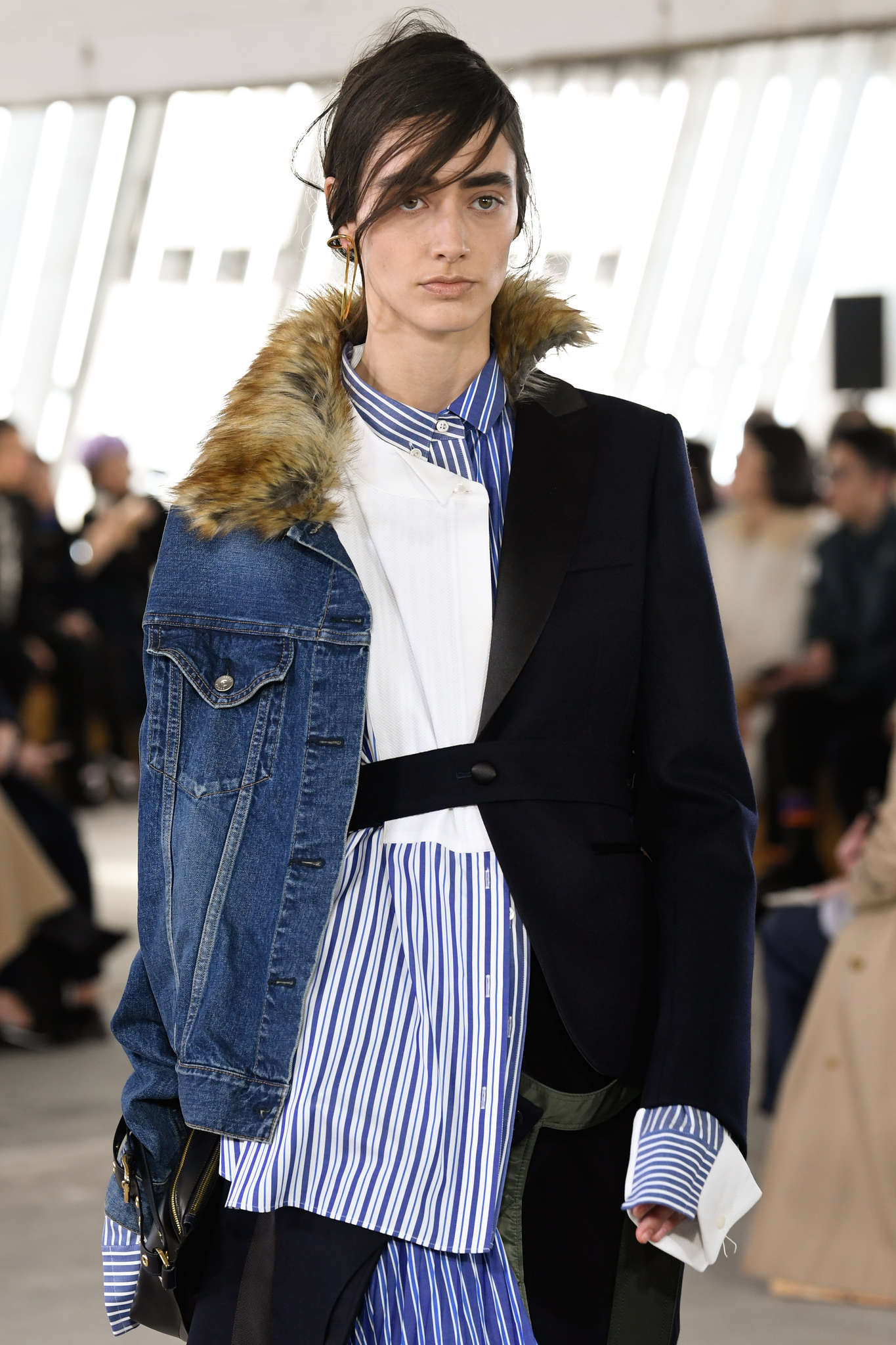 Chiotse Abe propose un vestiaire fruit de la location de différents vestiaires. Blousons en Jean, chemises rayées preppy, doudounes, et bombers sont decontextualisés de leurs habitats d’origine. La location se transforme en véritable rachat: Chiotse Abe se fait la propriétaire de ces différentes influences en les travaillant toutes selon le même protocole. La fusion, à coup d’asymétrie et de collaborations impromptues. La recherche est celle d’un chao esthétique : pas au sens apolcalyptique- au sens ou les hiérarchies imaginaires entre les vêtements disparaissent. Doudounes smokings, escarpins dépareillés, association de carreaux et de rayures. Une mutualisation stylistique démocratique. Chaque tissu prend part au vote chez Sacaï.