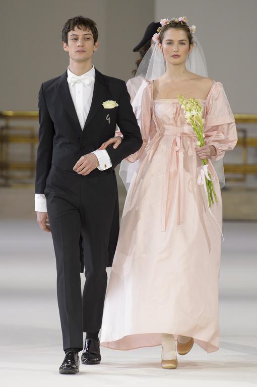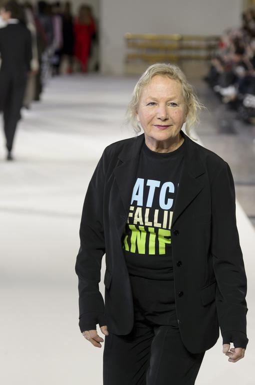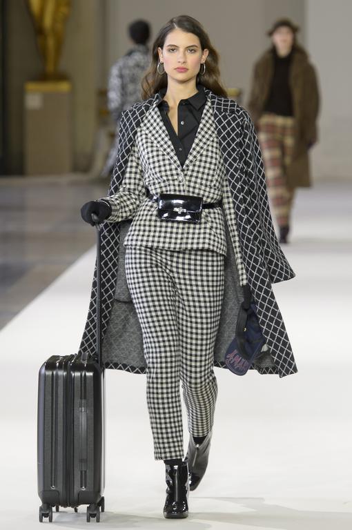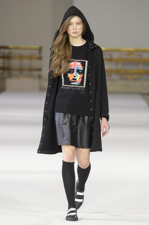 Chez Agnès B c’est de l’économie collaborative des coeurs, dont il faudrait parler. Ouvrant toujours sa porte (et son podium) aux artistes, de tout horizons, Agnès B. propose cette saison de découvrir le travail de Laure Hélène Vaudier et donne un aperçu de sa collection à venir avec Nekfeu. Au-delà de ses multiples engagements artistiques, Agnès B. se distingue par sa capacité à préserver son identité, ses combats : elle a construit son propre système autonome– et fait de son nom le pont entre les arts. Les artistes lui sont fidèles. Isabelle Hupert au premier rang, échange avec elle le lendemain sur France Culture. Elle souligne « l’indépendance » d’une femme qui répond »prendre des risques à l’heure actuelle ? C’est prendre le risque de rester soi-même ». Alors la collection ne s’articule pas de jaunes criards , de foulards, et autres tendances « hit »en partance. Agnès B. a voulu raconter l’histoire de différents personnages, tous liés aux voyages : qu’ils soient métaphoriques ( à travers les époques et les classes sociales), ou concrets avec des valises à roulettes. Au bout du voyage, l’artiste trouve LE collaborateur : la voix qui l’écoute. En termes de défilé, cela donne lieu à un mariage-un mariage pour s’émanciper à l aube d’une jeunesse qui appelle à une vie un peu trop bourgeoise… Agnès B. clôture la messe vêtue d’un t-shirt « Catch a falling Knife » -tout est dit. Sa marque c’est elle, imprimée de toutes les rencontres qui ont forgé sa créativité.