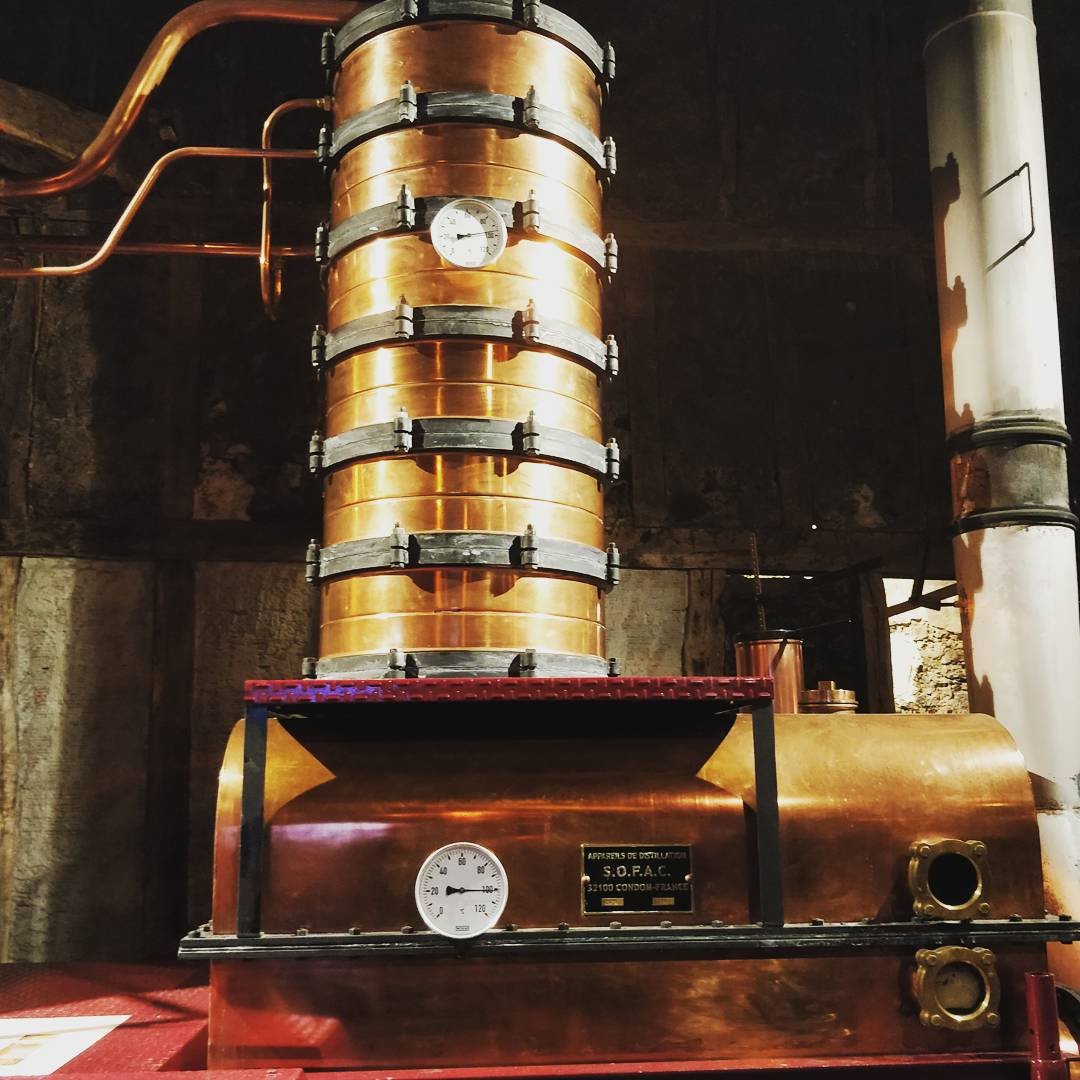L’ALAMBIC : L’essentiel des eaux-de-vie d’Armagnac (95%) provient de la distillation dans un alambic spé-cifique : l’alambic Armagnacais. Il s’agit d’un appareil en cuivre pur, martelé ou laminé, qui fut consacré dès 1818 par un brevet déposé par le sieur Tuillière sous le règne du roi Louis XVIII. Sa caractéristique principale est son fonctionnement en continu. La distillation à double-chauffe est pratiquée pour une très faible partie de la production.