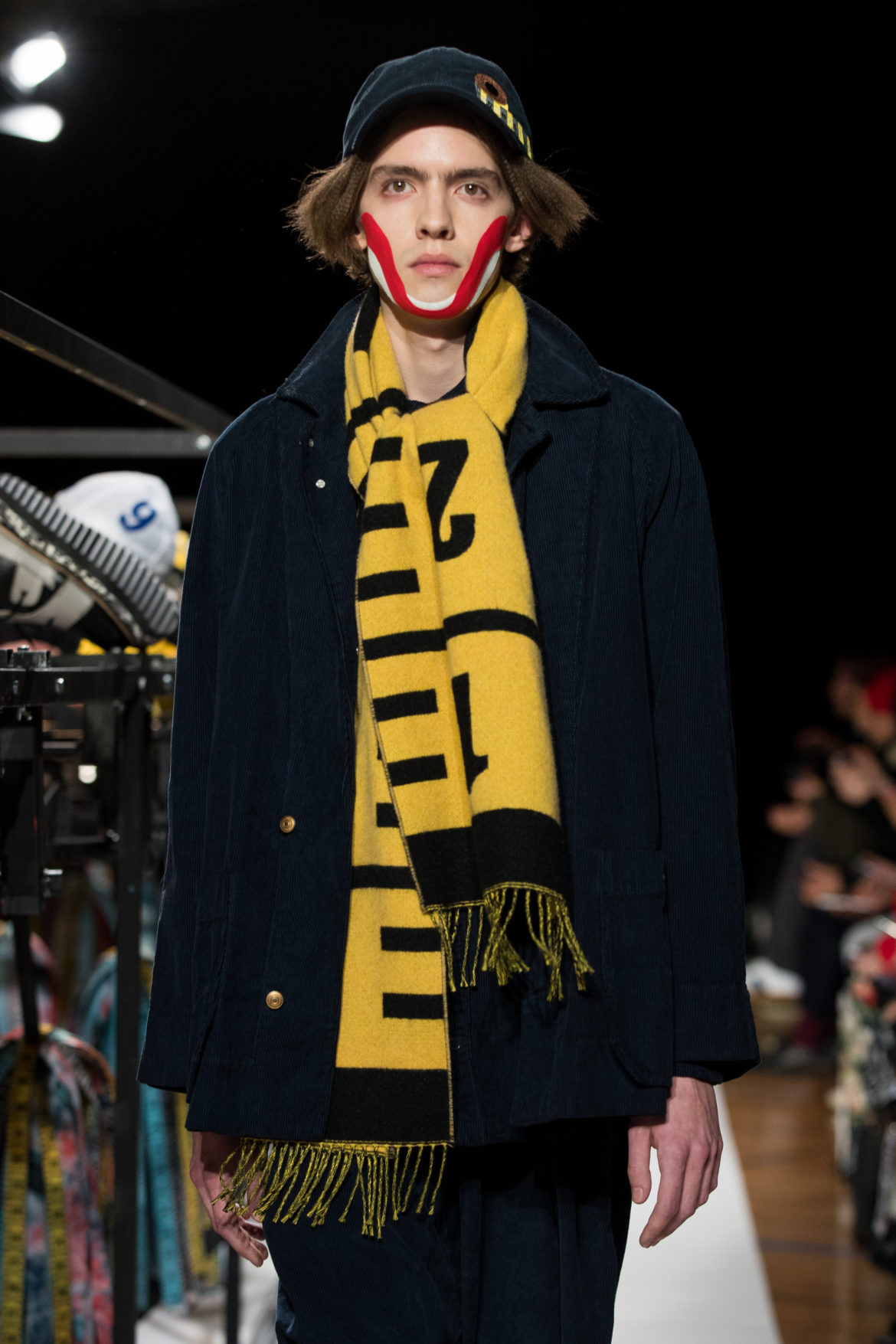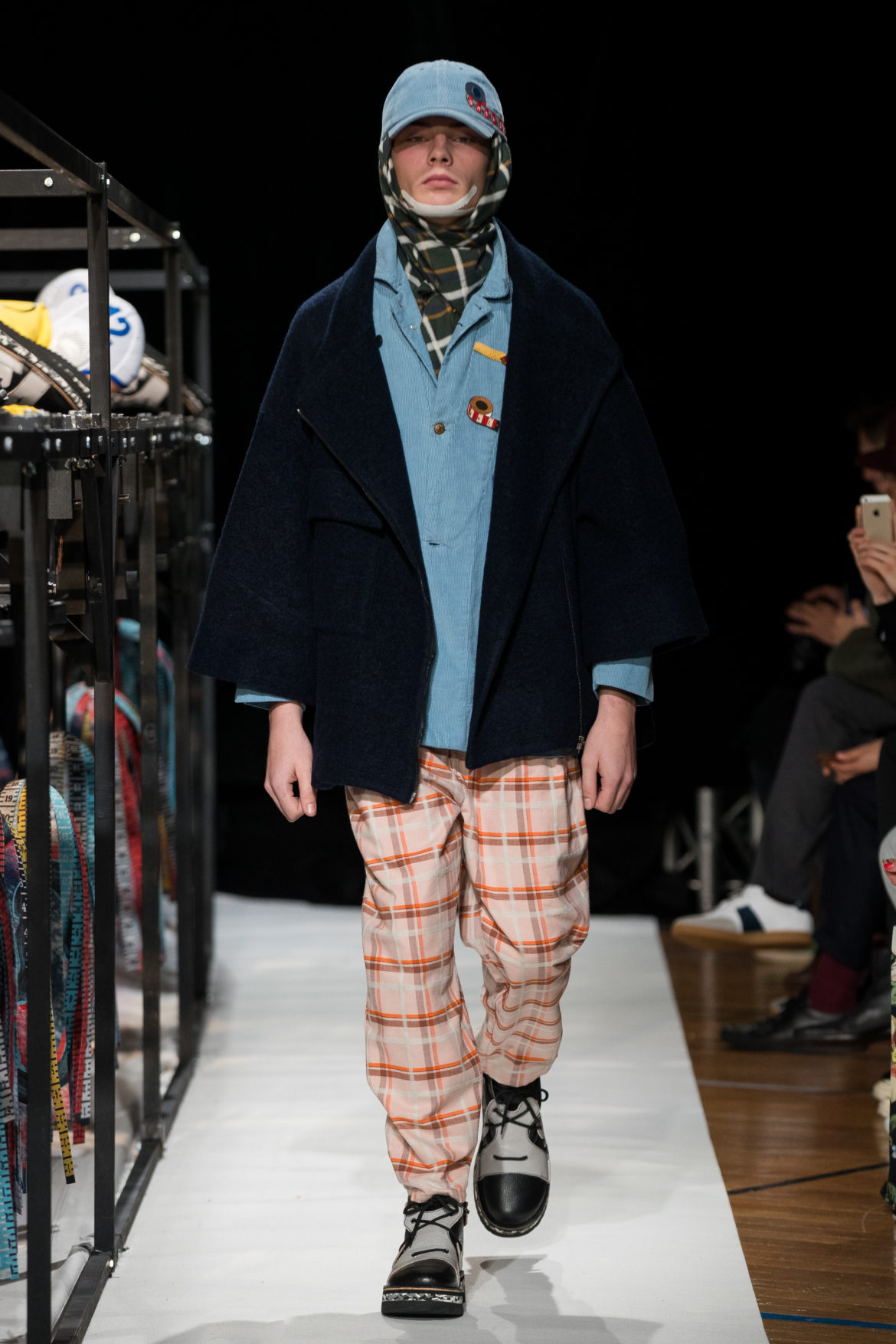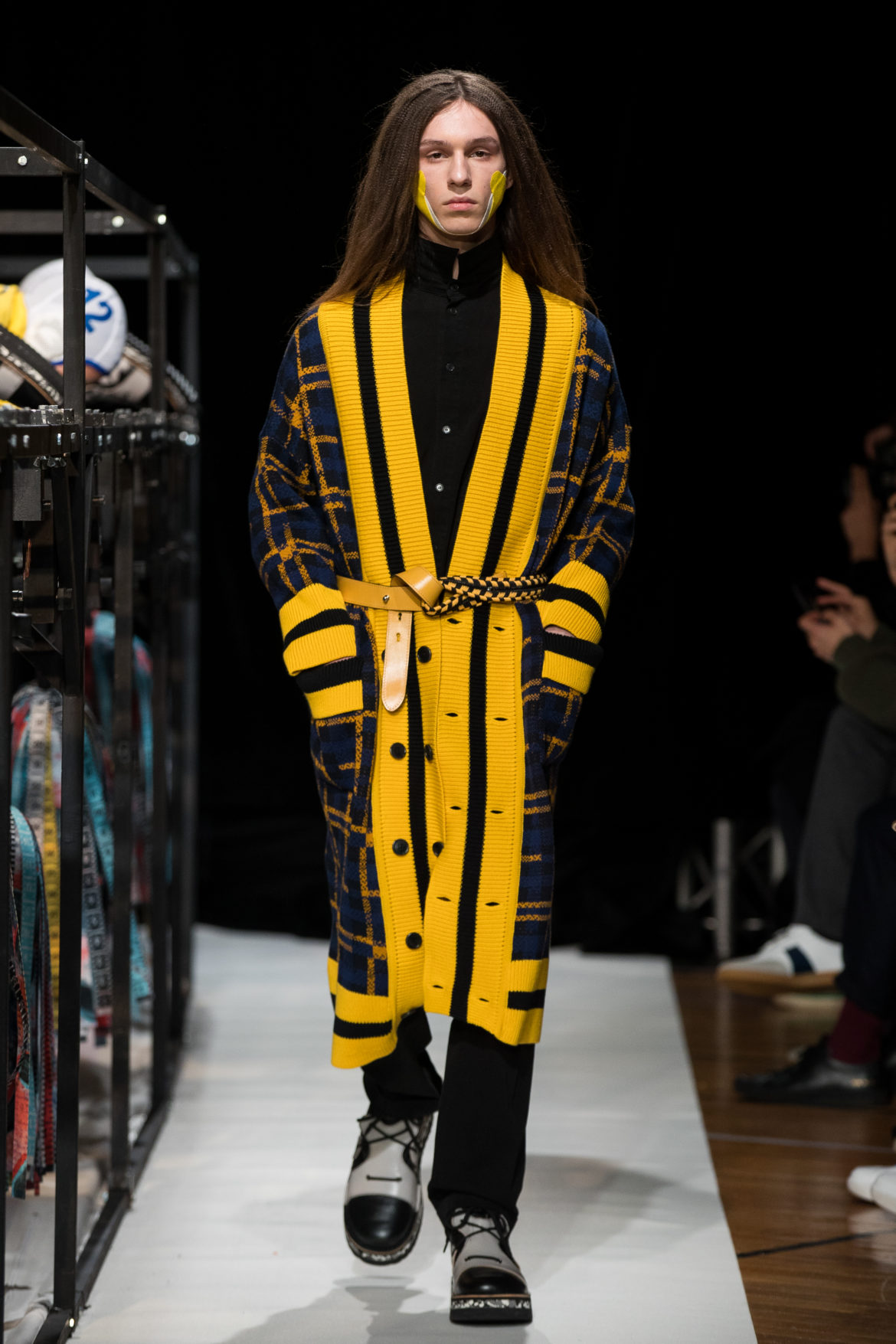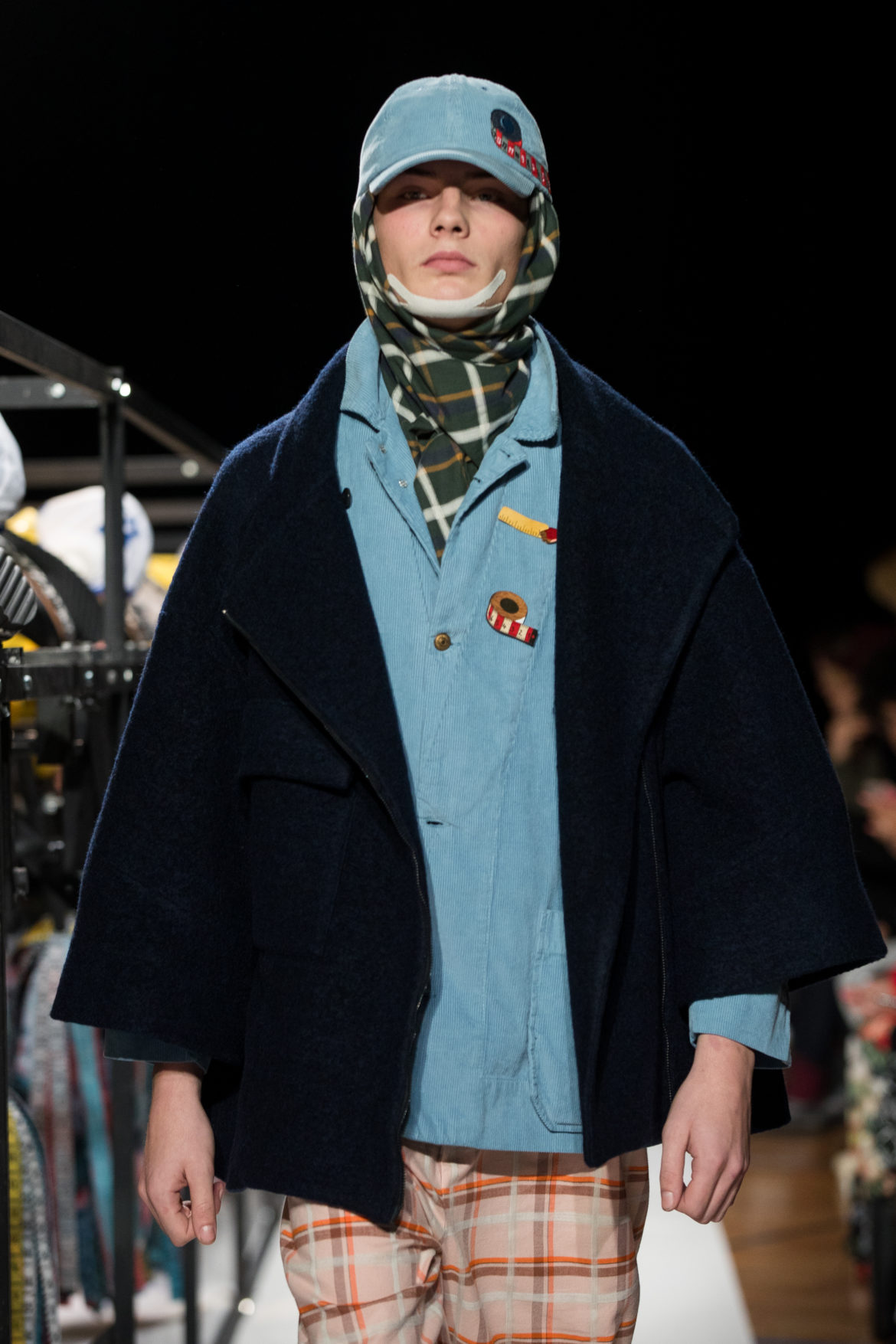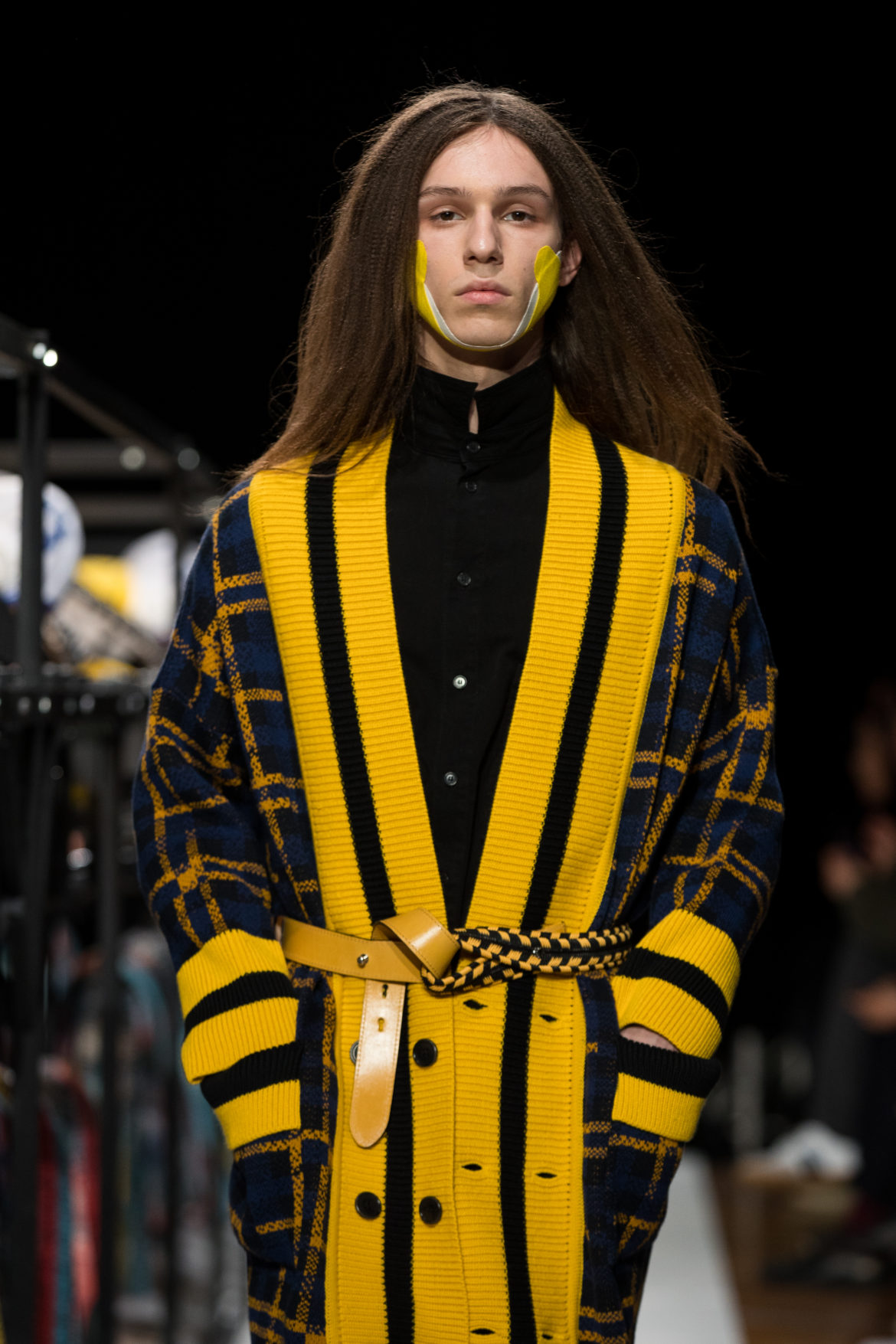 The Man Who Measures the Clouds(L’homme qui mesure les nuages)isan art piece by Jan Fabre that Vibskovcame across last summer during his travels inKanasawa,Japan. Thepoetic gesture of measuring something unmeasurable inspired him and the teamfor theA/W18-collection. To find sense where there is no senseina culture where we are obsessed about numbers,we seek to measure, analyze, compare and categorize. Peopleincreasingly depend on numbers to know how theyare doing for virtually everything.We measure ourselves, size, height, distance, amount, time, intelligence, popularity and even feelings.If you cannumber it, you cancontrol it. We want to pause for a momenttoquestion this number maniaandto know what is going on around us, how our actions impact others, how the environment is changing and how wearechanging.If we want to change what wecare about, shouldn’t we change what we measure?The collection reflects the theme in various ways; prints of littleworking peopletrying to analyzetheir surroundings, oversized ribbing on knitwear that seems like it camefrom another measuring system, free floating paint strokes that don’t want to fit the grid in thebackground, prolonged buttonstands andsleeve slitsand weave onsuiting that shows measure tapes woven into the that garments. Some of the garments are developed from the starting point where pieces from earlier collection were sewn together in new scales and original measurements were swapped around. Fifteen performers inbrightyellow working outfits are controlling manually themechanicalmeasuringmopsthat analyze the bodies lying underneath.Through rhythm,sound, body movement and pulse the installation emphasizes the inspiration of the collection. It is avisualizationon how people become the machine controlled by measurements.