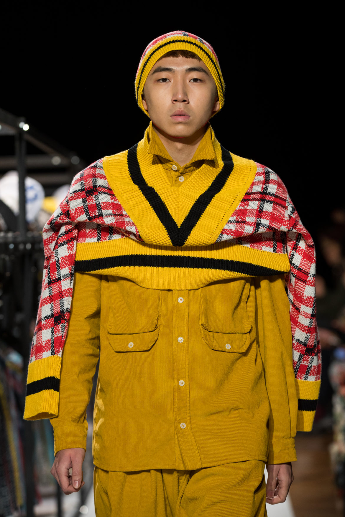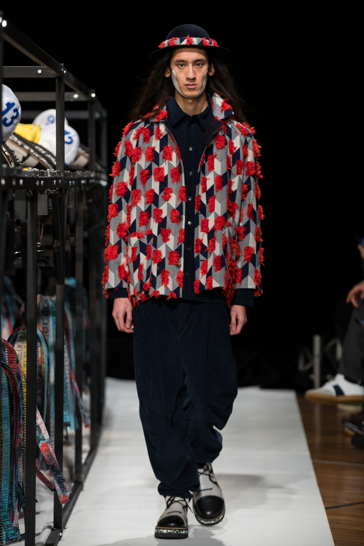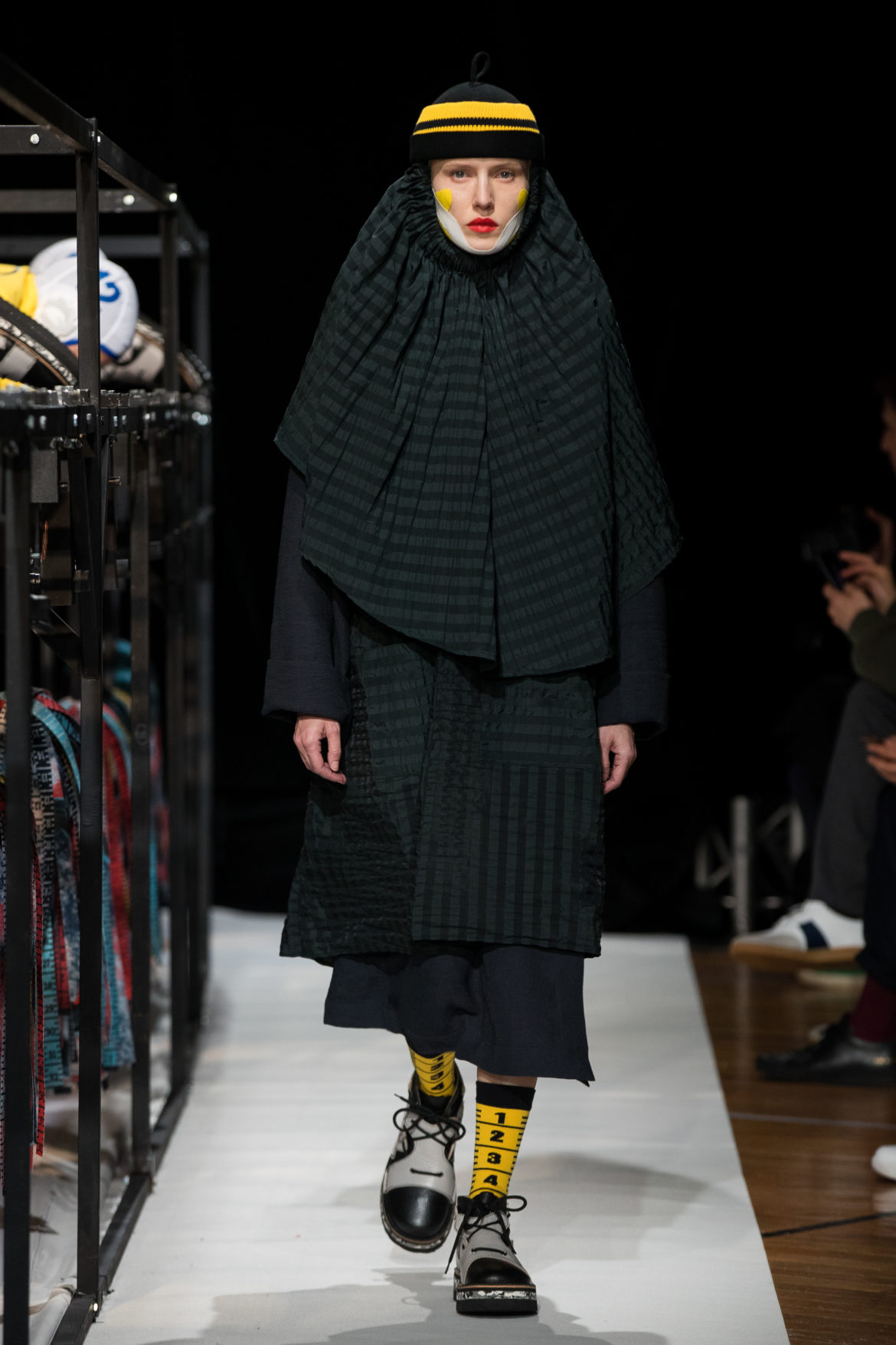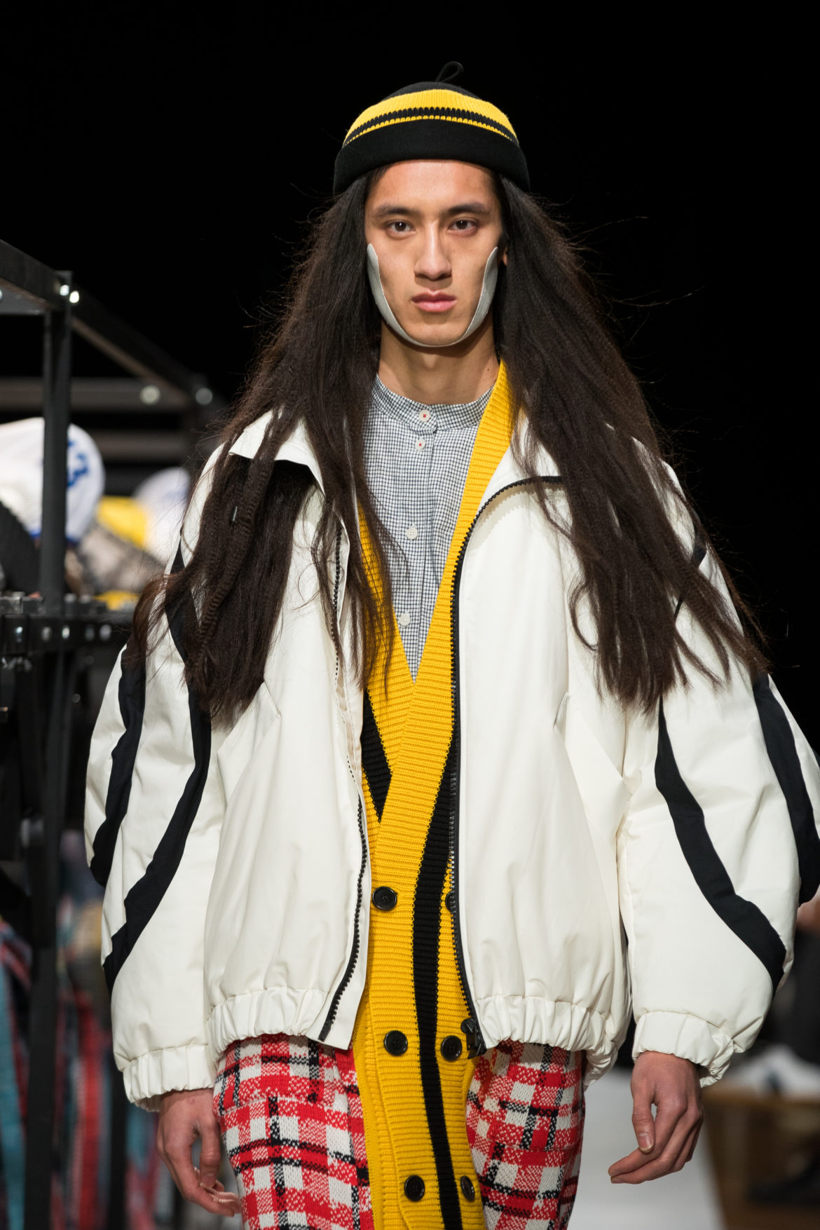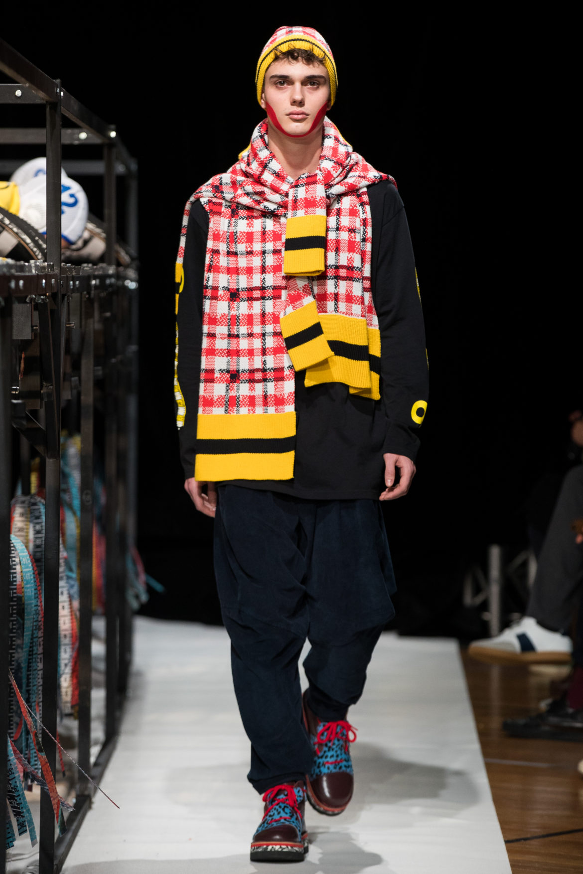 The Man Who Measures the Clouds(L’homme qui mesure les nuages)isan art piece by Jan Fabre that Vibskovcame across last summer during his travels inKanasawa,Japan. Thepoetic gesture of measuring something unmeasurable inspired him and the teamfor theA/W18-collection. To find sense where there is no senseina culture where we are obsessed about numbers,we seek to measure, analyze, compare and categorize. Peopleincreasingly depend on numbers to know how theyare doing for virtually everything.We measure ourselves, size, height, distance, amount, time, intelligence, popularity and even feelings.If you cannumber it, you cancontrol it. We want to pause for a momenttoquestion this number maniaandto know what is going on around us, how our actions impact others, how the environment is changing and how wearechanging.If we want to change what wecare about, shouldn’t we change what we measure?The collection reflects the theme in various ways; prints of littleworking peopletrying to analyzetheir surroundings, oversized ribbing on knitwear that seems like it camefrom another measuring system, free floating paint strokes that don’t want to fit the grid in thebackground, prolonged buttonstands andsleeve slitsand weave onsuiting that shows measure tapes woven into the that garments. Some of the garments are developed from the starting point where pieces from earlier collection were sewn together in new scales and original measurements were swapped around. Fifteen performers inbrightyellow working outfits are controlling manually themechanicalmeasuringmopsthat analyze the bodies lying underneath.Through rhythm,sound, body movement and pulse the installation emphasizes the inspiration of the collection. It is avisualizationon how people become the machine controlled by measurements.