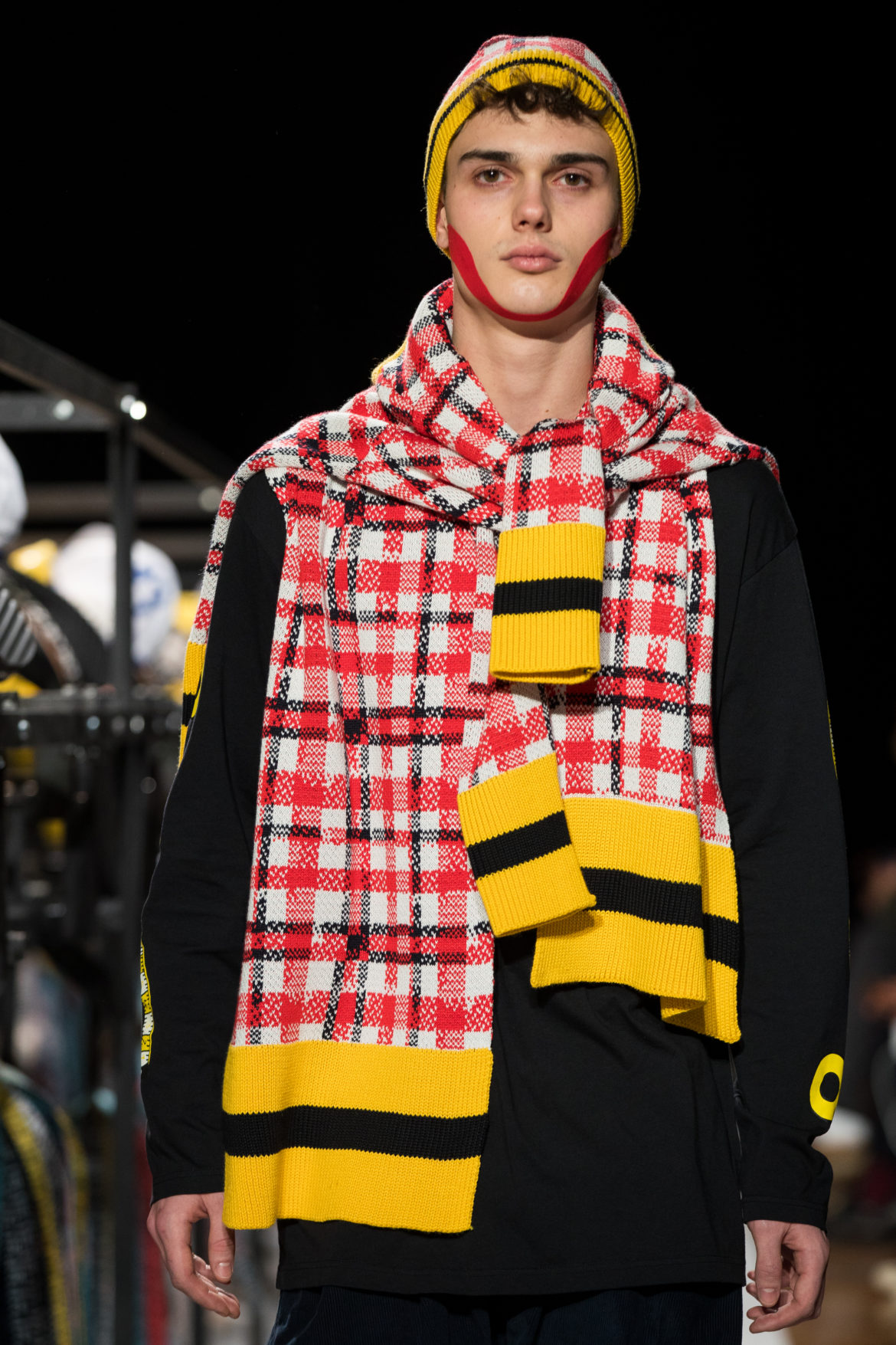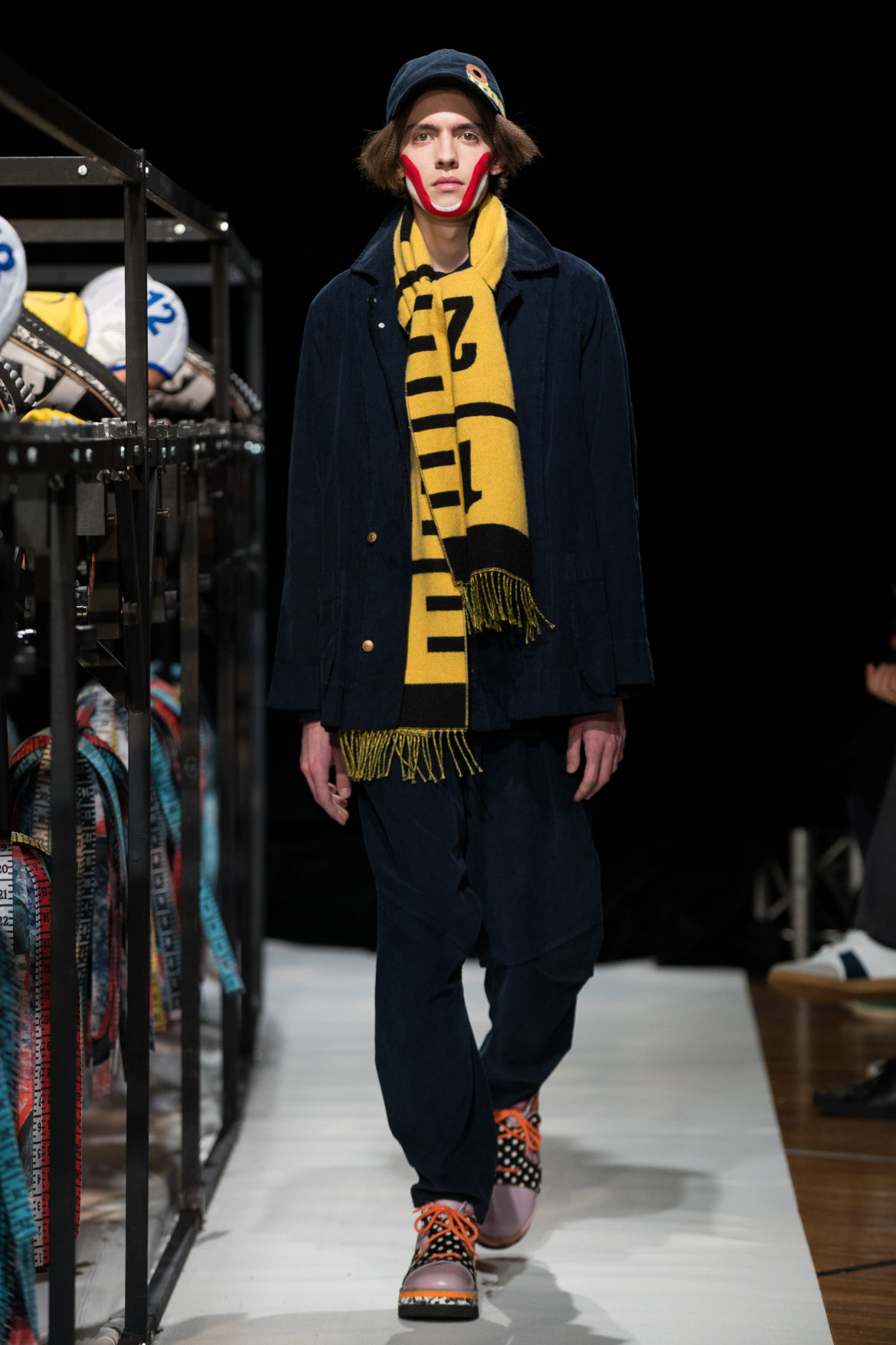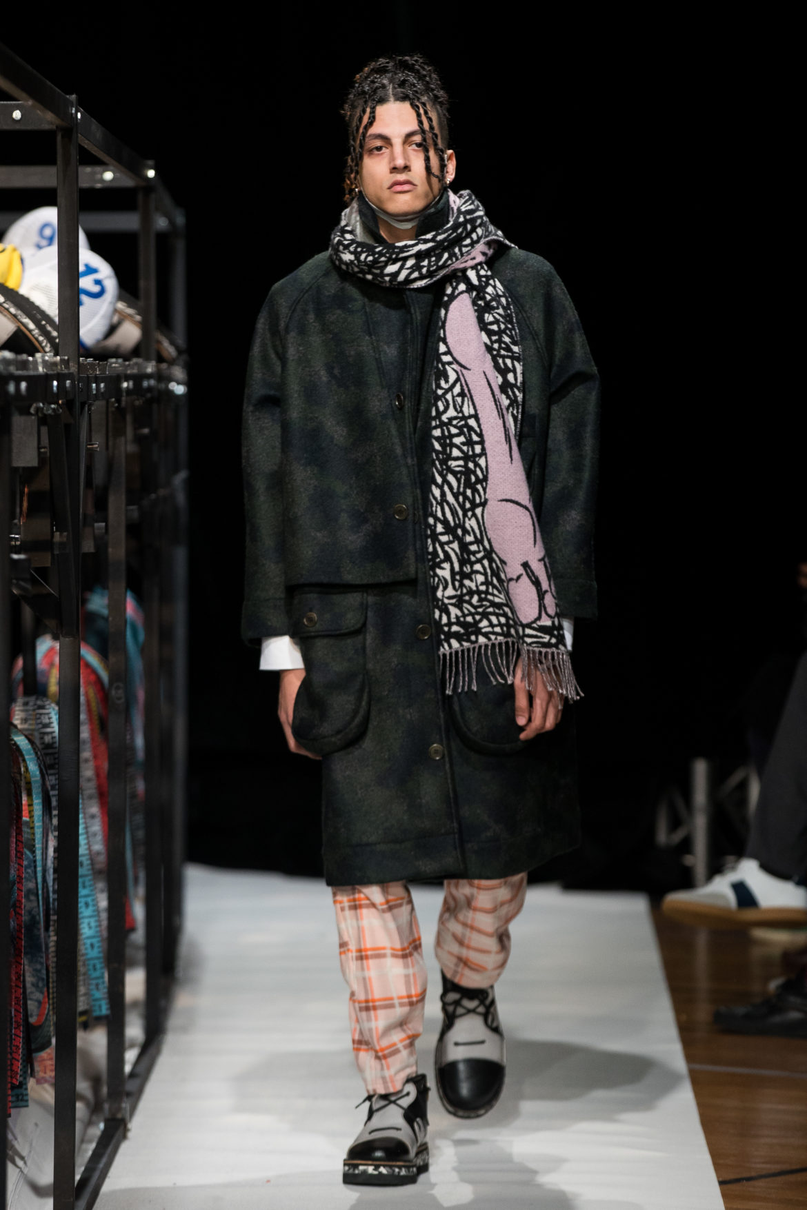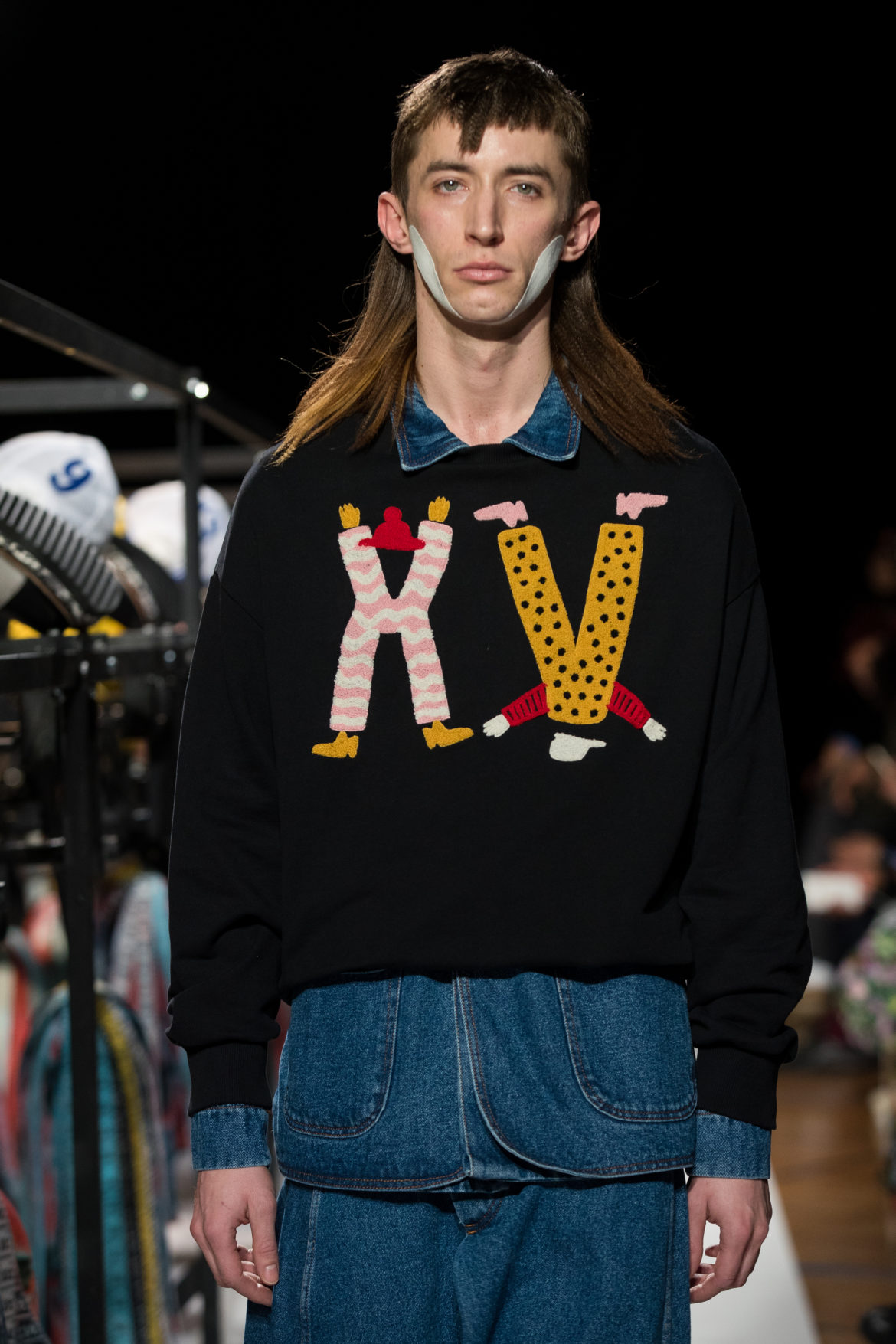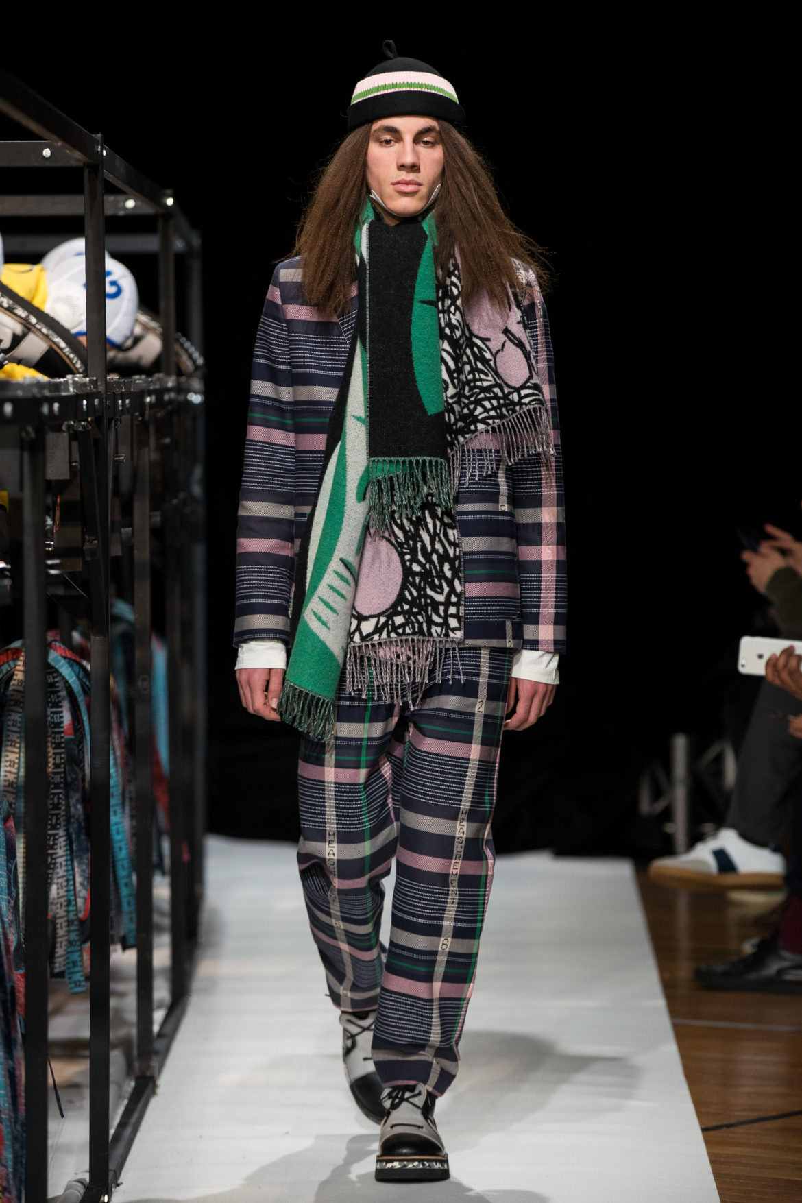 The Man Who Measures the Clouds(L’homme qui mesure les nuages)isan art piece by Jan Fabre that Vibskovcame across last summer during his travels inKanasawa,Japan. Thepoetic gesture of measuring something unmeasurable inspired him and the teamfor theA/W18-collection. To find sense where there is no senseina culture where we are obsessed about numbers,we seek to measure, analyze, compare and categorize. Peopleincreasingly depend on numbers to know how theyare doing for virtually everything.We measure ourselves, size, height, distance, amount, time, intelligence, popularity and even feelings.If you cannumber it, you cancontrol it. We want to pause for a momenttoquestion this number maniaandto know what is going on around us, how our actions impact others, how the environment is changing and how wearechanging.If we want to change what wecare about, shouldn’t we change what we measure?The collection reflects the theme in various ways; prints of littleworking peopletrying to analyzetheir surroundings, oversized ribbing on knitwear that seems like it camefrom another measuring system, free floating paint strokes that don’t want to fit the grid in thebackground, prolonged buttonstands andsleeve slitsand weave onsuiting that shows measure tapes woven into the that garments. Some of the garments are developed from the starting point where pieces from earlier collection were sewn together in new scales and original measurements were swapped around. Fifteen performers inbrightyellow working outfits are controlling manually themechanicalmeasuringmopsthat analyze the bodies lying underneath.Through rhythm,sound, body movement and pulse the installation emphasizes the inspiration of the collection. It is avisualizationon how people become the machine controlled by measurements.