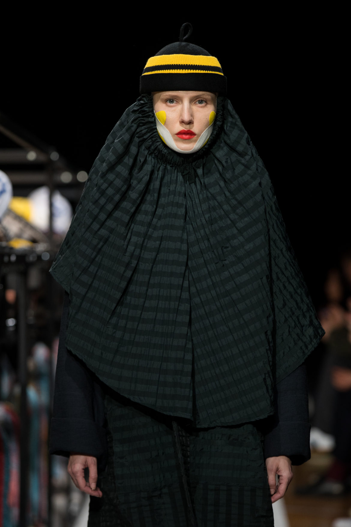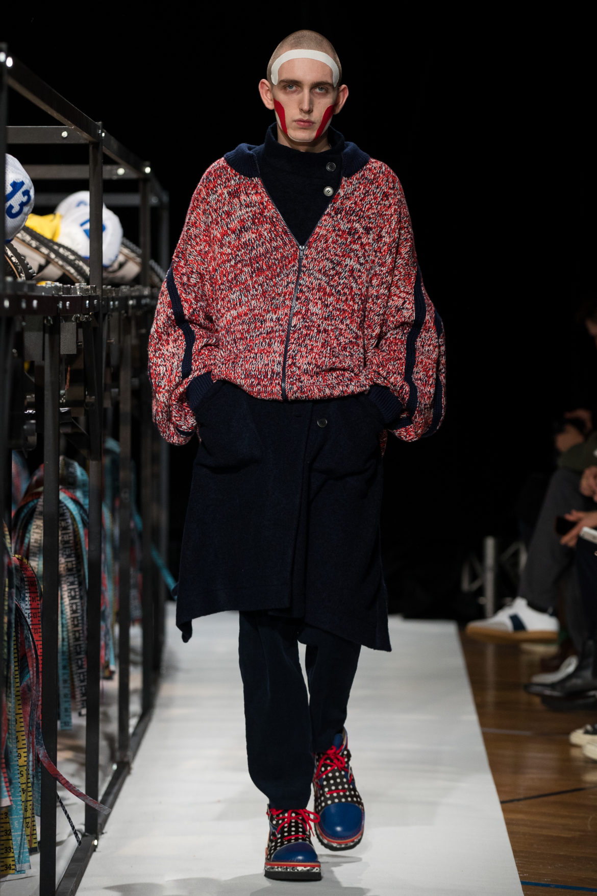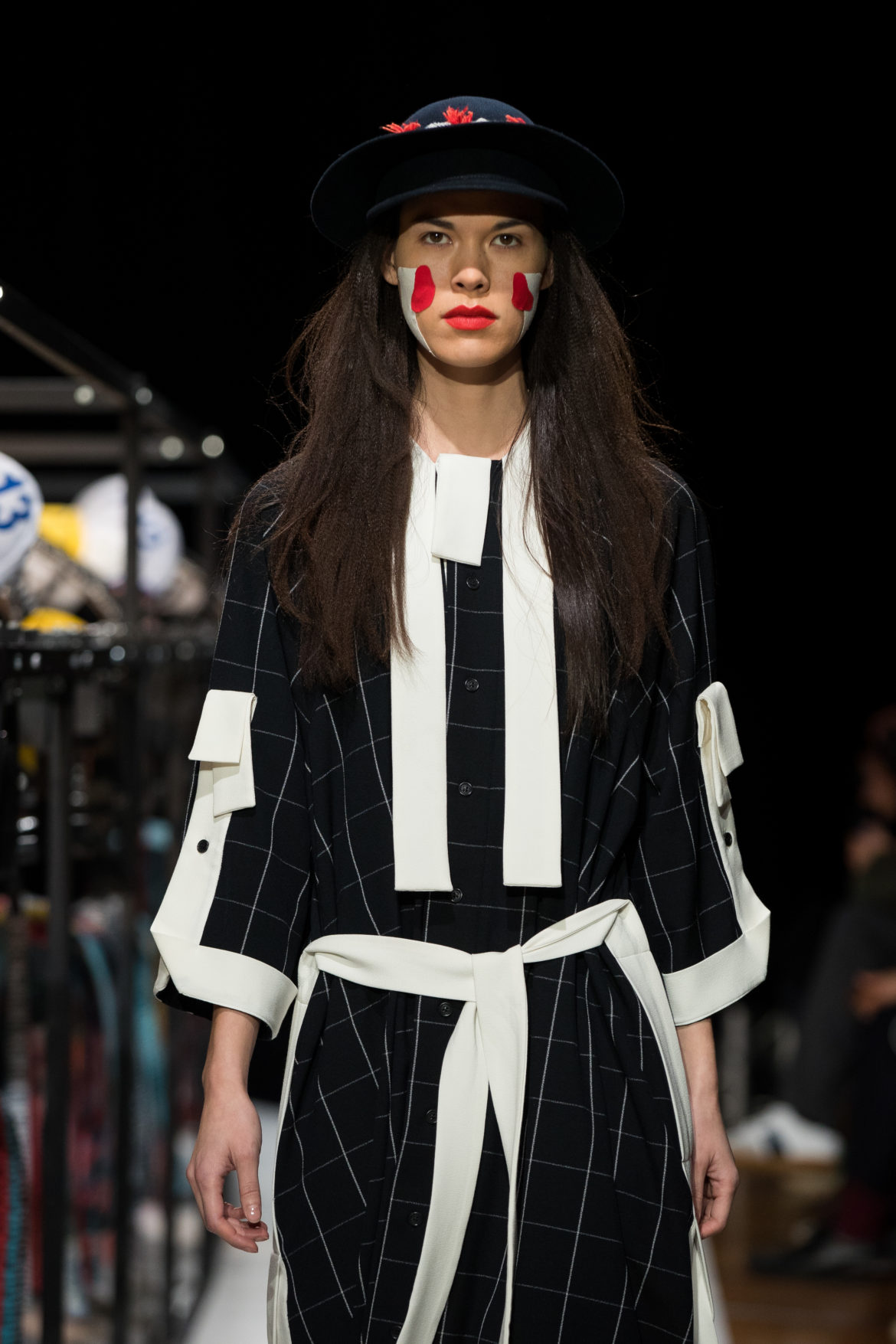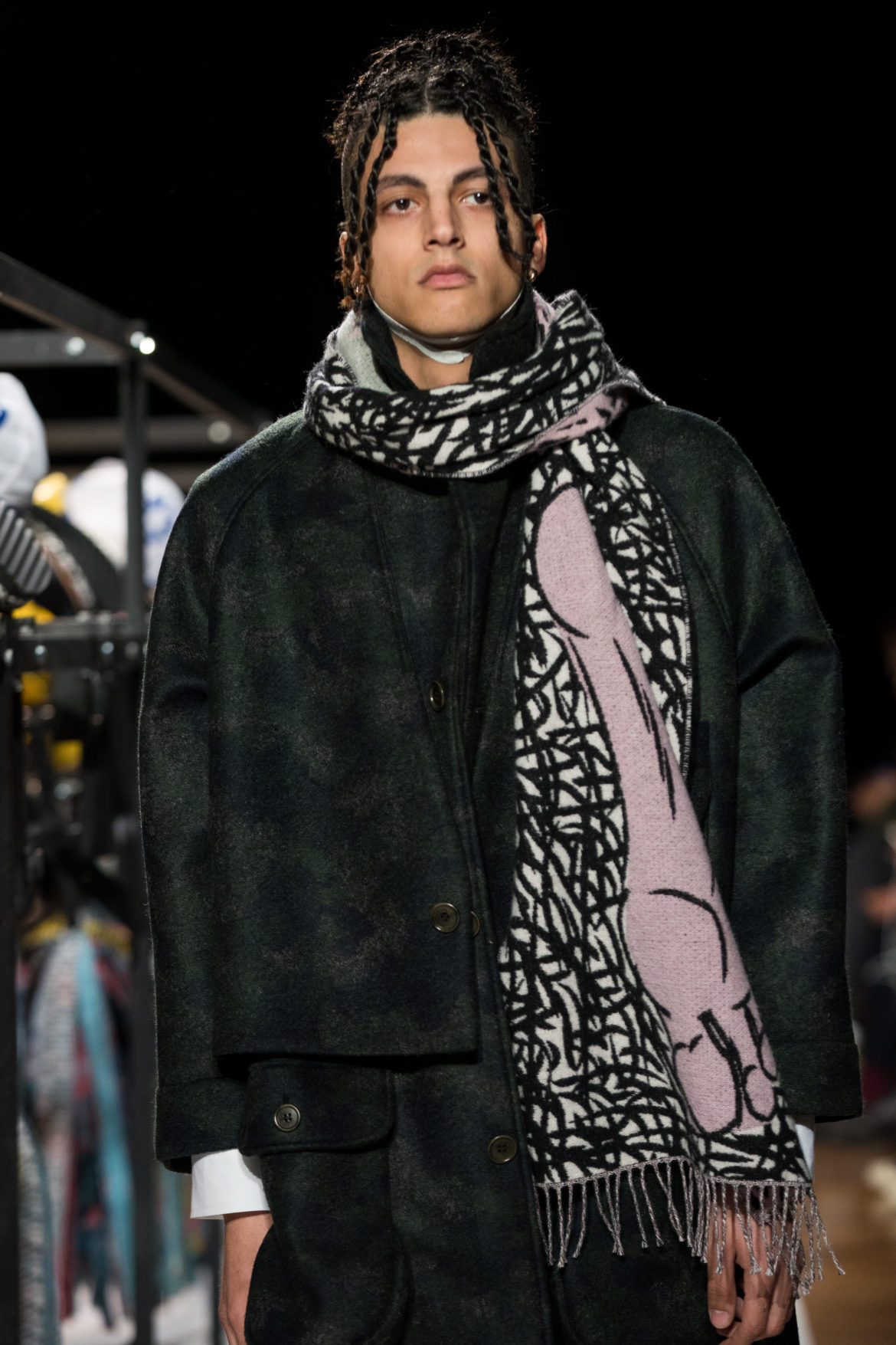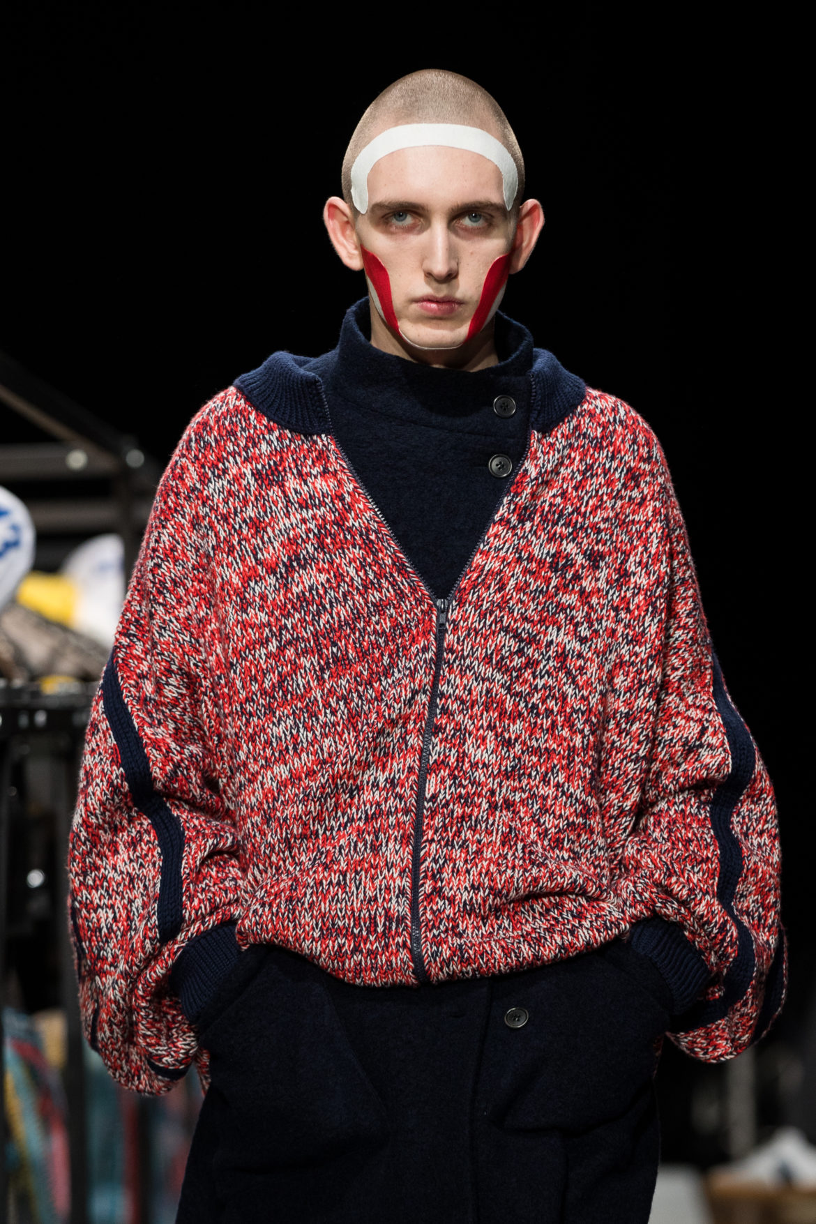 The Man Who Measures the Clouds(L’homme qui mesure les nuages)isan art piece by Jan Fabre that Vibskovcame across last summer during his travels inKanasawa,Japan. Thepoetic gesture of measuring something unmeasurable inspired him and the teamfor theA/W18-collection. To find sense where there is no senseina culture where we are obsessed about numbers,we seek to measure, analyze, compare and categorize. Peopleincreasingly depend on numbers to know how theyare doing for virtually everything.We measure ourselves, size, height, distance, amount, time, intelligence, popularity and even feelings.If you cannumber it, you cancontrol it. We want to pause for a momenttoquestion this number maniaandto know what is going on around us, how our actions impact others, how the environment is changing and how wearechanging.If we want to change what wecare about, shouldn’t we change what we measure?The collection reflects the theme in various ways; prints of littleworking peopletrying to analyzetheir surroundings, oversized ribbing on knitwear that seems like it camefrom another measuring system, free floating paint strokes that don’t want to fit the grid in thebackground, prolonged buttonstands andsleeve slitsand weave onsuiting that shows measure tapes woven into the that garments. Some of the garments are developed from the starting point where pieces from earlier collection were sewn together in new scales and original measurements were swapped around. Fifteen performers inbrightyellow working outfits are controlling manually themechanicalmeasuringmopsthat analyze the bodies lying underneath.Through rhythm,sound, body movement and pulse the installation emphasizes the inspiration of the collection. It is avisualizationon how people become the machine controlled by measurements.