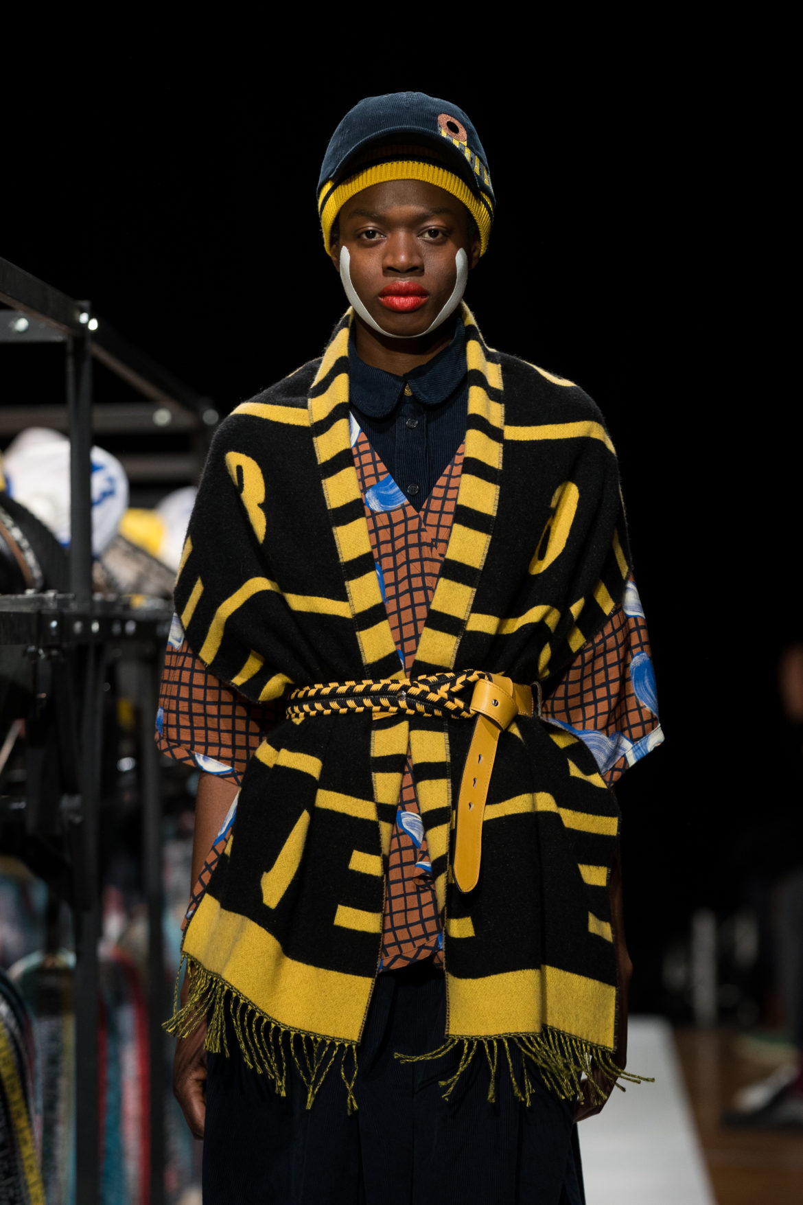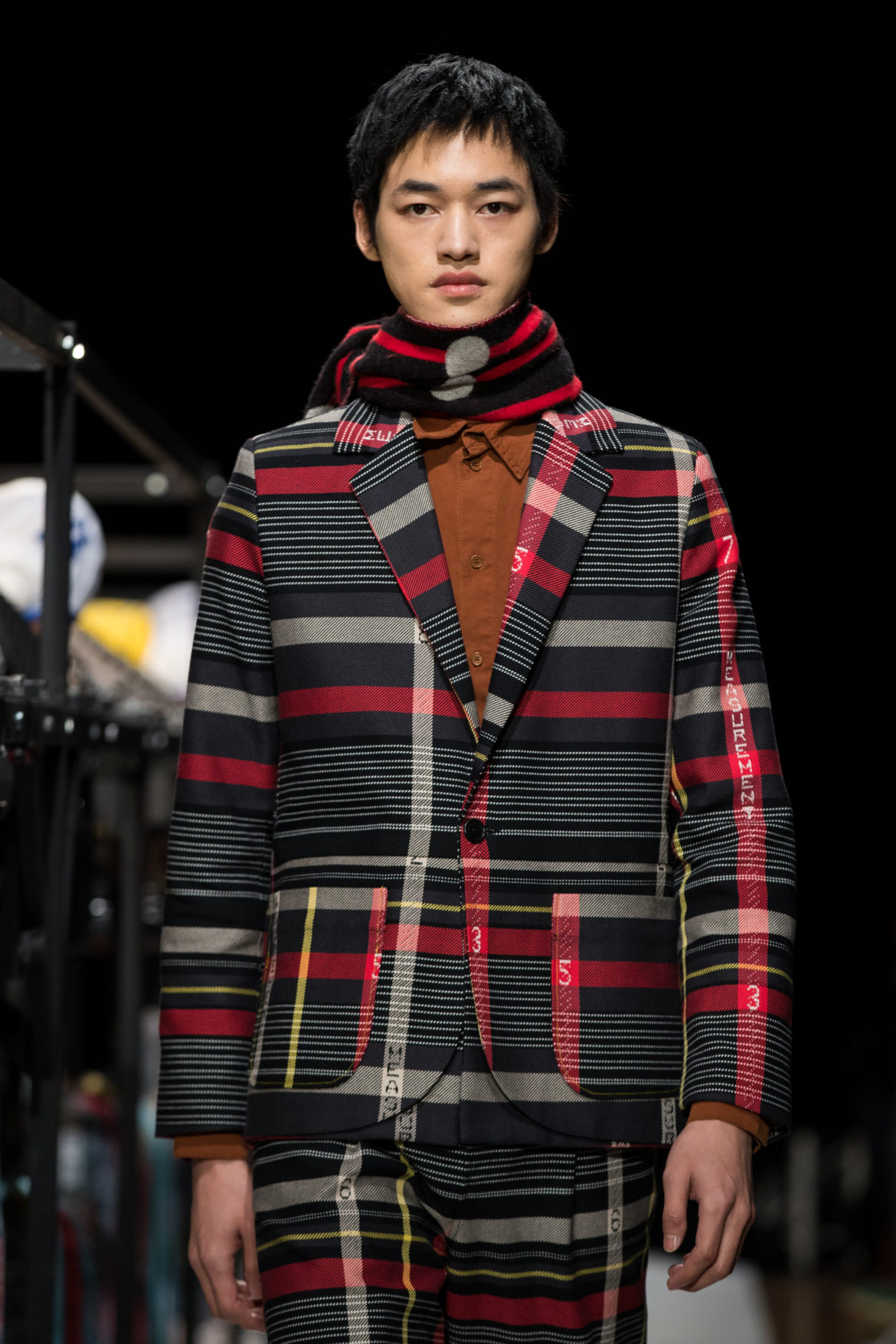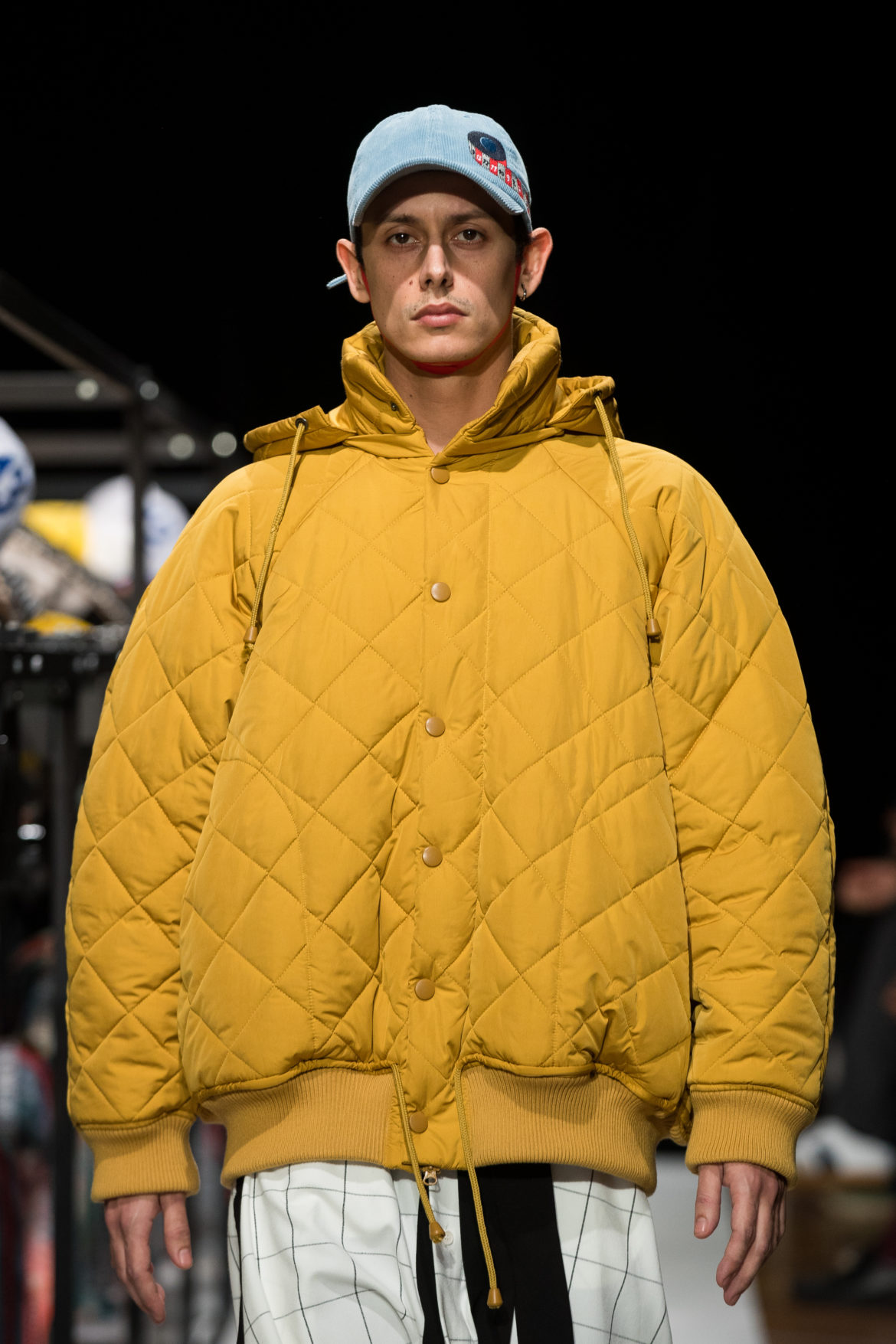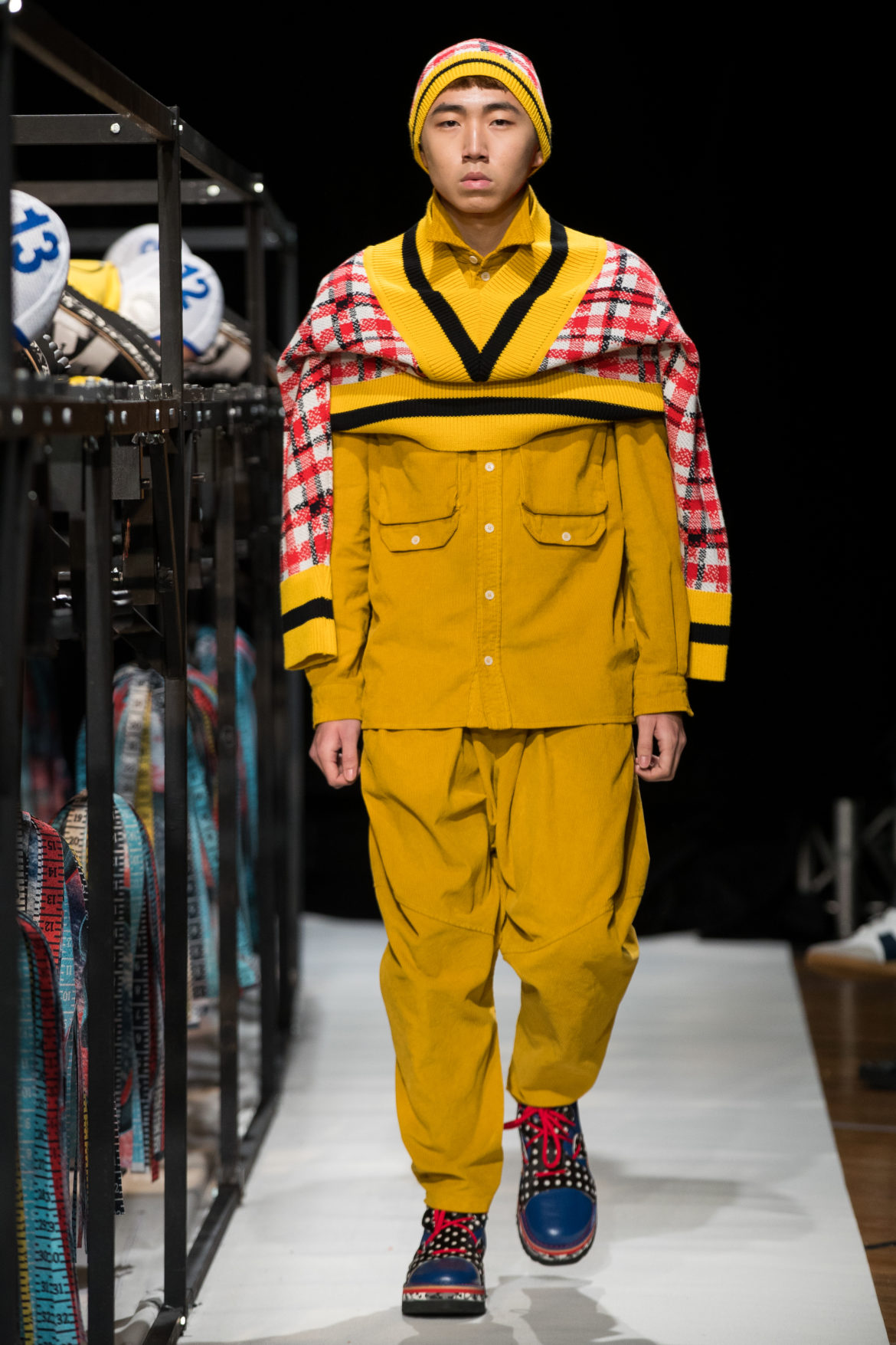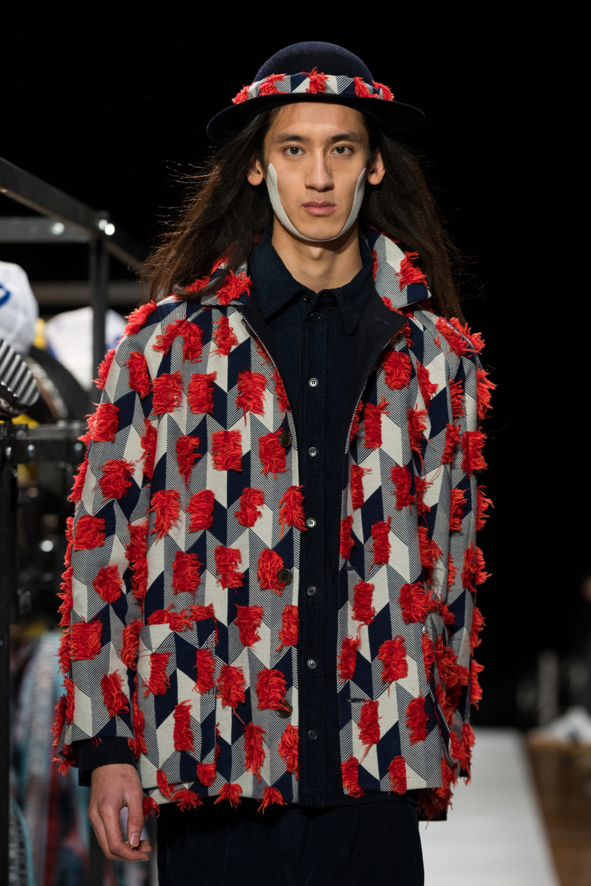 The Man Who Measures the Clouds(L’homme qui mesure les nuages)isan art piece by Jan Fabre that Vibskovcame across last summer during his travels inKanasawa,Japan. Thepoetic gesture of measuring something unmeasurable inspired him and the teamfor theA/W18-collection. To find sense where there is no senseina culture where we are obsessed about numbers,we seek to measure, analyze, compare and categorize. Peopleincreasingly depend on numbers to know how theyare doing for virtually everything.We measure ourselves, size, height, distance, amount, time, intelligence, popularity and even feelings.If you cannumber it, you cancontrol it. We want to pause for a momenttoquestion this number maniaandto know what is going on around us, how our actions impact others, how the environment is changing and how wearechanging.If we want to change what wecare about, shouldn’t we change what we measure?The collection reflects the theme in various ways; prints of littleworking peopletrying to analyzetheir surroundings, oversized ribbing on knitwear that seems like it camefrom another measuring system, free floating paint strokes that don’t want to fit the grid in thebackground, prolonged buttonstands andsleeve slitsand weave onsuiting that shows measure tapes woven into the that garments. Some of the garments are developed from the starting point where pieces from earlier collection were sewn together in new scales and original measurements were swapped around. Fifteen performers inbrightyellow working outfits are controlling manually themechanicalmeasuringmopsthat analyze the bodies lying underneath.Through rhythm,sound, body movement and pulse the installation emphasizes the inspiration of the collection. It is avisualizationon how people become the machine controlled by measurements.