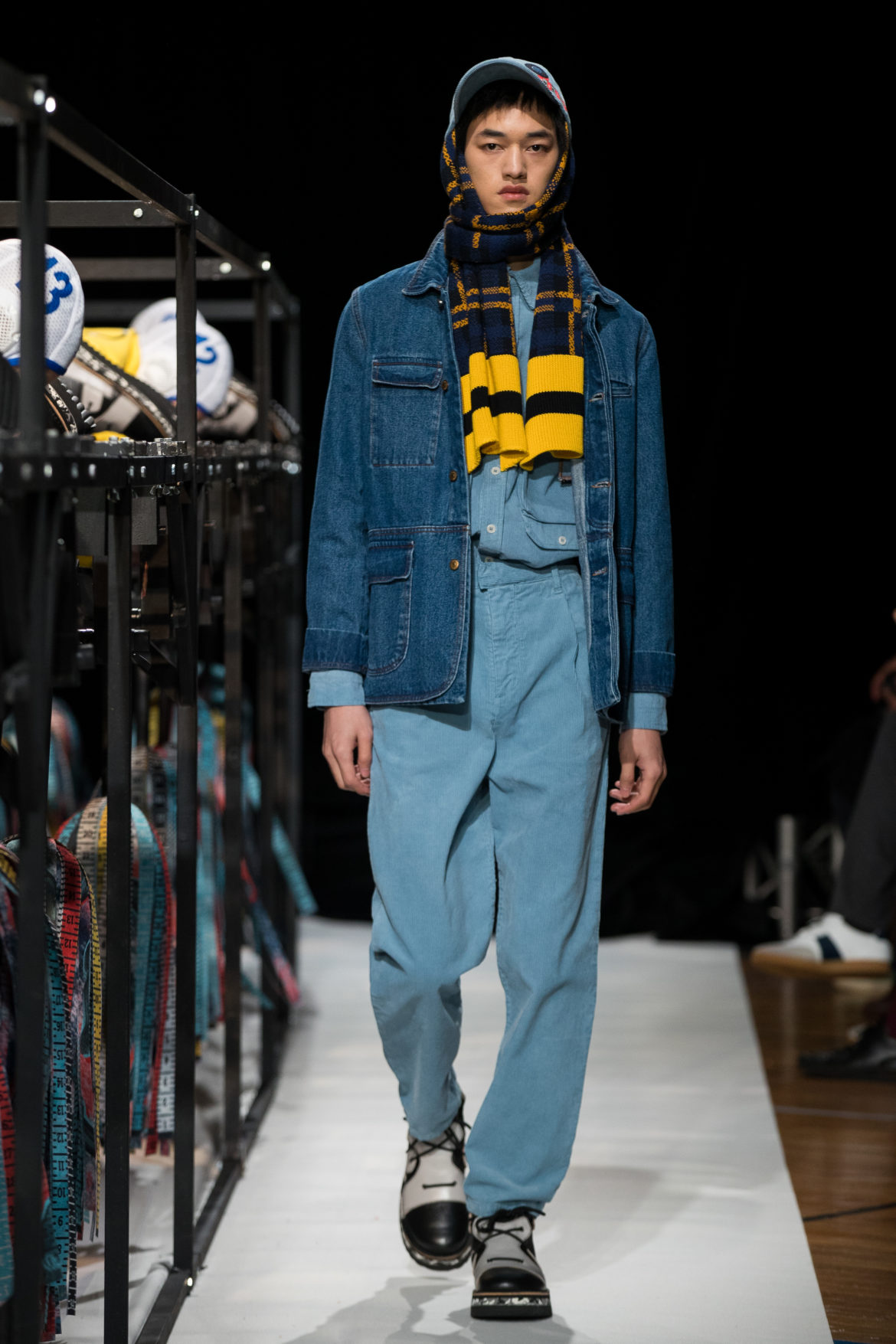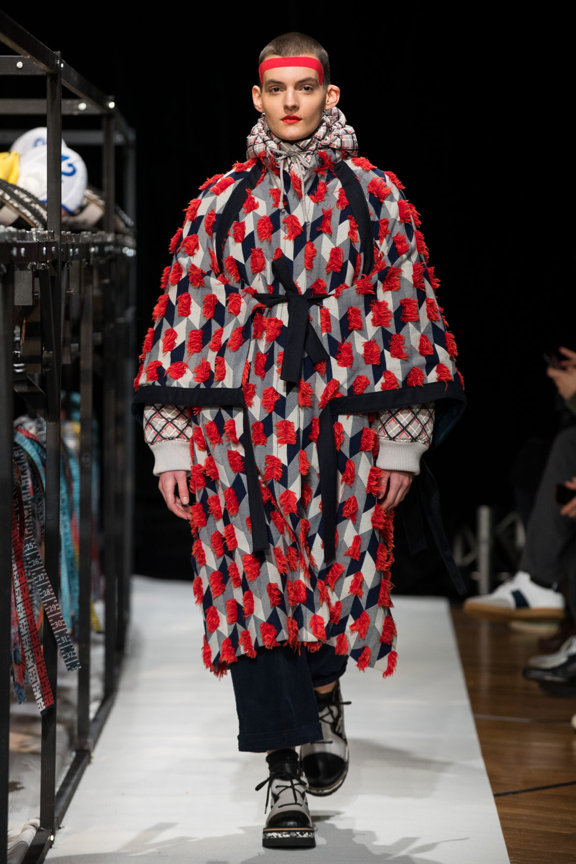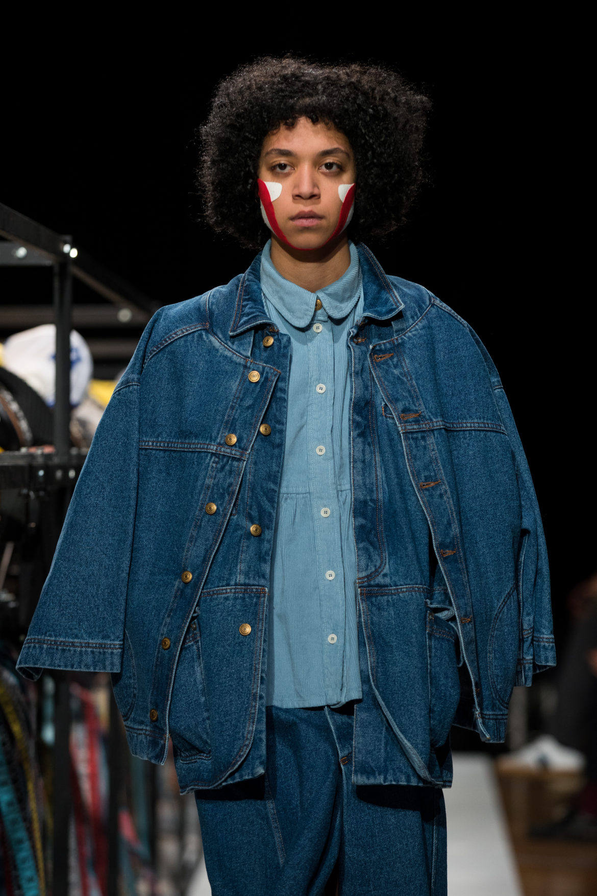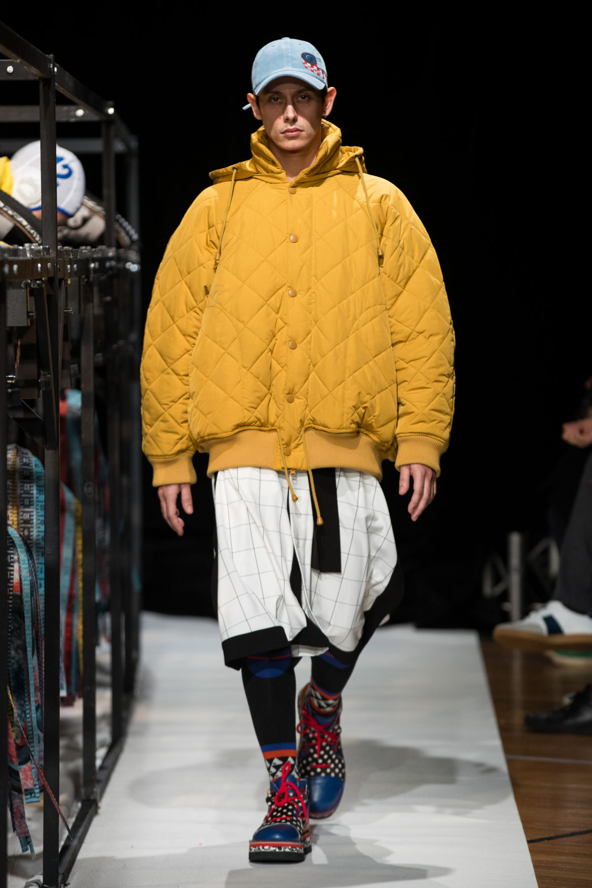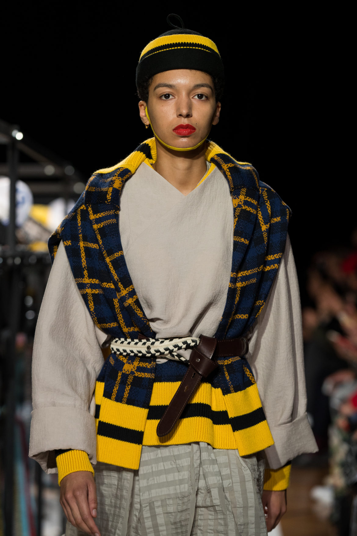 The Man Who Measures the Clouds(L’homme qui mesure les nuages)isan art piece by Jan Fabre that Vibskovcame across last summer during his travels inKanasawa,Japan. Thepoetic gesture of measuring something unmeasurable inspired him and the teamfor theA/W18-collection. To find sense where there is no senseina culture where we are obsessed about numbers,we seek to measure, analyze, compare and categorize. Peopleincreasingly depend on numbers to know how theyare doing for virtually everything.We measure ourselves, size, height, distance, amount, time, intelligence, popularity and even feelings.If you cannumber it, you cancontrol it. We want to pause for a momenttoquestion this number maniaandto know what is going on around us, how our actions impact others, how the environment is changing and how wearechanging.If we want to change what wecare about, shouldn’t we change what we measure?The collection reflects the theme in various ways; prints of littleworking peopletrying to analyzetheir surroundings, oversized ribbing on knitwear that seems like it camefrom another measuring system, free floating paint strokes that don’t want to fit the grid in thebackground, prolonged buttonstands andsleeve slitsand weave onsuiting that shows measure tapes woven into the that garments. Some of the garments are developed from the starting point where pieces from earlier collection were sewn together in new scales and original measurements were swapped around. Fifteen performers inbrightyellow working outfits are controlling manually themechanicalmeasuringmopsthat analyze the bodies lying underneath.Through rhythm,sound, body movement and pulse the installation emphasizes the inspiration of the collection. It is avisualizationon how people become the machine controlled by measurements.