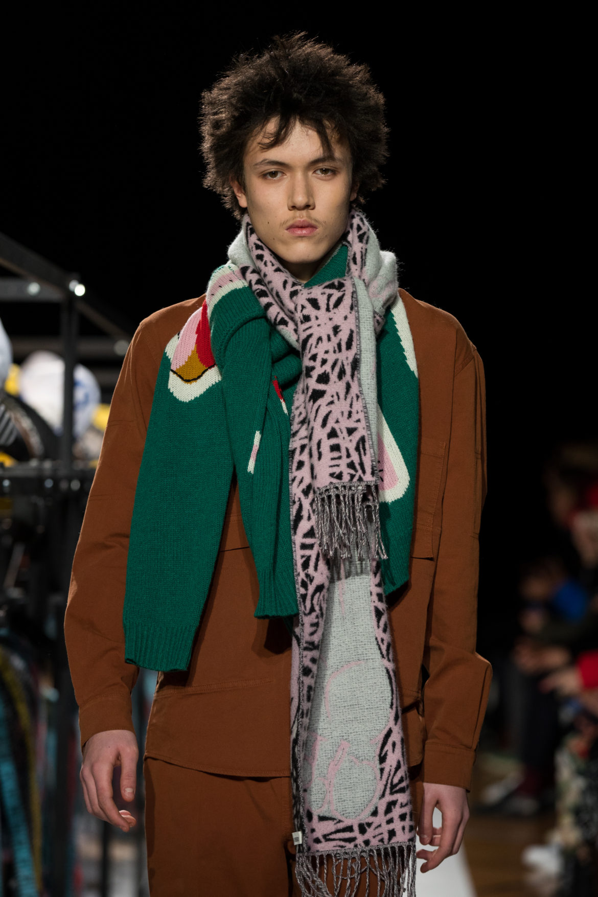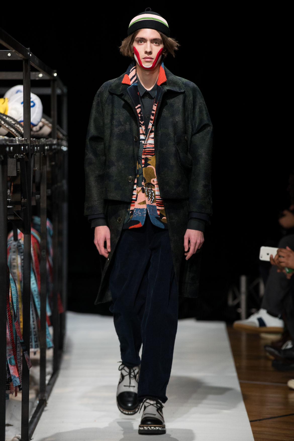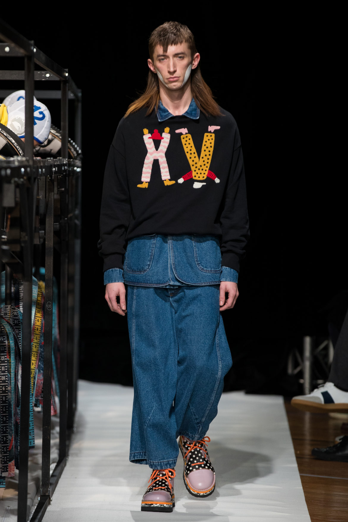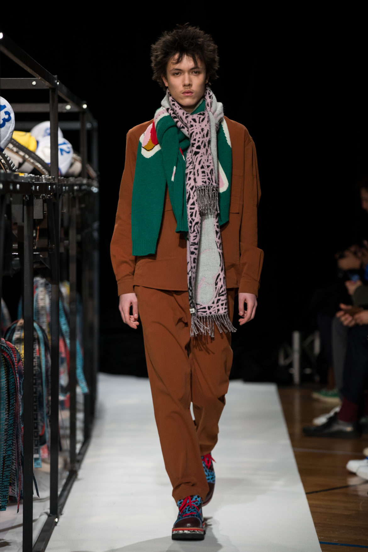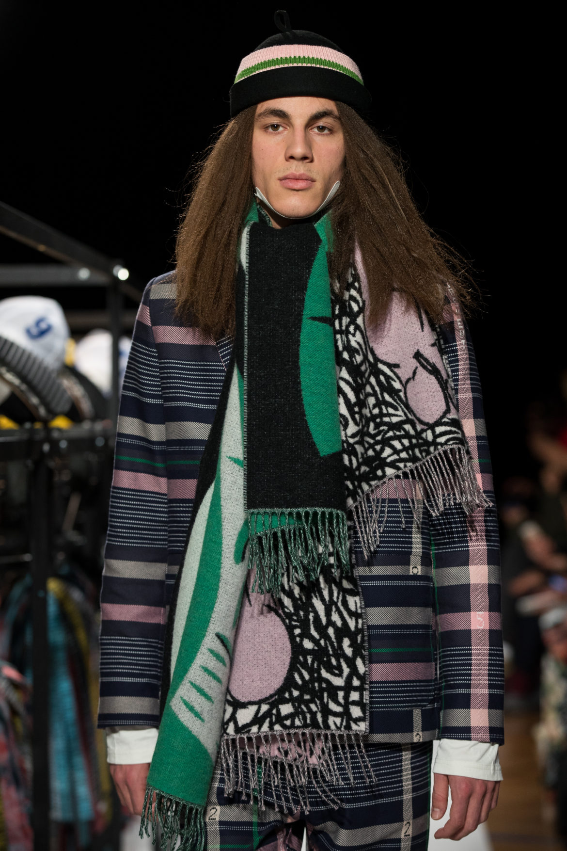 The Man Who Measures the Clouds(L’homme qui mesure les nuages)isan art piece by Jan Fabre that Vibskovcame across last summer during his travels inKanasawa,Japan. Thepoetic gesture of measuring something unmeasurable inspired him and the teamfor theA/W18-collection. To find sense where there is no senseina culture where we are obsessed about numbers,we seek to measure, analyze, compare and categorize. Peopleincreasingly depend on numbers to know how theyare doing for virtually everything.We measure ourselves, size, height, distance, amount, time, intelligence, popularity and even feelings.If you cannumber it, you cancontrol it. We want to pause for a momenttoquestion this number maniaandto know what is going on around us, how our actions impact others, how the environment is changing and how wearechanging.If we want to change what wecare about, shouldn’t we change what we measure?The collection reflects the theme in various ways; prints of littleworking peopletrying to analyzetheir surroundings, oversized ribbing on knitwear that seems like it camefrom another measuring system, free floating paint strokes that don’t want to fit the grid in thebackground, prolonged buttonstands andsleeve slitsand weave onsuiting that shows measure tapes woven into the that garments. Some of the garments are developed from the starting point where pieces from earlier collection were sewn together in new scales and original measurements were swapped around. Fifteen performers inbrightyellow working outfits are controlling manually themechanicalmeasuringmopsthat analyze the bodies lying underneath.Through rhythm,sound, body movement and pulse the installation emphasizes the inspiration of the collection. It is avisualizationon how people become the machine controlled by measurements.