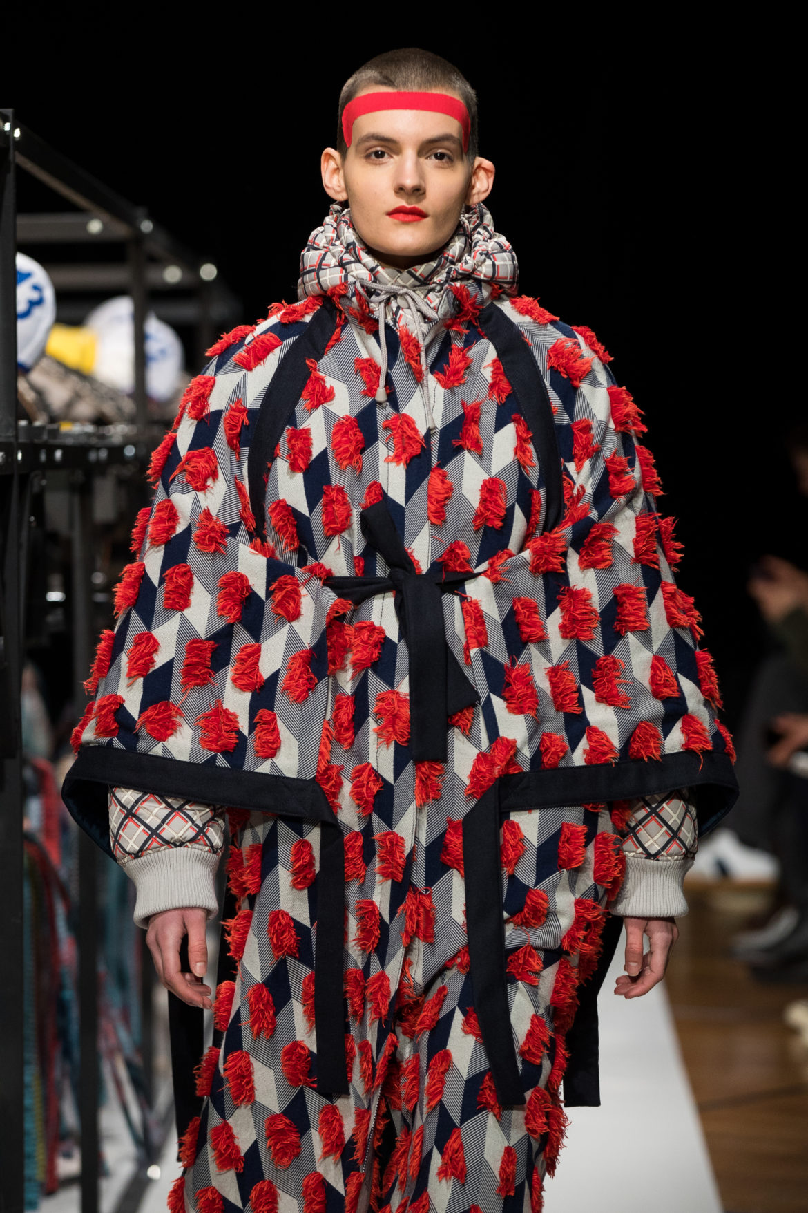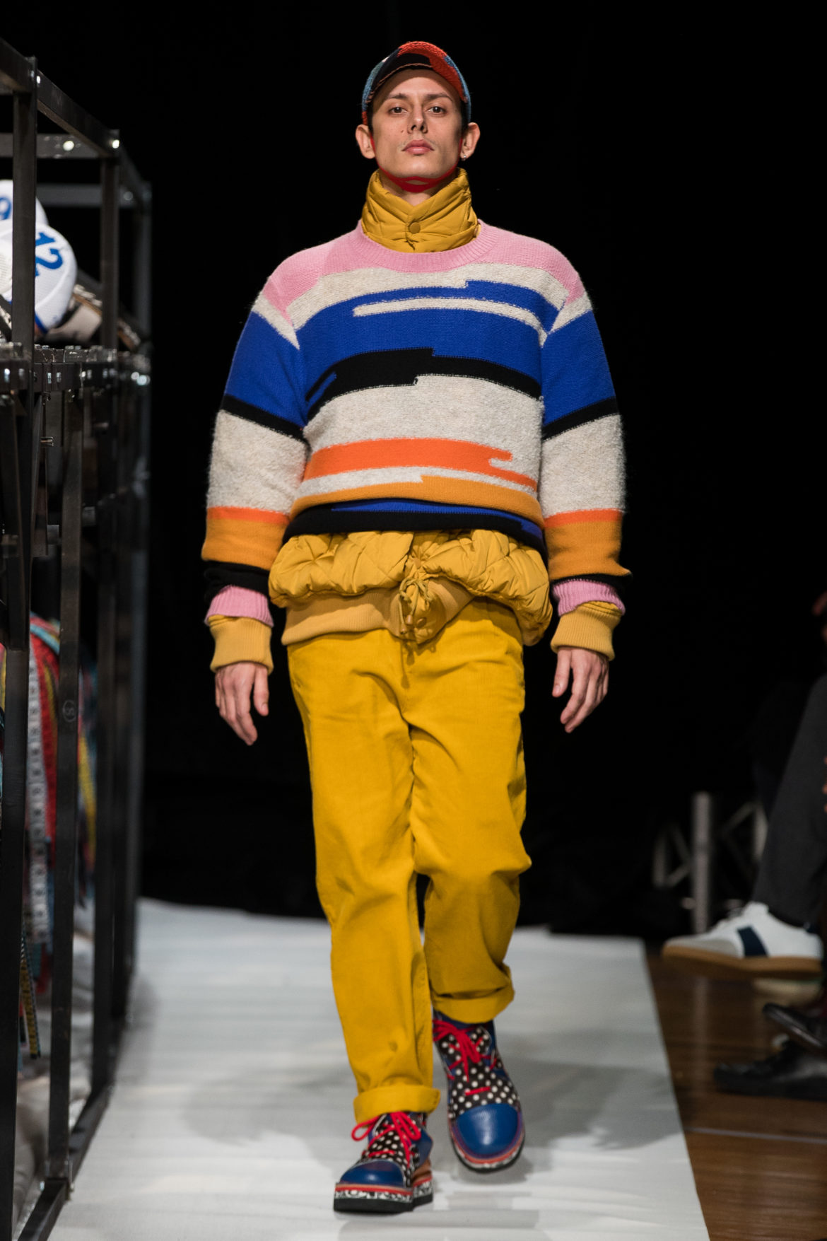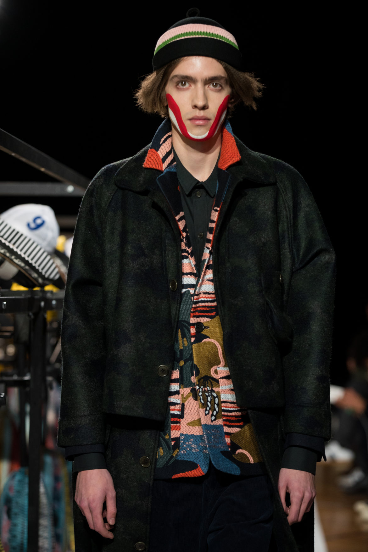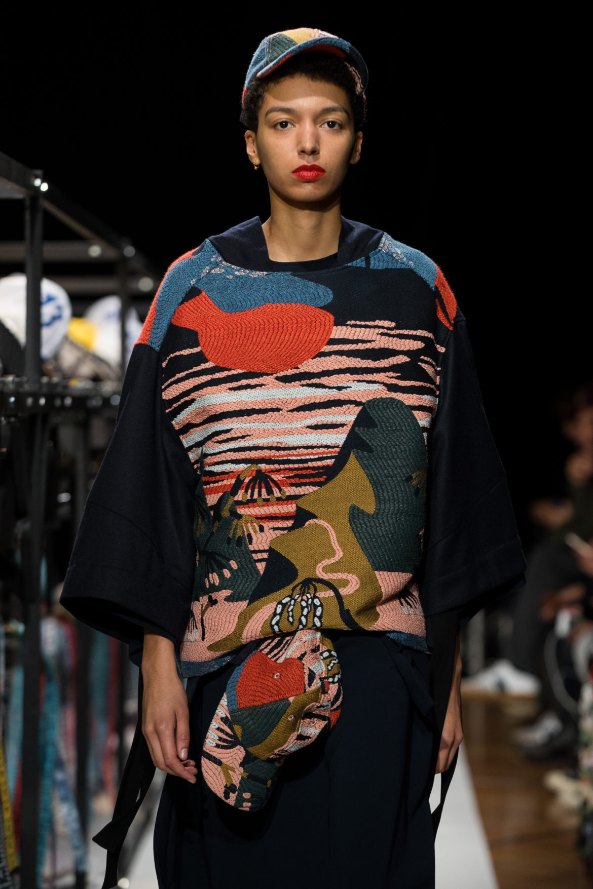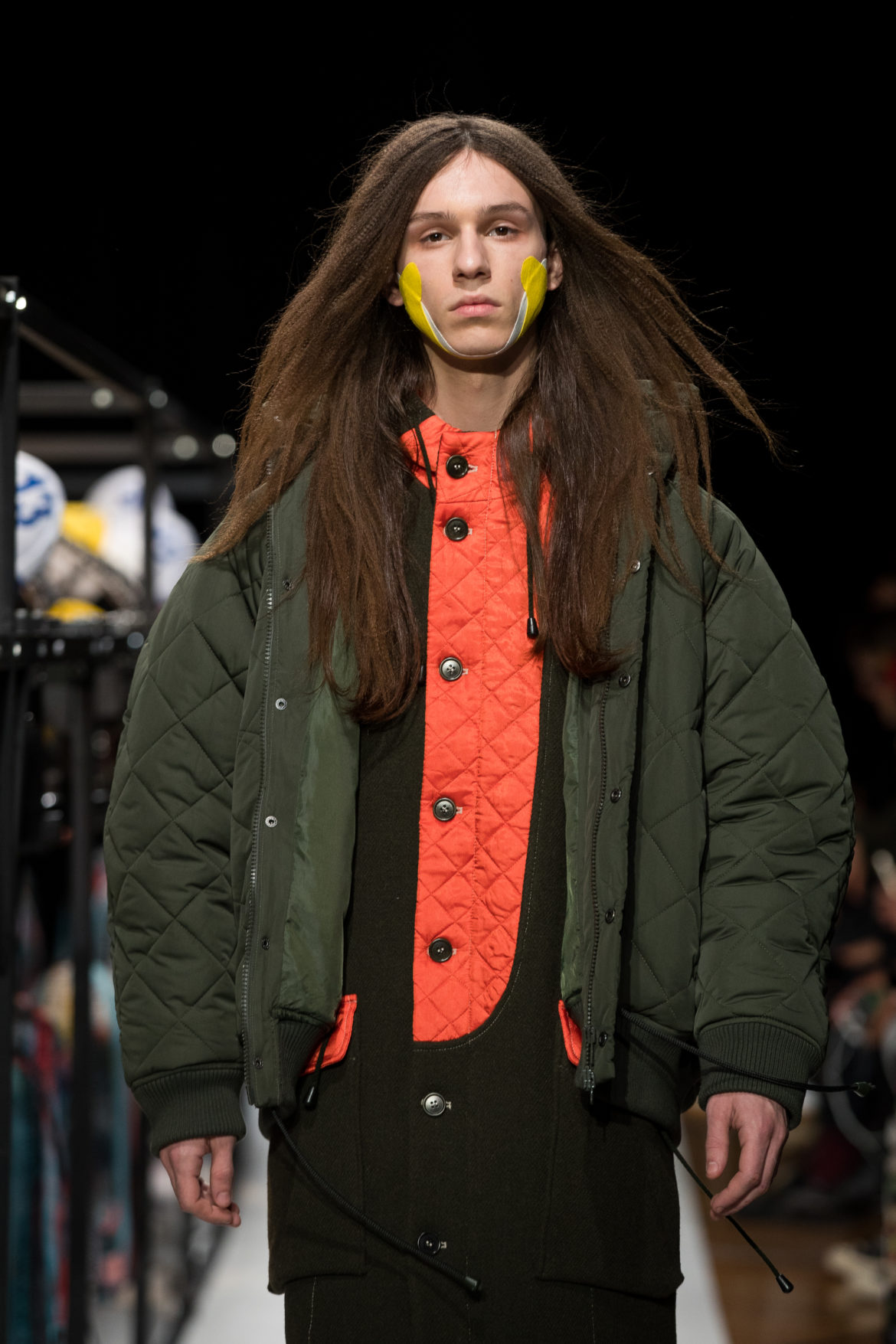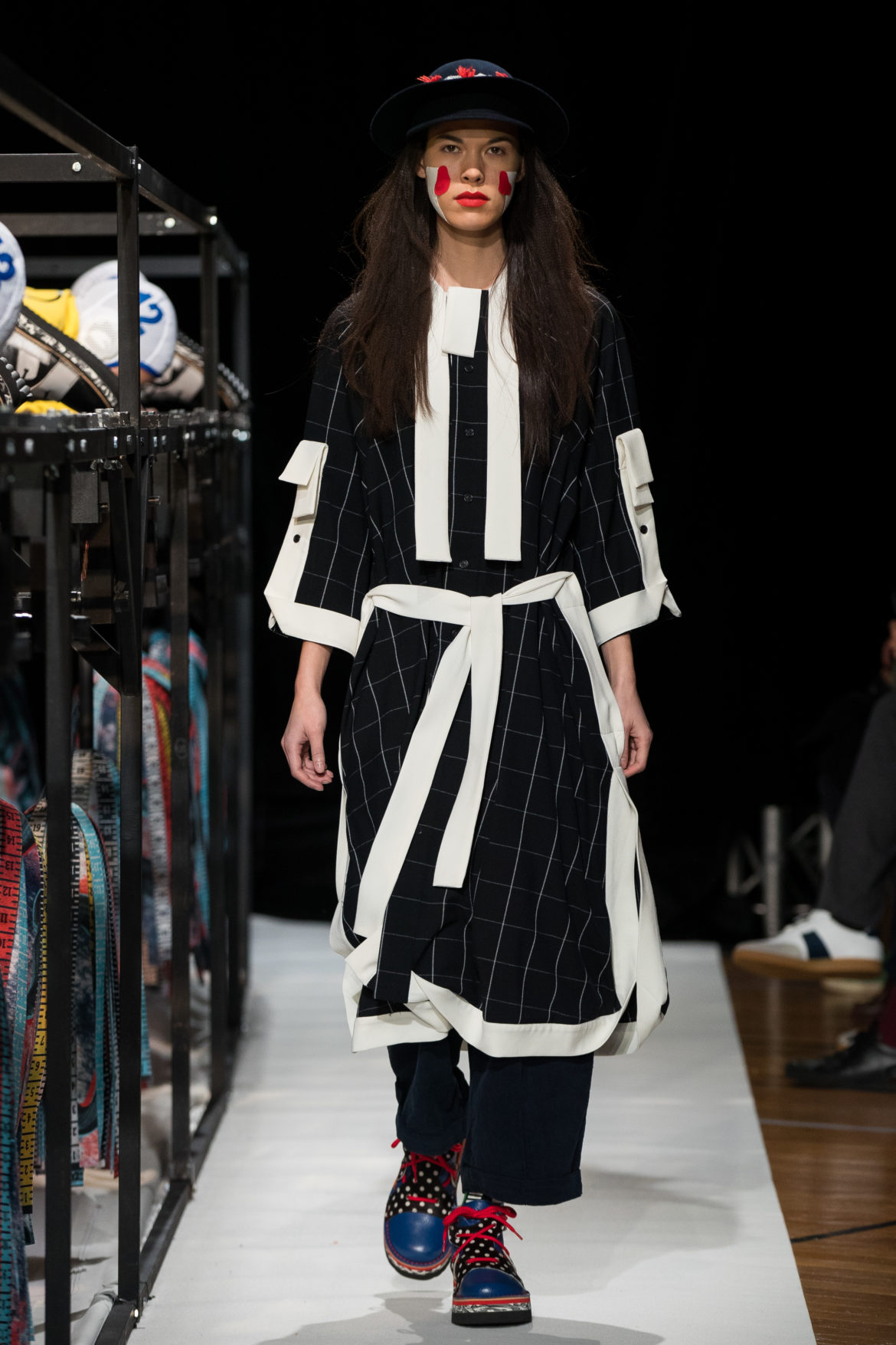 The Man Who Measures the Clouds(L’homme qui mesure les nuages)isan art piece by Jan Fabre that Vibskovcame across last summer during his travels inKanasawa,Japan. Thepoetic gesture of measuring something unmeasurable inspired him and the teamfor theA/W18-collection. To find sense where there is no senseina culture where we are obsessed about numbers,we seek to measure, analyze, compare and categorize. Peopleincreasingly depend on numbers to know how theyare doing for virtually everything.We measure ourselves, size, height, distance, amount, time, intelligence, popularity and even feelings.If you cannumber it, you cancontrol it. We want to pause for a momenttoquestion this number maniaandto know what is going on around us, how our actions impact others, how the environment is changing and how wearechanging.If we want to change what wecare about, shouldn’t we change what we measure?The collection reflects the theme in various ways; prints of littleworking peopletrying to analyzetheir surroundings, oversized ribbing on knitwear that seems like it camefrom another measuring system, free floating paint strokes that don’t want to fit the grid in thebackground, prolonged buttonstands andsleeve slitsand weave onsuiting that shows measure tapes woven into the that garments. Some of the garments are developed from the starting point where pieces from earlier collection were sewn together in new scales and original measurements were swapped around. Fifteen performers inbrightyellow working outfits are controlling manually themechanicalmeasuringmopsthat analyze the bodies lying underneath.Through rhythm,sound, body movement and pulse the installation emphasizes the inspiration of the collection. It is avisualizationon how people become the machine controlled by measurements.