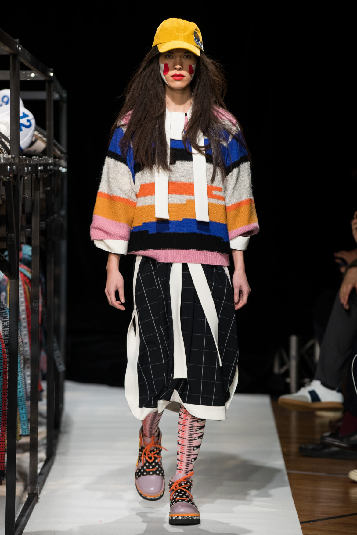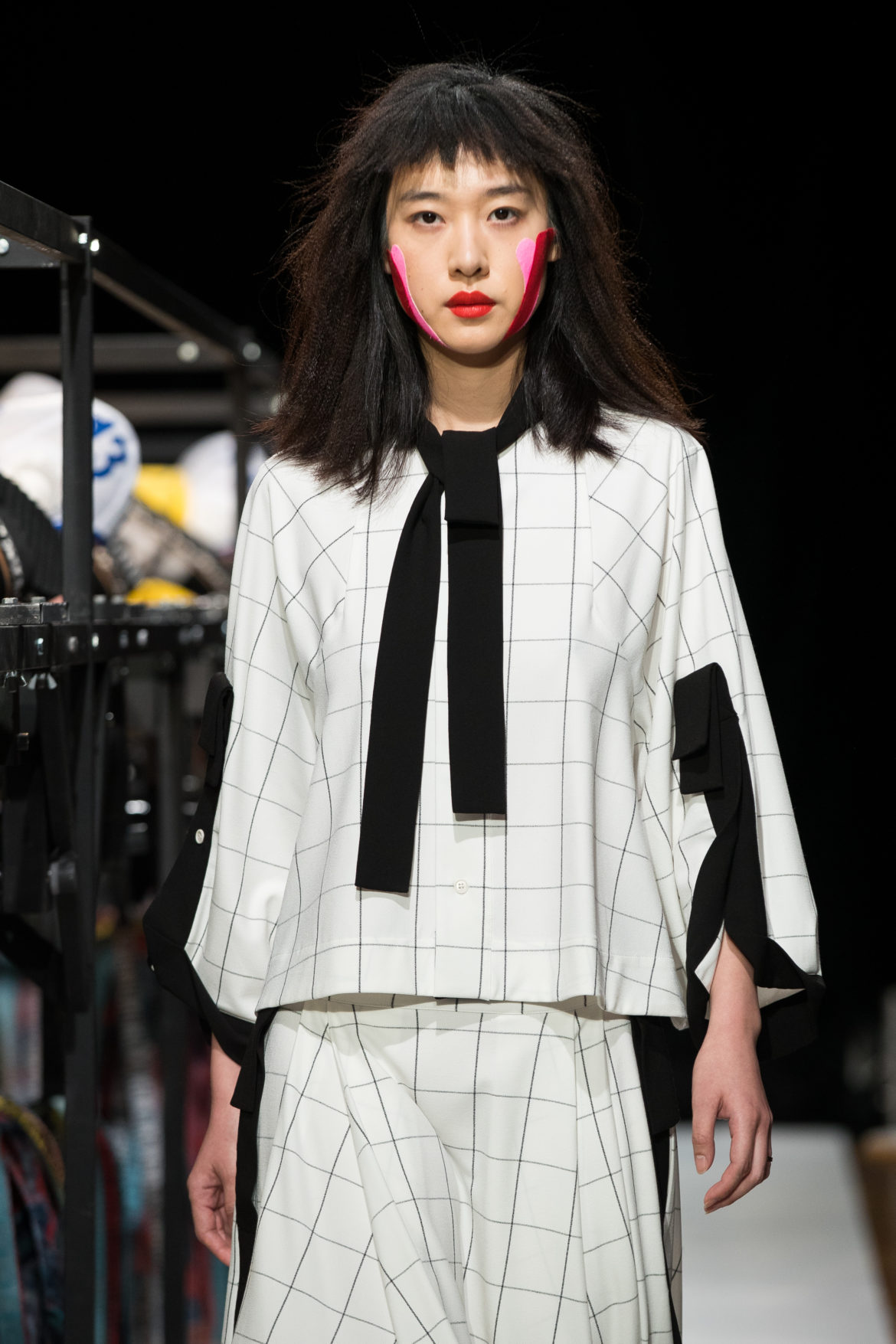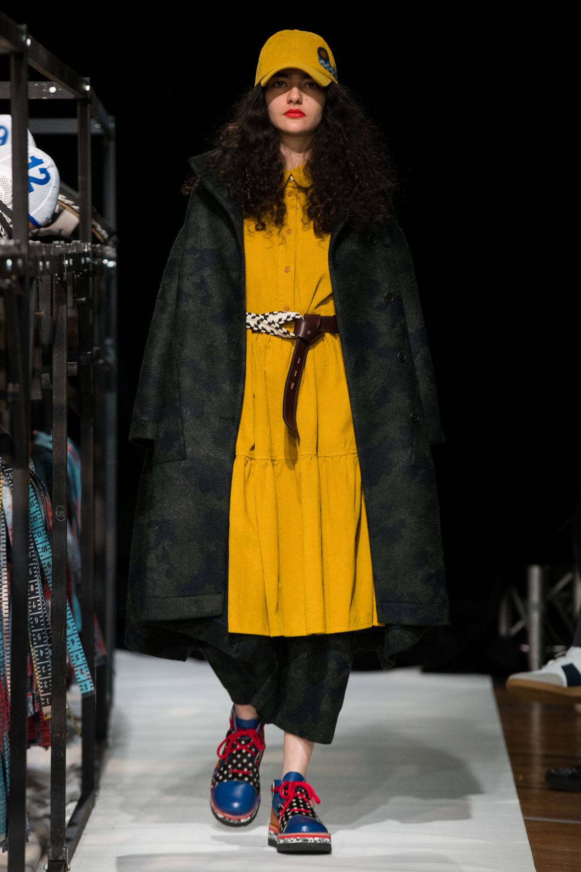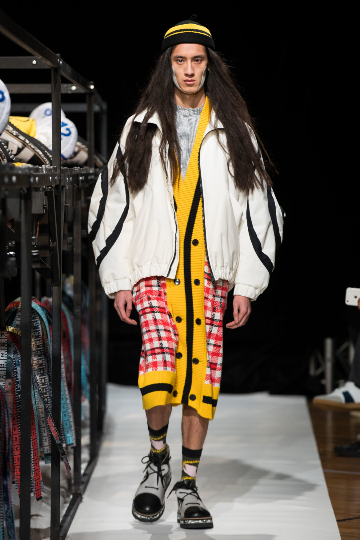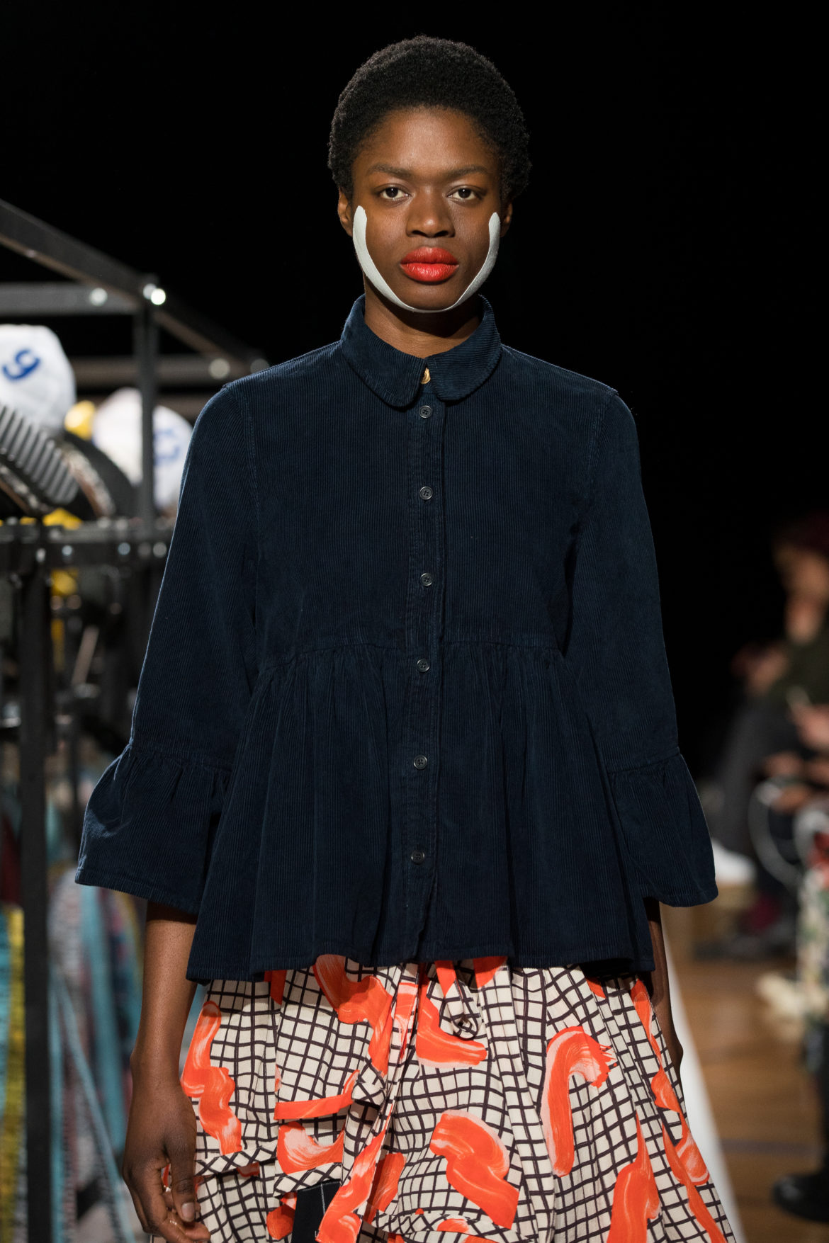 The Man Who Measures the Clouds(L’homme qui mesure les nuages)isan art piece by Jan Fabre that Vibskovcame across last summer during his travels inKanasawa,Japan. Thepoetic gesture of measuring something unmeasurable inspired him and the teamfor theA/W18-collection. To find sense where there is no senseina culture where we are obsessed about numbers,we seek to measure, analyze, compare and categorize. Peopleincreasingly depend on numbers to know how theyare doing for virtually everything.We measure ourselves, size, height, distance, amount, time, intelligence, popularity and even feelings.If you cannumber it, you cancontrol it. We want to pause for a momenttoquestion this number maniaandto know what is going on around us, how our actions impact others, how the environment is changing and how wearechanging.If we want to change what wecare about, shouldn’t we change what we measure?The collection reflects the theme in various ways; prints of littleworking peopletrying to analyzetheir surroundings, oversized ribbing on knitwear that seems like it camefrom another measuring system, free floating paint strokes that don’t want to fit the grid in thebackground, prolonged buttonstands andsleeve slitsand weave onsuiting that shows measure tapes woven into the that garments. Some of the garments are developed from the starting point where pieces from earlier collection were sewn together in new scales and original measurements were swapped around. Fifteen performers inbrightyellow working outfits are controlling manually themechanicalmeasuringmopsthat analyze the bodies lying underneath.Through rhythm,sound, body movement and pulse the installation emphasizes the inspiration of the collection. It is avisualizationon how people become the machine controlled by measurements.