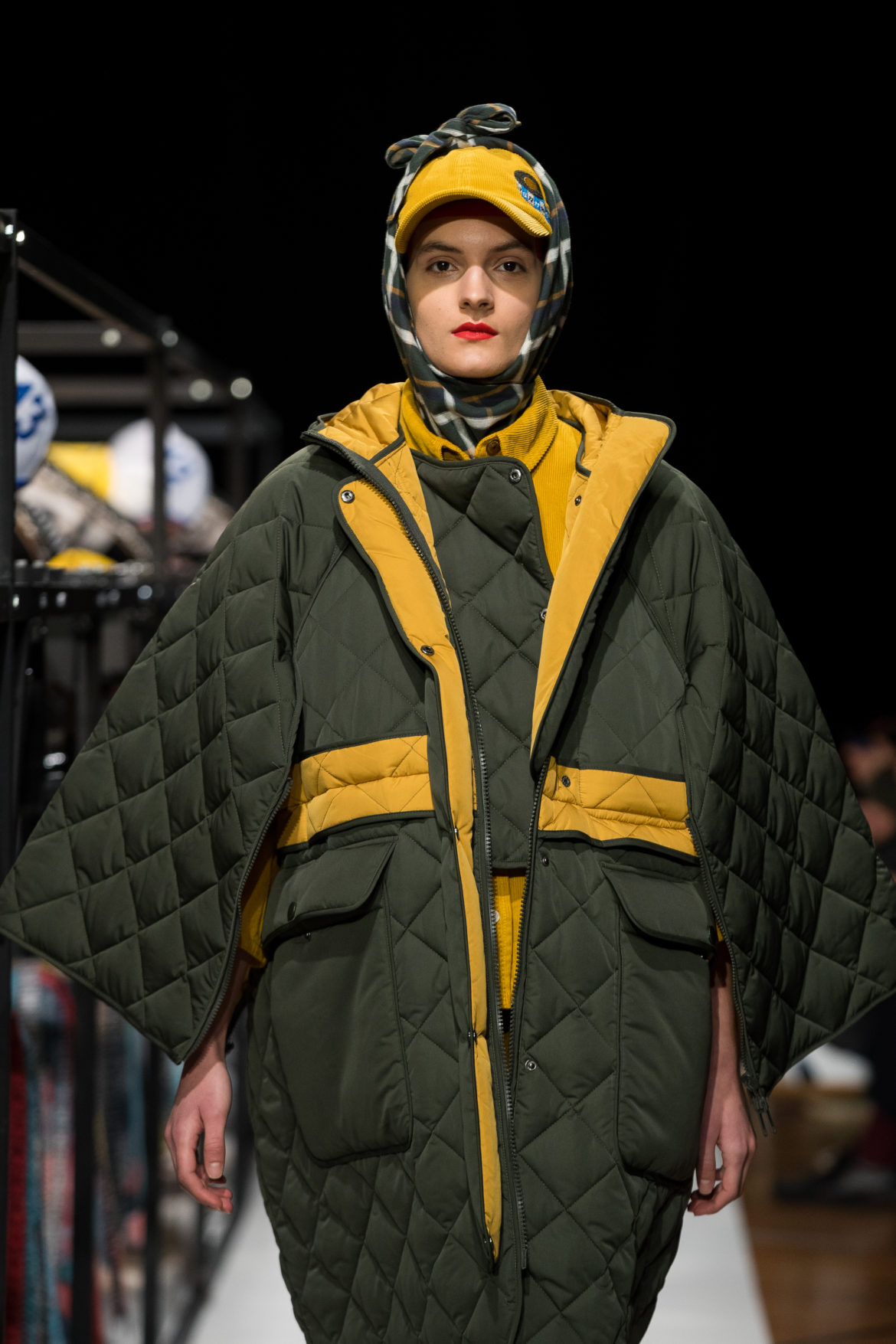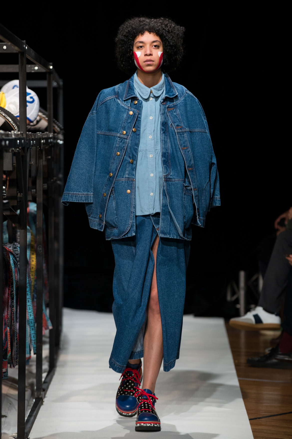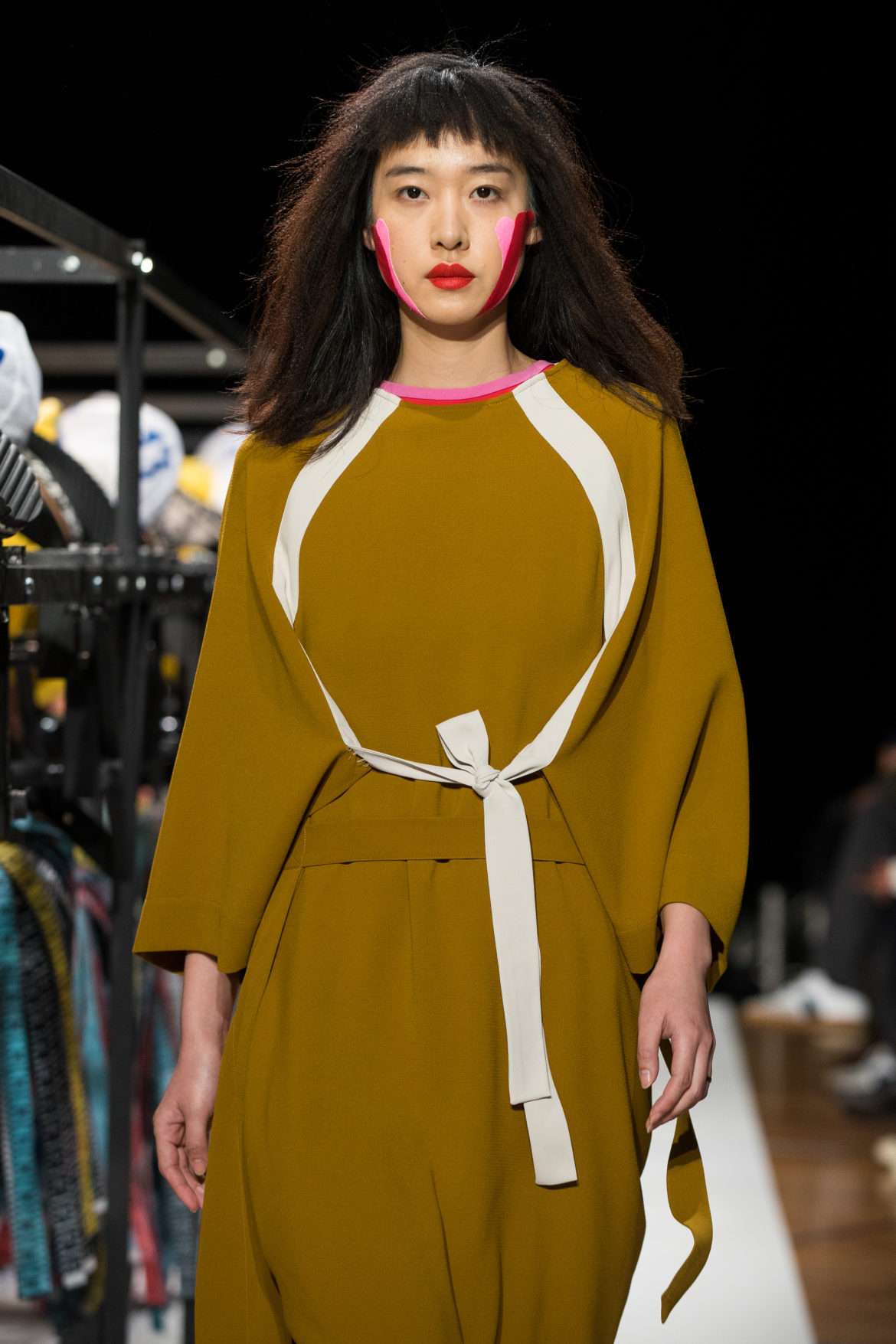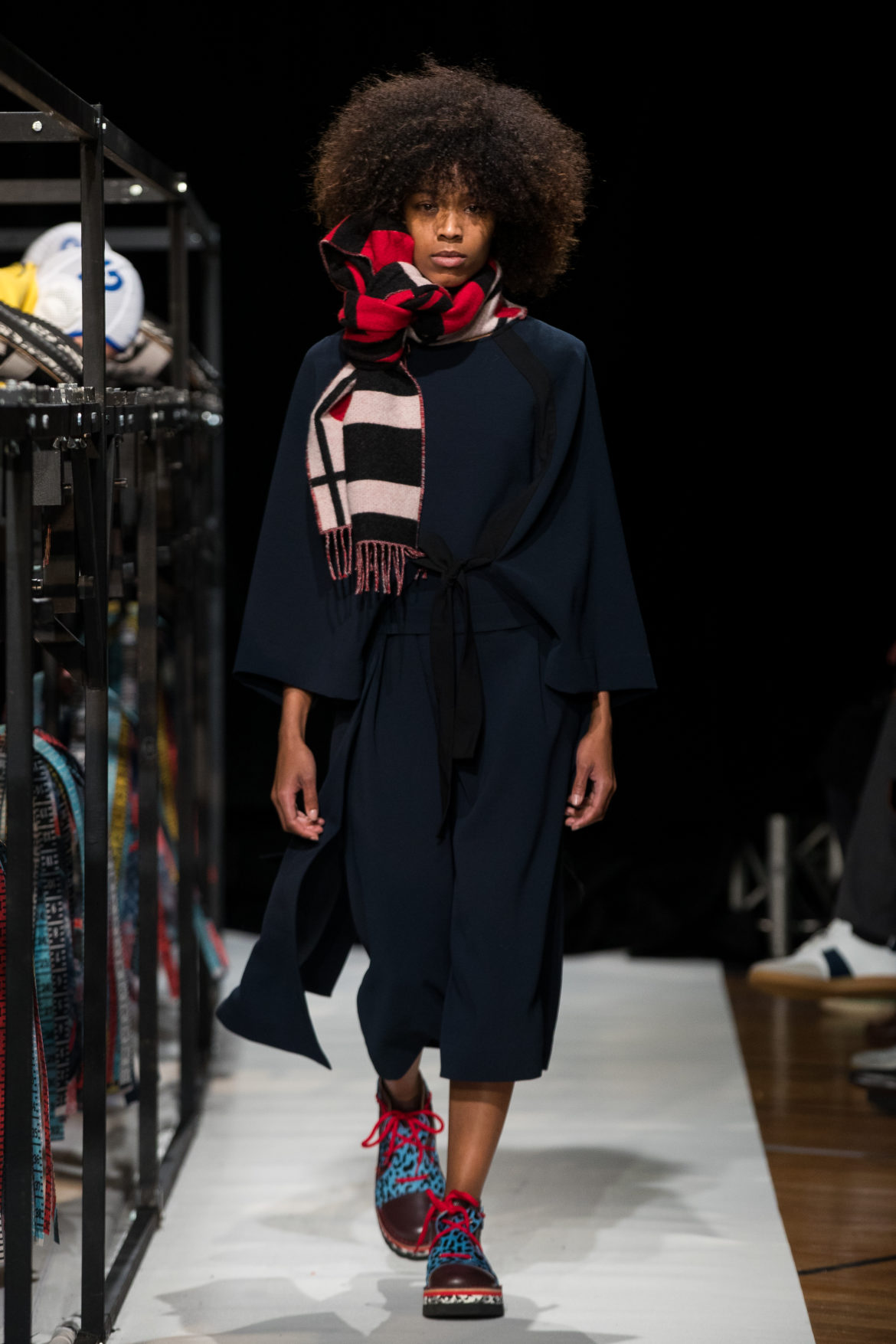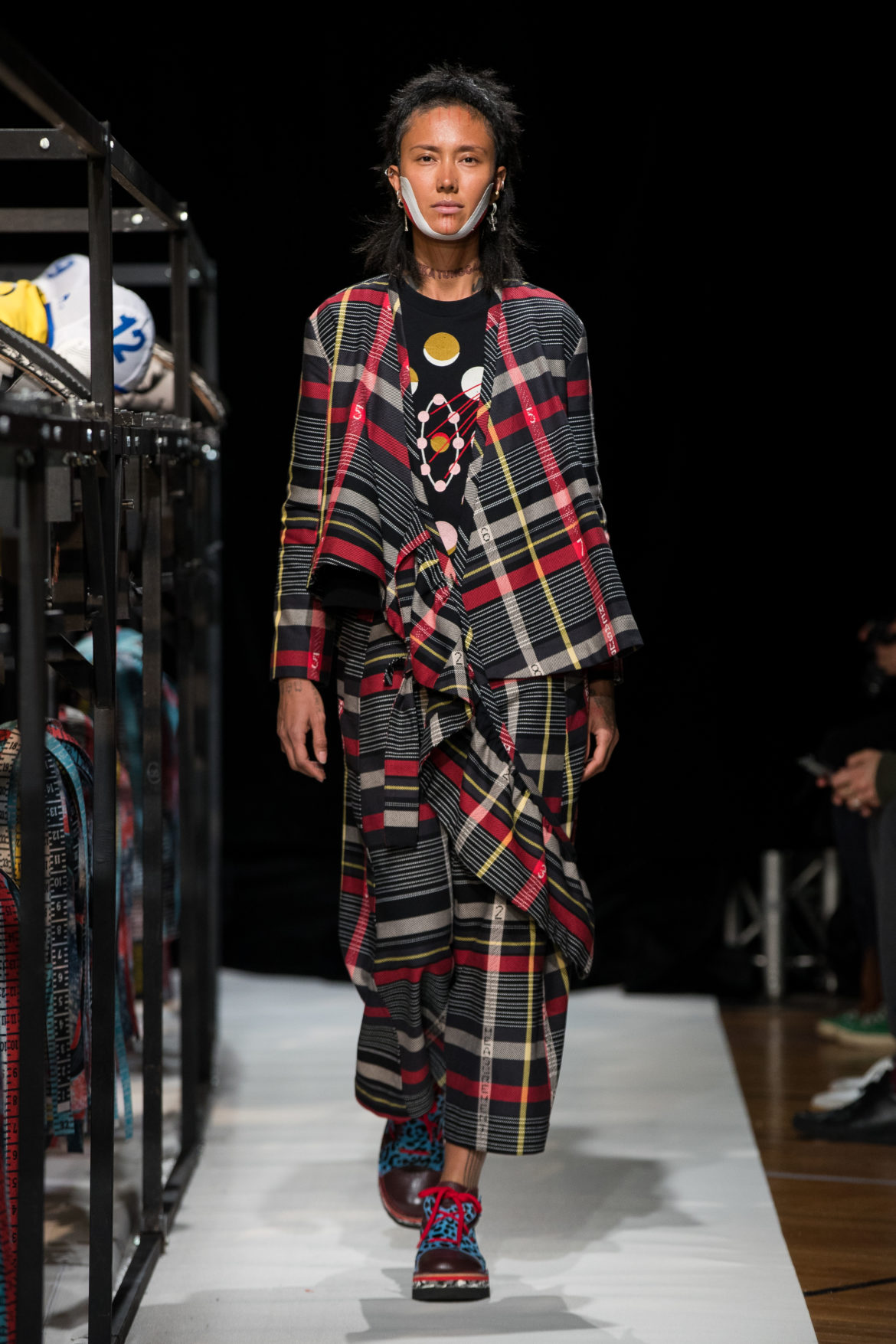 The Man Who Measures the Clouds(L’homme qui mesure les nuages)isan art piece by Jan Fabre that Vibskovcame across last summer during his travels inKanasawa,Japan. Thepoetic gesture of measuring something unmeasurable inspired him and the teamfor theA/W18-collection. To find sense where there is no senseina culture where we are obsessed about numbers,we seek to measure, analyze, compare and categorize. Peopleincreasingly depend on numbers to know how theyare doing for virtually everything.We measure ourselves, size, height, distance, amount, time, intelligence, popularity and even feelings.If you cannumber it, you cancontrol it. We want to pause for a momenttoquestion this number maniaandto know what is going on around us, how our actions impact others, how the environment is changing and how wearechanging.If we want to change what wecare about, shouldn’t we change what we measure?The collection reflects the theme in various ways; prints of littleworking peopletrying to analyzetheir surroundings, oversized ribbing on knitwear that seems like it camefrom another measuring system, free floating paint strokes that don’t want to fit the grid in thebackground, prolonged buttonstands andsleeve slitsand weave onsuiting that shows measure tapes woven into the that garments. Some of the garments are developed from the starting point where pieces from earlier collection were sewn together in new scales and original measurements were swapped around. Fifteen performers inbrightyellow working outfits are controlling manually themechanicalmeasuringmopsthat analyze the bodies lying underneath.Through rhythm,sound, body movement and pulse the installation emphasizes the inspiration of the collection. It is avisualizationon how people become the machine controlled by measurements.