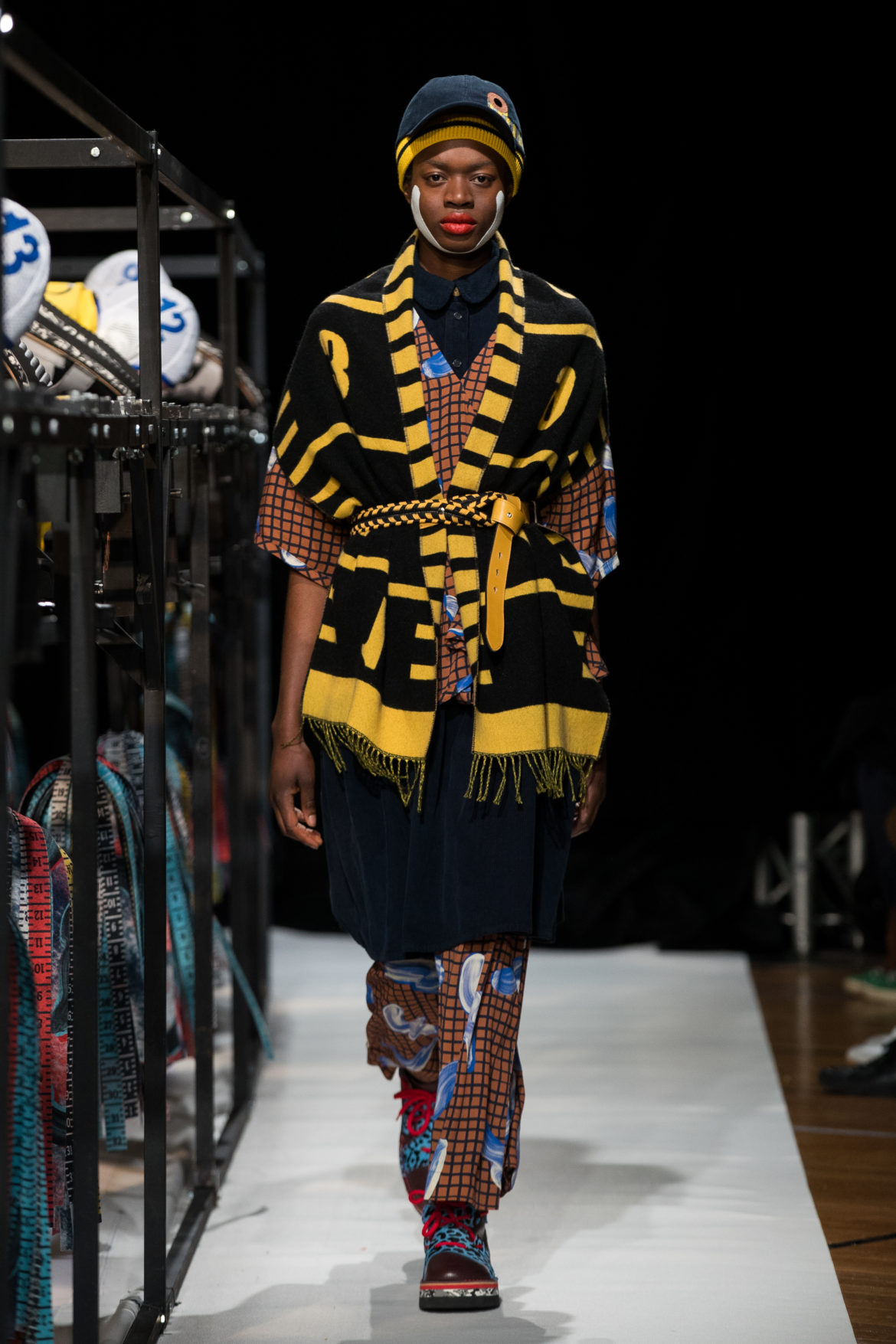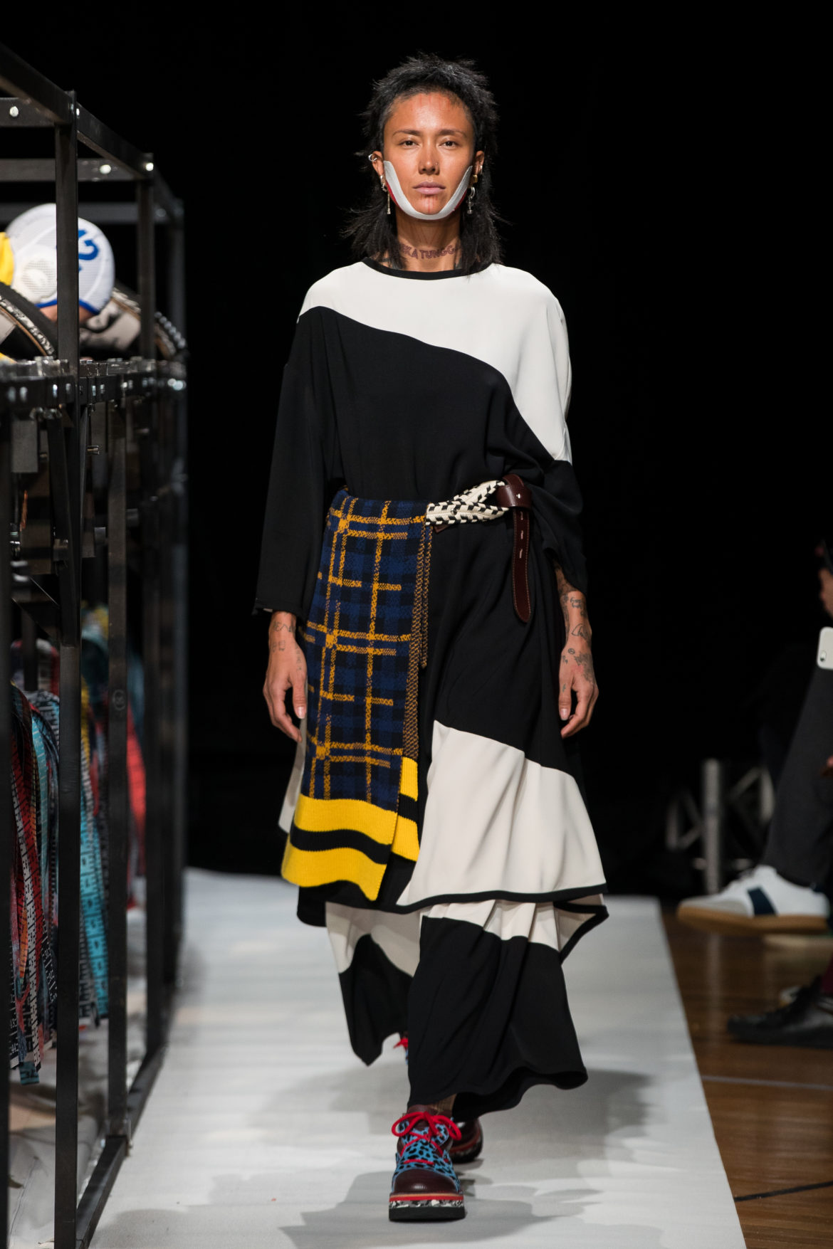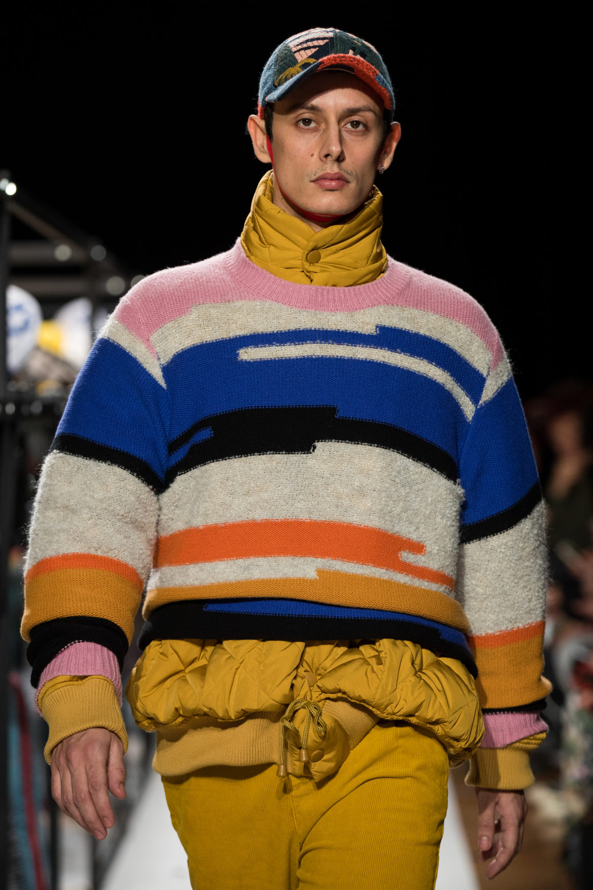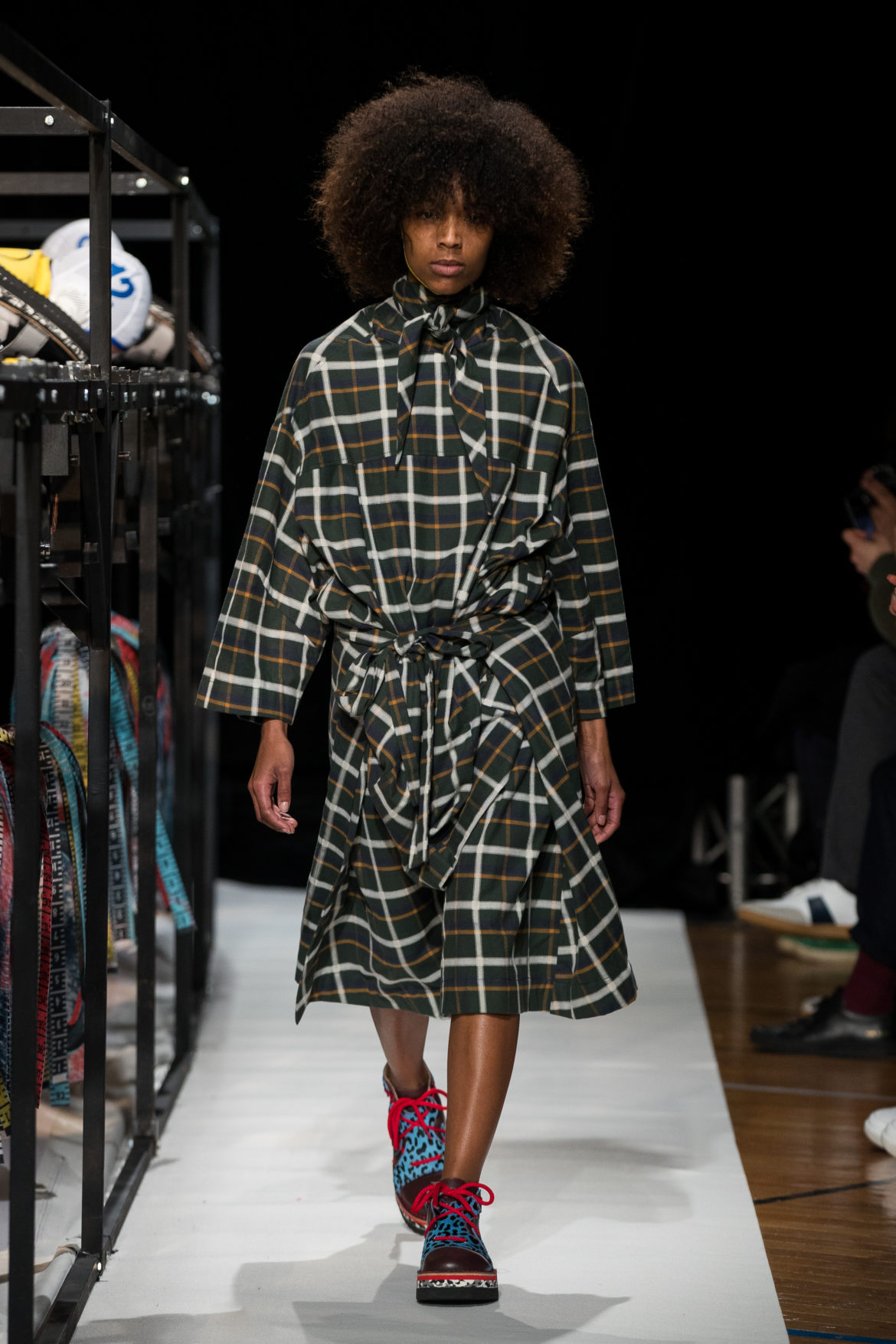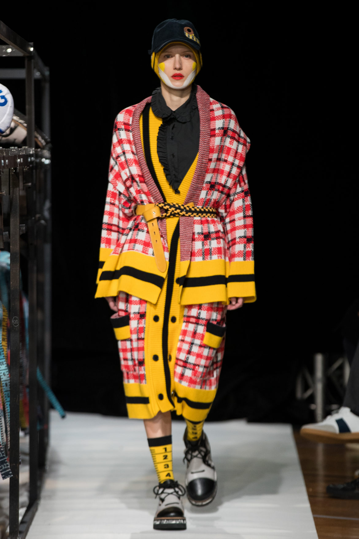 The Man Who Measures the Clouds(L’homme qui mesure les nuages)isan art piece by Jan Fabre that Vibskovcame across last summer during his travels inKanasawa,Japan. Thepoetic gesture of measuring something unmeasurable inspired him and the teamfor theA/W18-collection. To find sense where there is no senseina culture where we are obsessed about numbers,we seek to measure, analyze, compare and categorize. Peopleincreasingly depend on numbers to know how theyare doing for virtually everything.We measure ourselves, size, height, distance, amount, time, intelligence, popularity and even feelings.If you cannumber it, you cancontrol it. We want to pause for a momenttoquestion this number maniaandto know what is going on around us, how our actions impact others, how the environment is changing and how wearechanging.If we want to change what wecare about, shouldn’t we change what we measure?The collection reflects the theme in various ways; prints of littleworking peopletrying to analyzetheir surroundings, oversized ribbing on knitwear that seems like it camefrom another measuring system, free floating paint strokes that don’t want to fit the grid in thebackground, prolonged buttonstands andsleeve slitsand weave onsuiting that shows measure tapes woven into the that garments. Some of the garments are developed from the starting point where pieces from earlier collection were sewn together in new scales and original measurements were swapped around. Fifteen performers inbrightyellow working outfits are controlling manually themechanicalmeasuringmopsthat analyze the bodies lying underneath.Through rhythm,sound, body movement and pulse the installation emphasizes the inspiration of the collection. It is avisualizationon how people become the machine controlled by measurements.