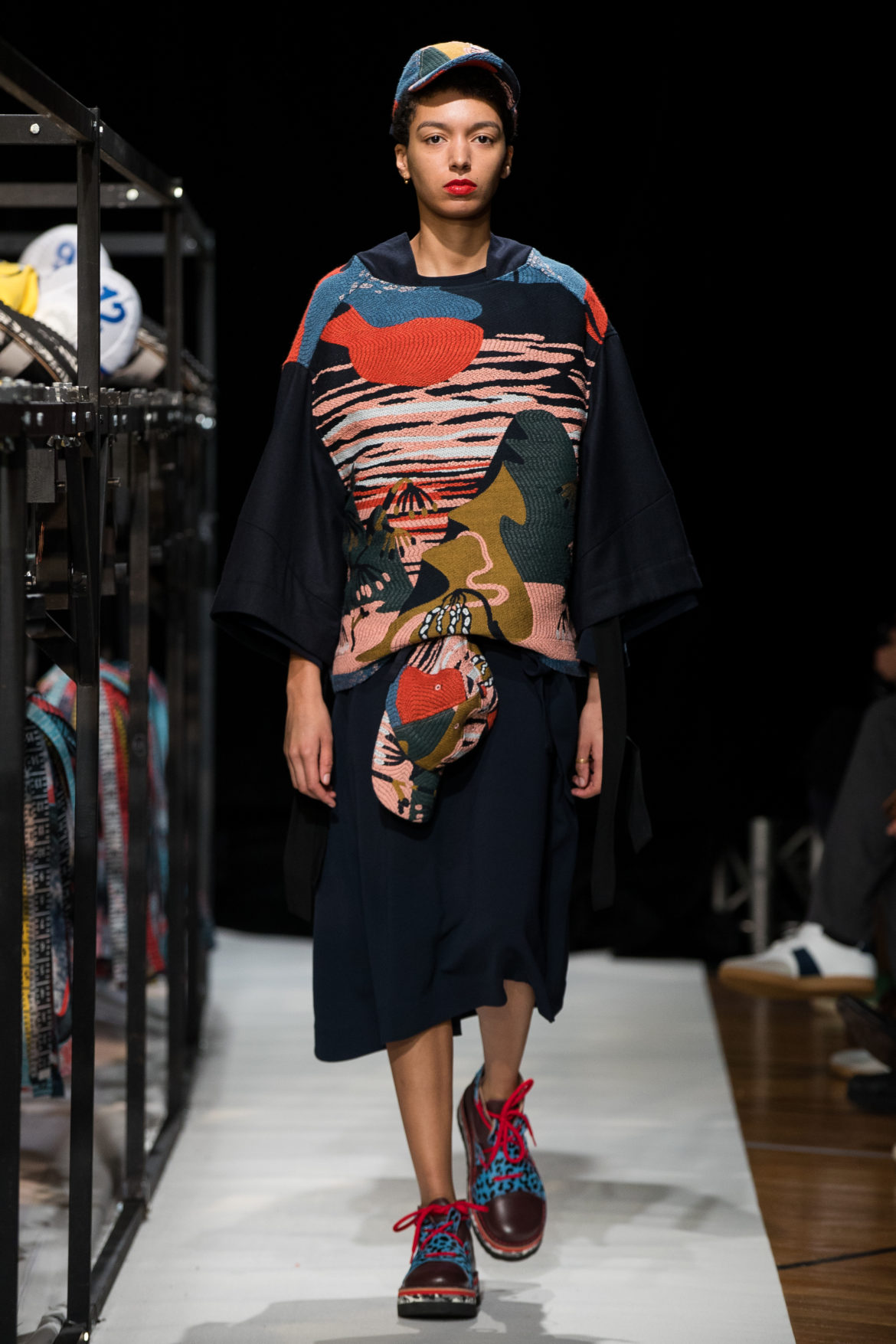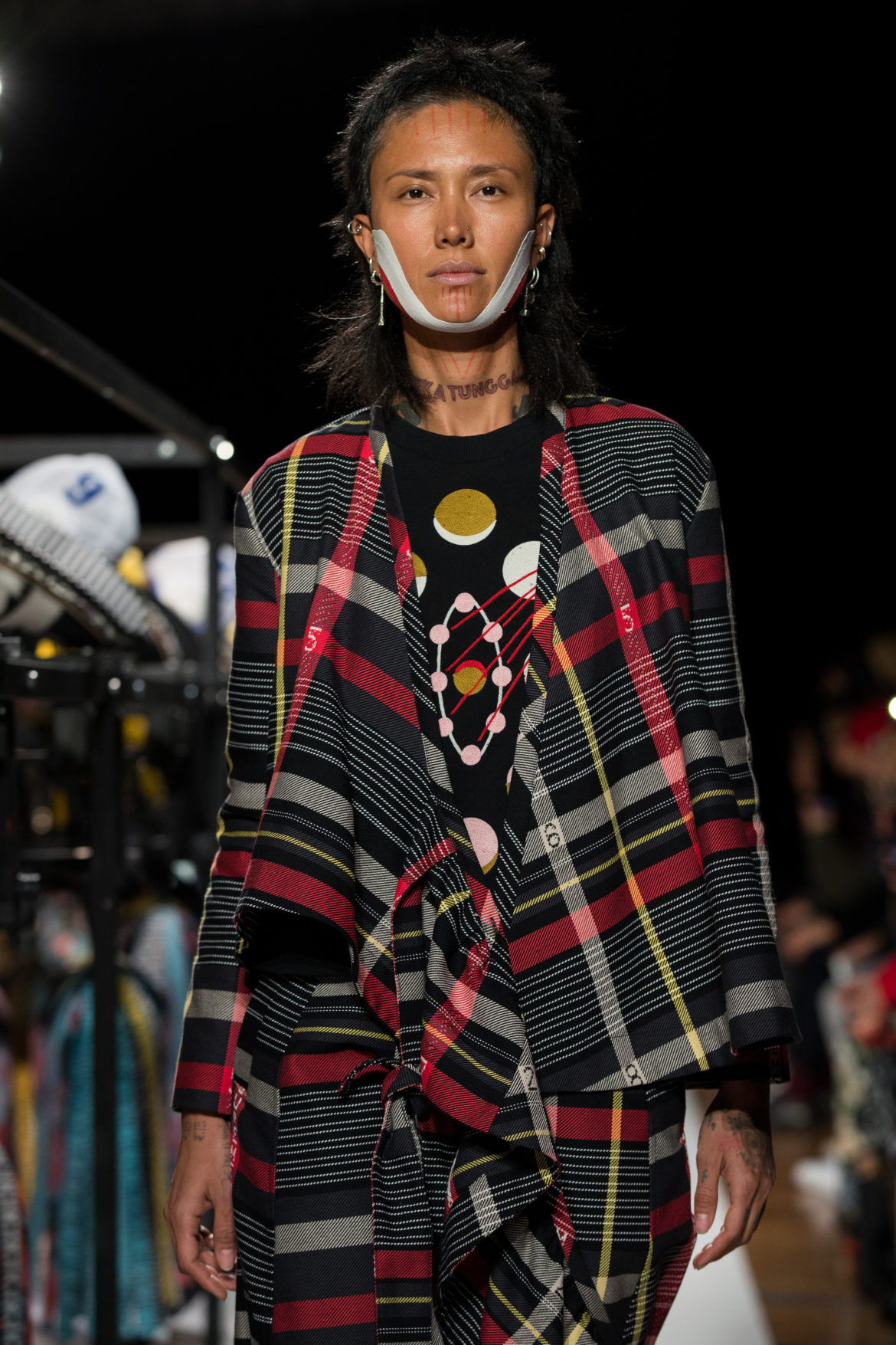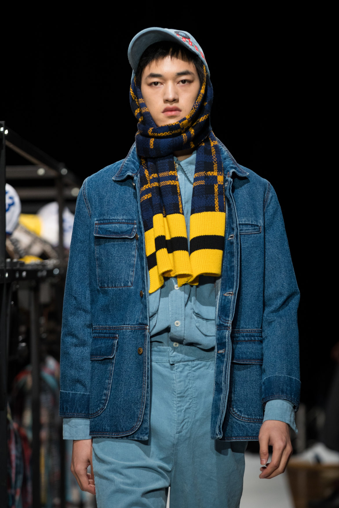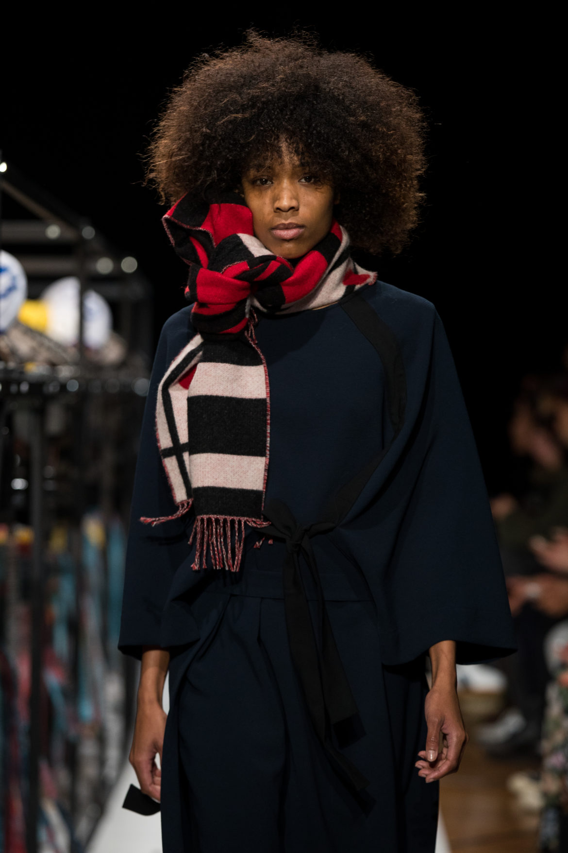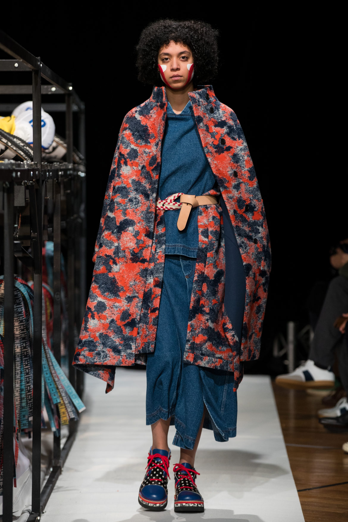 The Man Who Measures the Clouds(L’homme qui mesure les nuages)isan art piece by Jan Fabre that Vibskovcame across last summer during his travels inKanasawa,Japan. Thepoetic gesture of measuring something unmeasurable inspired him and the teamfor theA/W18-collection. To find sense where there is no senseina culture where we are obsessed about numbers,we seek to measure, analyze, compare and categorize. Peopleincreasingly depend on numbers to know how theyare doing for virtually everything.We measure ourselves, size, height, distance, amount, time, intelligence, popularity and even feelings.If you cannumber it, you cancontrol it. We want to pause for a momenttoquestion this number maniaandto know what is going on around us, how our actions impact others, how the environment is changing and how wearechanging.If we want to change what wecare about, shouldn’t we change what we measure?The collection reflects the theme in various ways; prints of littleworking peopletrying to analyzetheir surroundings, oversized ribbing on knitwear that seems like it camefrom another measuring system, free floating paint strokes that don’t want to fit the grid in thebackground, prolonged buttonstands andsleeve slitsand weave onsuiting that shows measure tapes woven into the that garments. Some of the garments are developed from the starting point where pieces from earlier collection were sewn together in new scales and original measurements were swapped around. Fifteen performers inbrightyellow working outfits are controlling manually themechanicalmeasuringmopsthat analyze the bodies lying underneath.Through rhythm,sound, body movement and pulse the installation emphasizes the inspiration of the collection. It is avisualizationon how people become the machine controlled by measurements.