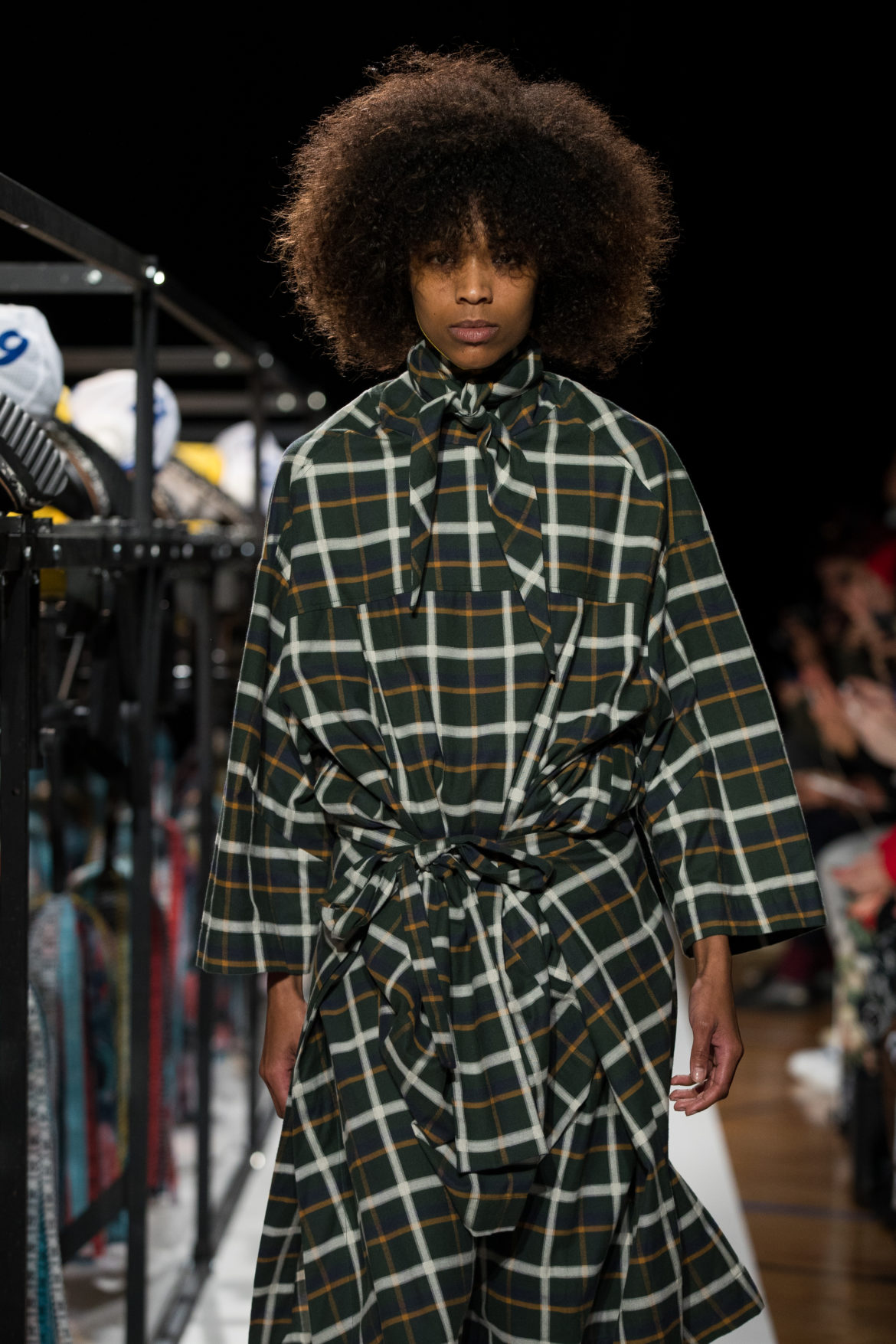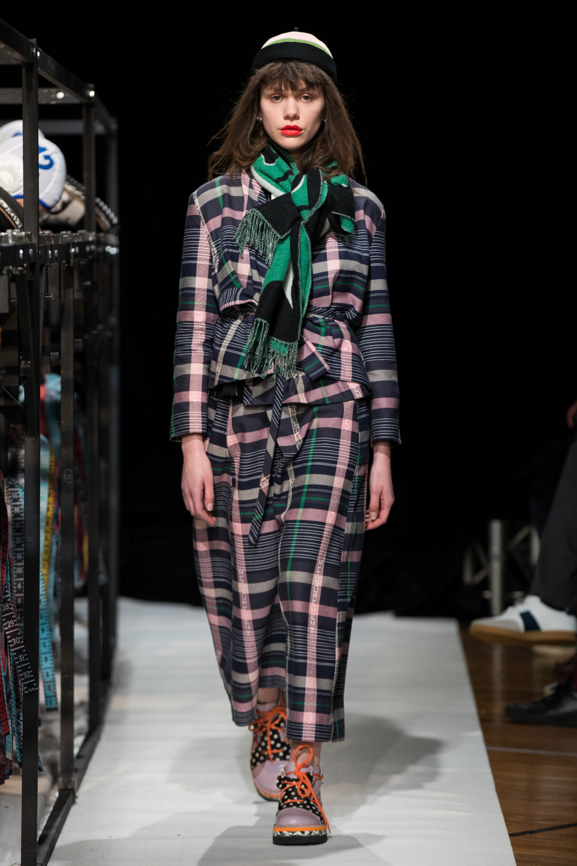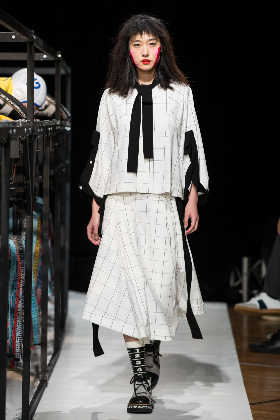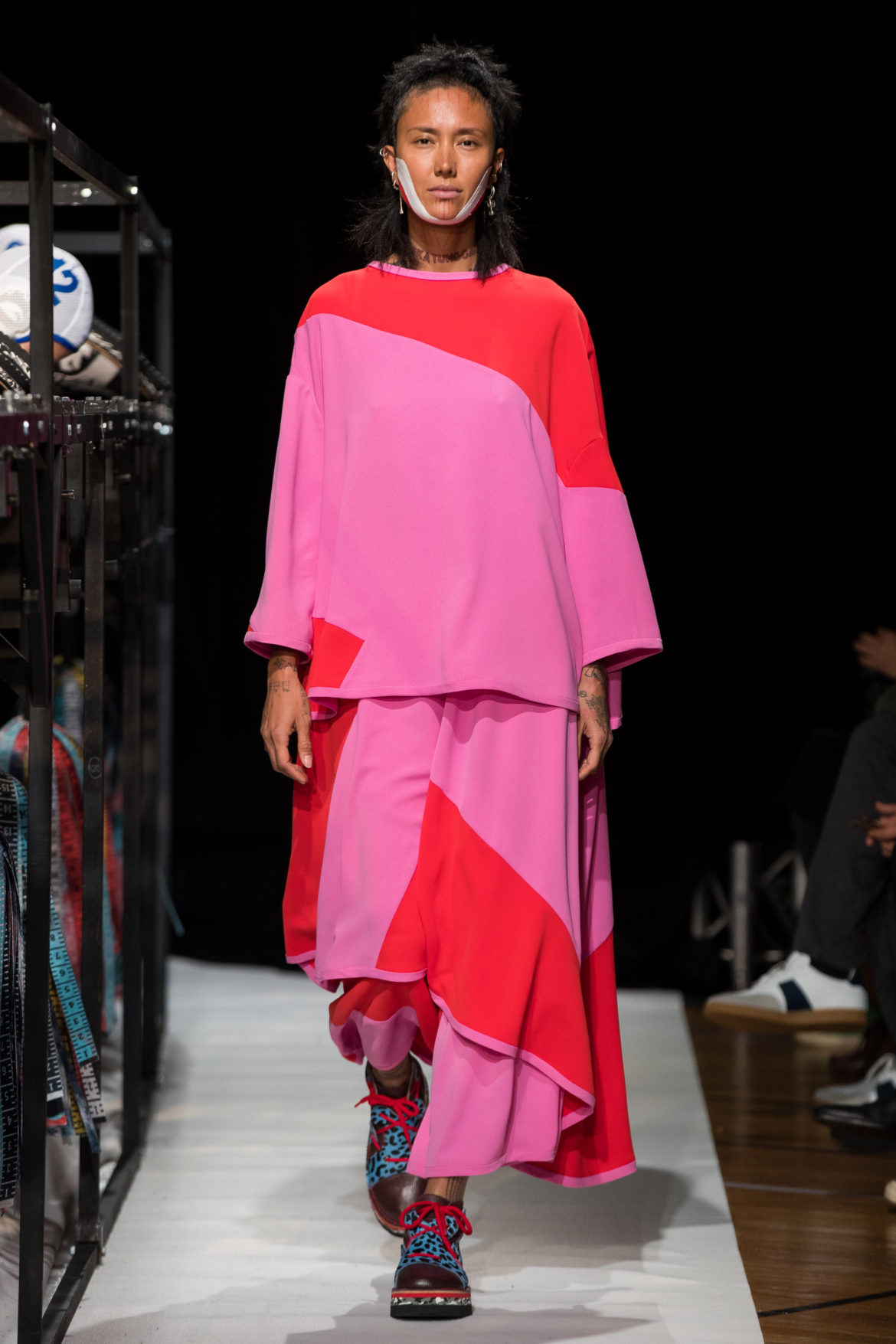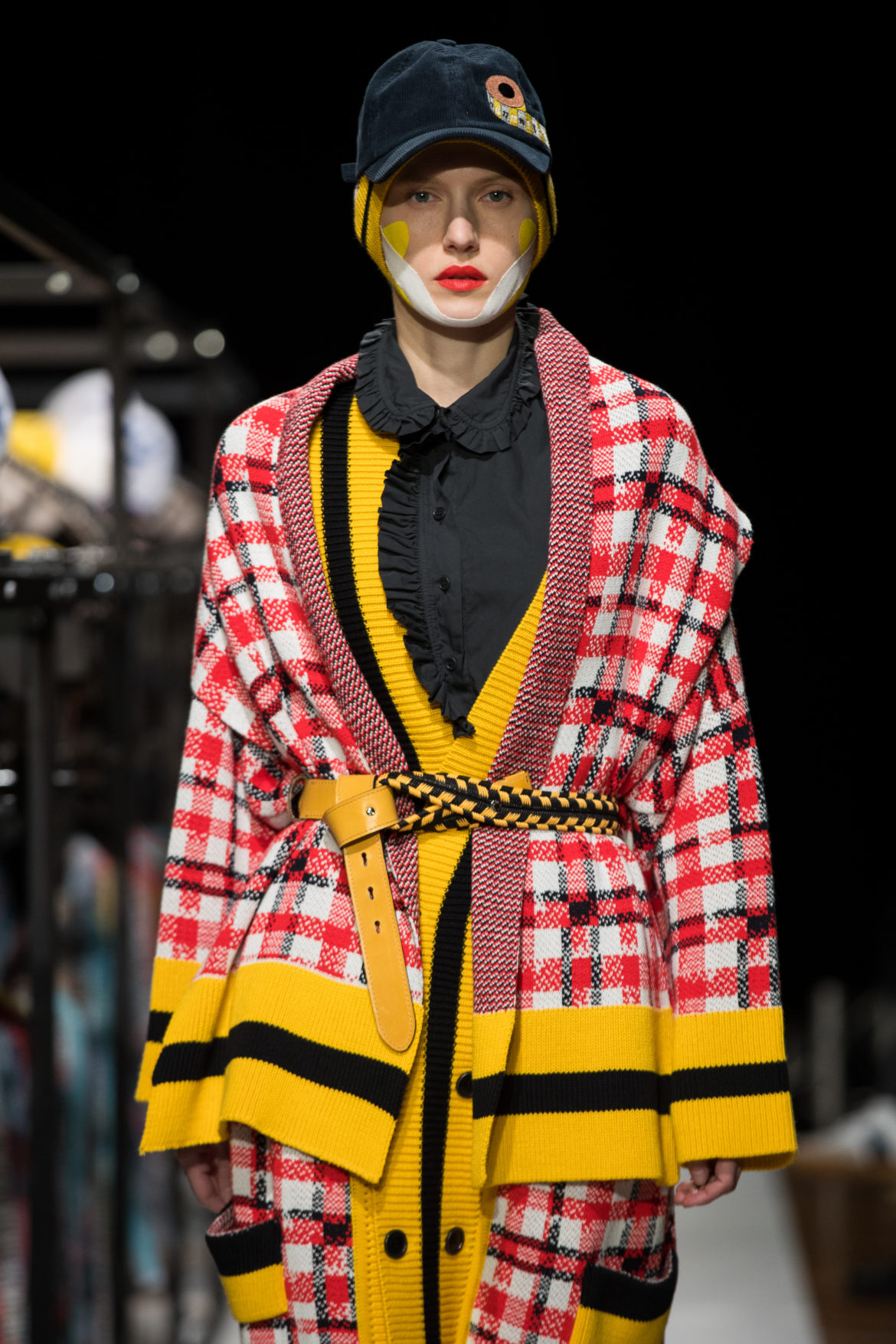 The Man Who Measures the Clouds(L’homme qui mesure les nuages)isan art piece by Jan Fabre that Vibskovcame across last summer during his travels inKanasawa,Japan. Thepoetic gesture of measuring something unmeasurable inspired him and the teamfor theA/W18-collection. To find sense where there is no senseina culture where we are obsessed about numbers,we seek to measure, analyze, compare and categorize. Peopleincreasingly depend on numbers to know how theyare doing for virtually everything.We measure ourselves, size, height, distance, amount, time, intelligence, popularity and even feelings.If you cannumber it, you cancontrol it. We want to pause for a momenttoquestion this number maniaandto know what is going on around us, how our actions impact others, how the environment is changing and how wearechanging.If we want to change what wecare about, shouldn’t we change what we measure?The collection reflects the theme in various ways; prints of littleworking peopletrying to analyzetheir surroundings, oversized ribbing on knitwear that seems like it camefrom another measuring system, free floating paint strokes that don’t want to fit the grid in thebackground, prolonged buttonstands andsleeve slitsand weave onsuiting that shows measure tapes woven into the that garments. Some of the garments are developed from the starting point where pieces from earlier collection were sewn together in new scales and original measurements were swapped around. Fifteen performers inbrightyellow working outfits are controlling manually themechanicalmeasuringmopsthat analyze the bodies lying underneath.Through rhythm,sound, body movement and pulse the installation emphasizes the inspiration of the collection. It is avisualizationon how people become the machine controlled by measurements.