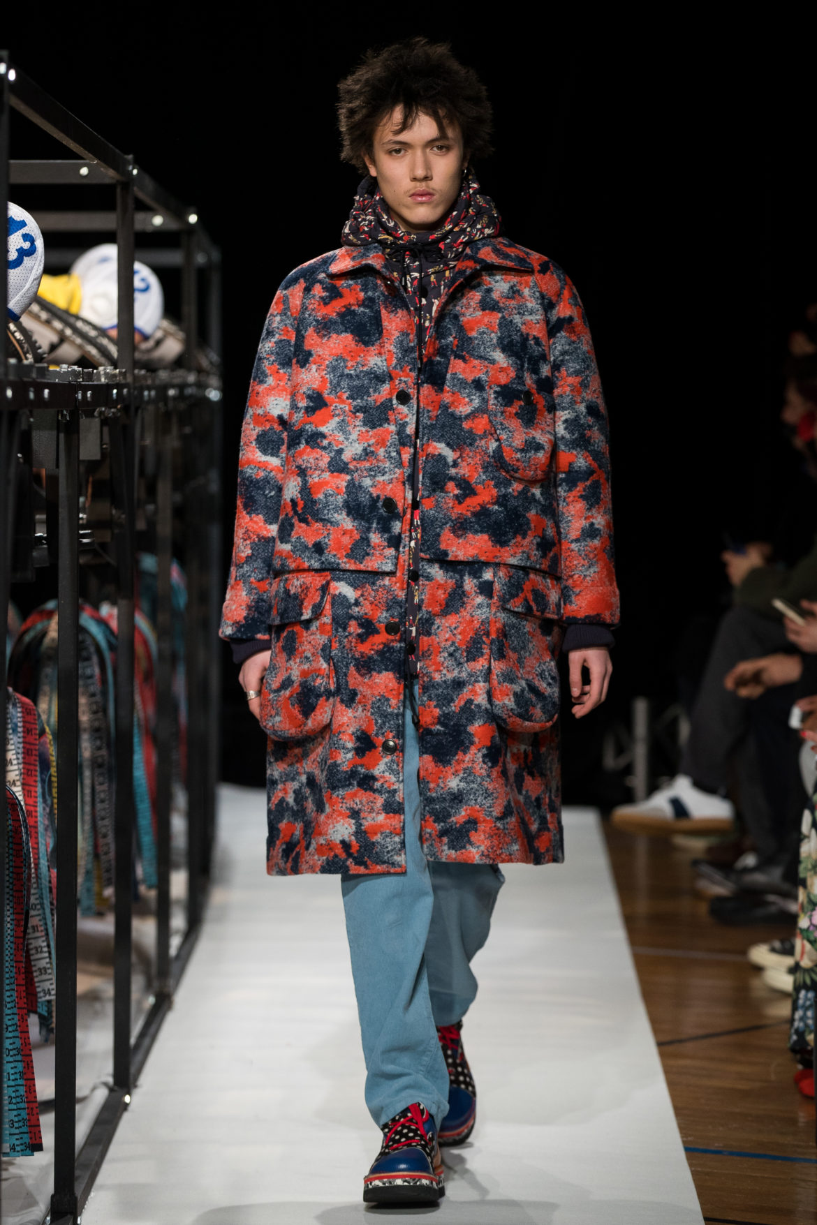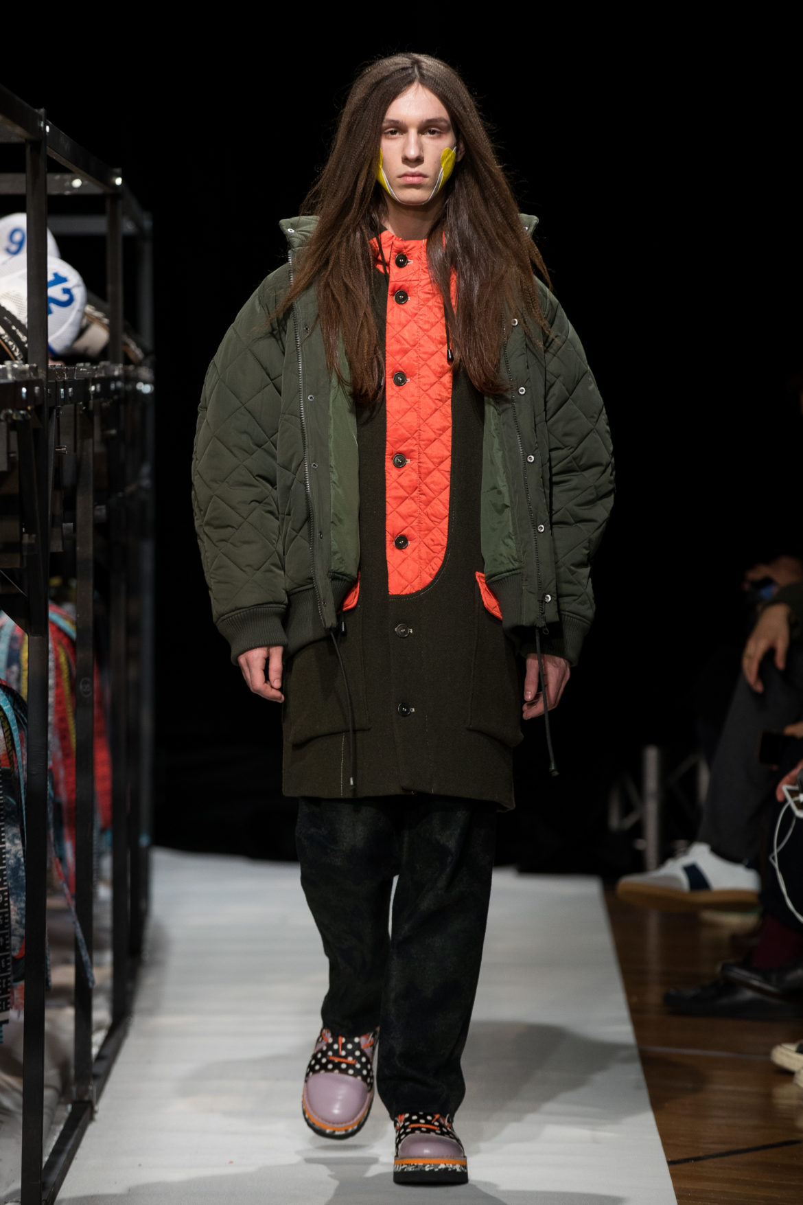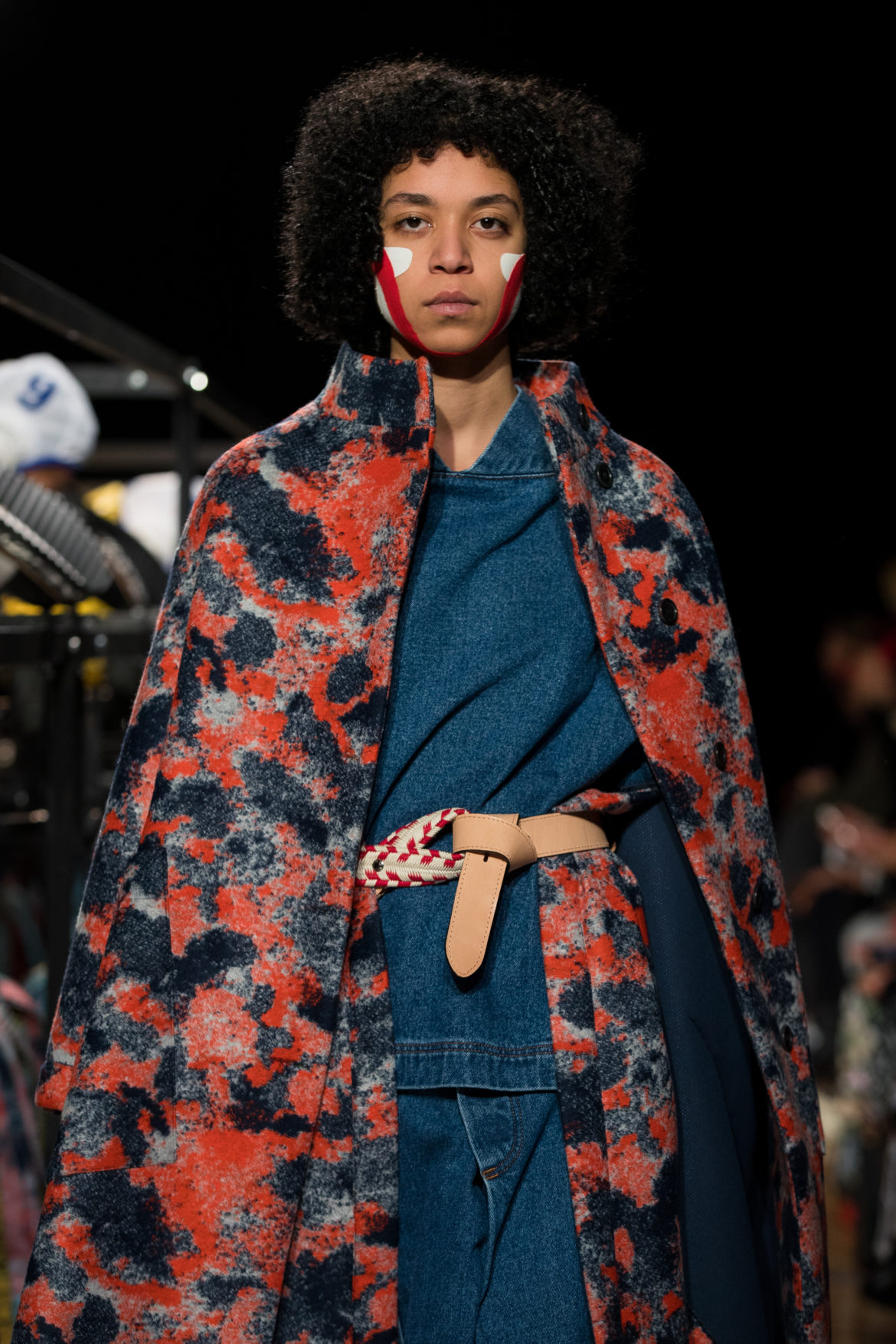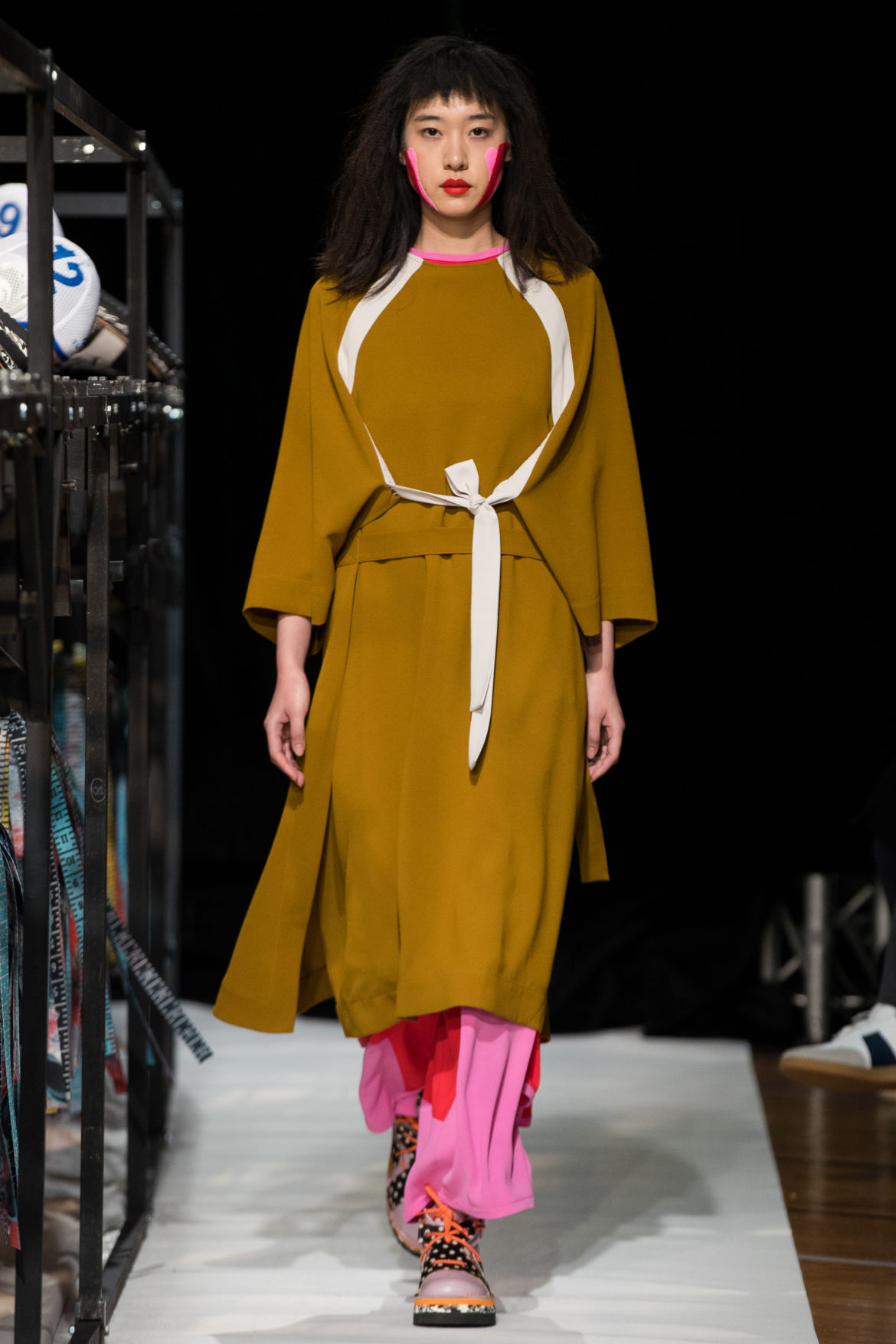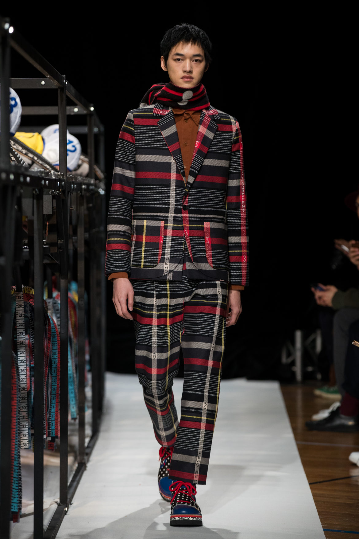 The Man Who Measures the Clouds(L’homme qui mesure les nuages)isan art piece by Jan Fabre that Vibskovcame across last summer during his travels inKanasawa,Japan. Thepoetic gesture of measuring something unmeasurable inspired him and the teamfor theA/W18-collection. To find sense where there is no senseina culture where we are obsessed about numbers,we seek to measure, analyze, compare and categorize. Peopleincreasingly depend on numbers to know how theyare doing for virtually everything.We measure ourselves, size, height, distance, amount, time, intelligence, popularity and even feelings.If you cannumber it, you cancontrol it. We want to pause for a momenttoquestion this number maniaandto know what is going on around us, how our actions impact others, how the environment is changing and how wearechanging.If we want to change what wecare about, shouldn’t we change what we measure?The collection reflects the theme in various ways; prints of littleworking peopletrying to analyzetheir surroundings, oversized ribbing on knitwear that seems like it camefrom another measuring system, free floating paint strokes that don’t want to fit the grid in thebackground, prolonged buttonstands andsleeve slitsand weave onsuiting that shows measure tapes woven into the that garments. Some of the garments are developed from the starting point where pieces from earlier collection were sewn together in new scales and original measurements were swapped around. Fifteen performers inbrightyellow working outfits are controlling manually themechanicalmeasuringmopsthat analyze the bodies lying underneath.Through rhythm,sound, body movement and pulse the installation emphasizes the inspiration of the collection. It is avisualizationon how people become the machine controlled by measurements.