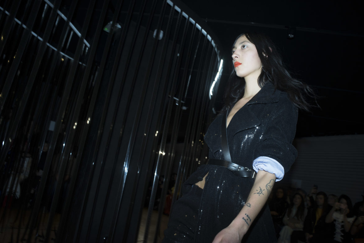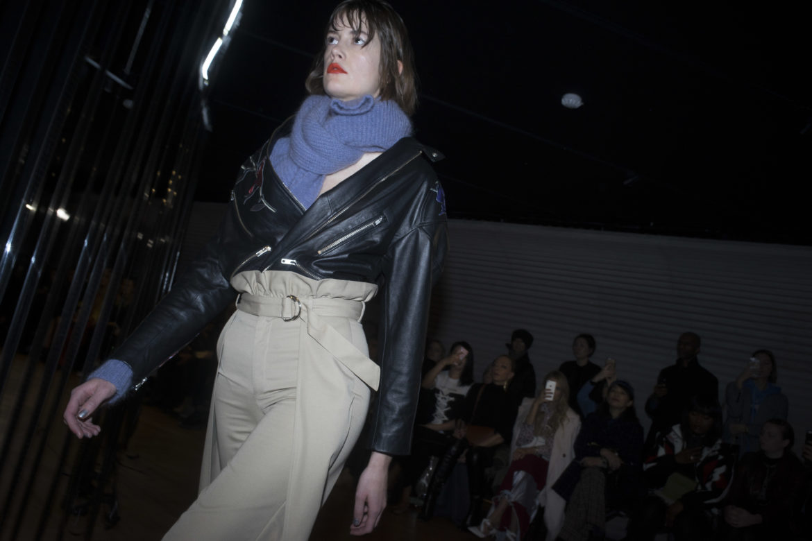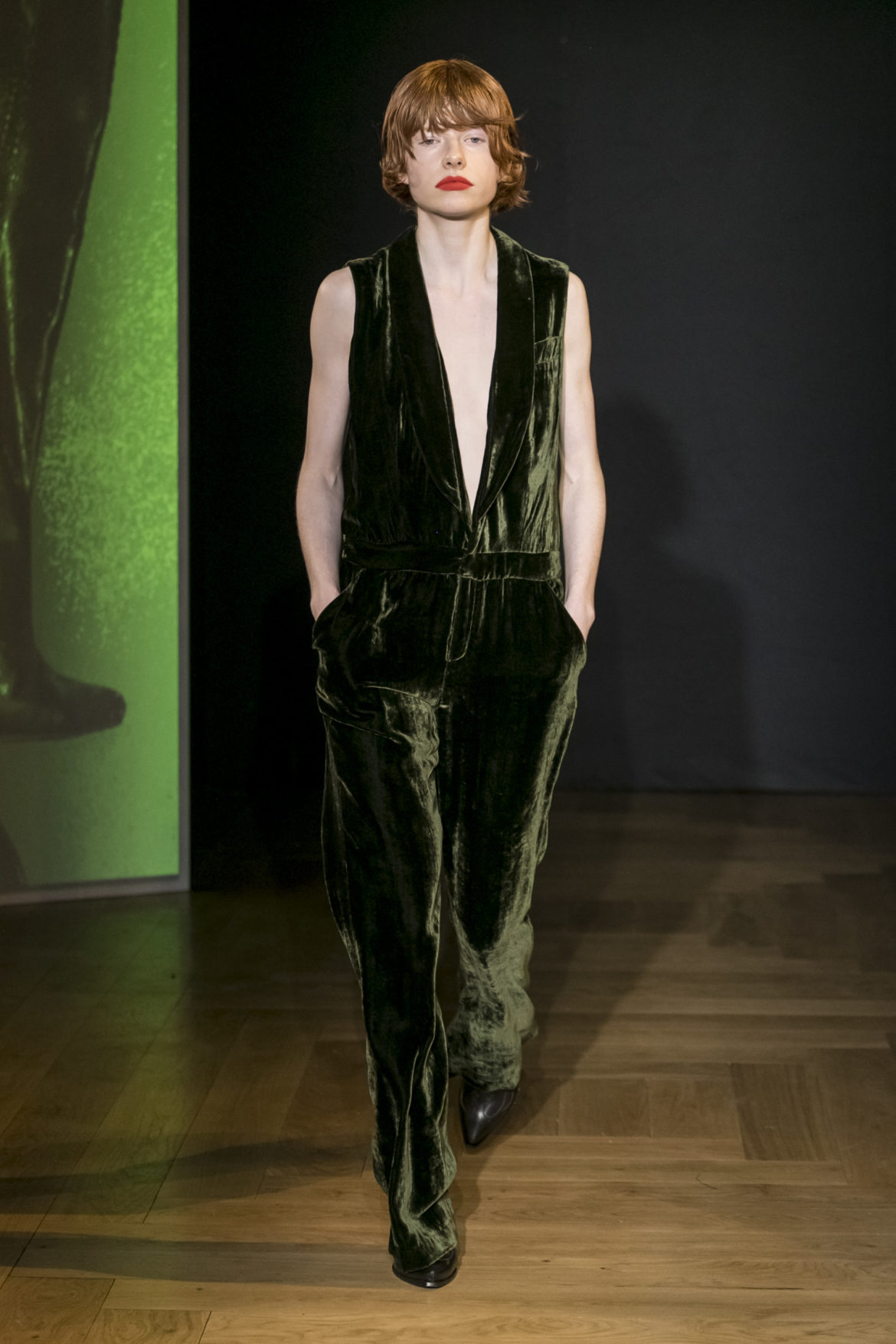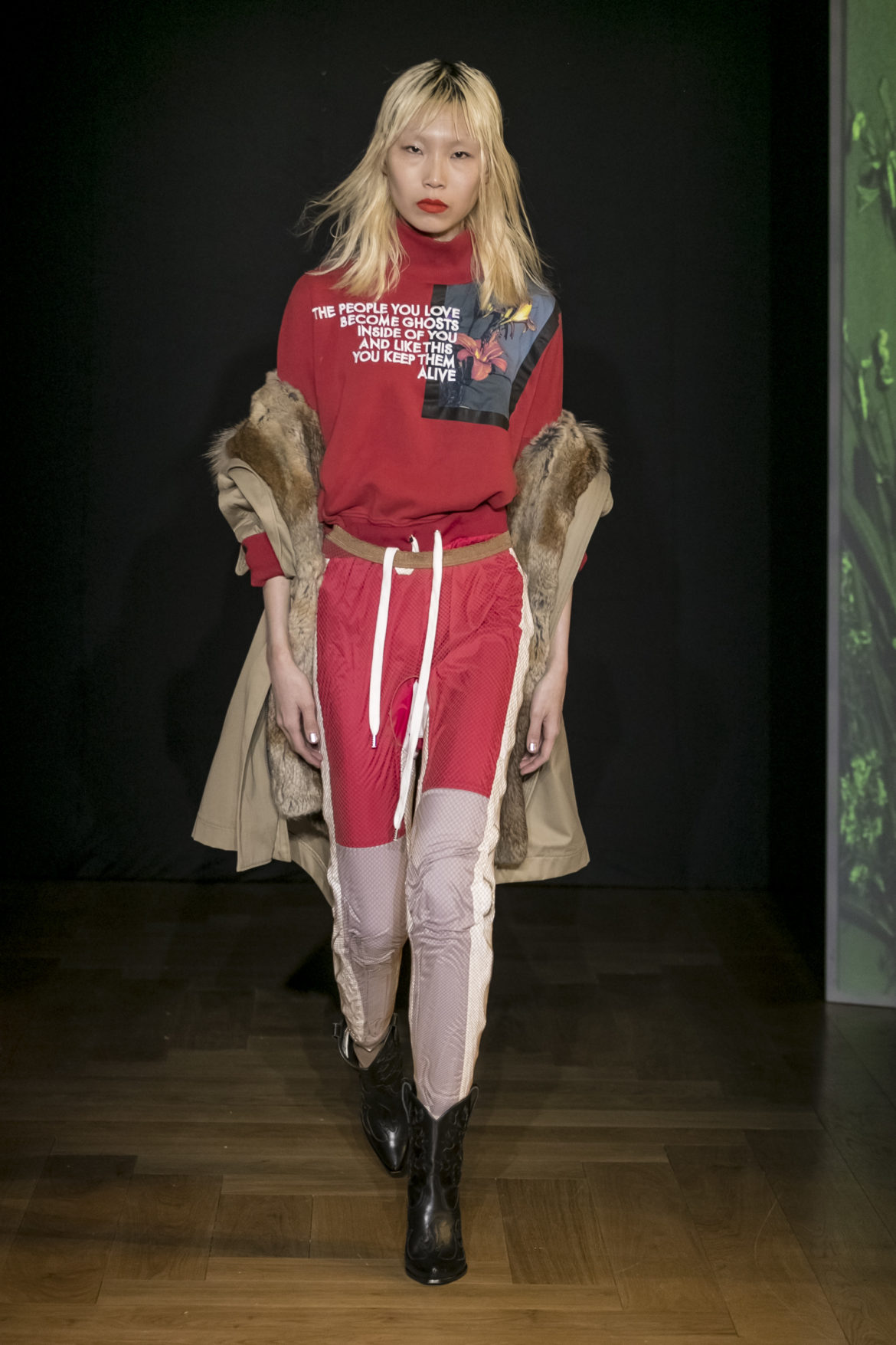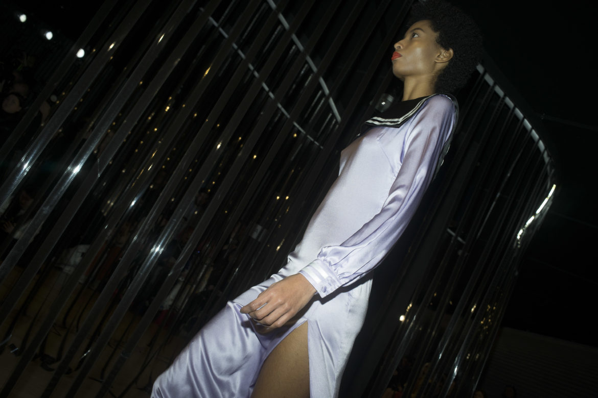 It is a simultaneously tough and tender collection: leather jackets are offset with silk dresses, and graphic jerseys with blouses. Military and Sailor uniforms are reinvented: materials are fused with dip-dye nishing and Each x Other code poetry by the brand’s in-house poet Robert Montgomery. Montgomery’s poems “SLAVE TO LOVE” and Each x Other’s core brand slogan “SAFE AND WARM HERE IN THE FIRE OF EACH OTHER” are embroidered onto the fabrics.