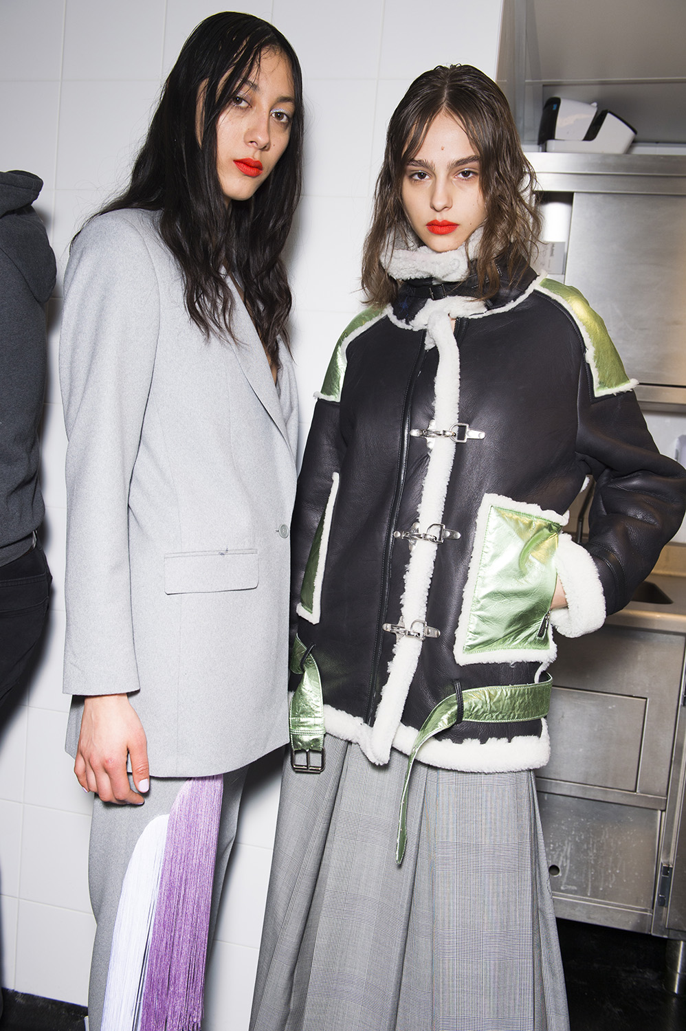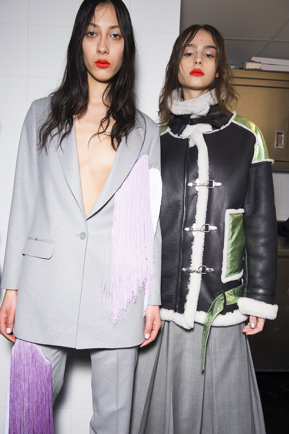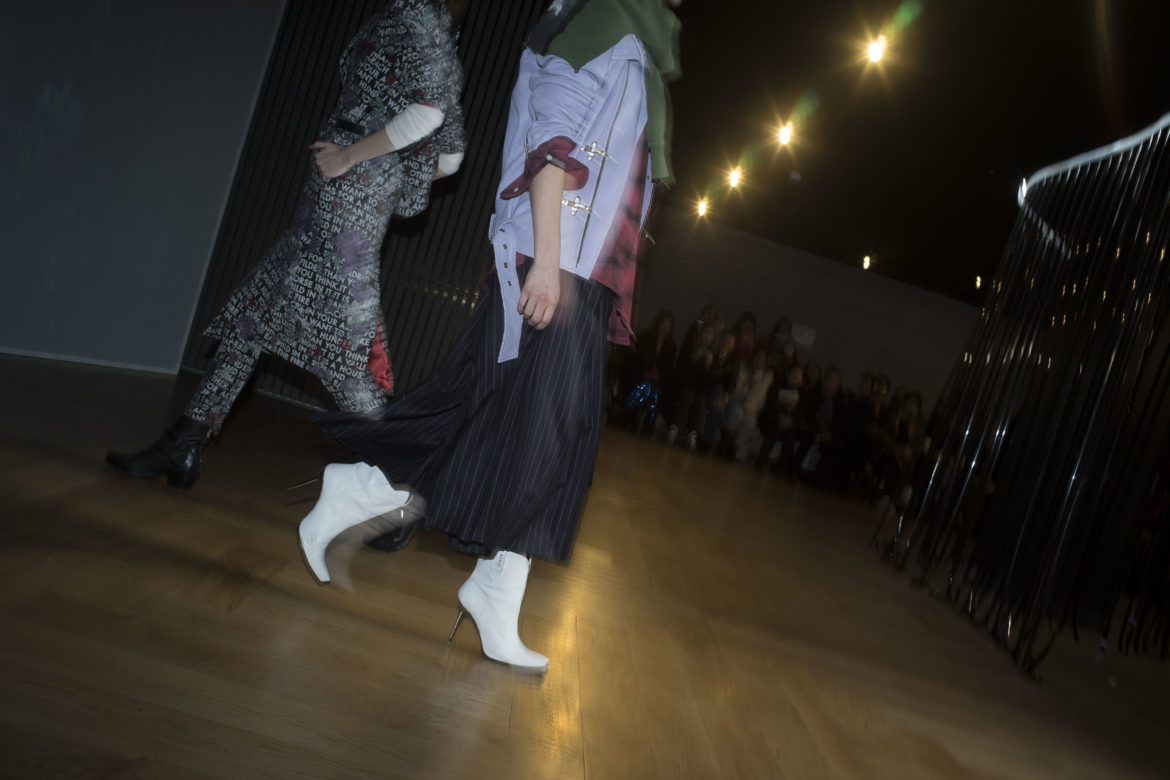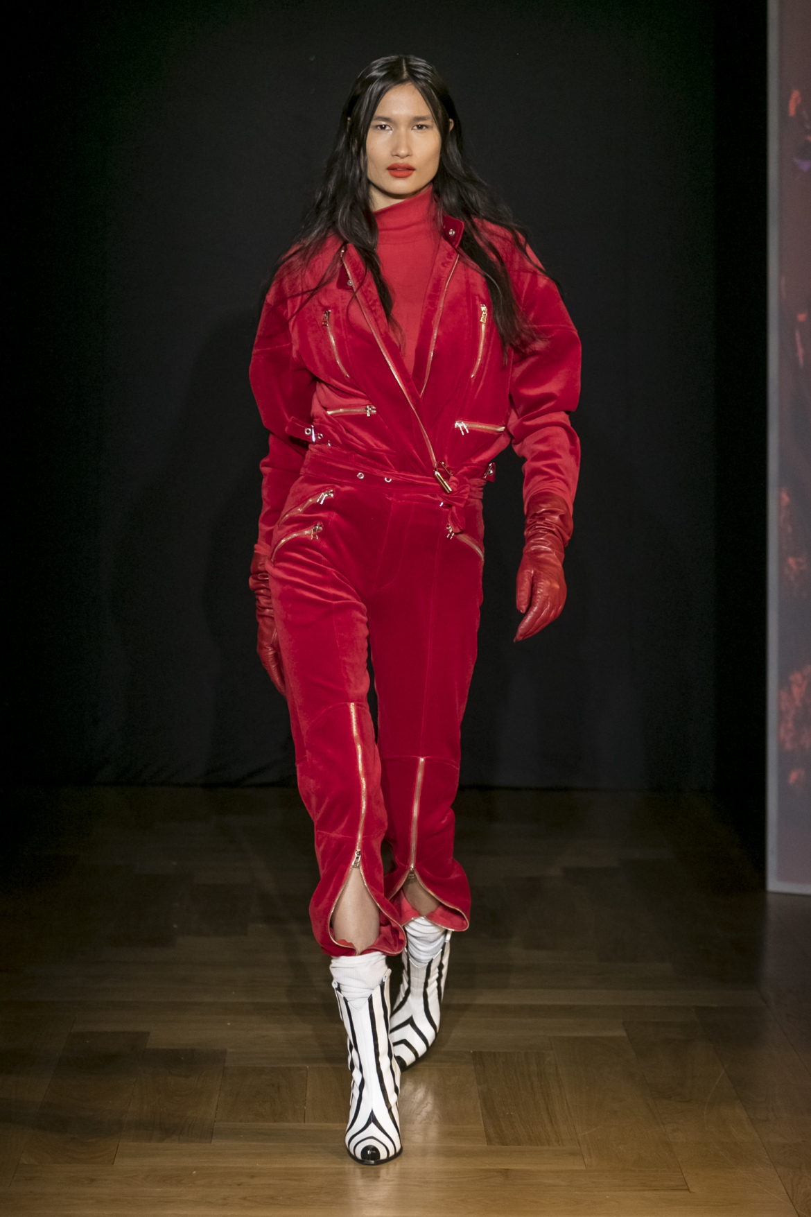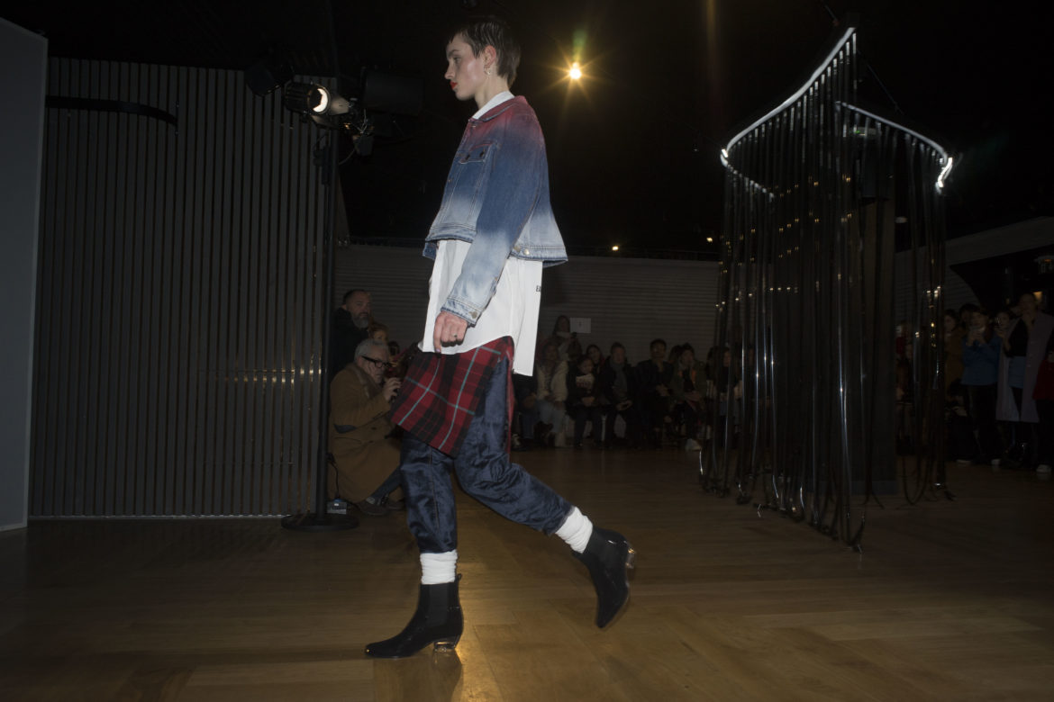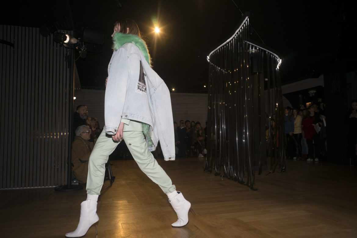 It is a simultaneously tough and tender collection: leather jackets are offset with silk dresses, and graphic jerseys with blouses. Military and Sailor uniforms are reinvented: materials are fused with dip-dye nishing and Each x Other code poetry by the brand’s in-house poet Robert Montgomery. Montgomery’s poems “SLAVE TO LOVE” and Each x Other’s core brand slogan “SAFE AND WARM HERE IN THE FIRE OF EACH OTHER” are embroidered onto the fabrics.