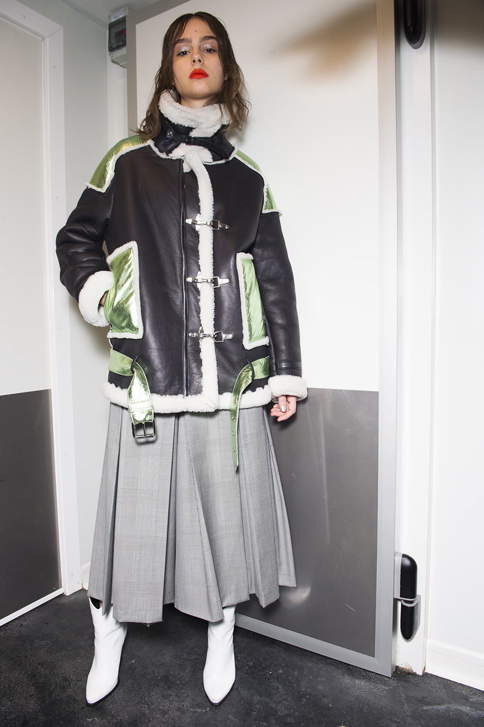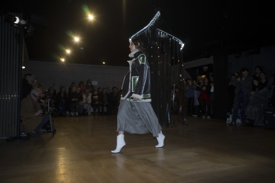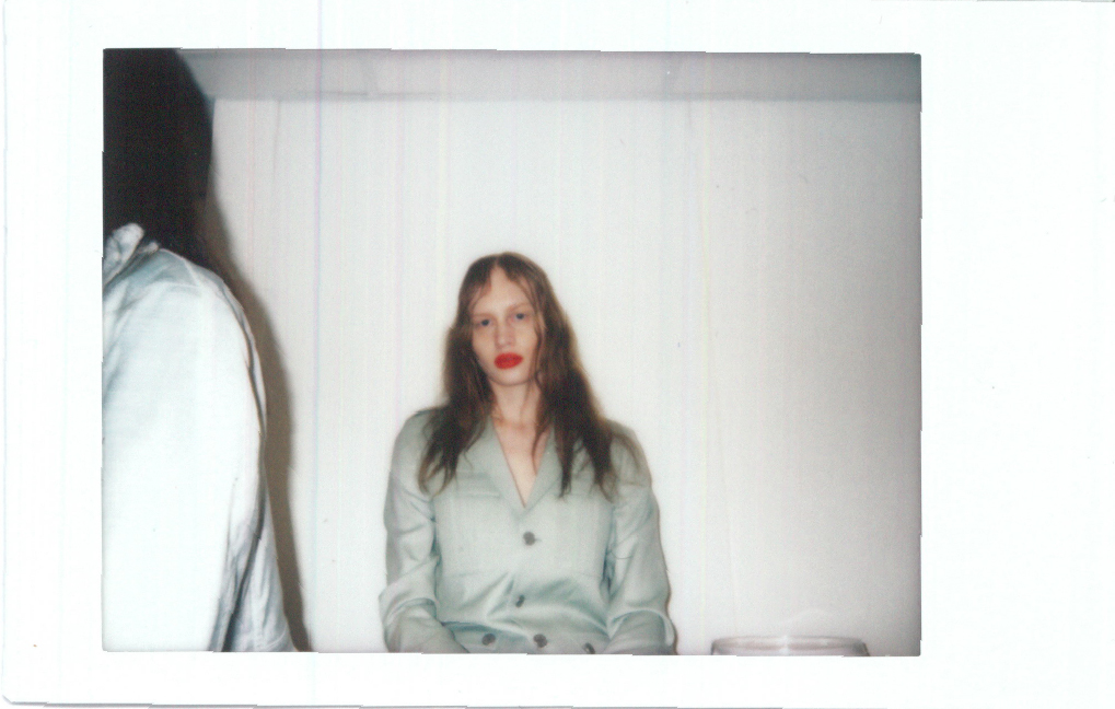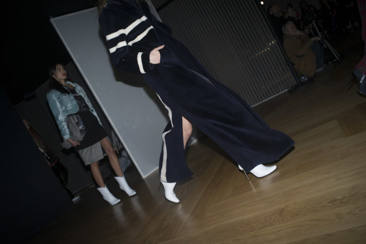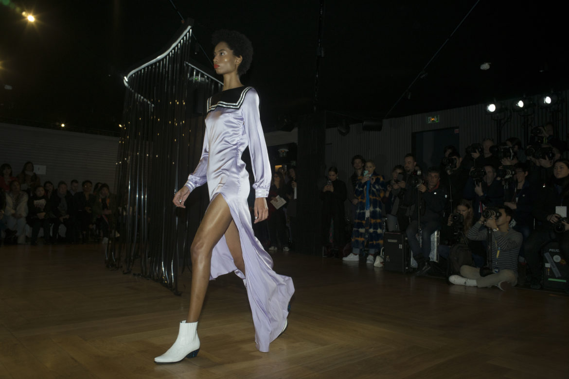It is a simultaneously tough and tender collection: leather jackets are offset with silk dresses, and graphic jerseys with blouses. Military and Sailor uniforms are reinvented: materials are fused with dip-dye nishing and Each x Other code poetry by the brand’s in-house poet Robert Montgomery. Montgomery’s poems “SLAVE TO LOVE” and Each x Other’s core brand slogan “SAFE AND WARM HERE IN THE FIRE OF EACH OTHER” are embroidered onto the fabrics.