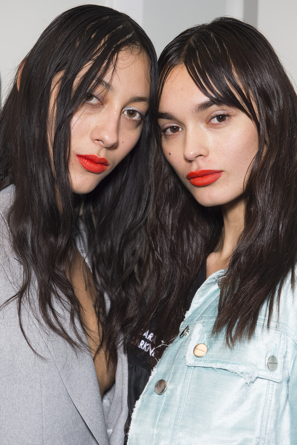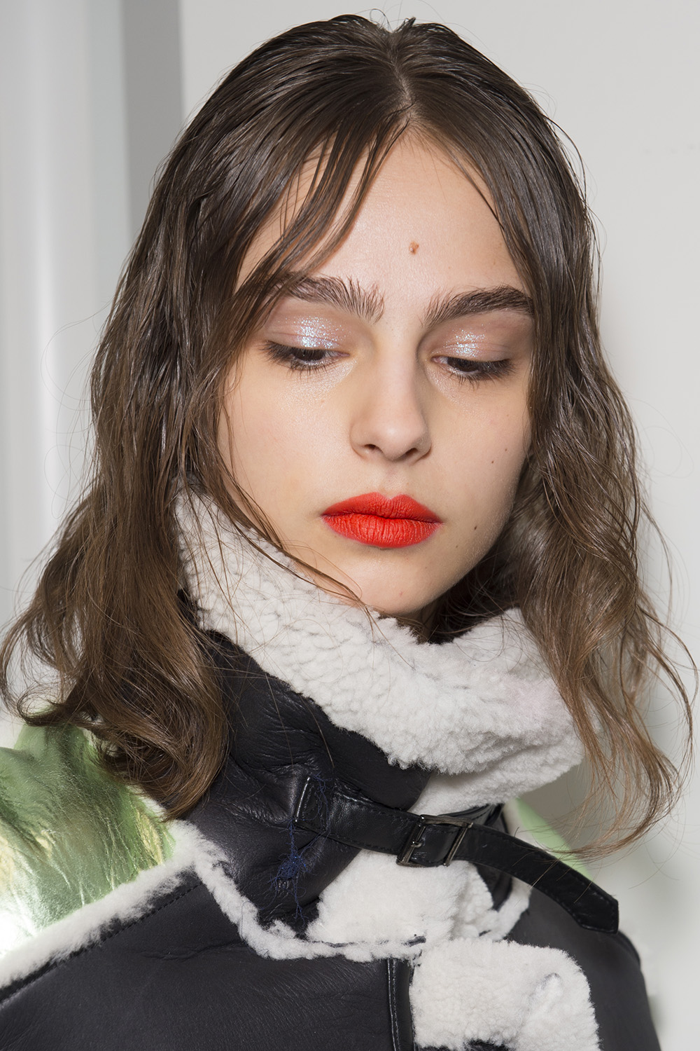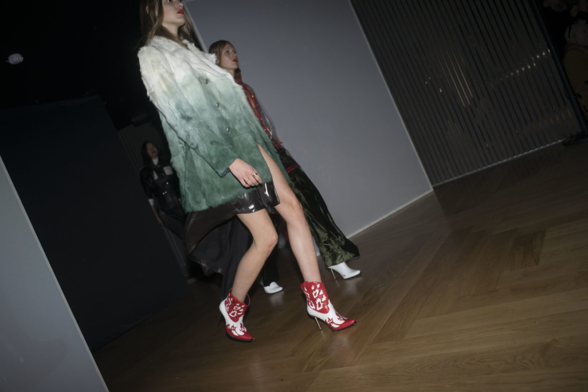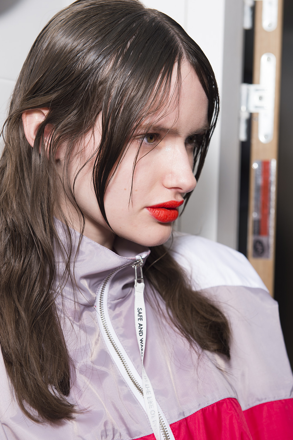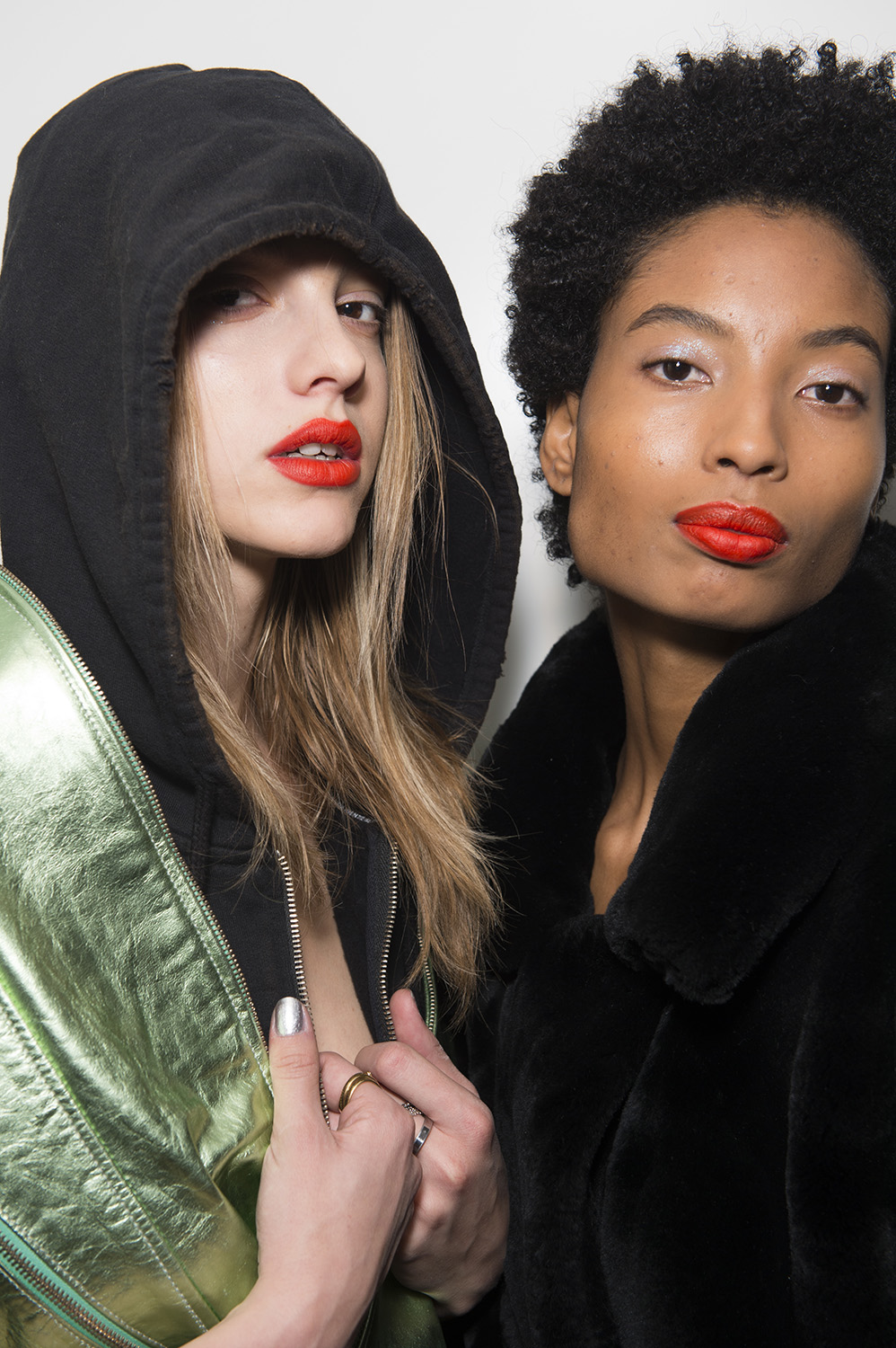 It is a simultaneously tough and tender collection: leather jackets are offset with silk dresses, and graphic jerseys with blouses. Military and Sailor uniforms are reinvented: materials are fused with dip-dye nishing and Each x Other code poetry by the brand’s in-house poet Robert Montgomery. Montgomery’s poems “SLAVE TO LOVE” and Each x Other’s core brand slogan “SAFE AND WARM HERE IN THE FIRE OF EACH OTHER” are embroidered onto the fabrics.