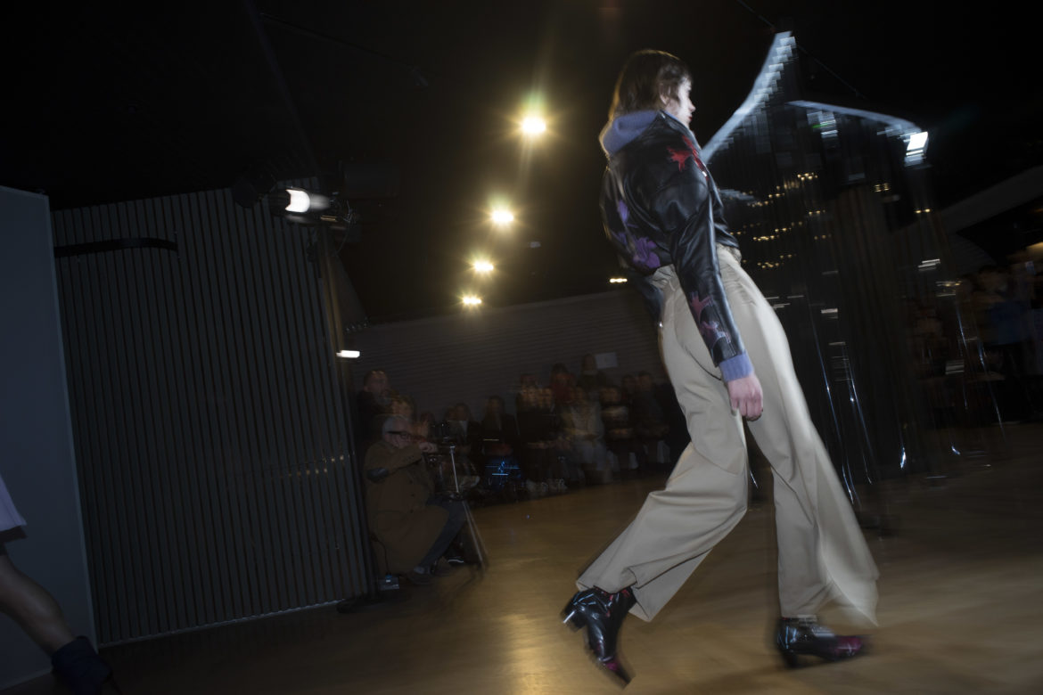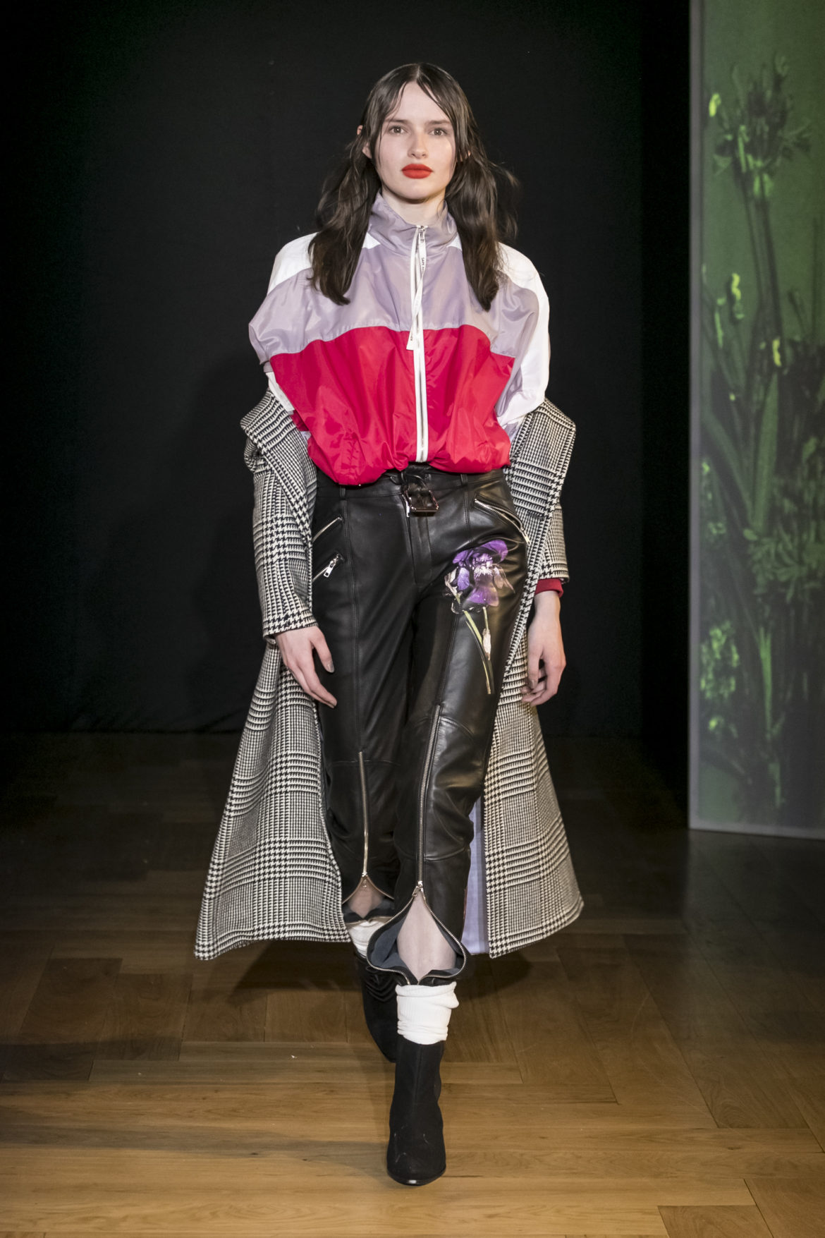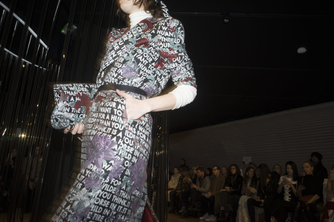The inspiration for this season’s collection came from a collaboration between two artists; Robert Montgomery has worked his poems into Fabio Paleari’s ower photography. The collaboration between the two typi es the hybridity of the brand: it is a delicate balance between subjectivity and objectivity, detached and intimate, glossy and gritty. They have both worked extensively with Beat generation poets such as Allen Ginsberg and William S. Burroughs, and the mixture between art and poetry and the in uence of Situationist theorist Guy Debord in their work, align them with Each x Other’s concept of ‘living art.’ The garments form black backdrops for Paleari’s vividly coloured owers, which cut through the darkness in hues of magenta, purple and blue.