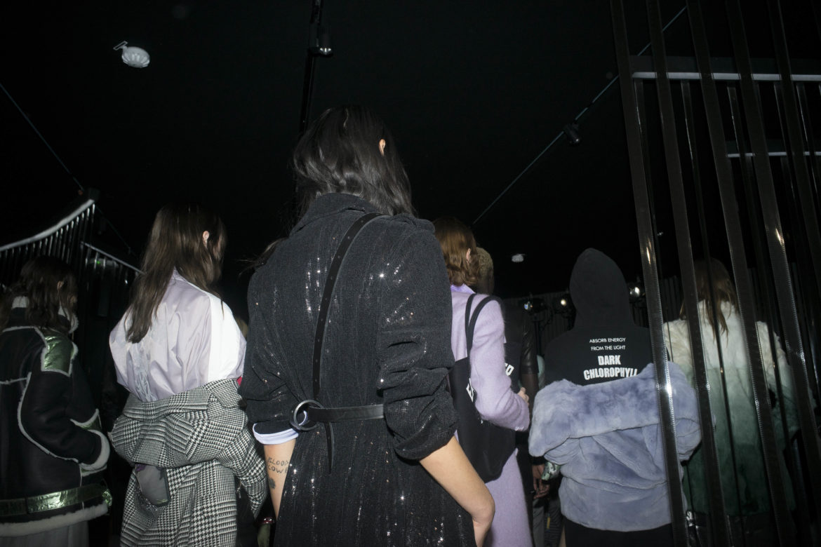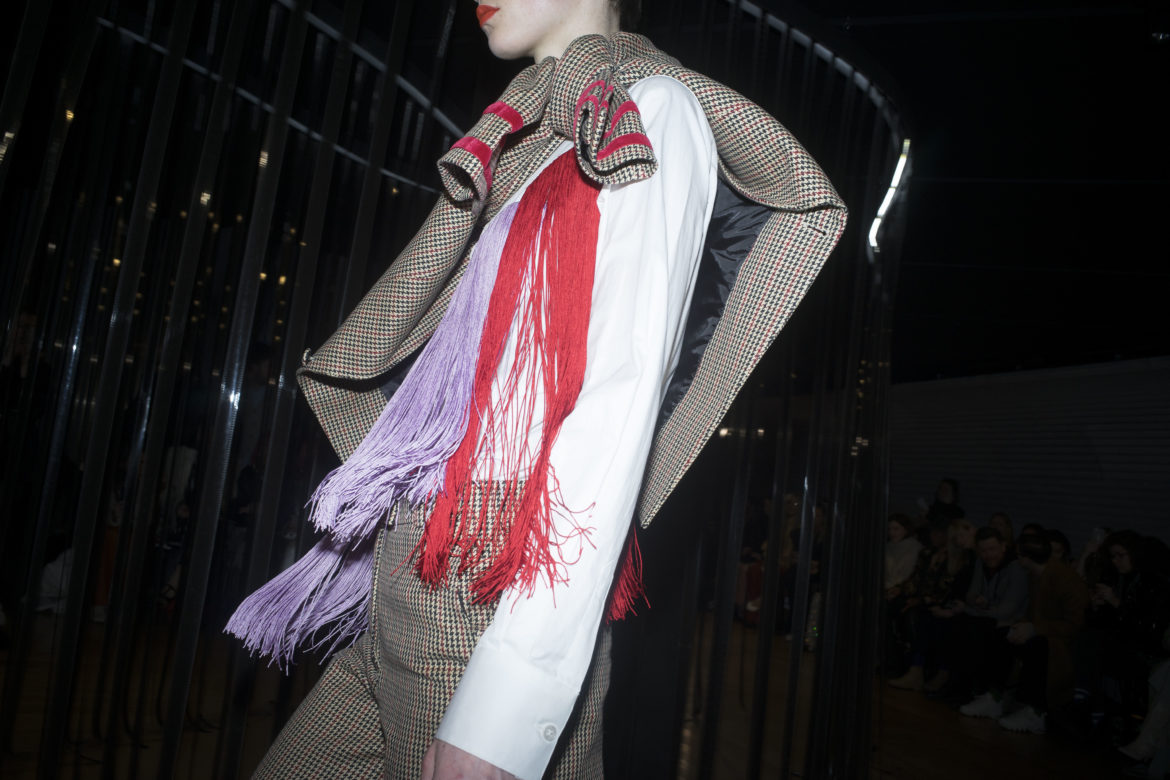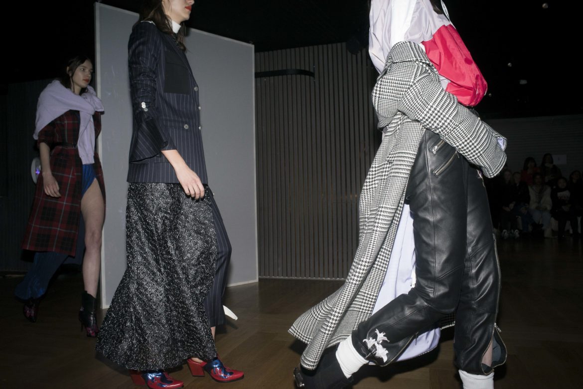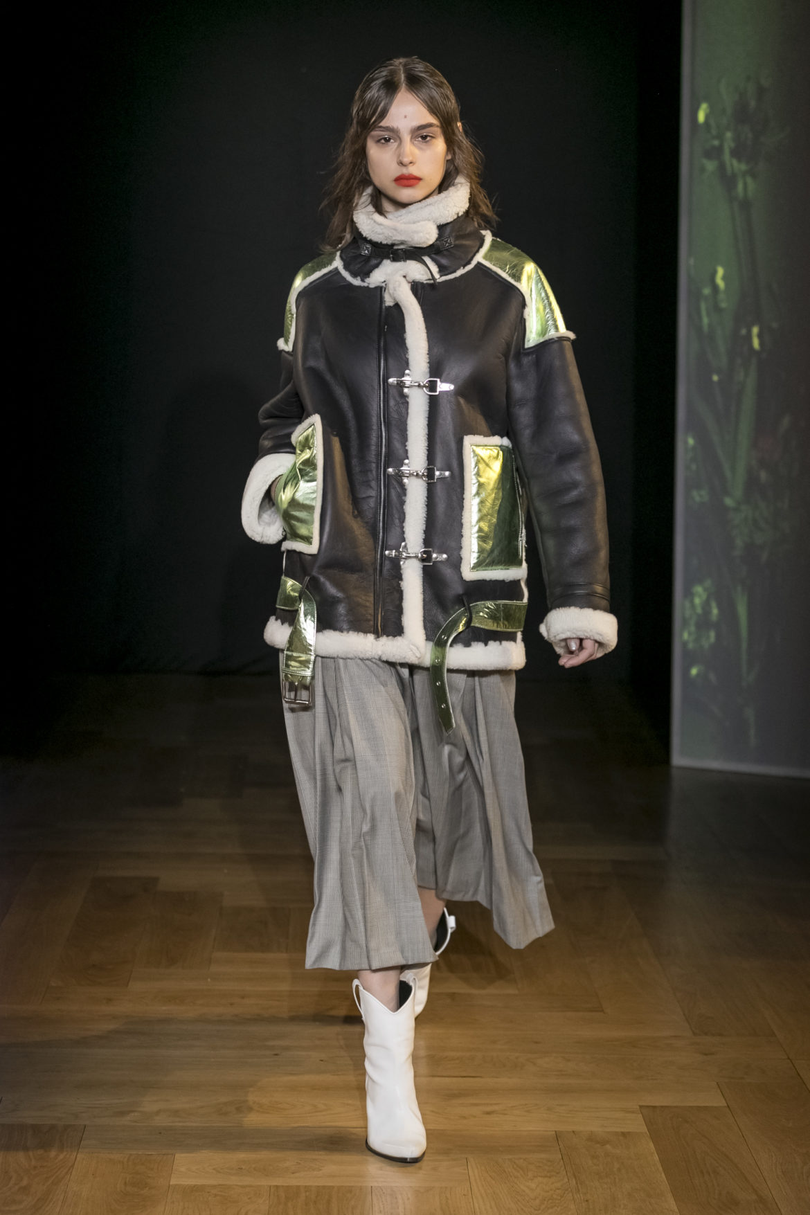 The inspiration for this season’s collection came from a collaboration between two artists; Robert Montgomery has worked his poems into Fabio Paleari’s ower photography. The collaboration between the two typi es the hybridity of the brand: it is a delicate balance between subjectivity and objectivity, detached and intimate, glossy and gritty. They have both worked extensively with Beat generation poets such as Allen Ginsberg and William S. Burroughs, and the mixture between art and poetry and the in uence of Situationist theorist Guy Debord in their work, align them with Each x Other’s concept of ‘living art.’ The garments form black backdrops for Paleari’s vividly coloured owers, which cut through the darkness in hues of magenta, purple and blue.