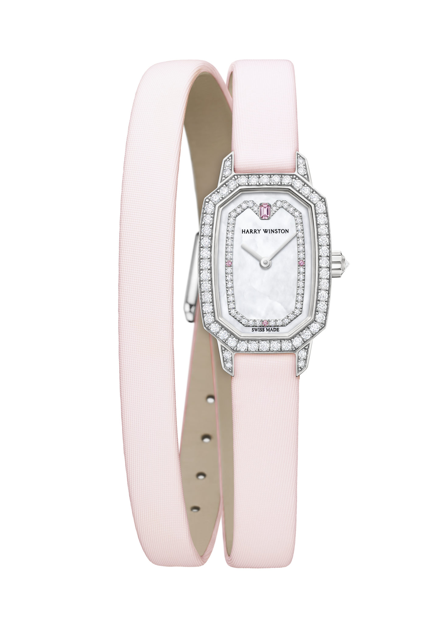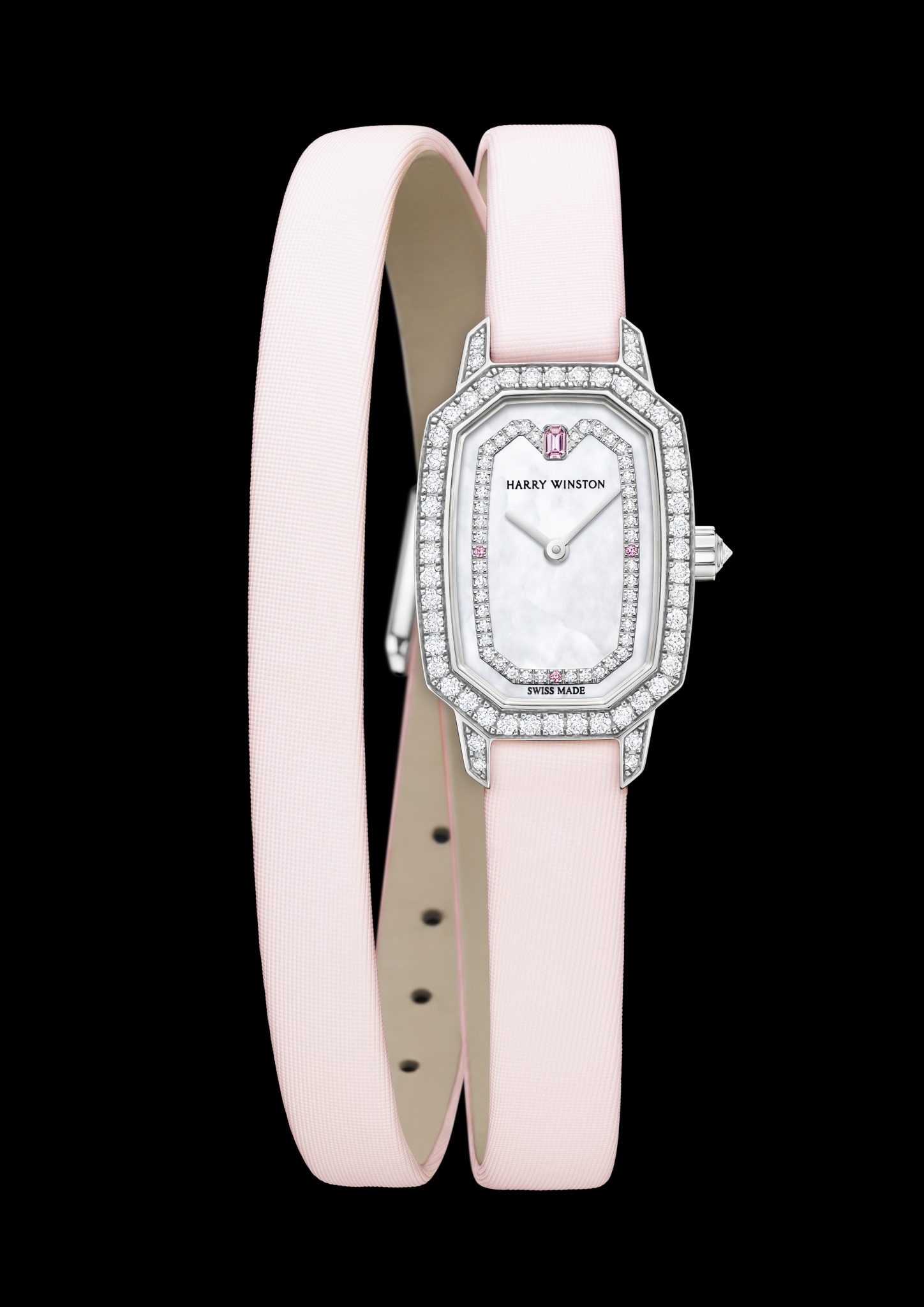 Conçue pour rayonner jour après jour, la gracieuse Harry Winston Emerald est animée par un mouvement à quartz suisse haute précision et est assurée d’une étanchéité jusqu’à 30 mètres. À la fois sophistiqué et stylisé, le bracelet en satin rose fait deux fois le tour du poignet. Honorant le soin du détail cher à Harry Winston, la boucle ardillon scintille de 11 diamants taille brillant.