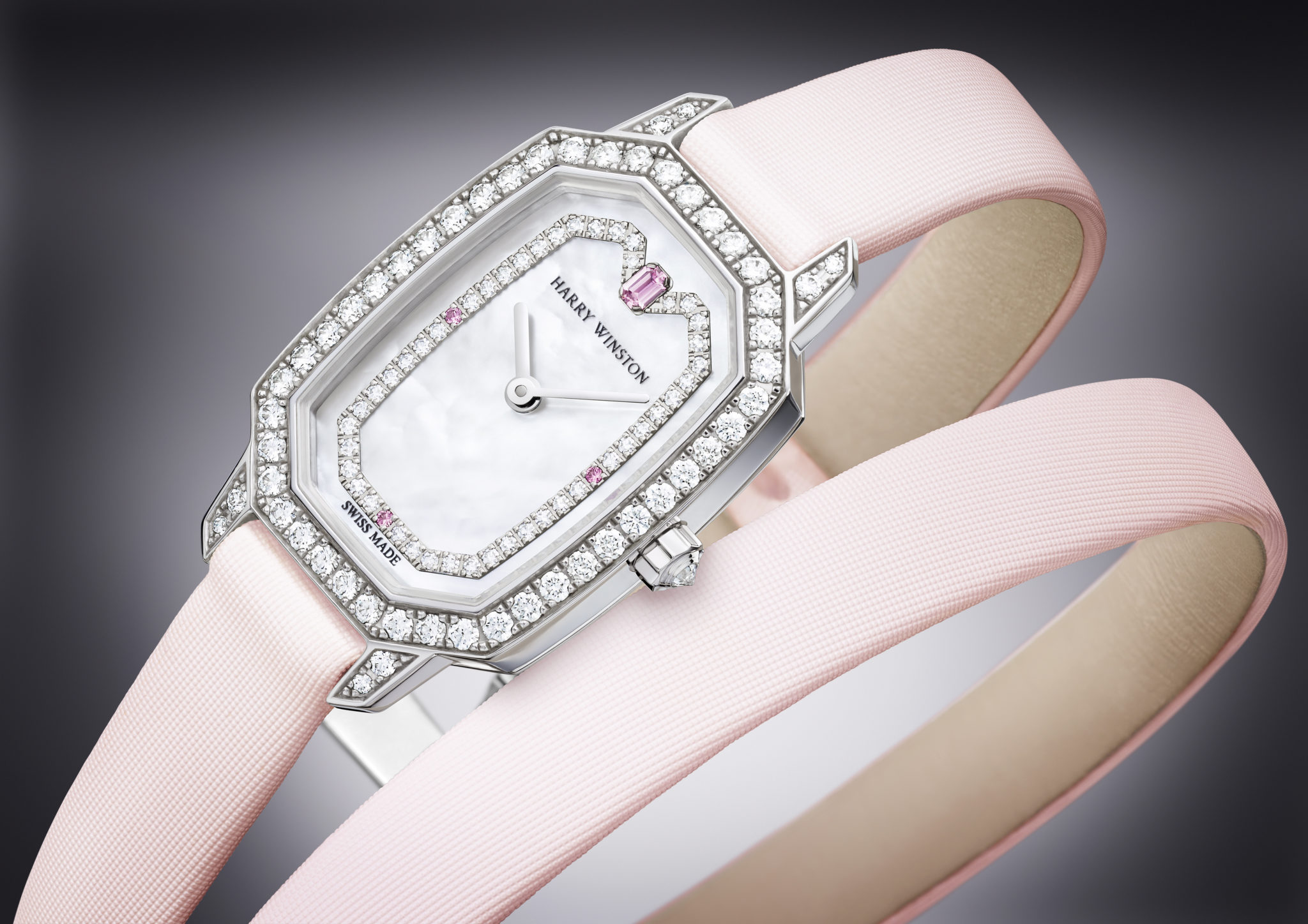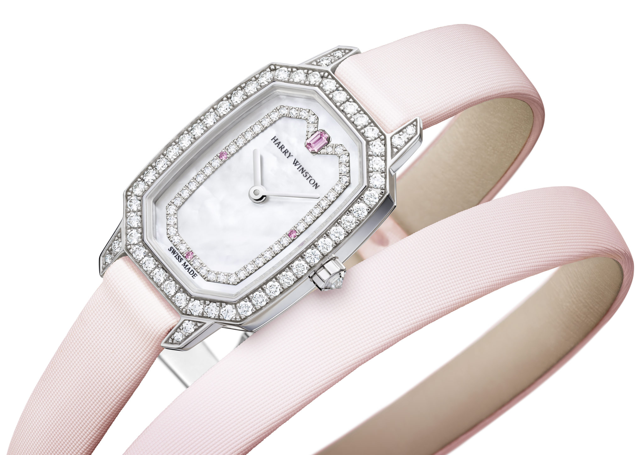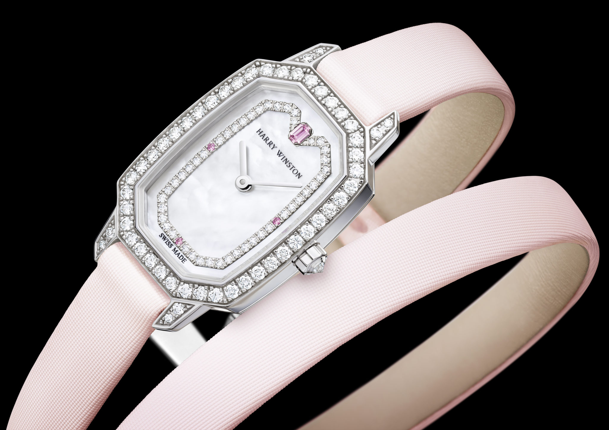 Une brise printanière souffle dans l’univers Harry Winston. De nouveaux accords chromatiques et des éléments de style inédits fascinent une nouvelle génération de femmes qui accordent autant d’importance à la fiabilité et à l’ergonomie de leur montre au quotidien qu’aux diamants extraordinaires qui définissent les collections joaillières de la Maison Harry Winston. Ode à la féminité, la nouvelle montre Harry Winston Emerald est montée sur un délicat bracelet double tour en satin rose et dévoile une exquise boîte en or blanc 18 carats. Quatre saphirs roses et 108 diamants taille brillant se détachent sur l’arrière-fond nacré de cette nouvelle création horlogère à l’éclat flamboyant.