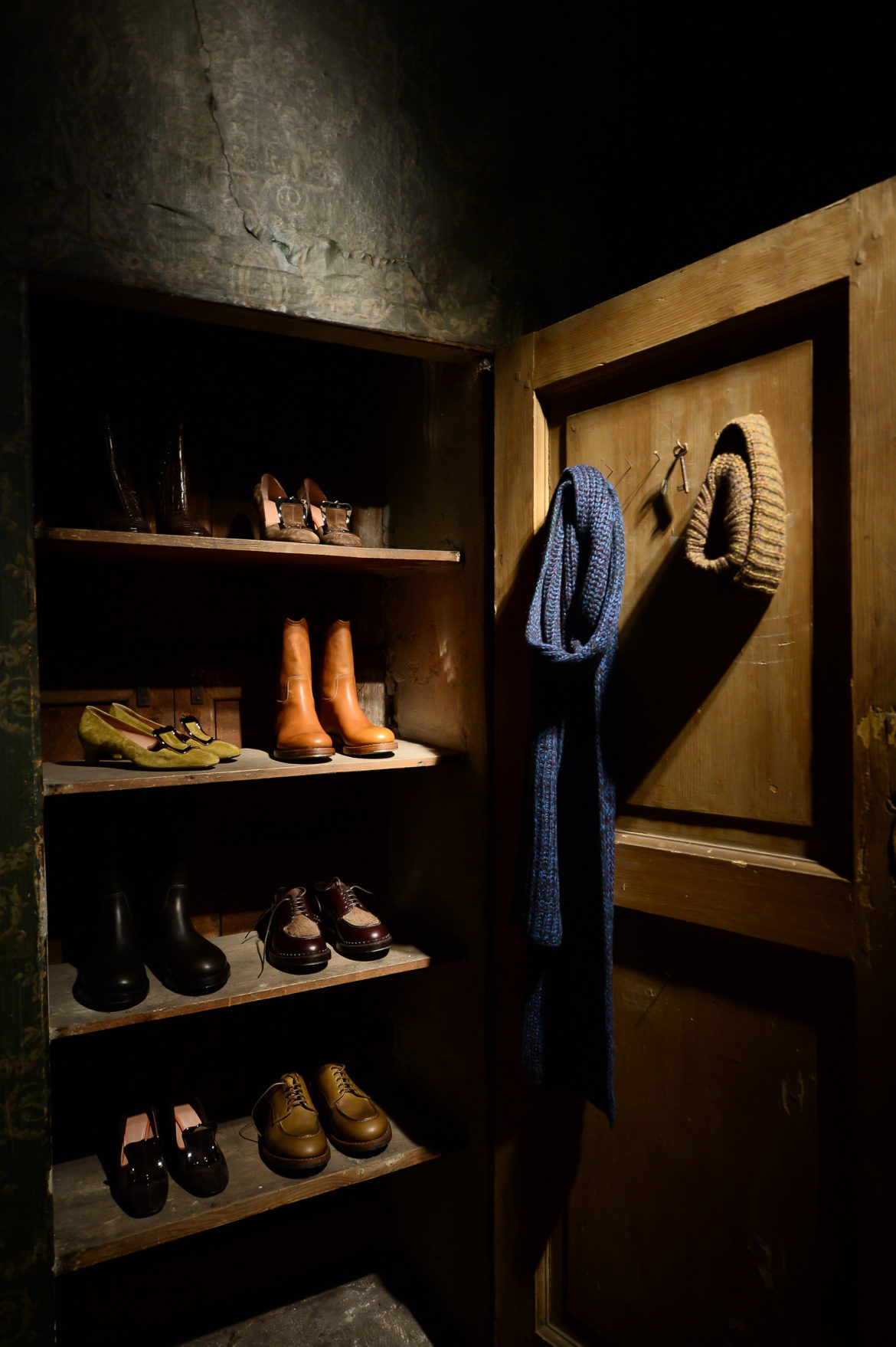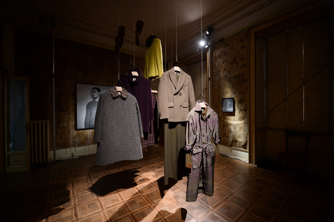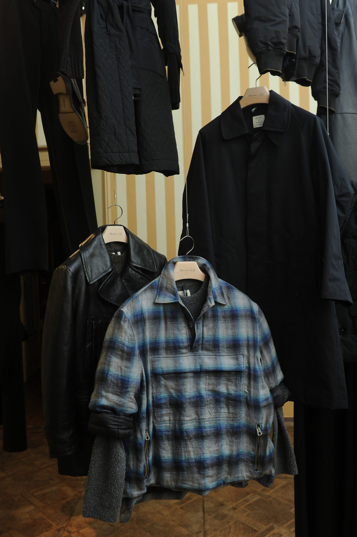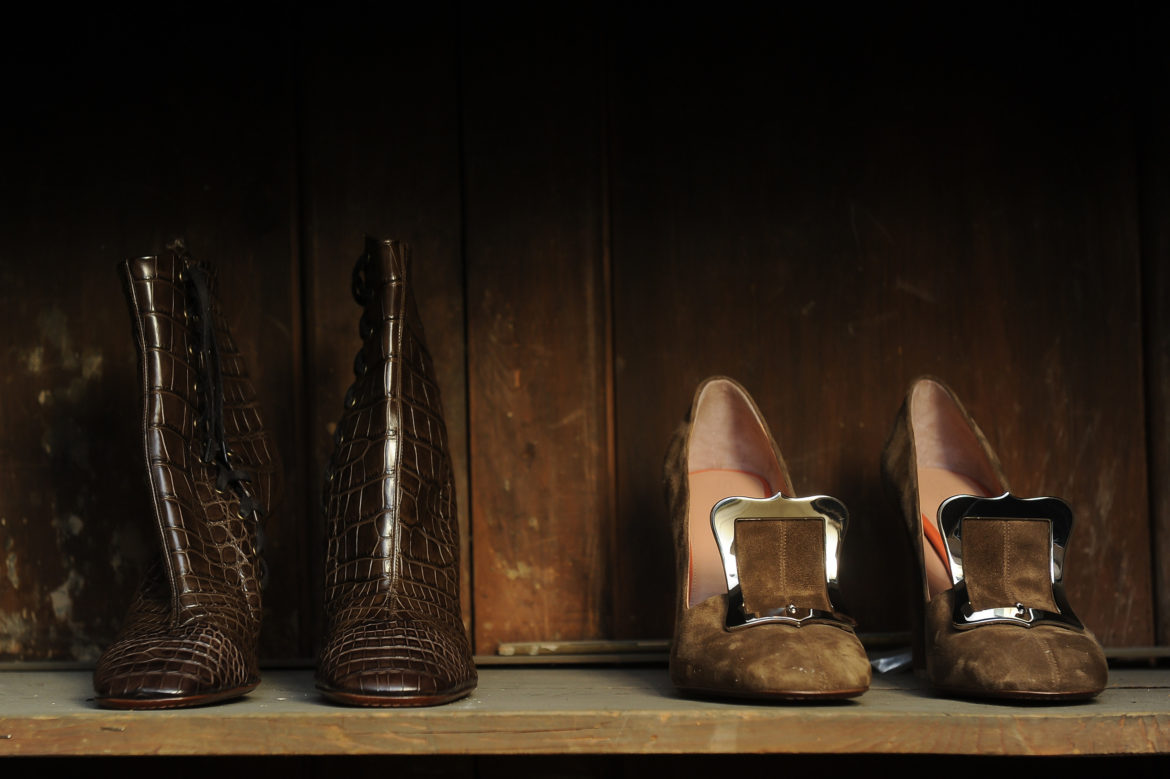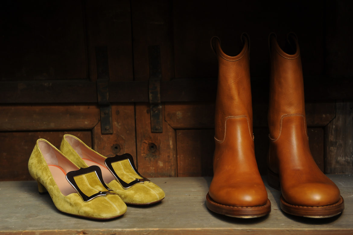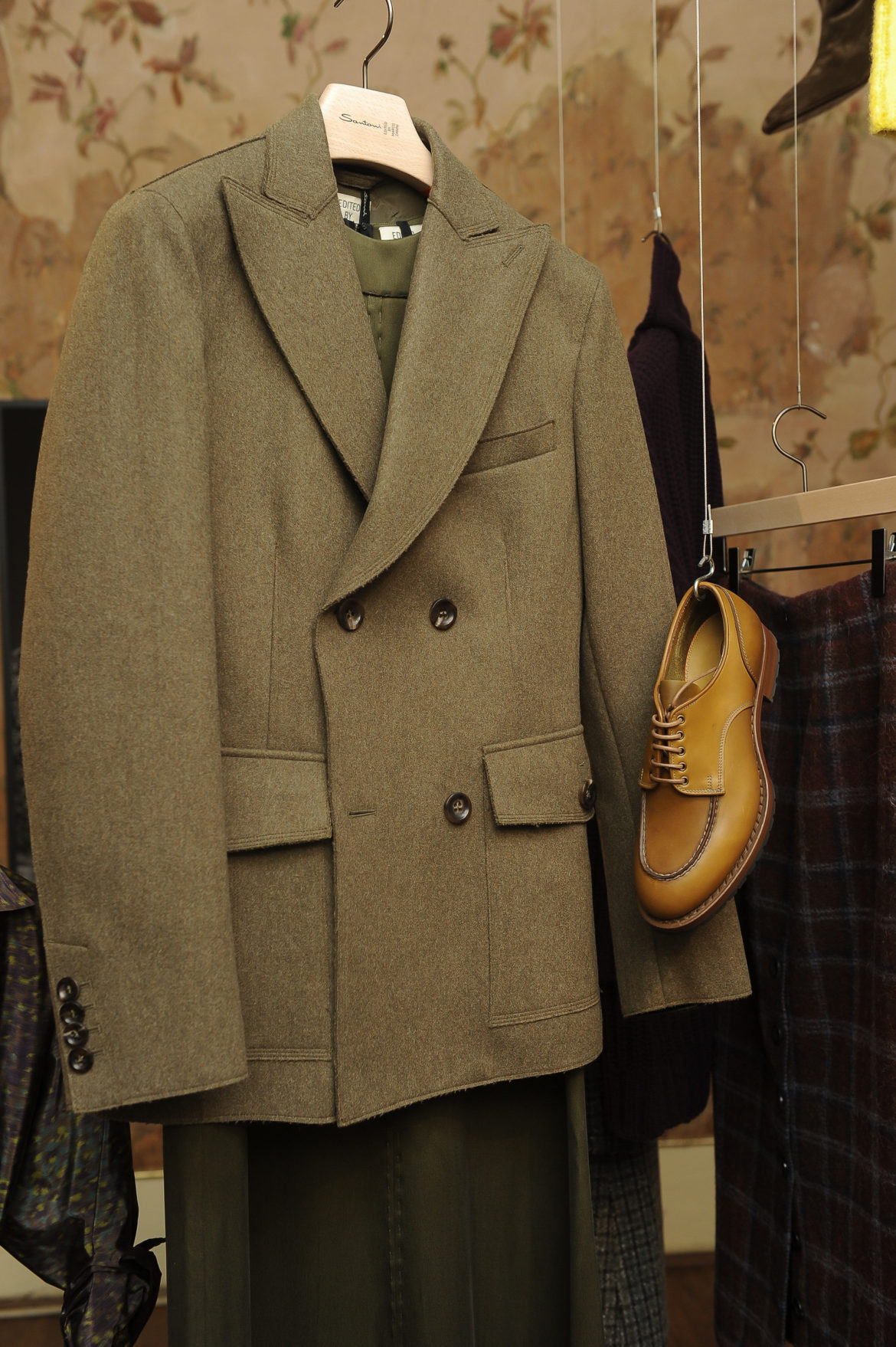Consistently with previous collections, the starting point is a thorough research and selection of materials, which are the main source of inspiration and essence of every single piece. Beautiful raw cut felted wool finished with three lines of stitching gives life to coats, jackets and military-inspired skirts; original and precious baby camel fur, cashmere, technical taffeta (100% polyester), Japanese wool gabardine, wool/alpaca jacquard with ocelot motif, double silk satin with a washed look, Shetland wool tartan, linen, Chiné printed French silk, double cashmere and vintage-looking baby camel. A mix of classic tones (navy blue, camel, tobacco, army green, faded black) compose the chromatic palette highlighted by more livelier colors of knitwear (yellow, blue, mustard and pumpkin orange). Knitwear accentuates its importance with mouliné and Milano rib and felted cashmere and carded Scottish Shetland wool. A relaxed look and attitude convey the easy wear ability and free combination of all piece for an entirely personal interpretation. Embodying an authentic Milanese attitude, the footwear selection features the same nonchalant spirit informing the new universe of Santoni Edited by Marco Zanini. Ultra-soft crocodile or suede pumps are embellished by a maxi pilgrim buckle; boots feature similar softness and are deconstructed and offered in the same colors. For men, camperos-inspired boots and dark forest green and mustard vegetable leather “work” lace-ups.