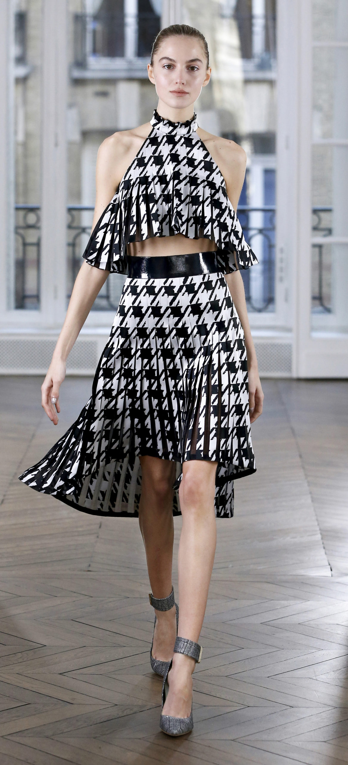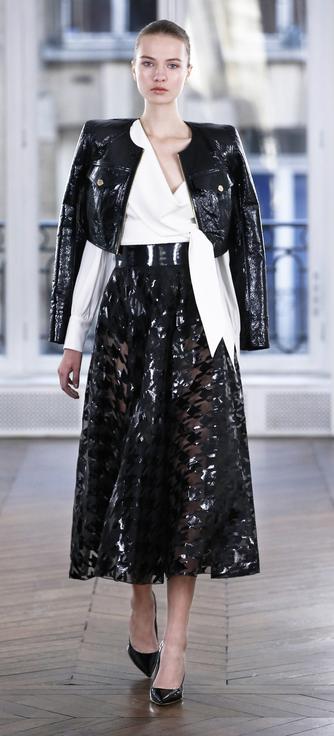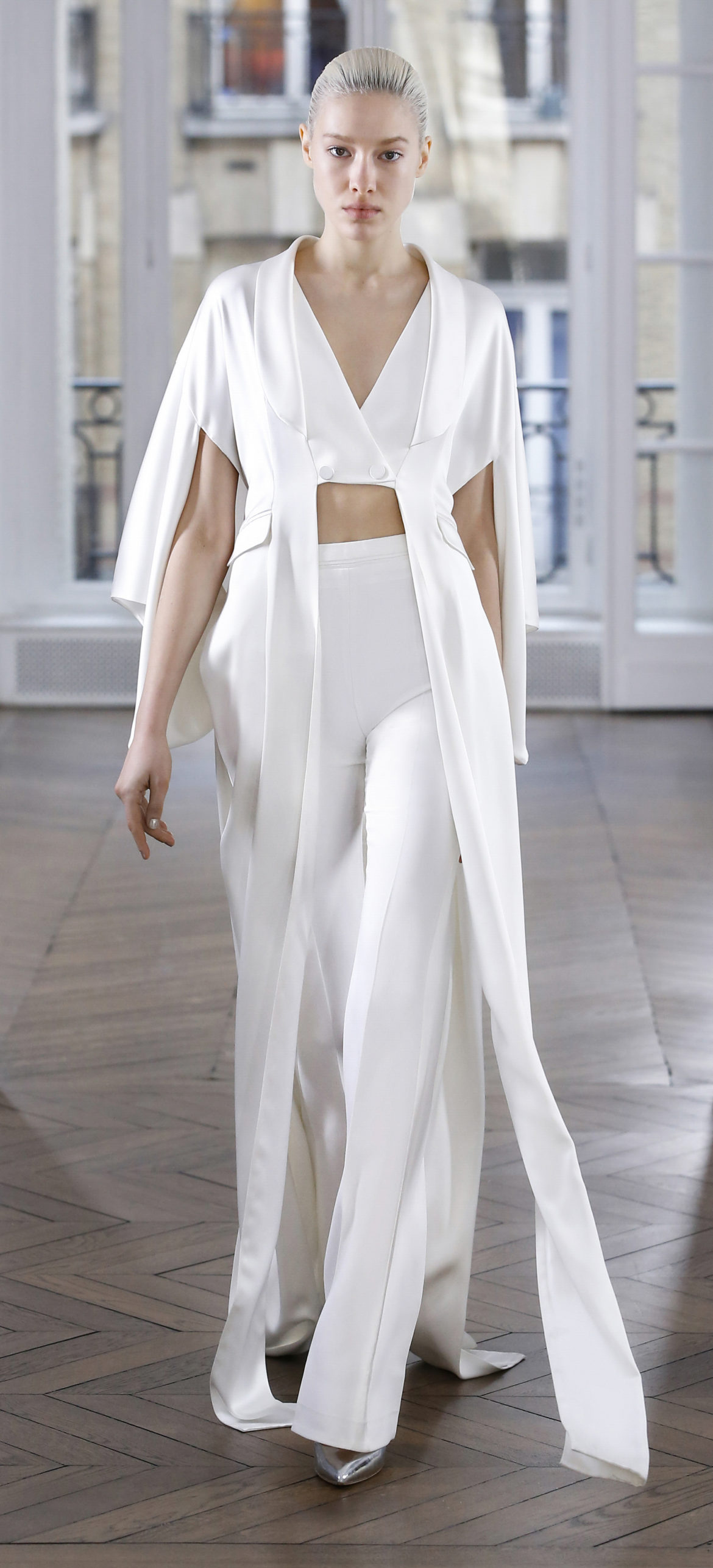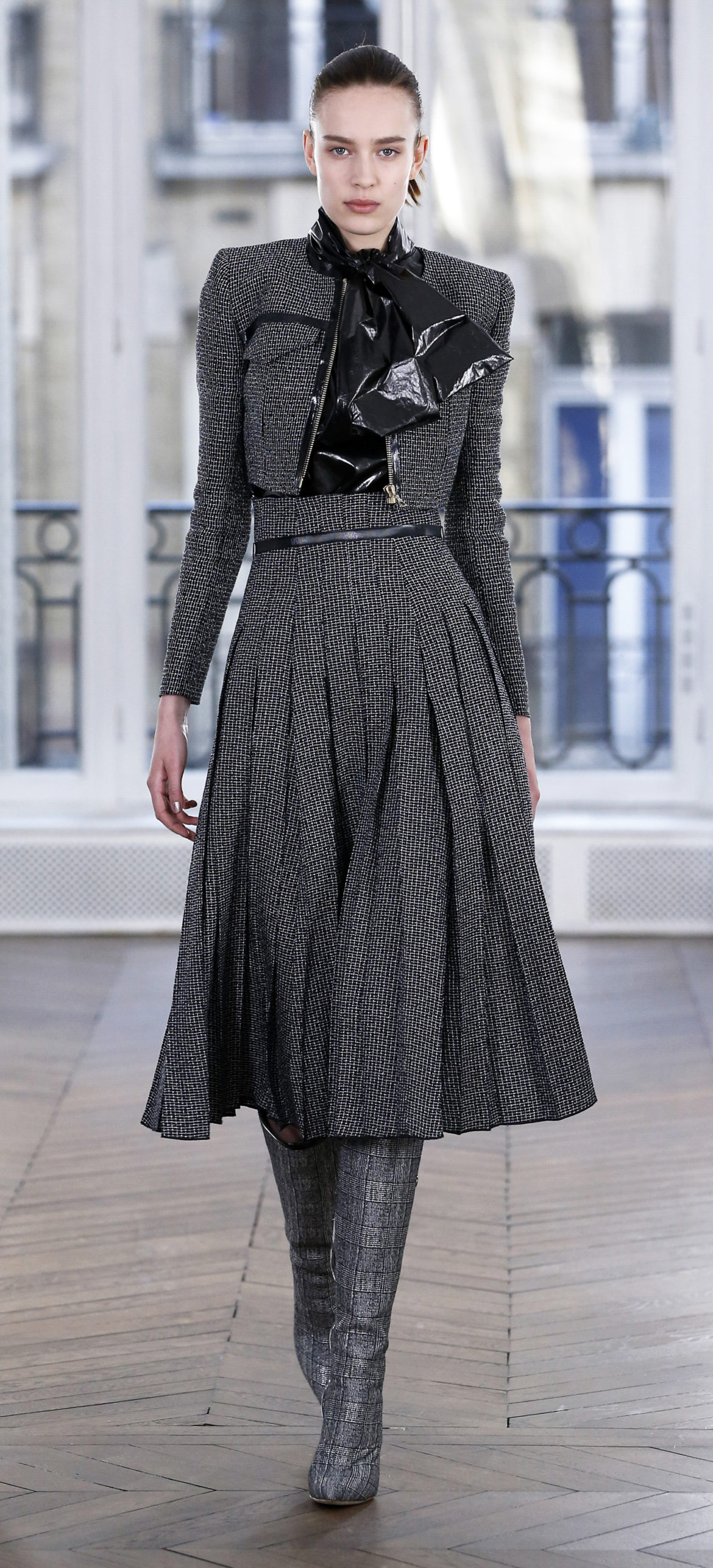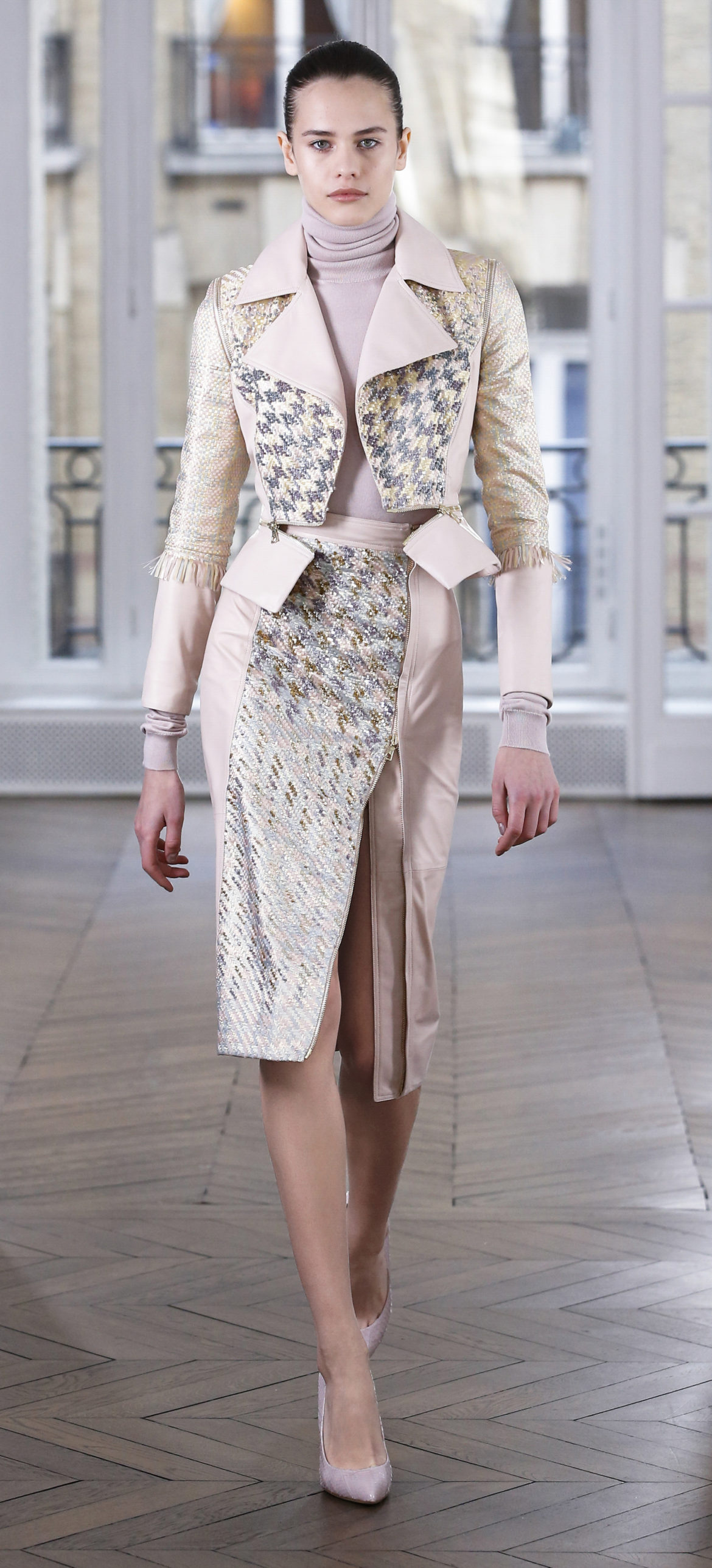 Epitomising effortless elegance, the Ralph & Russo Autumn/Winter 2018 Prêt-à-Porter collection presents an adaptable offering for the modern woman and her multifaceted lifestyle. Comprised of thirty-five looks, the second Prêt-à-Porter collection explores plongé leather separates, multi-use biker jackets, and off-the-shoulder gowns; in addition to asymmetric knits and open fronted cascading bouquet skirts, which feature as key silhouettes. This season’s colour palette is derived from minerals: shimmering ice-pastels, flashes of mirrored gold, and traces of hyper-glossed jet black. Contrasting textures can also be found throughout as feminine smoky pink cashmere turtlenecks oppose oversized houndstooth outerwear, whilst liquid double satin silk tuxedos and crunchy metallic leather skirts ensure our cosmopolitan muse knows no bounds. Bespoke debossed buttons highlight the house codes of traditionalism and creativity, offset by rubberised leather details heeding to adventure. Free-spirited yet bold, the Ralph & Russo woman is equipped to encounter the farthest corners of this world.
