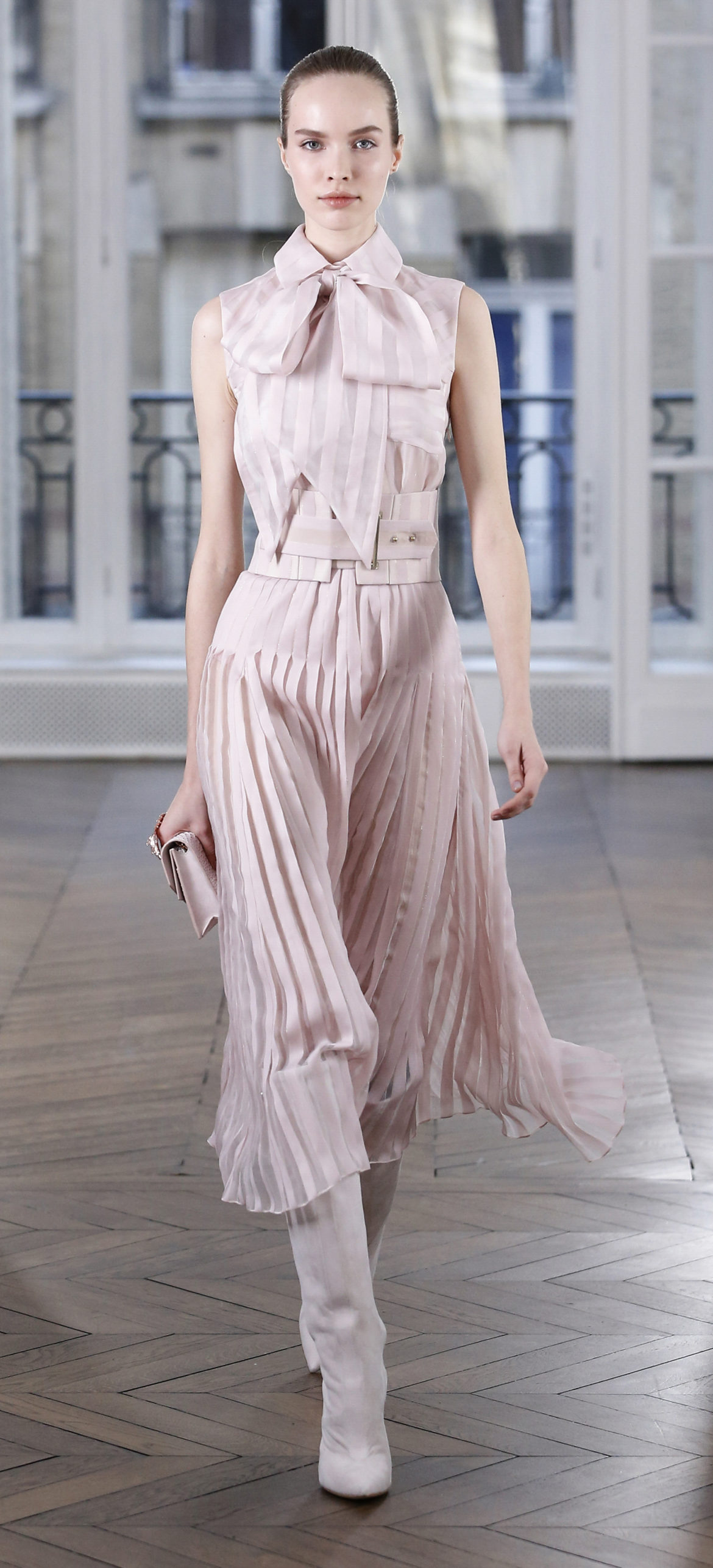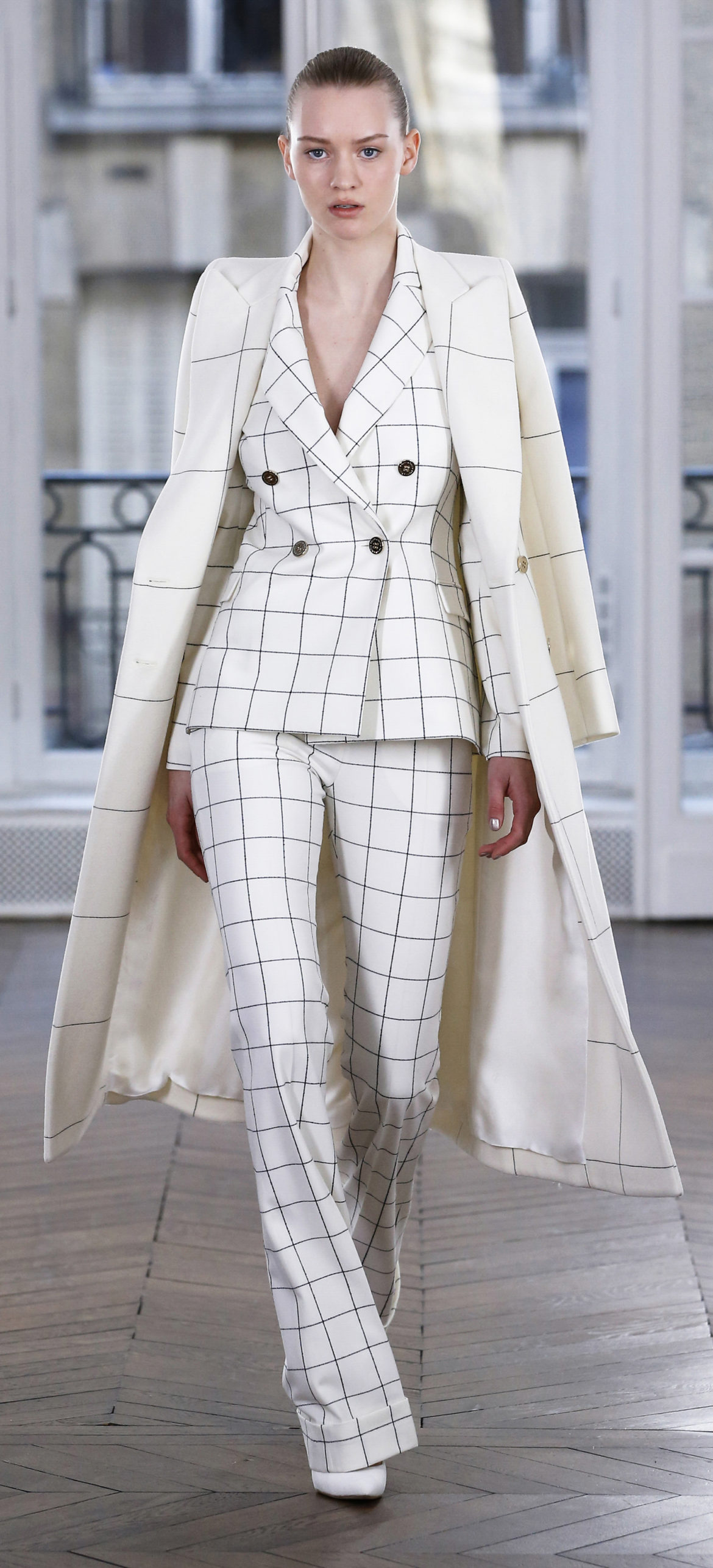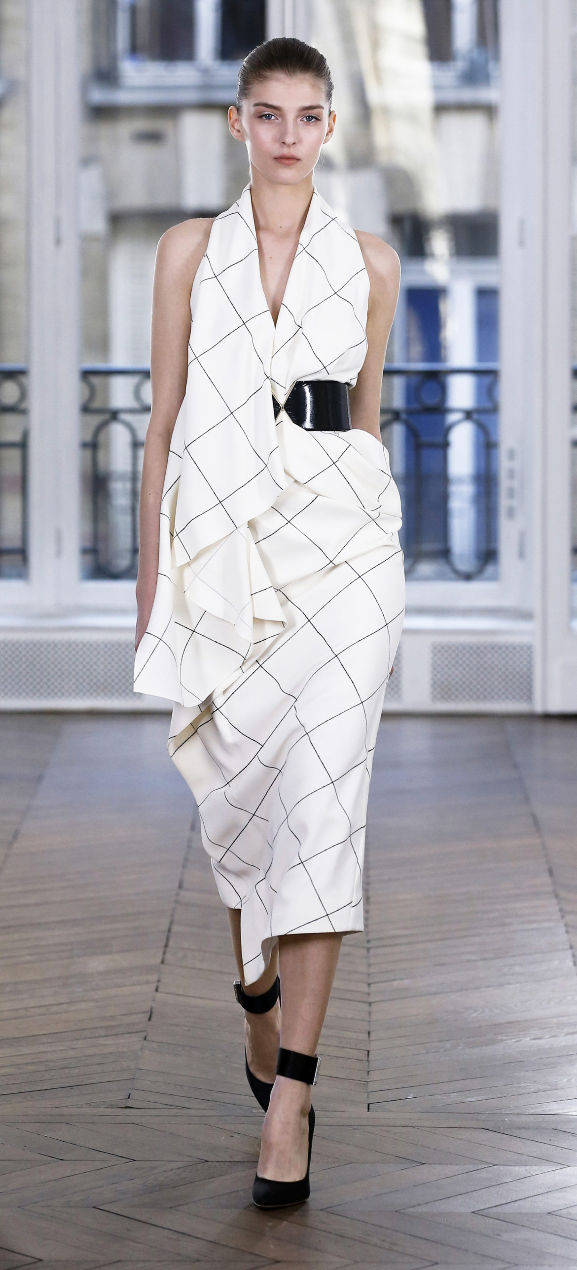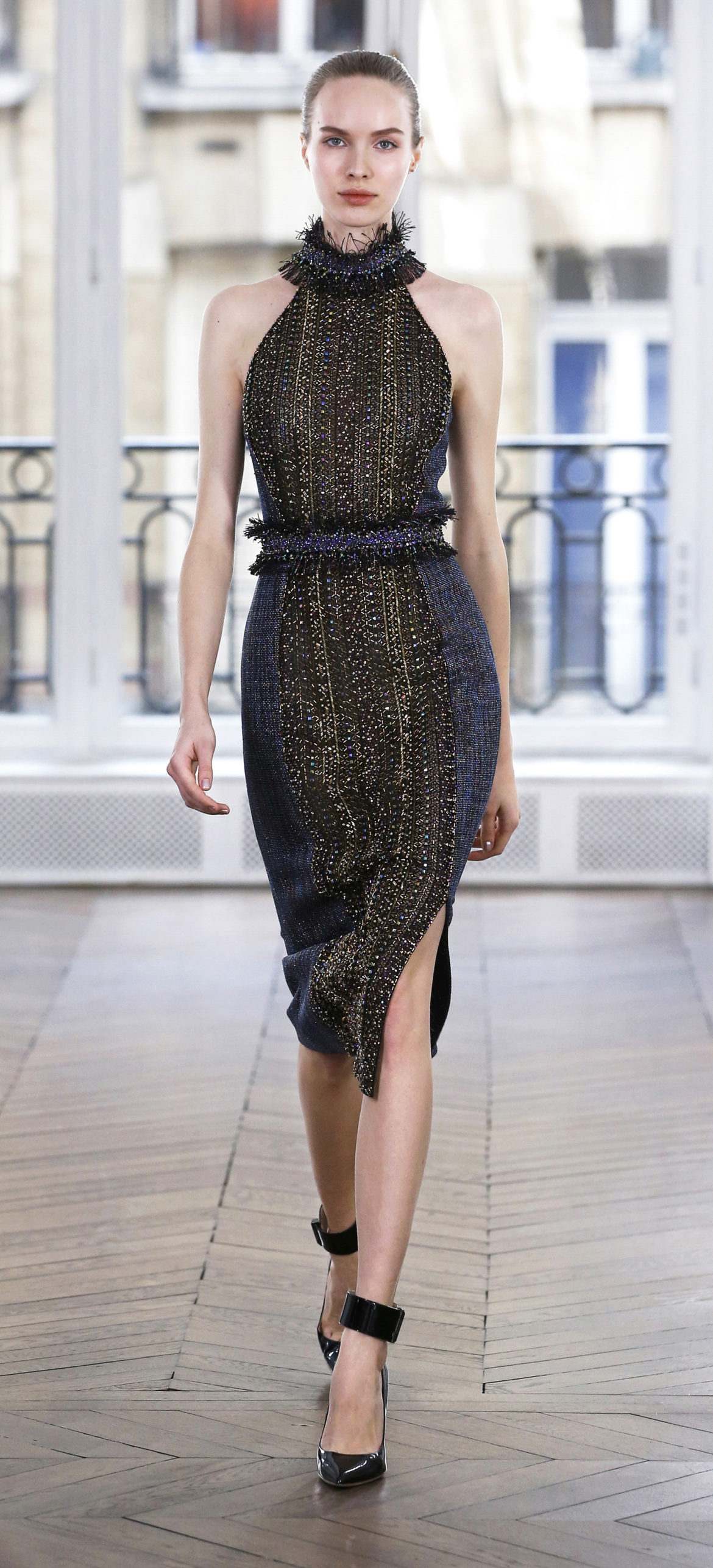 Epitomising effortless elegance, the Ralph & Russo Autumn/Winter 2018 Prêt-à-Porter collection presents an adaptable offering for the modern woman and her multifaceted lifestyle. Comprised of thirty-five looks, the second Prêt-à-Porter collection explores plongé leather separates, multi-use biker jackets, and off-the-shoulder gowns; in addition to asymmetric knits and open fronted cascading bouquet skirts, which feature as key silhouettes. This season’s colour palette is derived from minerals: shimmering ice-pastels, flashes of mirrored gold, and traces of hyper-glossed jet black. Contrasting textures can also be found throughout as feminine smoky pink cashmere turtlenecks oppose oversized houndstooth outerwear, whilst liquid double satin silk tuxedos and crunchy metallic leather skirts ensure our cosmopolitan muse knows no bounds. Bespoke debossed buttons highlight the house codes of traditionalism and creativity, offset by rubberised leather details heeding to adventure. Free-spirited yet bold, the Ralph & Russo woman is equipped to encounter the farthest corners of this world.