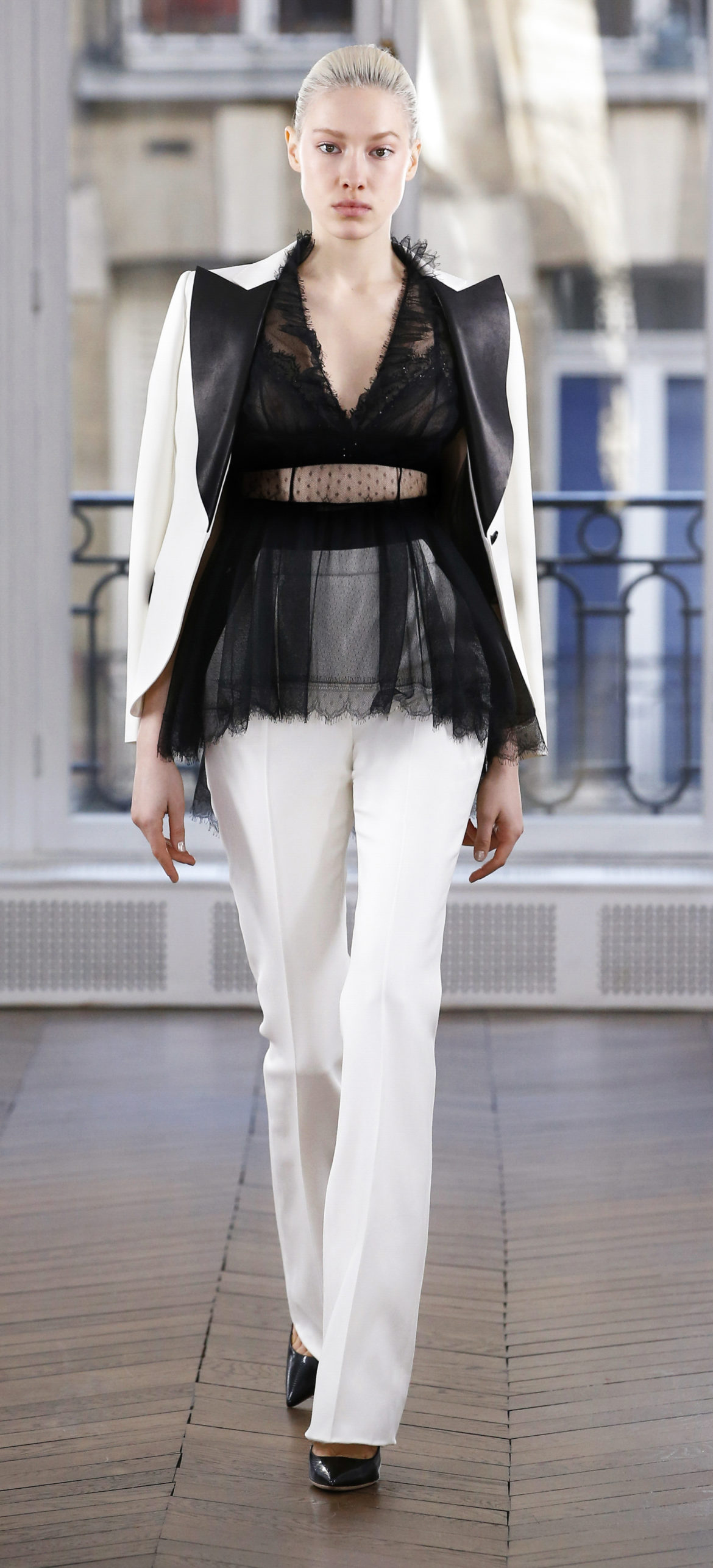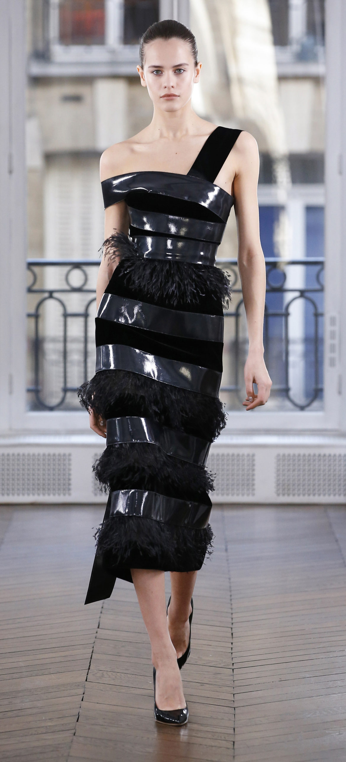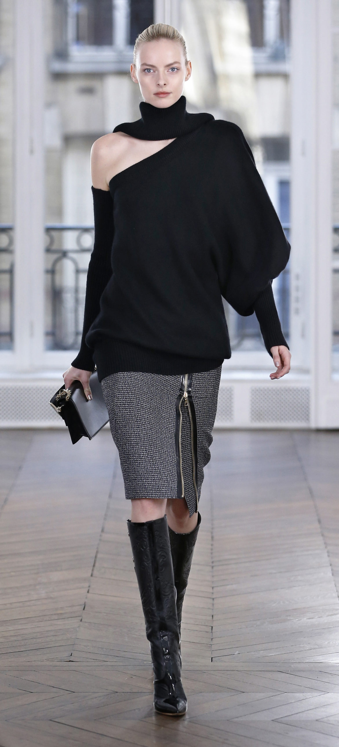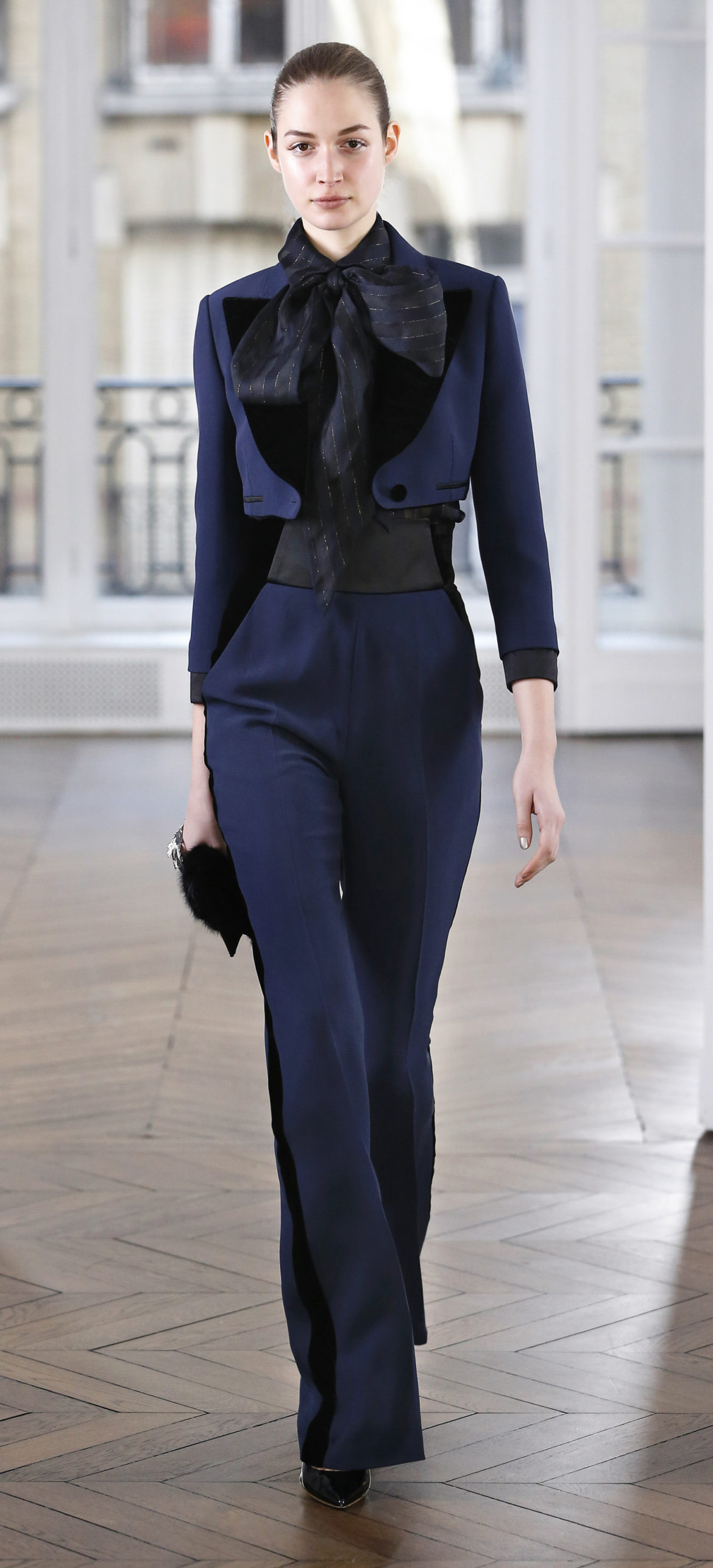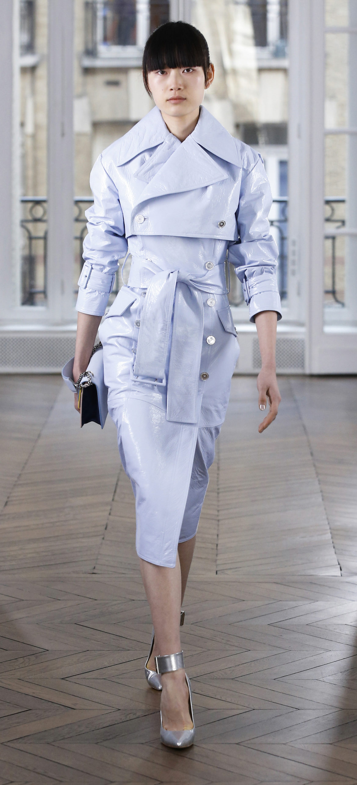 Epitomising effortless elegance, the Ralph & Russo Autumn/Winter 2018 Prêt-à-Porter collection presents an adaptable offering for the modern woman and her multifaceted lifestyle. Comprised of thirty-five looks, the second Prêt-à-Porter collection explores plongé leather separates, multi-use biker jackets, and off-the-shoulder gowns; in addition to asymmetric knits and open fronted cascading bouquet skirts, which feature as key silhouettes. This season’s colour palette is derived from minerals: shimmering ice-pastels, flashes of mirrored gold, and traces of hyper-glossed jet black. Contrasting textures can also be found throughout as feminine smoky pink cashmere turtlenecks oppose oversized houndstooth outerwear, whilst liquid double satin silk tuxedos and crunchy metallic leather skirts ensure our cosmopolitan muse knows no bounds. Bespoke debossed buttons highlight the house codes of traditionalism and creativity, offset by rubberised leather details heeding to adventure. Free-spirited yet bold, the Ralph & Russo woman is equipped to encounter the farthest corners of this world.