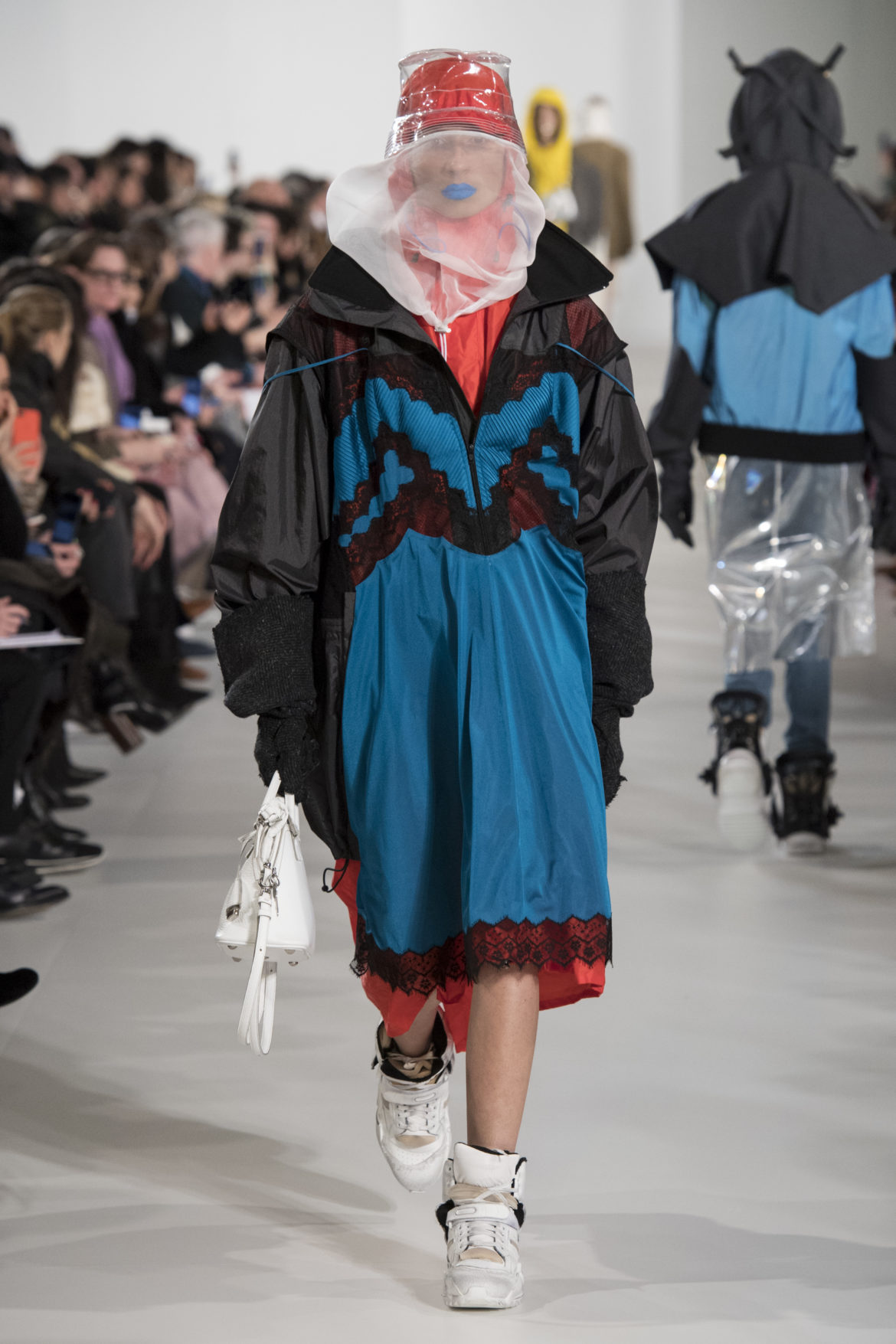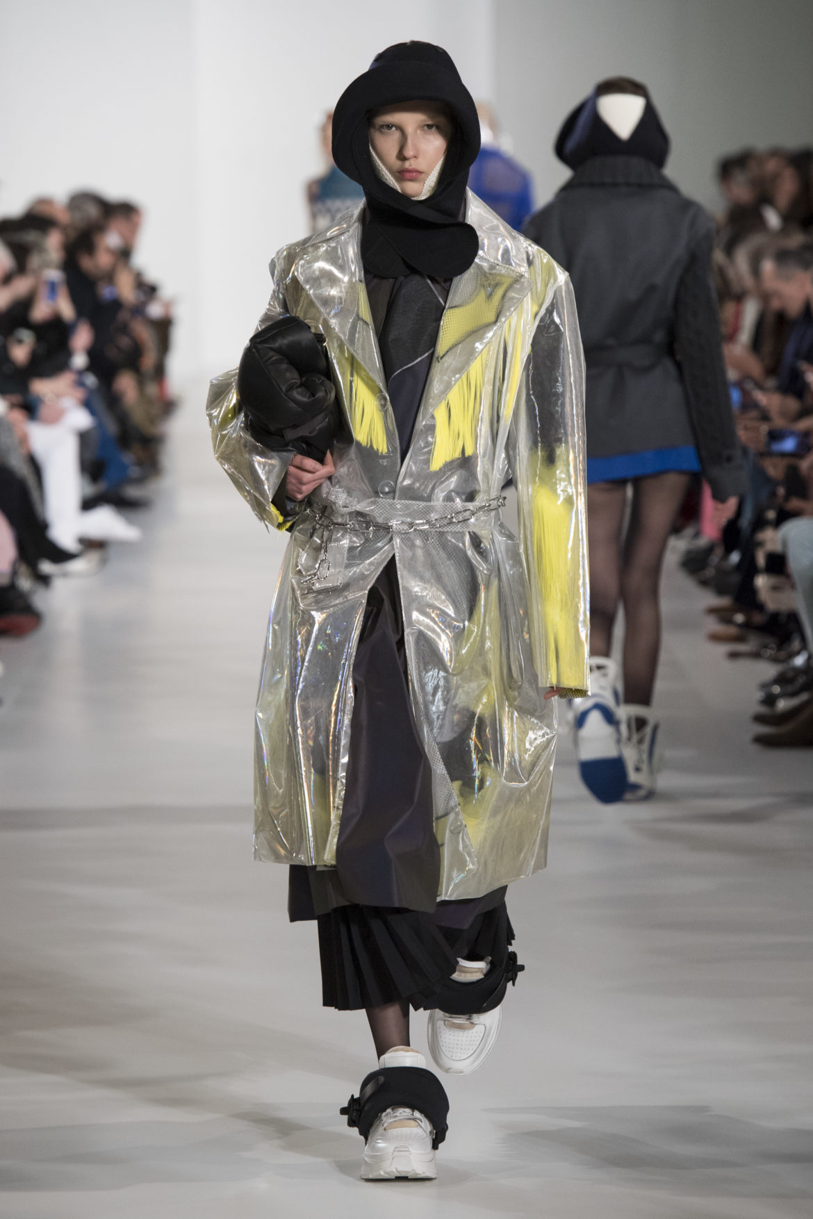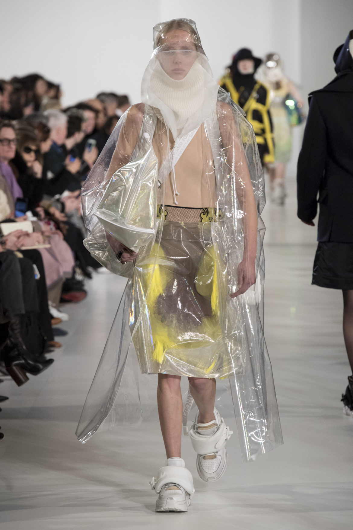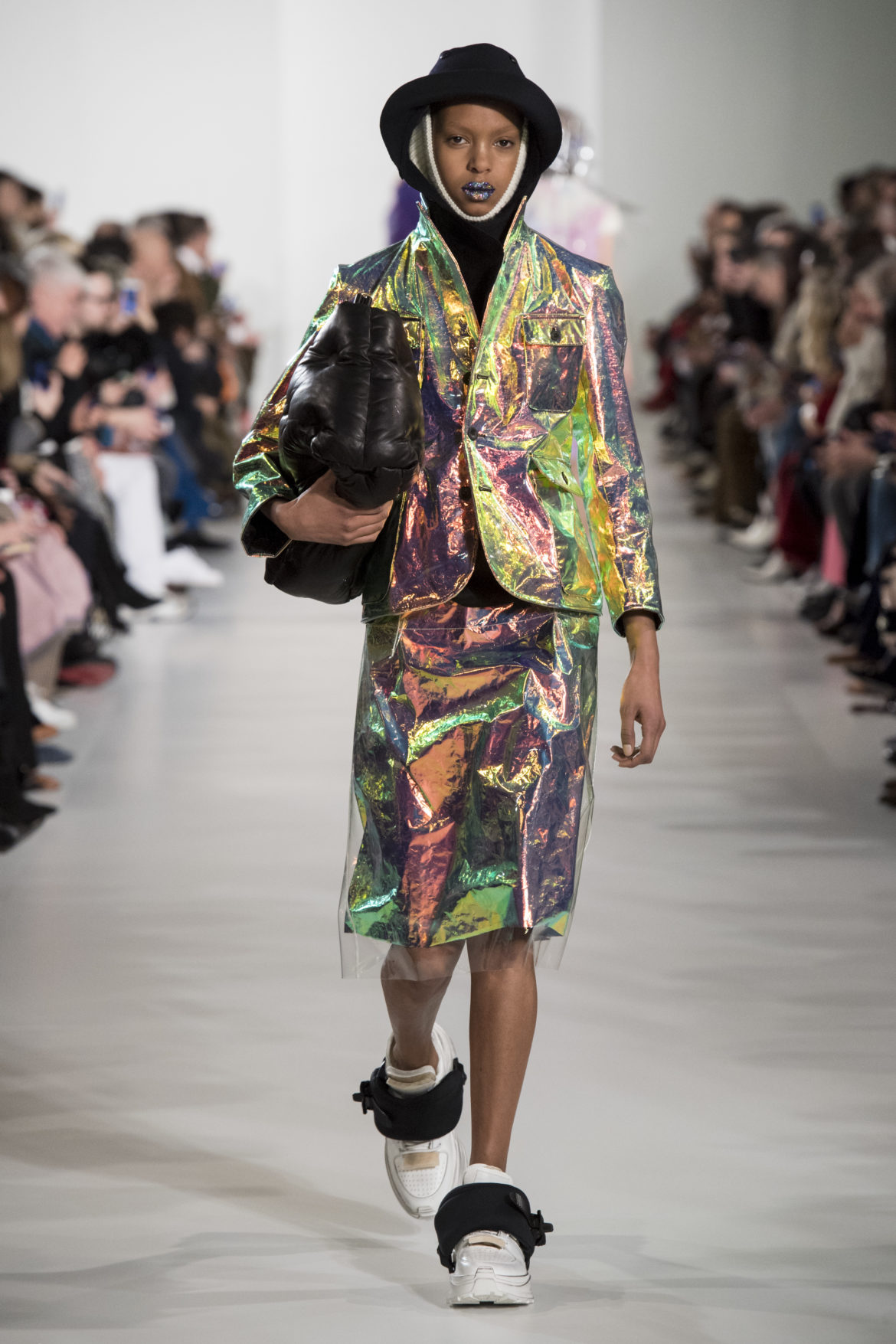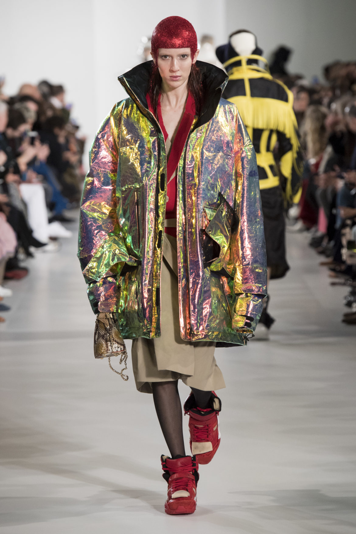 Maison Margiela propels its vision forward to an innate new language and wardrobe based on the vocabulary established through the Artisanal collection. Dressing in reverse is an idea as subversive as relaxed glamour: a trench coat worn casually under a dress, a jumper thrown over a blazer, or the glimpse of a fisherman’s knit under a transparent skirt. For Autumn – Winter 2018, creative director John Galliano examines the inverted wardrobe established at Maison Margiela. The silhouettes of Haute Couture are clarified in garments realized in sculpturally magnified volumes. Outerwear transforms into dresses when dressing in haste. It’s a nylon coat worn under a décortiqué leather jacket, or a deconstructed salopette layered over a trench coat. Seducing the eye, illusionary materials create memories of the familiar. A transparent hologram coat encasing multi-coloured layers of viscose fringing, tulle and organza evokes the codes of rodeo. A grey melange décortiqué jacket is encrusted with the memory of an Aran knit cast in rubber. Fusions of authentic wardrobe staples appropriate the inappropriate. It’s illustrated in the bonding of a herringbone blazer with a fisherman’s knit, or in a twill skirt embossed with the memory of a rodeo skirt. In a play between layers, transparency and reflection, garments become transformative and generate a sense of unconscious glamour. Materials Drawing on the Artisanal collection, holographic and transparent materials take centre stage. Iridescent foil, nylon, reflective flash-sensitive fabric and changeant react to light and movement, effectively shape-shifting on the body. Layered under poly-urethane, tulles and organza liquefy into three-dimensional forms encouraged by the texture of viscose fringing. The effect is echoed in the use of chiffon, voile and georgette. Heritage materials sourced from the men’s wardrobe – herringbone, cavalry twill, gabardine, wool of Aran knits – counter the collection’s technical character and instil a sense of authenticity. Leather appears in outerwear such as cabans and fringed décortiqué rodeo jackets. Technique Notions of relaxed glamour and dressing backwards inform cuts and silhouettes. The hybridisation of classic wardrobe staples calls for bonding and embroidery, employed throughout the collection such as in the fusion of knitwear with tailoring. Outerwear encases layers of materials to create new images through depth. Moulded rubber bears the recollection of knitwear, while formage – the three-dimensional embossing of twill – creates the imprinted memory of rodeo pieces. Prints of similar motifs appear in multiple colours on transparent fabric layered to create a transformative filtrage. Cementing a house code, décortiqué – the reduction of a garment to its core – is exercised in outerwear similarly alluding to the memory of traditional items of clothing. Palette Heritage tones from the humble men’s wardrobe such as charcoal, beige, melange, off-white and black are offset by the boldness of security yellow, Klein blue and fuchsia. Greens and royal purple further add to a Technicolor palette nodding to the iridescence of the technical materials used in the collection. Accessories Inspired by the way in which contemporary tech gadgets serve as extensions of the body, jewellery takes on a prosthetic feel. Ear cuffs and tube rings in rubber and hand cuffs in rubber or chrome-plated brass follow the contours of the body, while diamonté brooches and earrings embellish the anatomy like growing organisms. Nodding to the idea of jewellery display cards, brooches are mounted on acetate boards. Chain belts in brass or rubber-coated metal link to rodeo. Introduced in the Artisanal collection, the Margiela sneaker features in high-top and low-top editions, while the cloud-like Glam Slam bag appears in a new iridescent form.