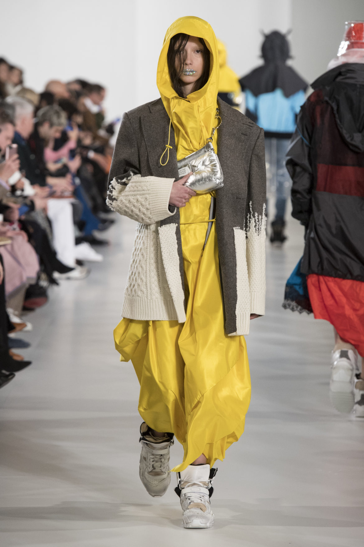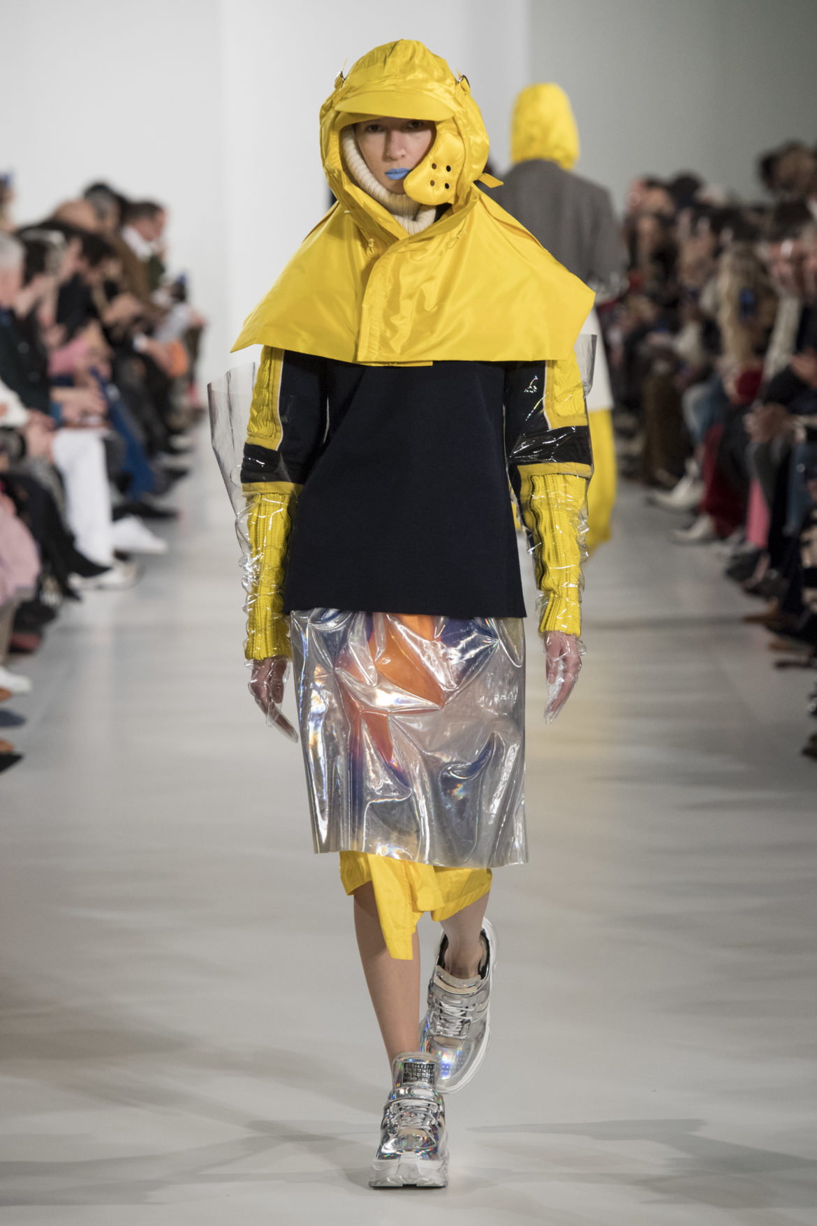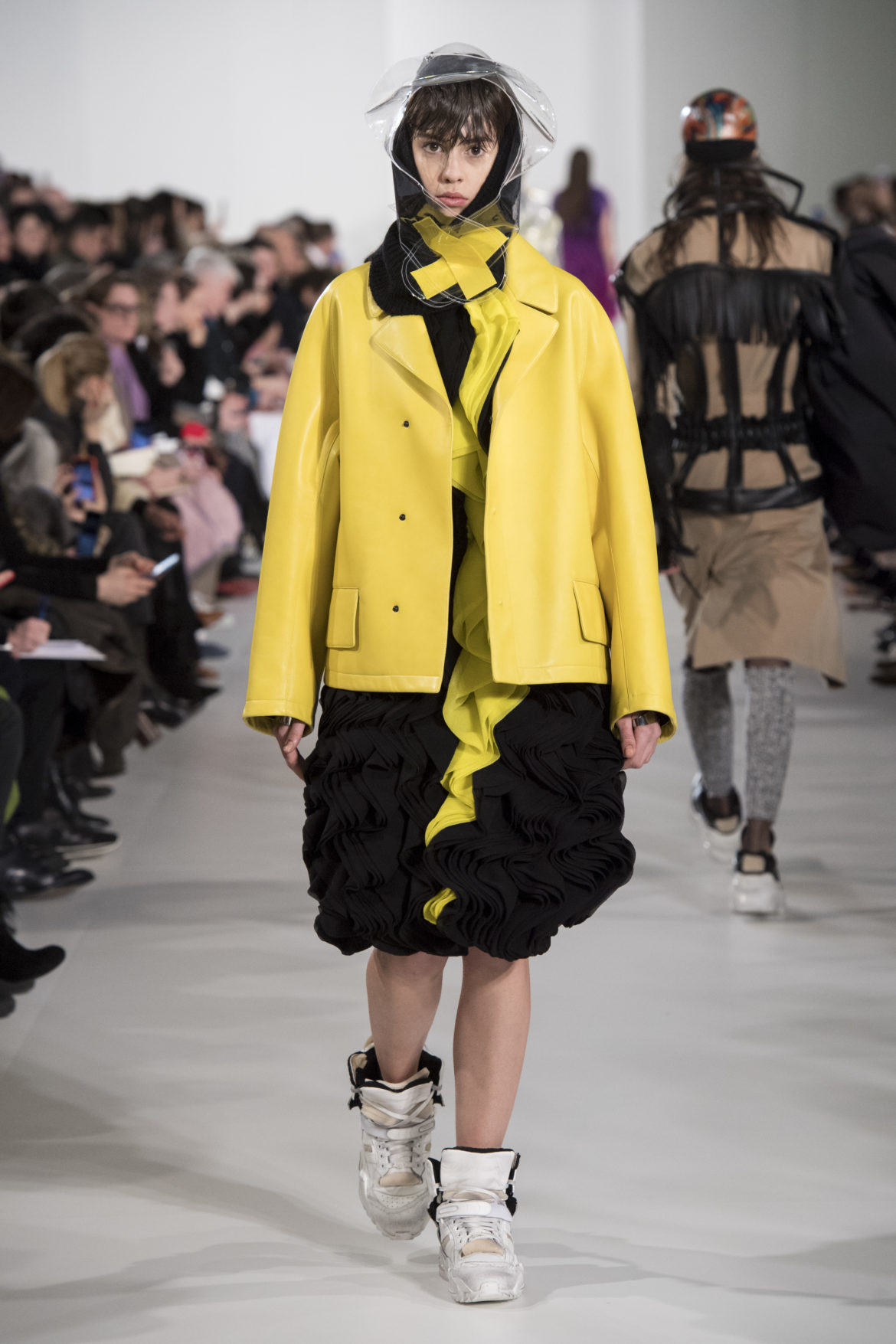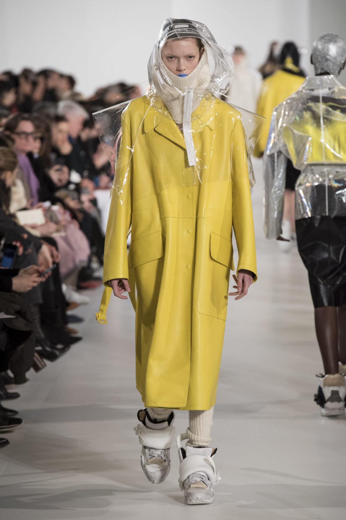 Maison Margiela propels its vision forward to an innate new language and wardrobe based on the vocabulary established through the Artisanal collection. Dressing in reverse is an idea as subversive as relaxed glamour: a trench coat worn casually under a dress, a jumper thrown over a blazer, or the glimpse of a fisherman’s knit under a transparent skirt. For Autumn – Winter 2018, creative director John Galliano examines the inverted wardrobe established at Maison Margiela. The silhouettes of Haute Couture are clarified in garments realized in sculpturally magnified volumes. Outerwear transforms into dresses when dressing in haste. It’s a nylon coat worn under a décortiqué leather jacket, or a deconstructed salopette layered over a trench coat. Seducing the eye, illusionary materials create memories of the familiar. A transparent hologram coat encasing multi-coloured layers of viscose fringing, tulle and organza evokes the codes of rodeo. A grey melange décortiqué jacket is encrusted with the memory of an Aran knit cast in rubber. Fusions of authentic wardrobe staples appropriate the inappropriate. It’s illustrated in the bonding of a herringbone blazer with a fisherman’s knit, or in a twill skirt embossed with the memory of a rodeo skirt. In a play between layers, transparency and reflection, garments become transformative and generate a sense of unconscious glamour. Materials Drawing on the Artisanal collection, holographic and transparent materials take centre stage. Iridescent foil, nylon, reflective flash-sensitive fabric and changeant react to light and movement, effectively shape-shifting on the body. Layered under poly-urethane, tulles and organza liquefy into three-dimensional forms encouraged by the texture of viscose fringing. The effect is echoed in the use of chiffon, voile and georgette. Heritage materials sourced from the men’s wardrobe – herringbone, cavalry twill, gabardine, wool of Aran knits – counter the collection’s technical character and instil a sense of authenticity. Leather appears in outerwear such as cabans and fringed décortiqué rodeo jackets. Technique Notions of relaxed glamour and dressing backwards inform cuts and silhouettes. The hybridisation of classic wardrobe staples calls for bonding and embroidery, employed throughout the collection such as in the fusion of knitwear with tailoring. Outerwear encases layers of materials to create new images through depth. Moulded rubber bears the recollection of knitwear, while formage – the three-dimensional embossing of twill – creates the imprinted memory of rodeo pieces. Prints of similar motifs appear in multiple colours on transparent fabric layered to create a transformative filtrage. Cementing a house code, décortiqué – the reduction of a garment to its core – is exercised in outerwear similarly alluding to the memory of traditional items of clothing. Palette Heritage tones from the humble men’s wardrobe such as charcoal, beige, melange, off-white and black are offset by the boldness of security yellow, Klein blue and fuchsia. Greens and royal purple further add to a Technicolor palette nodding to the iridescence of the technical materials used in the collection. Accessories Inspired by the way in which contemporary tech gadgets serve as extensions of the body, jewellery takes on a prosthetic feel. Ear cuffs and tube rings in rubber and hand cuffs in rubber or chrome-plated brass follow the contours of the body, while diamonté brooches and earrings embellish the anatomy like growing organisms. Nodding to the idea of jewellery display cards, brooches are mounted on acetate boards. Chain belts in brass or rubber-coated metal link to rodeo. Introduced in the Artisanal collection, the Margiela sneaker features in high-top and low-top editions, while the cloud-like Glam Slam bag appears in a new iridescent form.