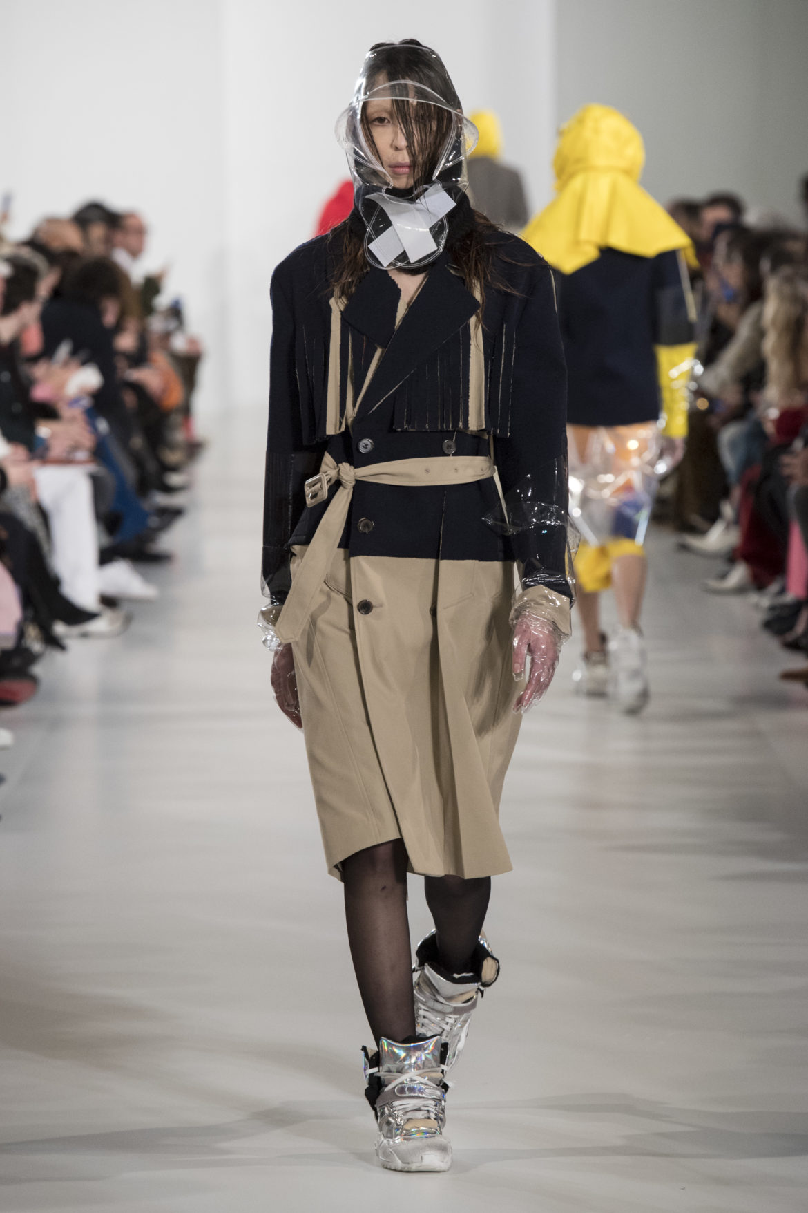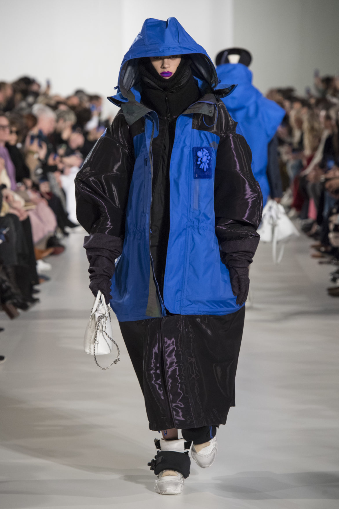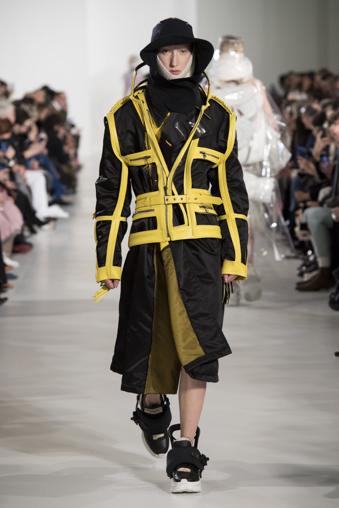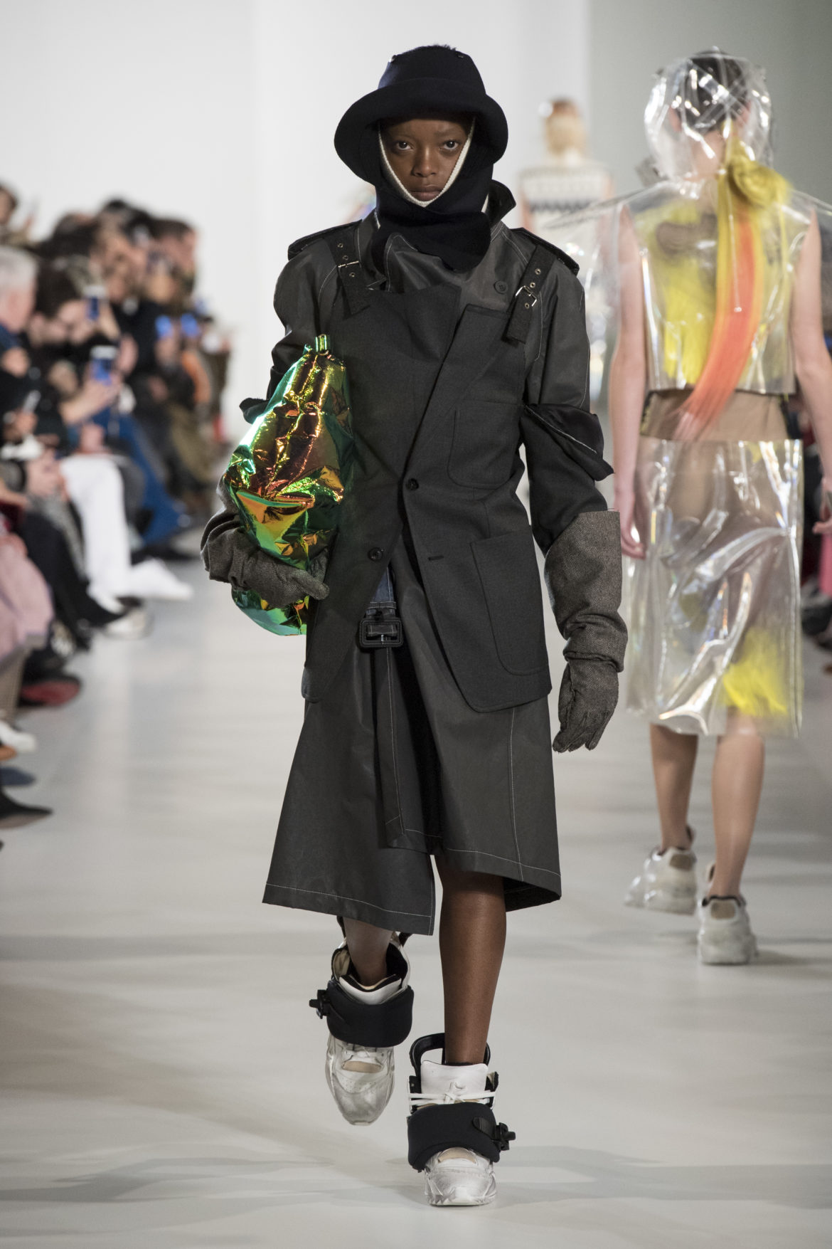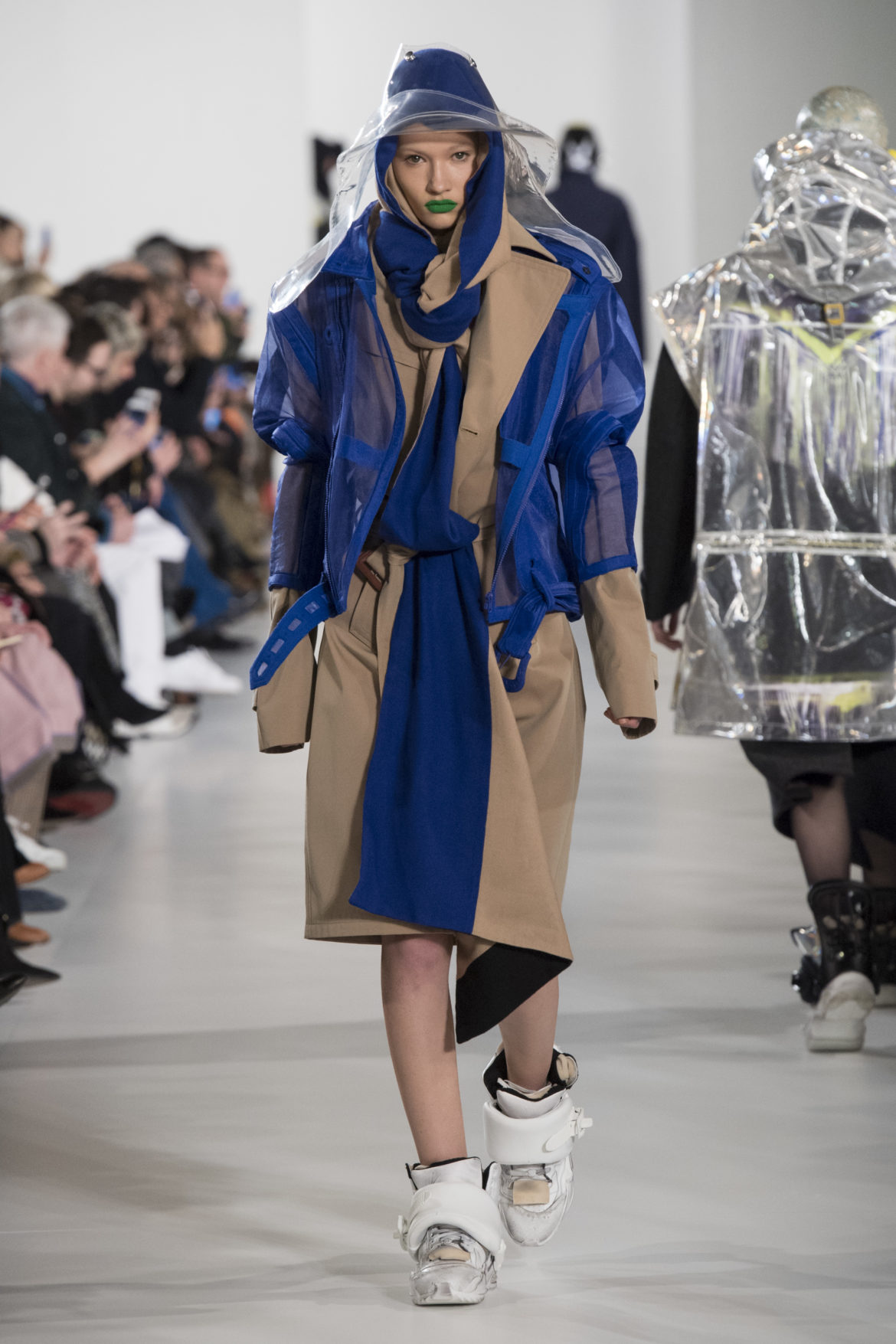 Maison Margiela propels its vision forward to an innate new language and wardrobe based on the vocabulary established through the Artisanal collection. Dressing in reverse is an idea as subversive as relaxed glamour: a trench coat worn casually under a dress, a jumper thrown over a blazer, or the glimpse of a fisherman’s knit under a transparent skirt. For Autumn – Winter 2018, creative director John Galliano examines the inverted wardrobe established at Maison Margiela. The silhouettes of Haute Couture are clarified in garments realized in sculpturally magnified volumes. Outerwear transforms into dresses when dressing in haste. It’s a nylon coat worn under a décortiqué leather jacket, or a deconstructed salopette layered over a trench coat. Seducing the eye, illusionary materials create memories of the familiar. A transparent hologram coat encasing multi-coloured layers of viscose fringing, tulle and organza evokes the codes of rodeo. A grey melange décortiqué jacket is encrusted with the memory of an Aran knit cast in rubber. Fusions of authentic wardrobe staples appropriate the inappropriate. It’s illustrated in the bonding of a herringbone blazer with a fisherman’s knit, or in a twill skirt embossed with the memory of a rodeo skirt. In a play between layers, transparency and reflection, garments become transformative and generate a sense of unconscious glamour. Materials Drawing on the Artisanal collection, holographic and transparent materials take centre stage. Iridescent foil, nylon, reflective flash-sensitive fabric and changeant react to light and movement, effectively shape-shifting on the body. Layered under poly-urethane, tulles and organza liquefy into three-dimensional forms encouraged by the texture of viscose fringing. The effect is echoed in the use of chiffon, voile and georgette. Heritage materials sourced from the men’s wardrobe – herringbone, cavalry twill, gabardine, wool of Aran knits – counter the collection’s technical character and instil a sense of authenticity. Leather appears in outerwear such as cabans and fringed décortiqué rodeo jackets. Technique Notions of relaxed glamour and dressing backwards inform cuts and silhouettes. The hybridisation of classic wardrobe staples calls for bonding and embroidery, employed throughout the collection such as in the fusion of knitwear with tailoring. Outerwear encases layers of materials to create new images through depth. Moulded rubber bears the recollection of knitwear, while formage – the three-dimensional embossing of twill – creates the imprinted memory of rodeo pieces. Prints of similar motifs appear in multiple colours on transparent fabric layered to create a transformative filtrage. Cementing a house code, décortiqué – the reduction of a garment to its core – is exercised in outerwear similarly alluding to the memory of traditional items of clothing. Palette Heritage tones from the humble men’s wardrobe such as charcoal, beige, melange, off-white and black are offset by the boldness of security yellow, Klein blue and fuchsia. Greens and royal purple further add to a Technicolor palette nodding to the iridescence of the technical materials used in the collection. Accessories Inspired by the way in which contemporary tech gadgets serve as extensions of the body, jewellery takes on a prosthetic feel. Ear cuffs and tube rings in rubber and hand cuffs in rubber or chrome-plated brass follow the contours of the body, while diamonté brooches and earrings embellish the anatomy like growing organisms. Nodding to the idea of jewellery display cards, brooches are mounted on acetate boards. Chain belts in brass or rubber-coated metal link to rodeo. Introduced in the Artisanal collection, the Margiela sneaker features in high-top and low-top editions, while the cloud-like Glam Slam bag appears in a new iridescent form.