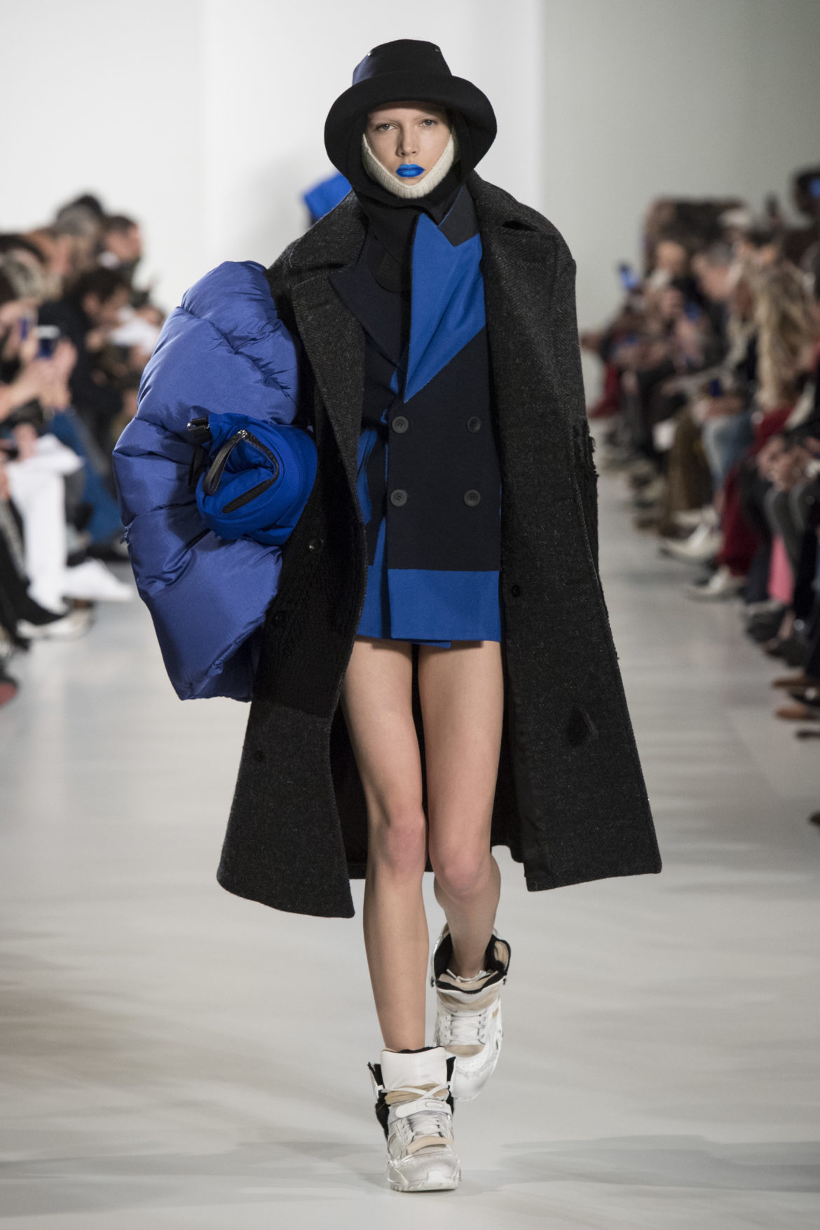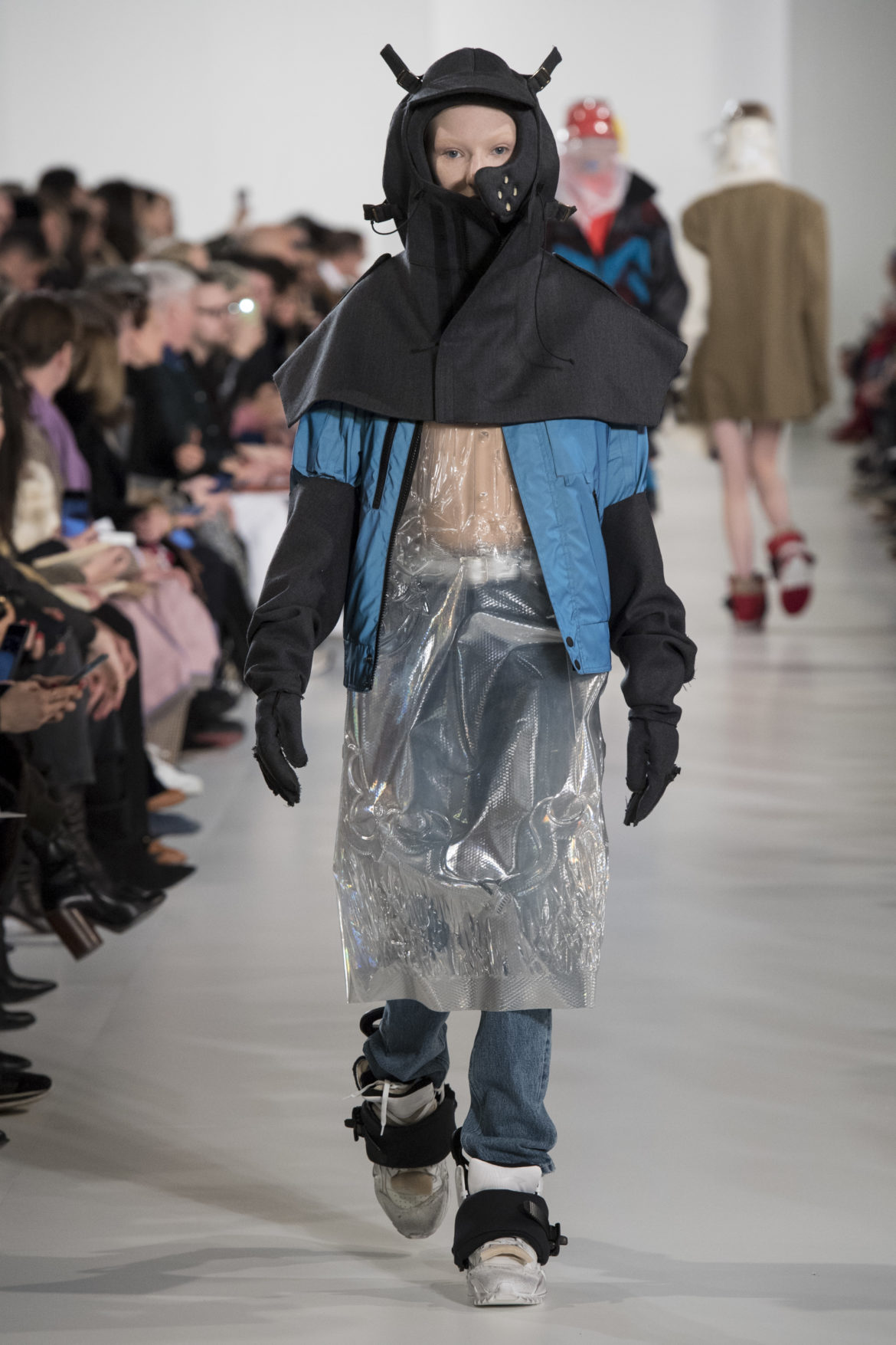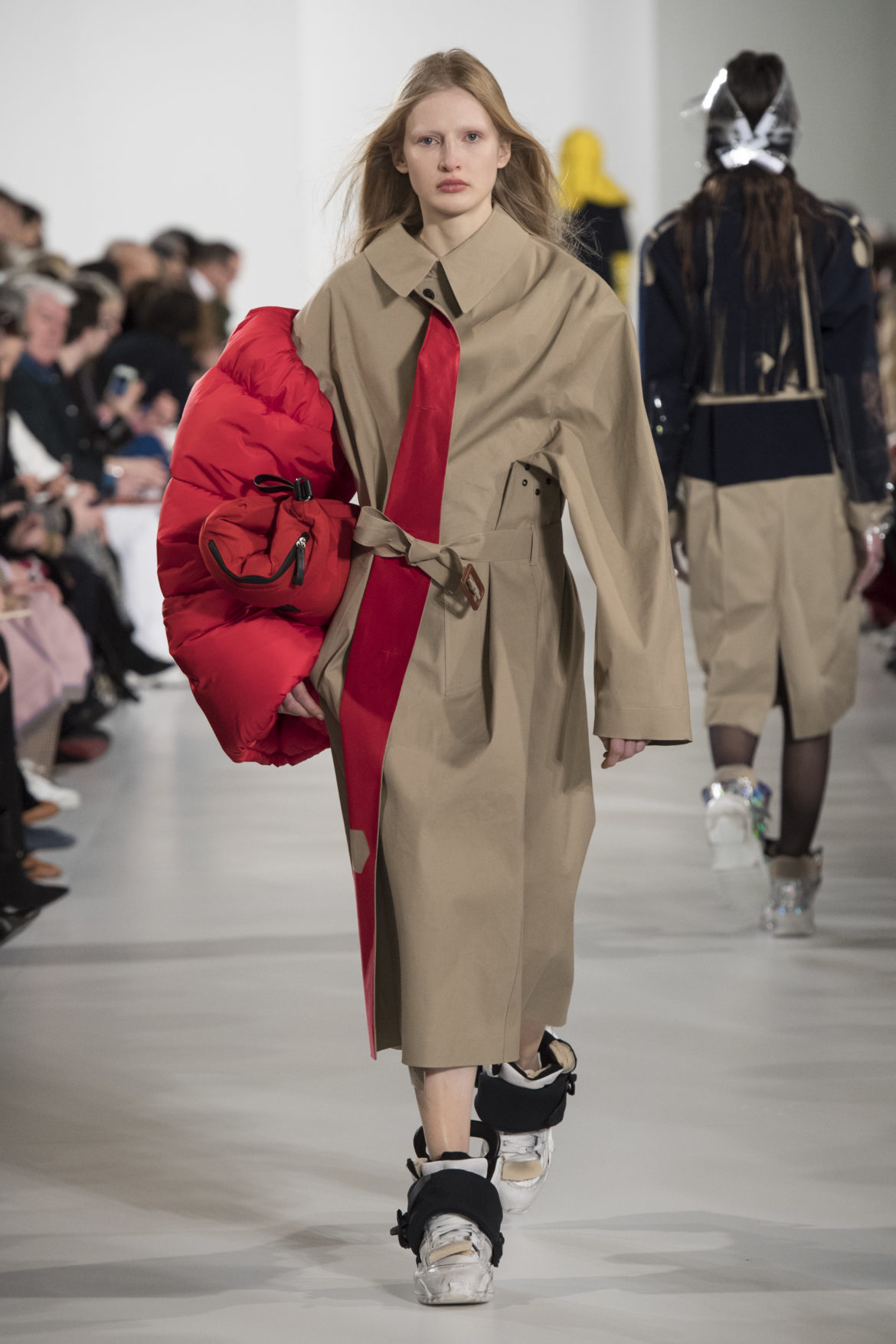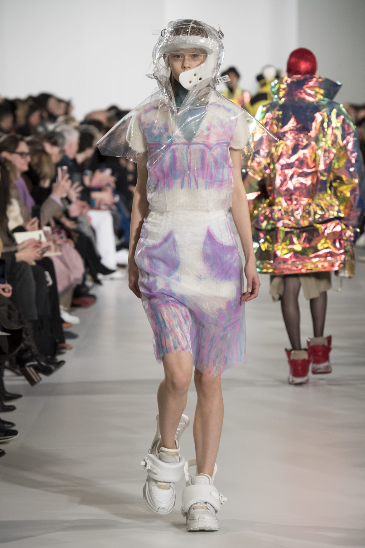Maison Margiela propels its vision forward to an innate new language and wardrobe based on the vocabulary established through the Artisanal collection. Dressing in reverse is an idea as subversive as relaxed glamour: a trench coat worn casually under a dress, a jumper thrown over a blazer, or the glimpse of a fisherman’s knit under a transparent skirt. For Autumn – Winter 2018, creative director John Galliano examines the inverted wardrobe established at Maison Margiela. The silhouettes of Haute Couture are clarified in garments realized in sculpturally magnified volumes. Outerwear transforms into dresses when dressing in haste. It’s a nylon coat worn under a décortiqué leather jacket, or a deconstructed salopette layered over a trench coat. Seducing the eye, illusionary materials create memories of the familiar. A transparent hologram coat encasing multi-coloured layers of viscose fringing, tulle and organza evokes the codes of rodeo. A grey melange décortiqué jacket is encrusted with the memory of an Aran knit cast in rubber. Fusions of authentic wardrobe staples appropriate the inappropriate. It’s illustrated in the bonding of a herringbone blazer with a fisherman’s knit, or in a twill skirt embossed with the memory of a rodeo skirt. In a play between layers, transparency and reflection, garments become transformative and generate a sense of unconscious glamour. Materials Drawing on the Artisanal collection, holographic and transparent materials take centre stage. Iridescent foil, nylon, reflective flash-sensitive fabric and changeant react to light and movement, effectively shape-shifting on the body. Layered under poly-urethane, tulles and organza liquefy into three-dimensional forms encouraged by the texture of viscose fringing. The effect is echoed in the use of chiffon, voile and georgette. Heritage materials sourced from the men’s wardrobe – herringbone, cavalry twill, gabardine, wool of Aran knits – counter the collection’s technical character and instil a sense of authenticity. Leather appears in outerwear such as cabans and fringed décortiqué rodeo jackets. Technique Notions of relaxed glamour and dressing backwards inform cuts and silhouettes. The hybridisation of classic wardrobe staples calls for bonding and embroidery, employed throughout the collection such as in the fusion of knitwear with tailoring. Outerwear encases layers of materials to create new images through depth. Moulded rubber bears the recollection of knitwear, while formage – the three-dimensional embossing of twill – creates the imprinted memory of rodeo pieces. Prints of similar motifs appear in multiple colours on transparent fabric layered to create a transformative filtrage. Cementing a house code, décortiqué – the reduction of a garment to its core – is exercised in outerwear similarly alluding to the memory of traditional items of clothing. Palette Heritage tones from the humble men’s wardrobe such as charcoal, beige, melange, off-white and black are offset by the boldness of security yellow, Klein blue and fuchsia. Greens and royal purple further add to a Technicolor palette nodding to the iridescence of the technical materials used in the collection. Accessories Inspired by the way in which contemporary tech gadgets serve as extensions of the body, jewellery takes on a prosthetic feel. Ear cuffs and tube rings in rubber and hand cuffs in rubber or chrome-plated brass follow the contours of the body, while diamonté brooches and earrings embellish the anatomy like growing organisms. Nodding to the idea of jewellery display cards, brooches are mounted on acetate boards. Chain belts in brass or rubber-coated metal link to rodeo. Introduced in the Artisanal collection, the Margiela sneaker features in high-top and low-top editions, while the cloud-like Glam Slam bag appears in a new iridescent form.