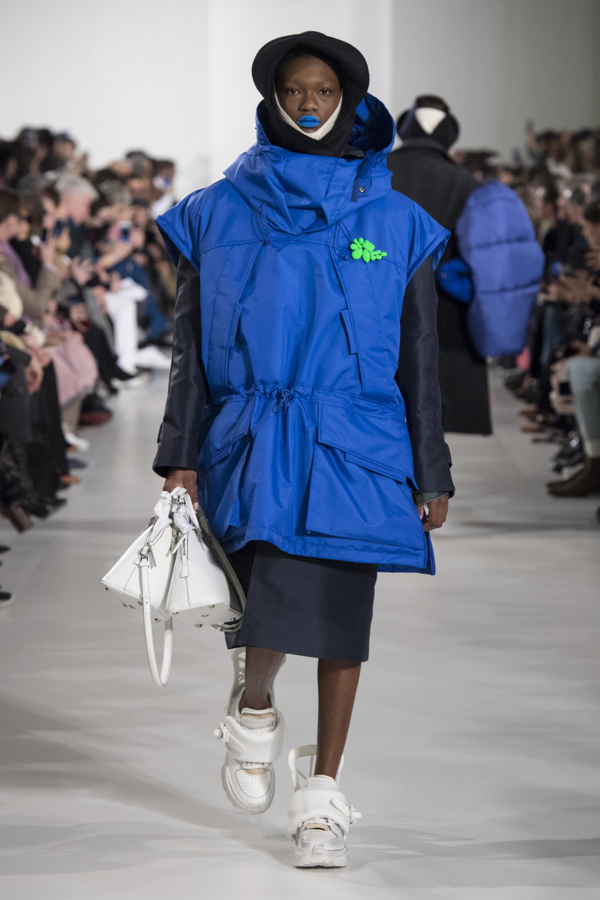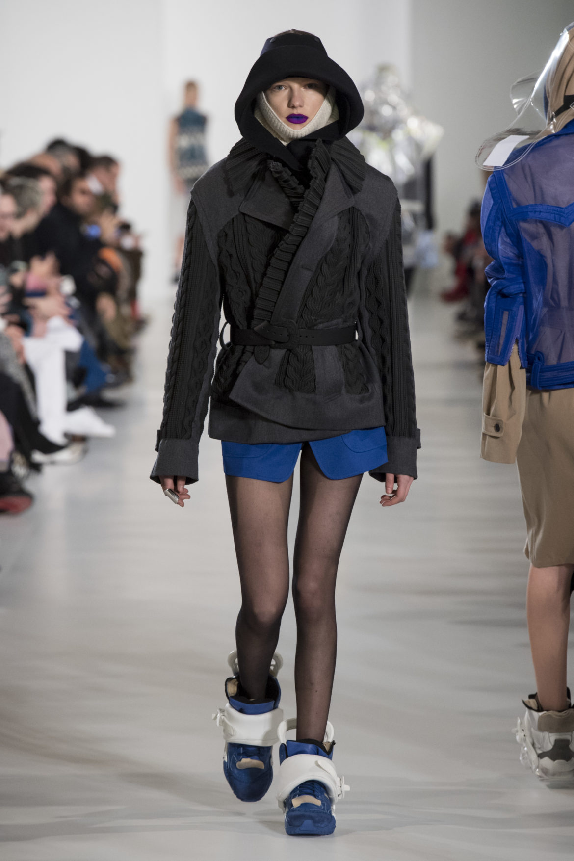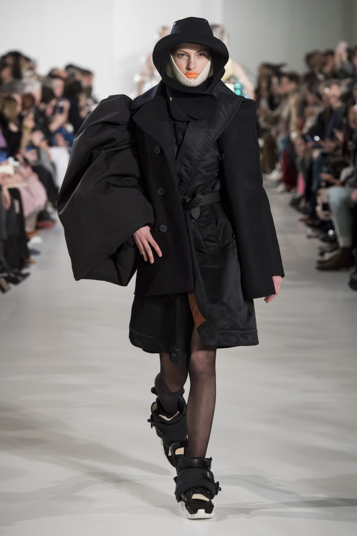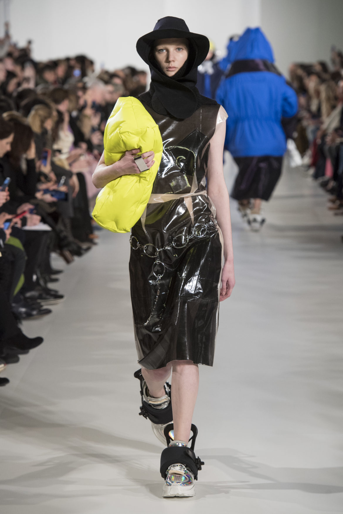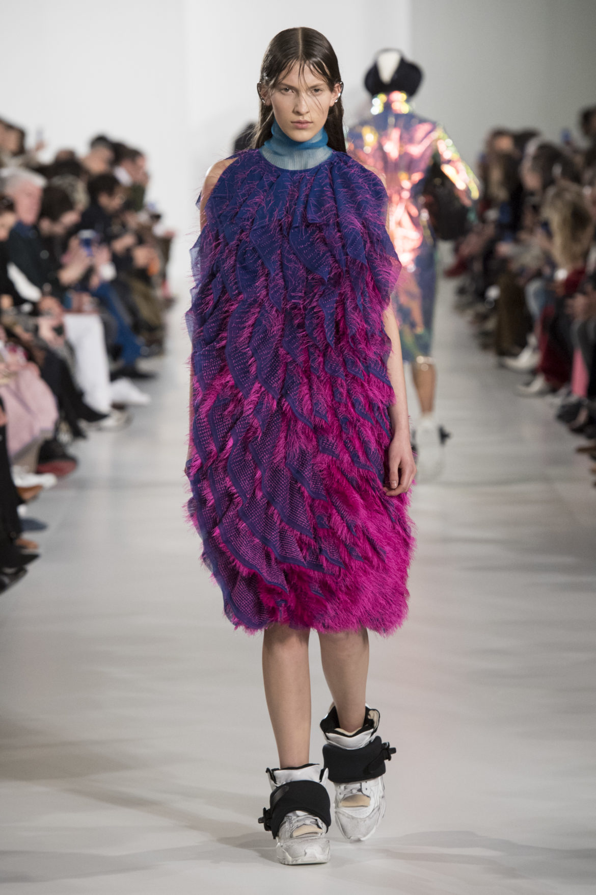 Maison Margiela propels its vision forward to an innate new language and wardrobe based on the vocabulary established through the Artisanal collection. Dressing in reverse is an idea as subversive as relaxed glamour: a trench coat worn casually under a dress, a jumper thrown over a blazer, or the glimpse of a fisherman’s knit under a transparent skirt. For Autumn – Winter 2018, creative director John Galliano examines the inverted wardrobe established at Maison Margiela. The silhouettes of Haute Couture are clarified in garments realized in sculpturally magnified volumes. Outerwear transforms into dresses when dressing in haste. It’s a nylon coat worn under a décortiqué leather jacket, or a deconstructed salopette layered over a trench coat. Seducing the eye, illusionary materials create memories of the familiar. A transparent hologram coat encasing multi-coloured layers of viscose fringing, tulle and organza evokes the codes of rodeo. A grey melange décortiqué jacket is encrusted with the memory of an Aran knit cast in rubber. Fusions of authentic wardrobe staples appropriate the inappropriate. It’s illustrated in the bonding of a herringbone blazer with a fisherman’s knit, or in a twill skirt embossed with the memory of a rodeo skirt. In a play between layers, transparency and reflection, garments become transformative and generate a sense of unconscious glamour. Materials Drawing on the Artisanal collection, holographic and transparent materials take centre stage. Iridescent foil, nylon, reflective flash-sensitive fabric and changeant react to light and movement, effectively shape-shifting on the body. Layered under poly-urethane, tulles and organza liquefy into three-dimensional forms encouraged by the texture of viscose fringing. The effect is echoed in the use of chiffon, voile and georgette. Heritage materials sourced from the men’s wardrobe – herringbone, cavalry twill, gabardine, wool of Aran knits – counter the collection’s technical character and instil a sense of authenticity. Leather appears in outerwear such as cabans and fringed décortiqué rodeo jackets. Technique Notions of relaxed glamour and dressing backwards inform cuts and silhouettes. The hybridisation of classic wardrobe staples calls for bonding and embroidery, employed throughout the collection such as in the fusion of knitwear with tailoring. Outerwear encases layers of materials to create new images through depth. Moulded rubber bears the recollection of knitwear, while formage – the three-dimensional embossing of twill – creates the imprinted memory of rodeo pieces. Prints of similar motifs appear in multiple colours on transparent fabric layered to create a transformative filtrage. Cementing a house code, décortiqué – the reduction of a garment to its core – is exercised in outerwear similarly alluding to the memory of traditional items of clothing. Palette Heritage tones from the humble men’s wardrobe such as charcoal, beige, melange, off-white and black are offset by the boldness of security yellow, Klein blue and fuchsia. Greens and royal purple further add to a Technicolor palette nodding to the iridescence of the technical materials used in the collection. Accessories Inspired by the way in which contemporary tech gadgets serve as extensions of the body, jewellery takes on a prosthetic feel. Ear cuffs and tube rings in rubber and hand cuffs in rubber or chrome-plated brass follow the contours of the body, while diamonté brooches and earrings embellish the anatomy like growing organisms. Nodding to the idea of jewellery display cards, brooches are mounted on acetate boards. Chain belts in brass or rubber-coated metal link to rodeo. Introduced in the Artisanal collection, the Margiela sneaker features in high-top and low-top editions, while the cloud-like Glam Slam bag appears in a new iridescent form.