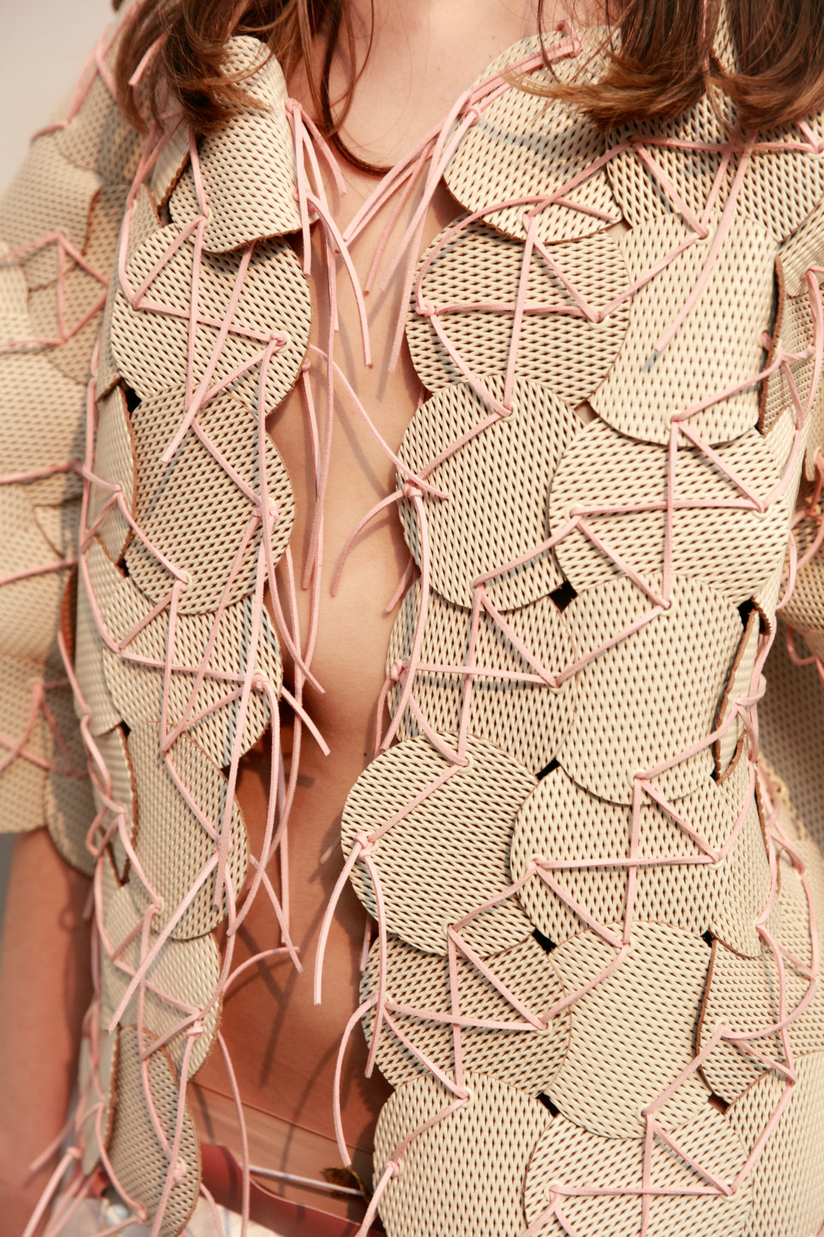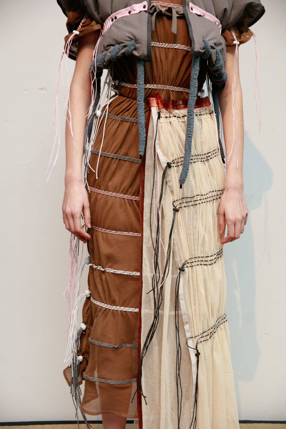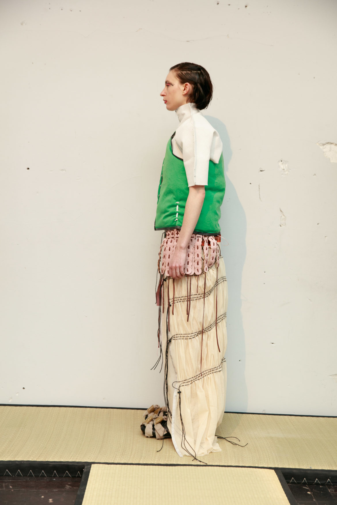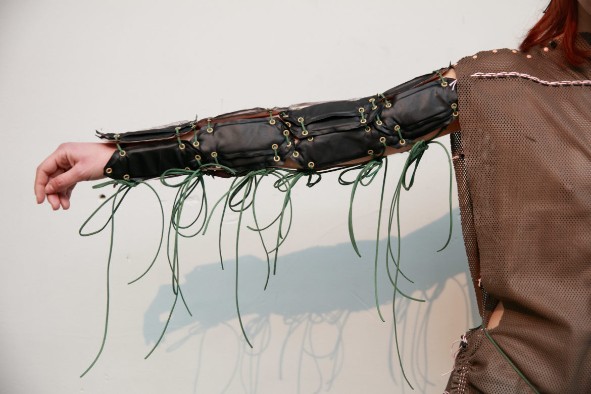 His purpose is to go back to a time before sewing. To allow the evolution of new construction techniques to affect the designs. Throughout history, the resources and tools utilized by a culture affect its aesthetic. If certain elements or tools are improved or removed, artistic values adapt simultaneously. This is the central concept he is exploring with his work.