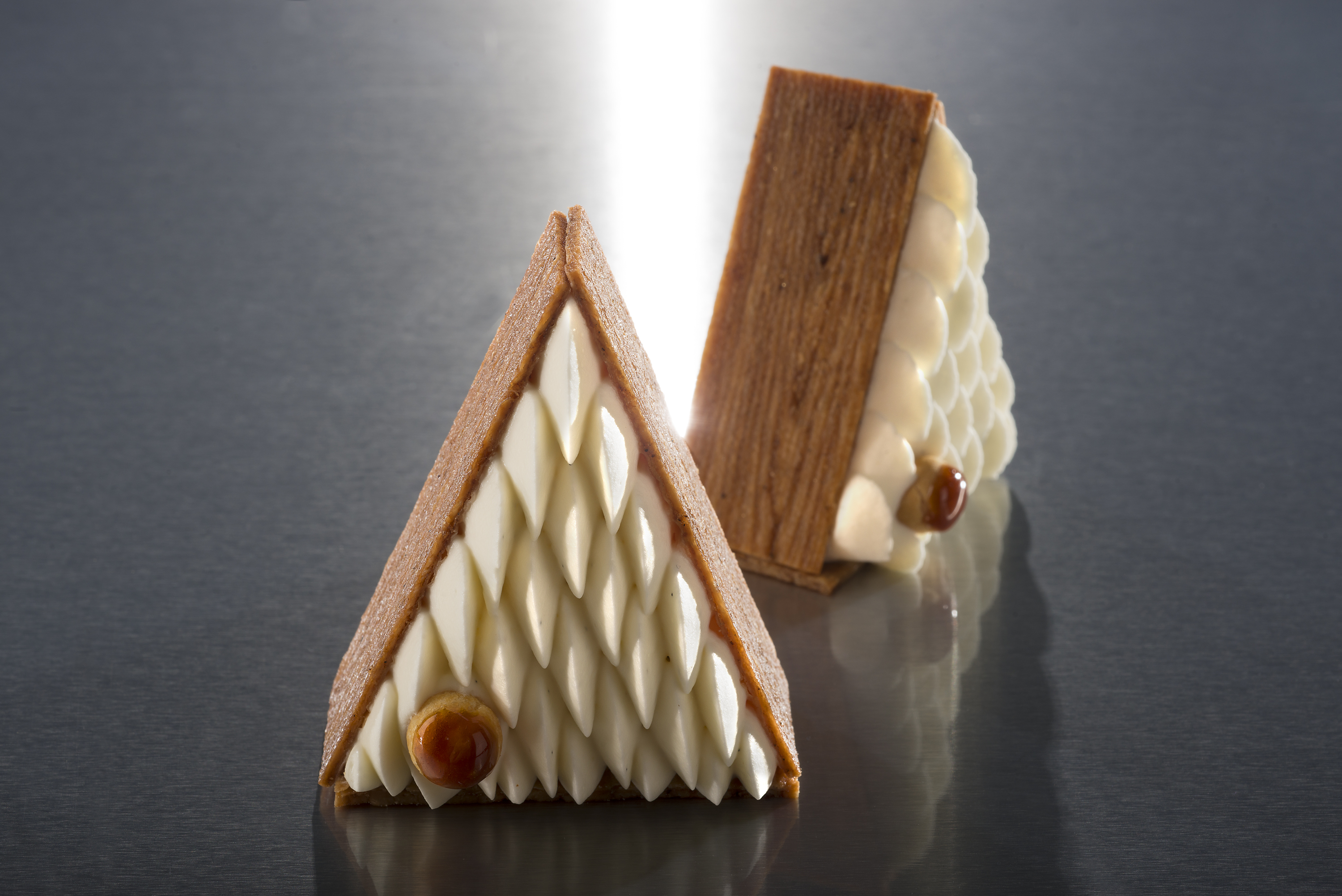 Une arlette caramel et vanille (tuile finement croustillante et caramélisée, à base de pâte feuilletée et de sucre glace), prend une forme pyramidale inattendue. Elle est garnie d’une chantilly mascarpone et vanille, d’un crémeux et d’un coulant praliné à la vanille, d’un éclair croustillant et d’un caramel tendre en son cœur. Elégant et spectaculaire, le Saint-Honoré d’Adrien Bozzolo ravira les becs sucrés par son jeu de textures croustillantes, crémeuses et aériennes. Elle s’impose comme la pâtisserie phare du palace parisien situé au cœur de la rue éponyme.