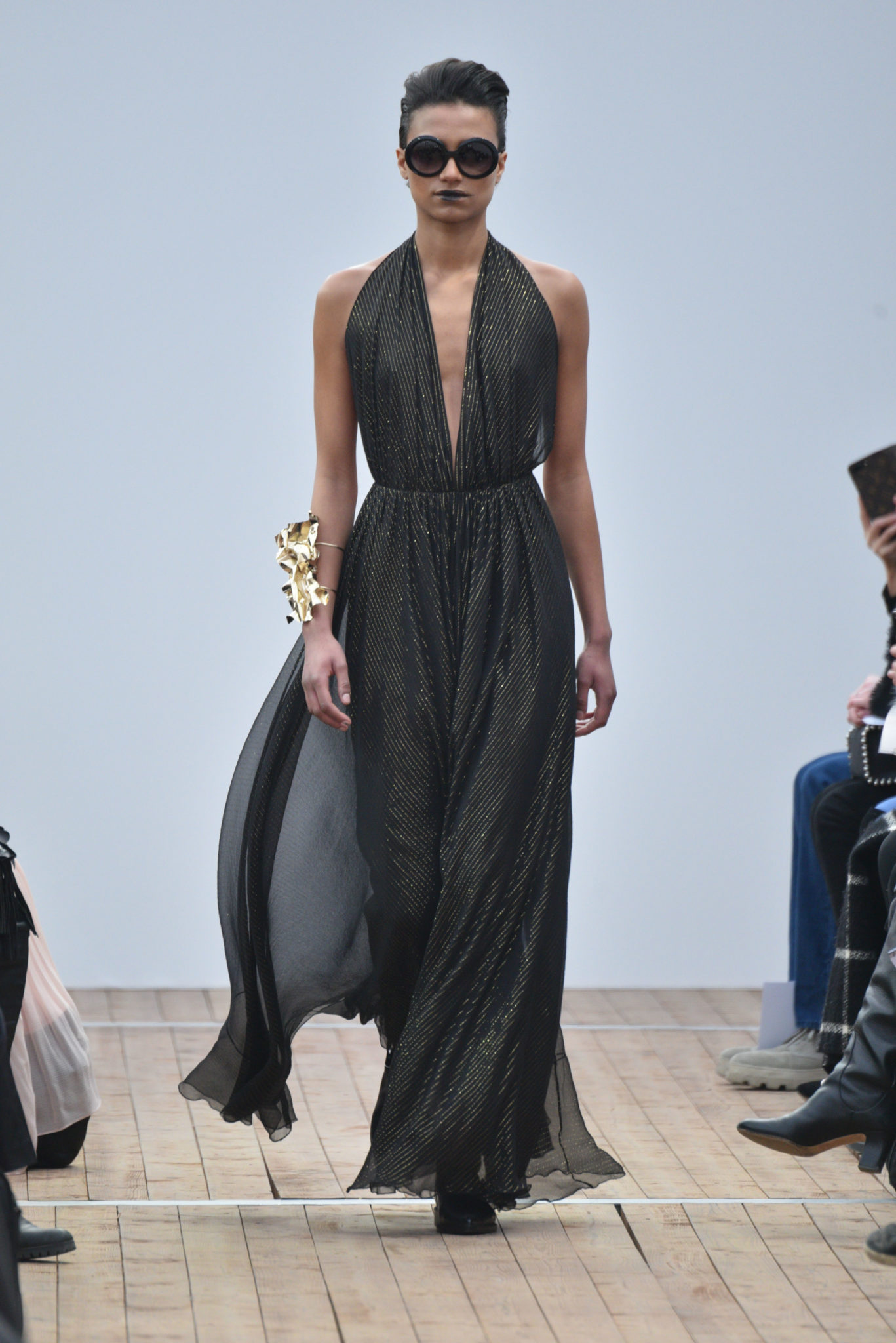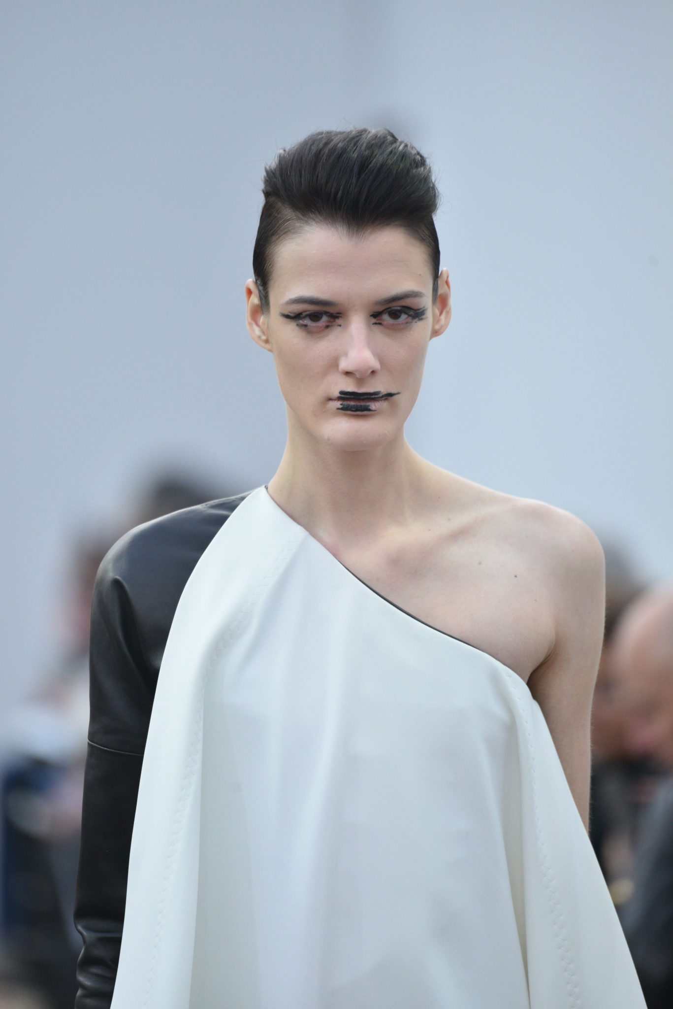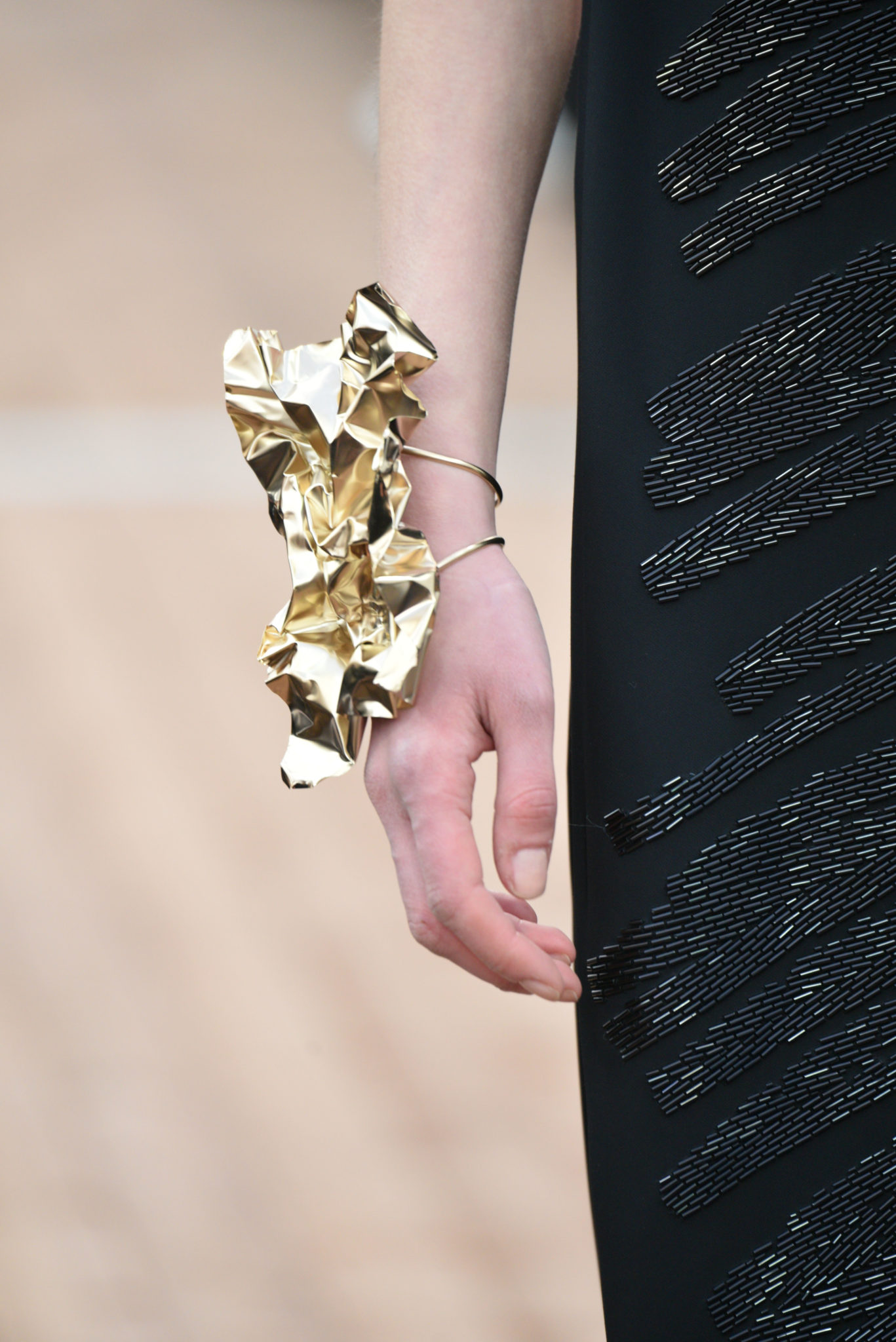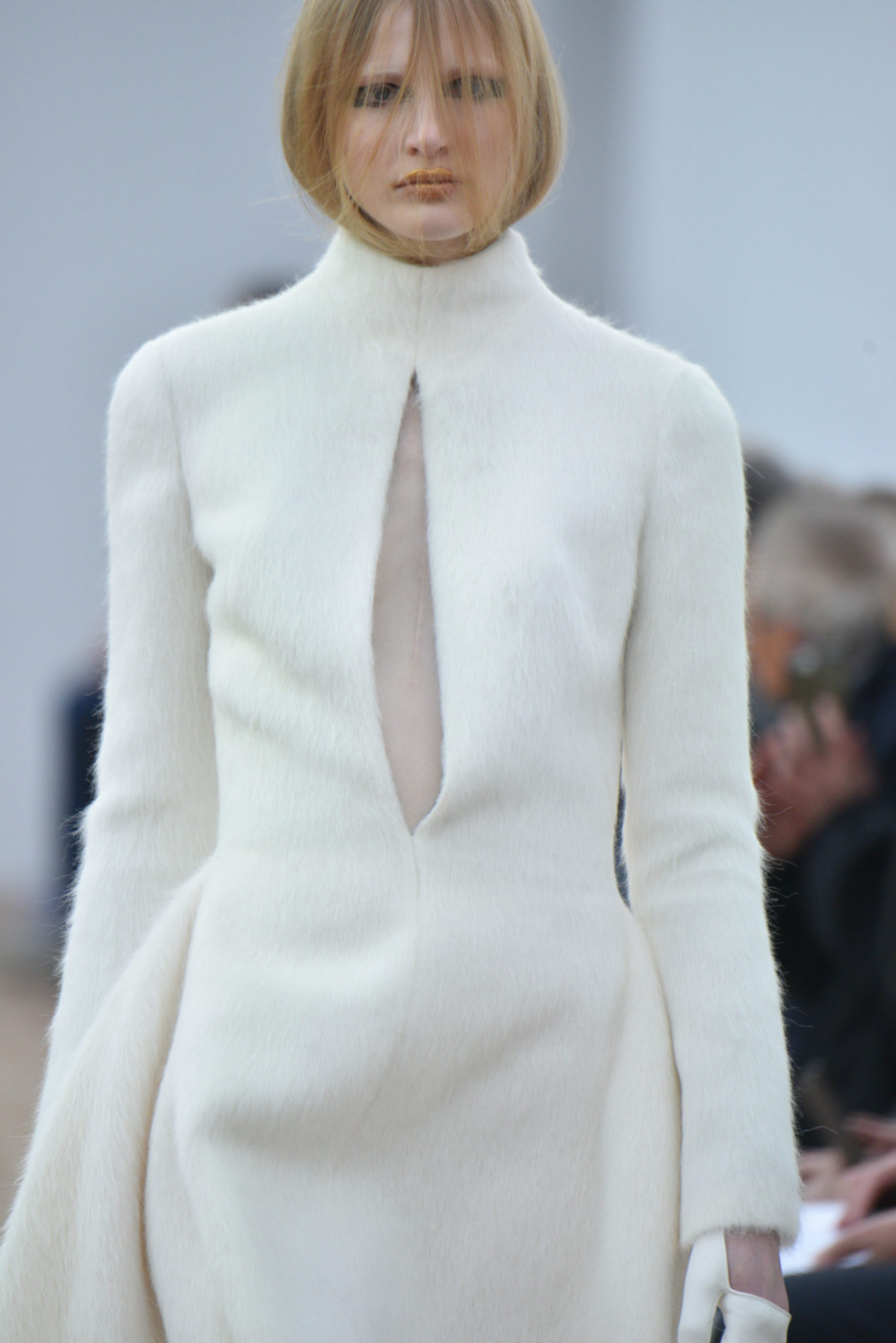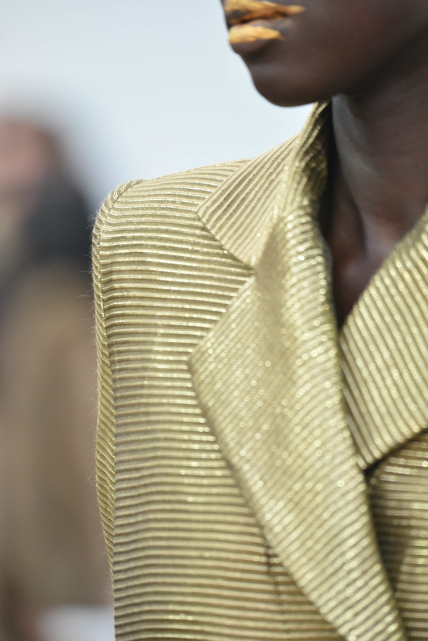 Cachemire zibeline, jersey compact, crêpe stretch imprimé « esquisse », poil de laine, carton lamé, néoprène contrecollé, cuir, mousseline rayures métal, « luminati », ruban de soie, broderies inachevées de baguettes de métal sont les supports de cette collection.