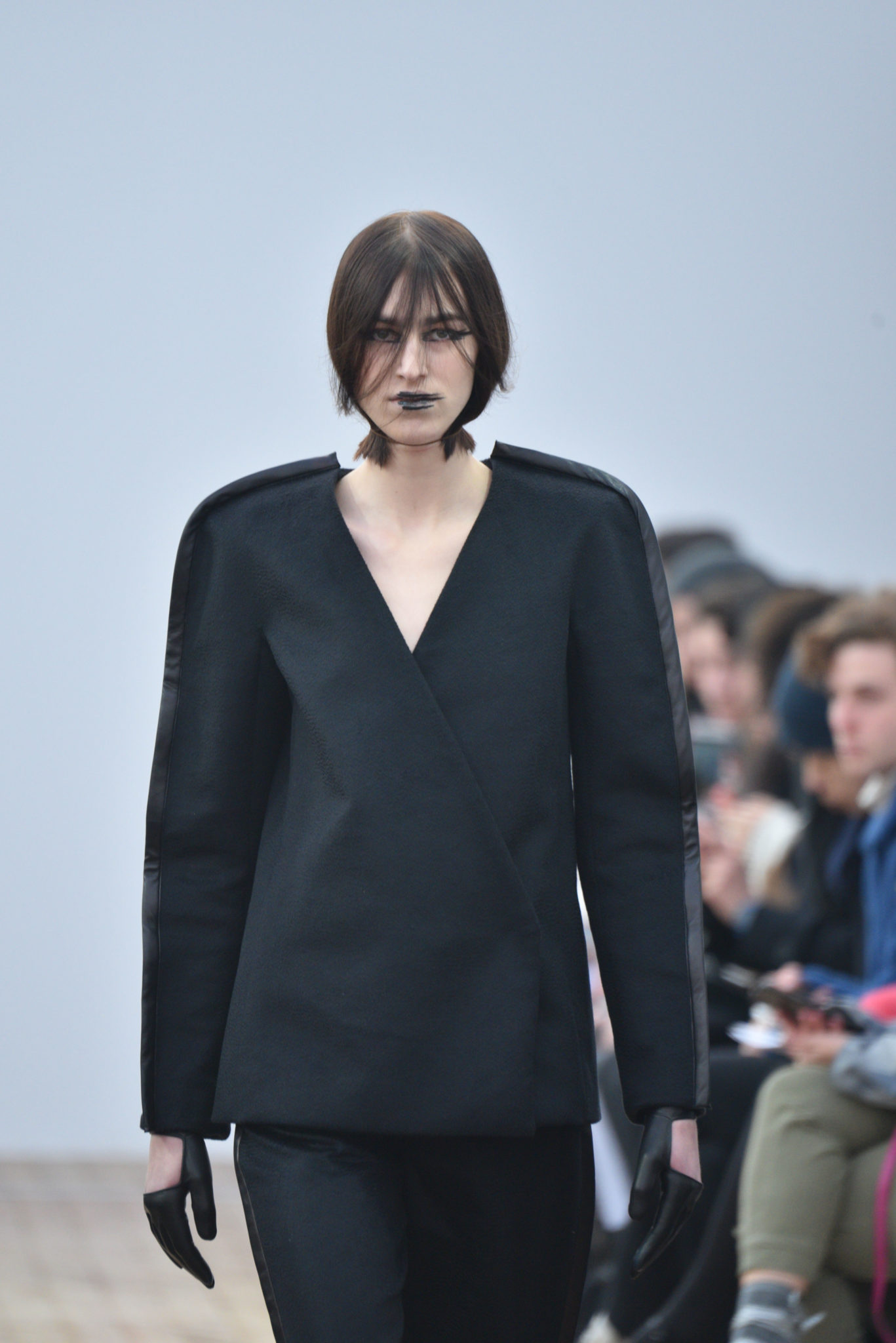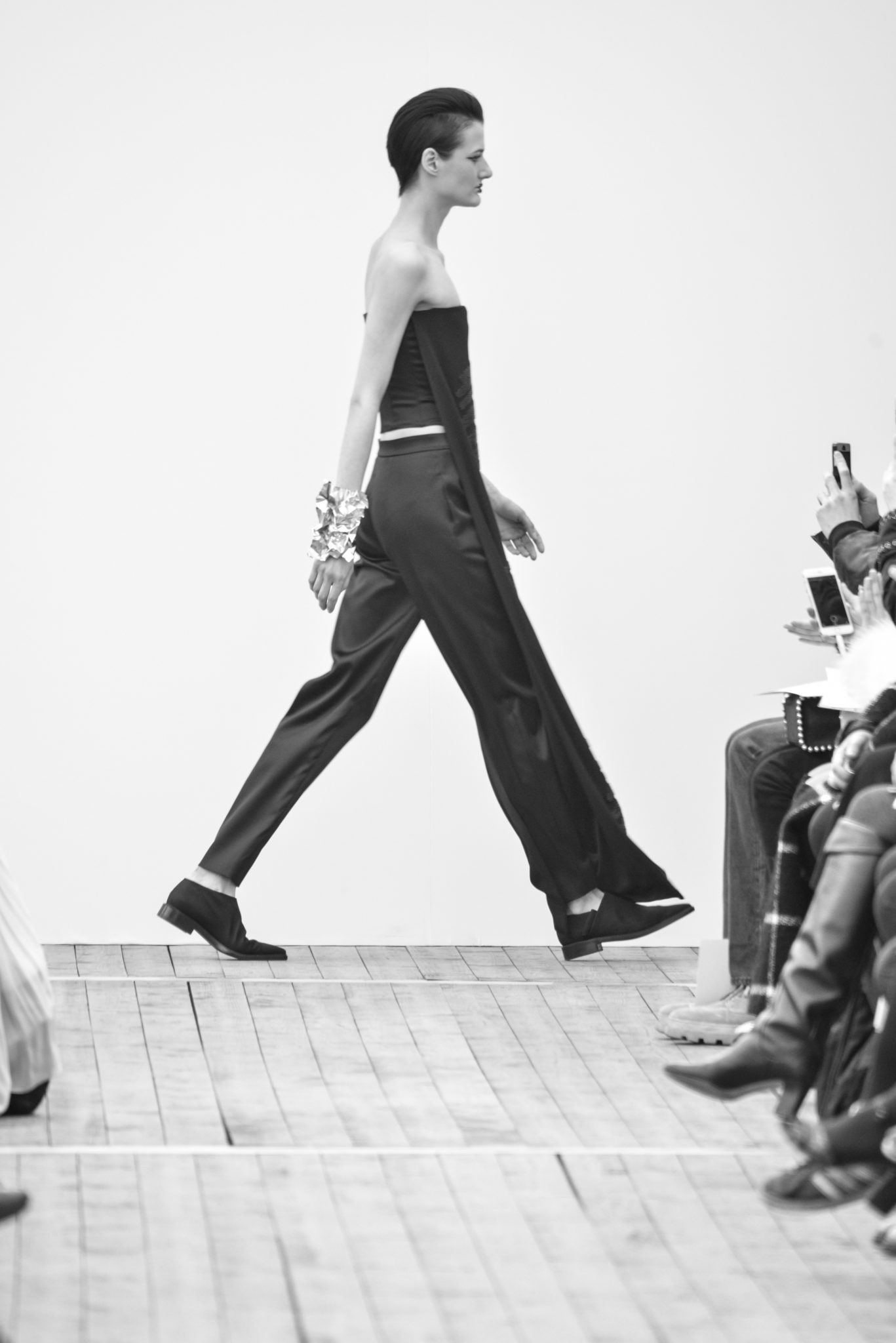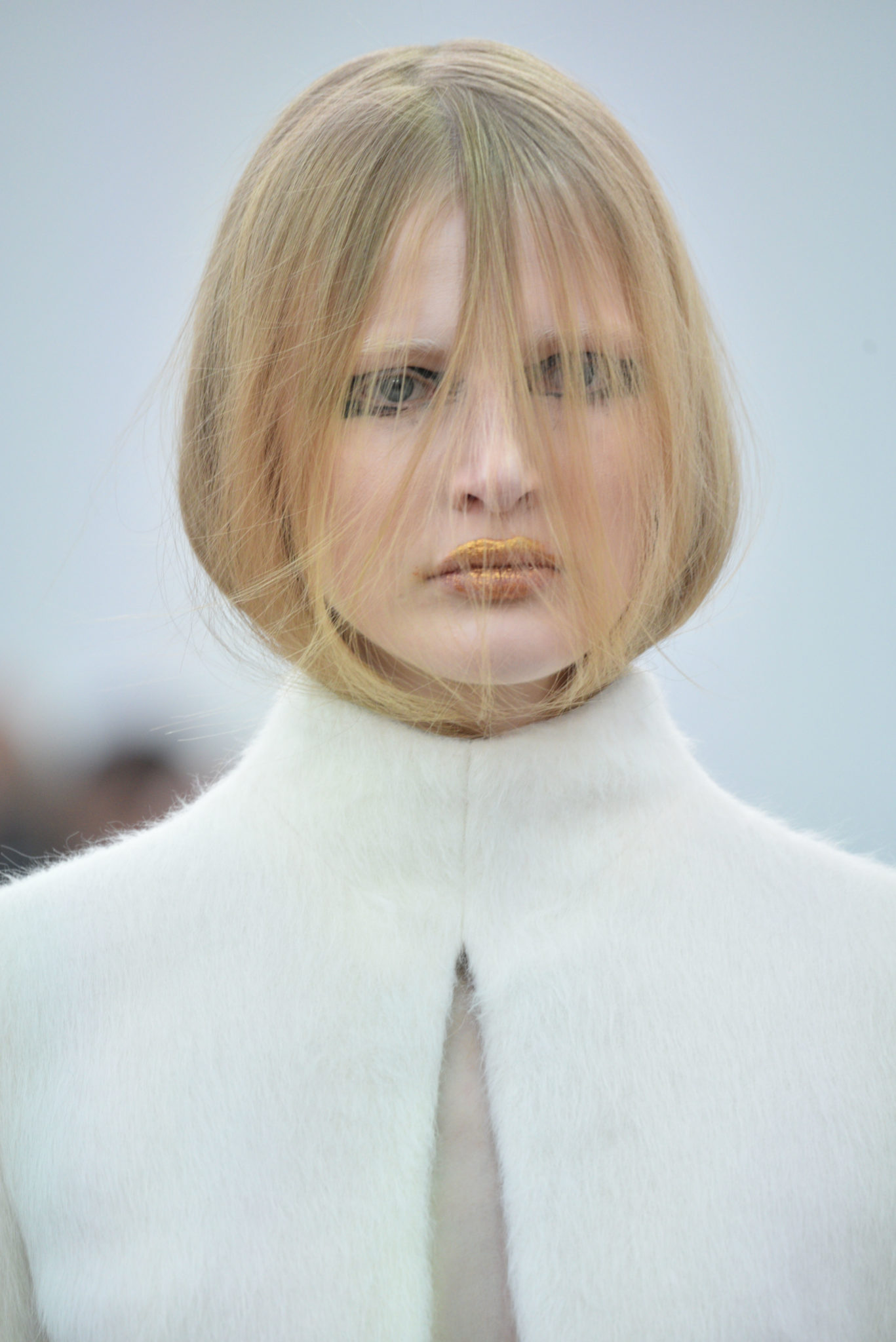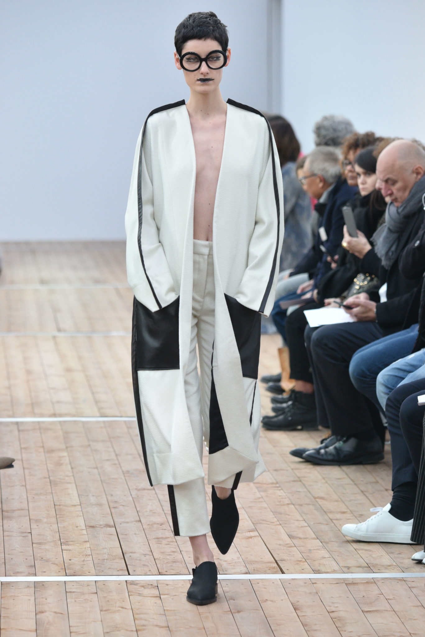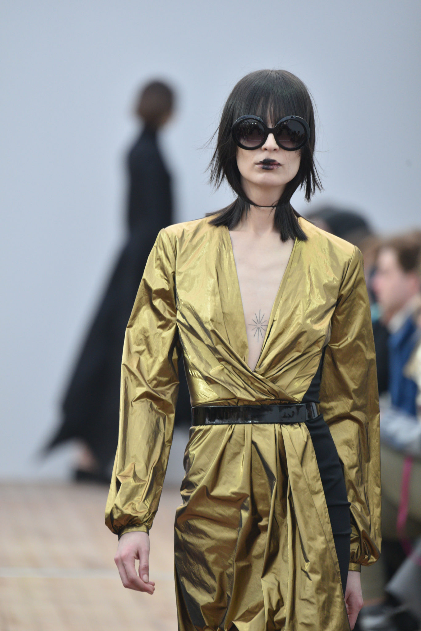 Cachemire zibeline, jersey compact, crêpe stretch imprimé « esquisse », poil de laine, carton lamé, néoprène contrecollé, cuir, mousseline rayures métal, « luminati », ruban de soie, broderies inachevées de baguettes de métal sont les supports de cette collection.