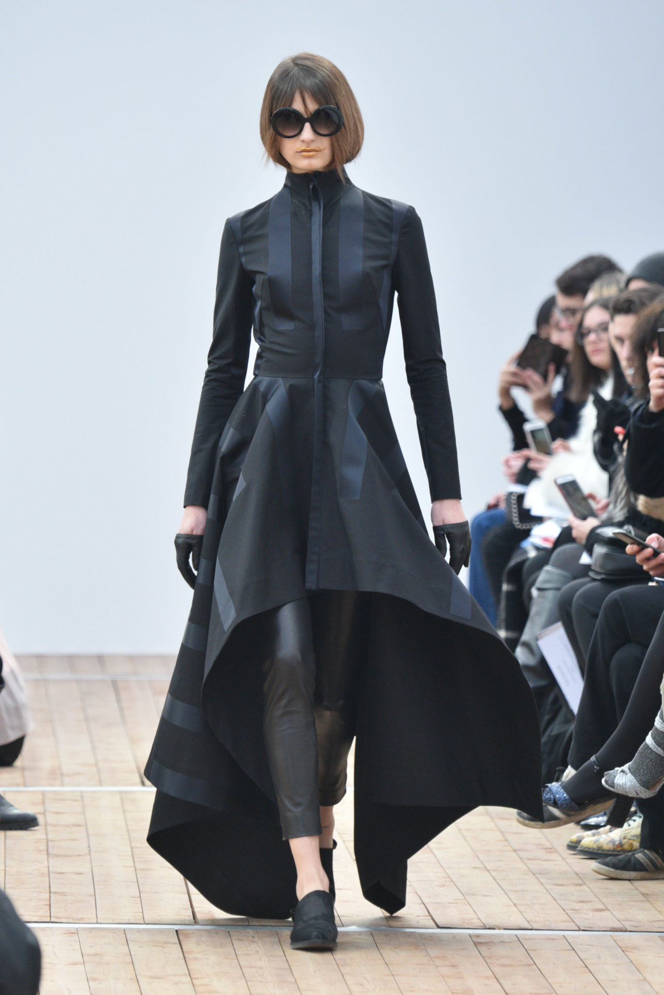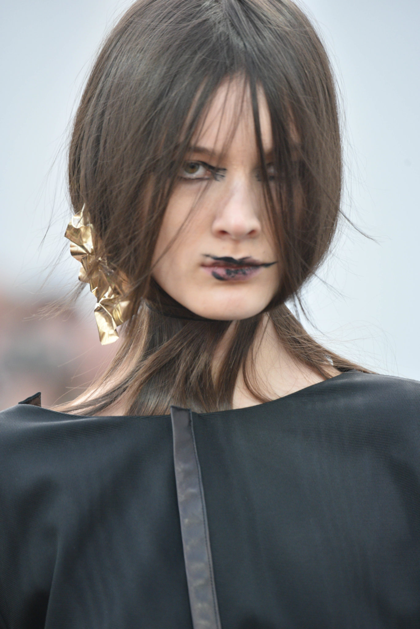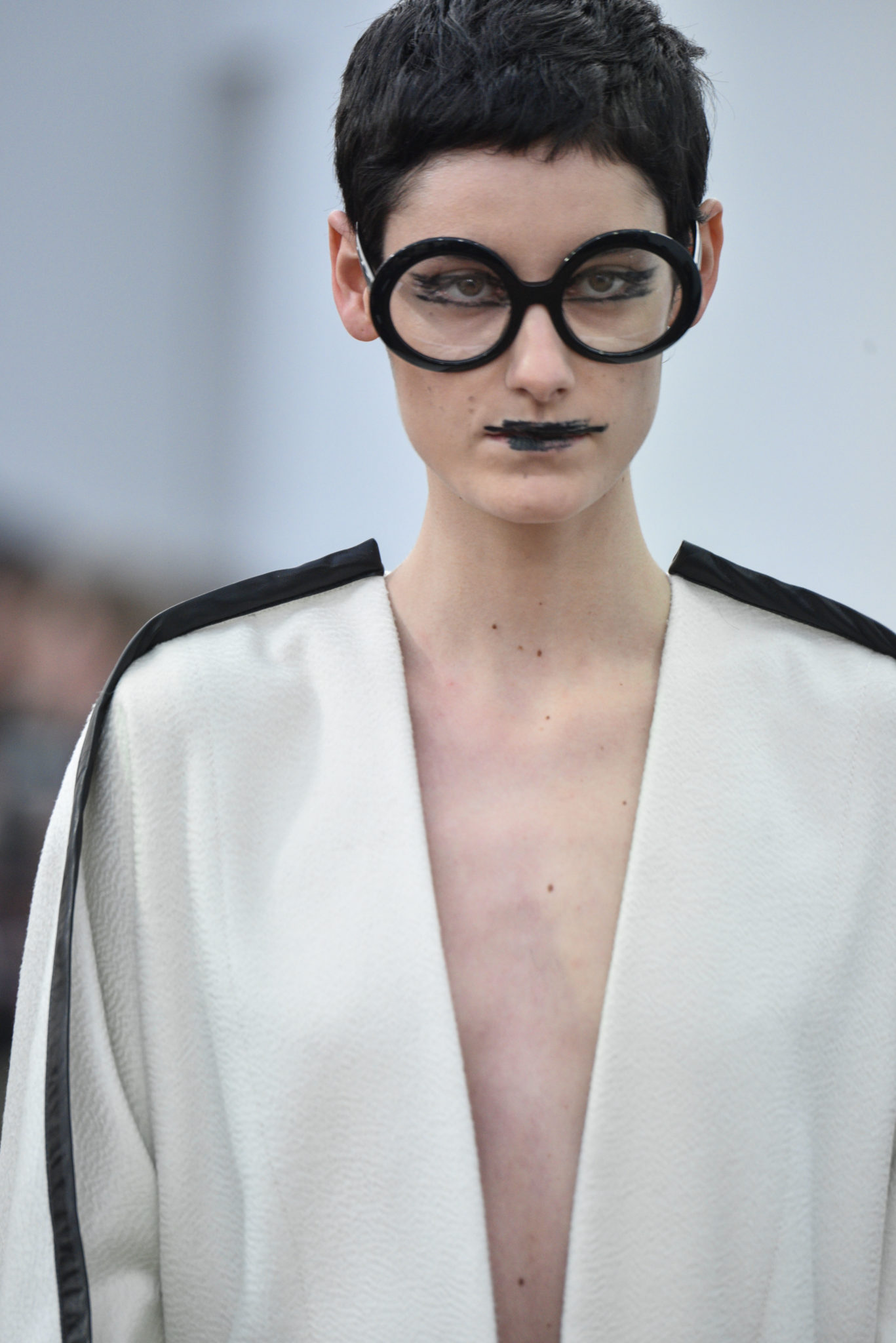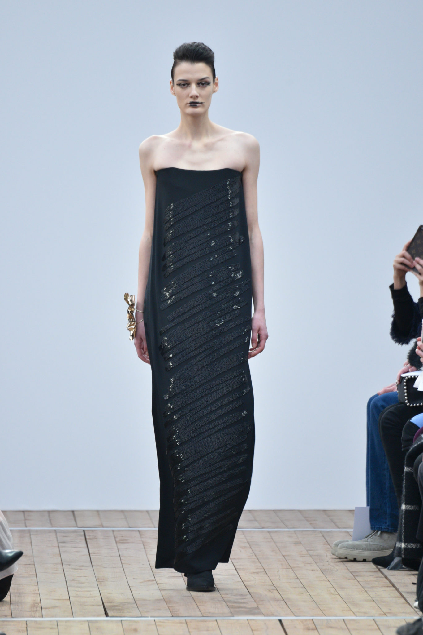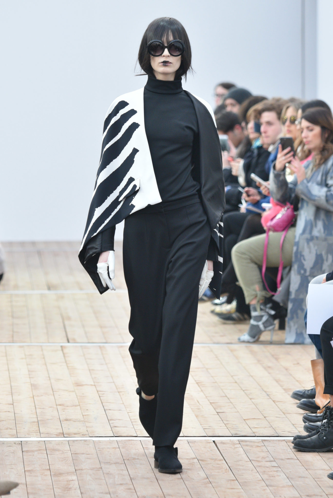 Cachemire zibeline, jersey compact, crêpe stretch imprimé « esquisse », poil de laine, carton lamé, néoprène contrecollé, cuir, mousseline rayures métal, « luminati », ruban de soie, broderies inachevées de baguettes de métal sont les supports de cette collection.