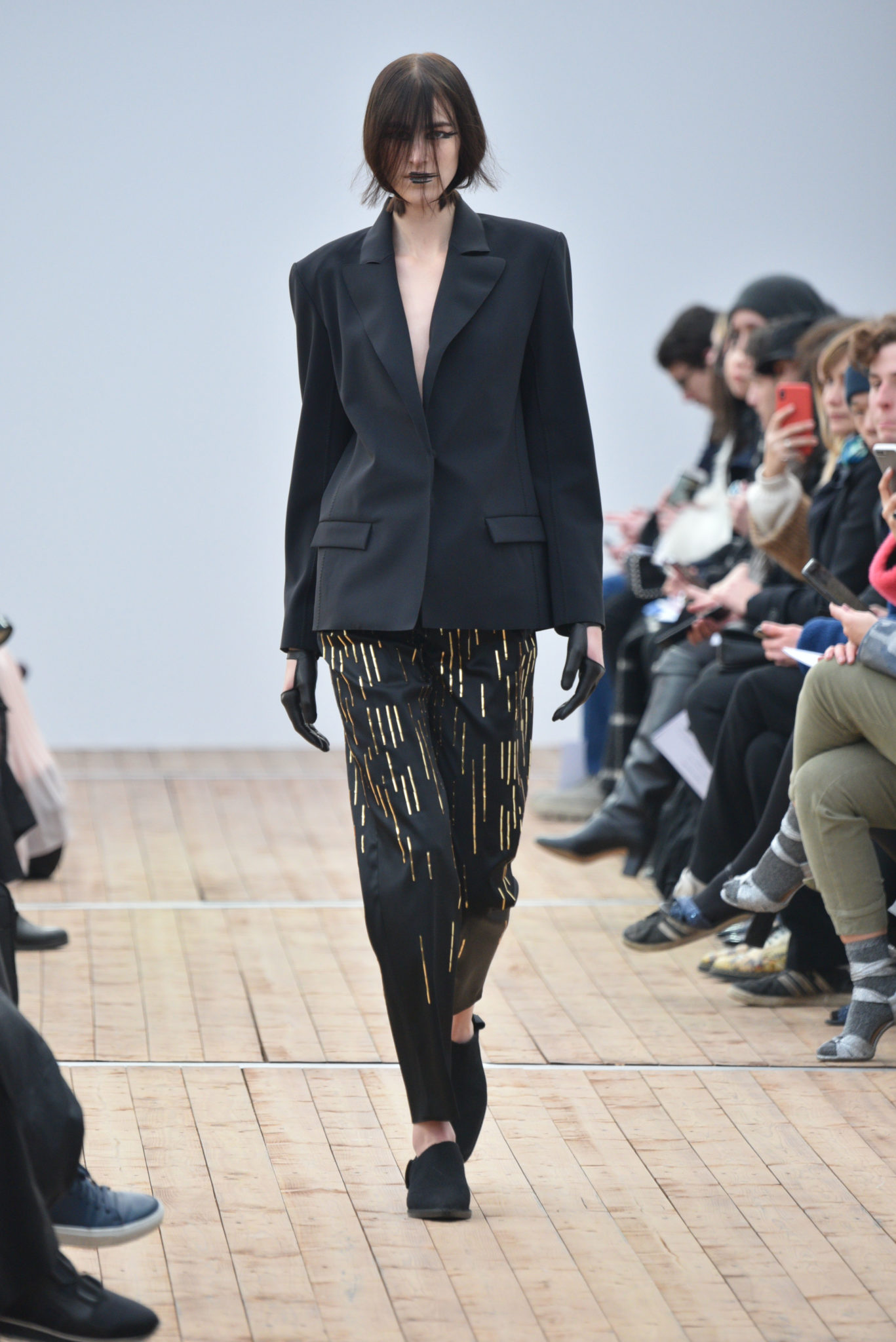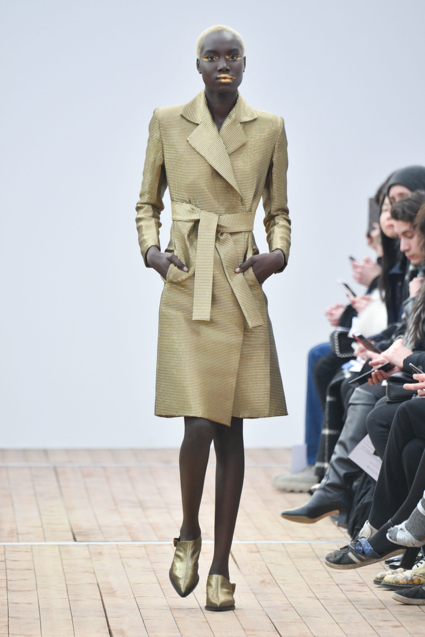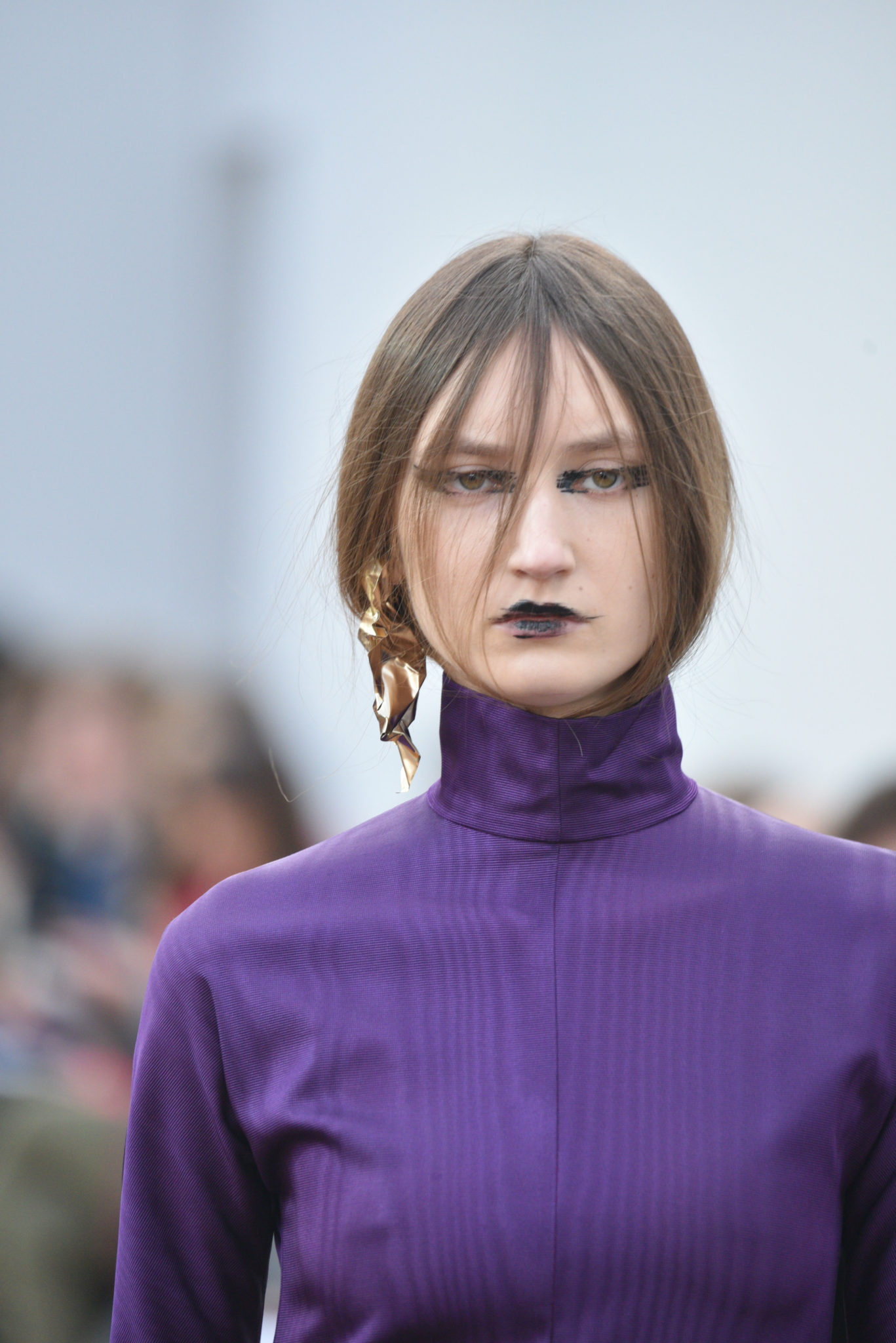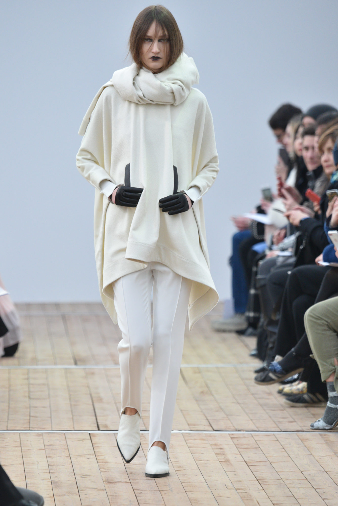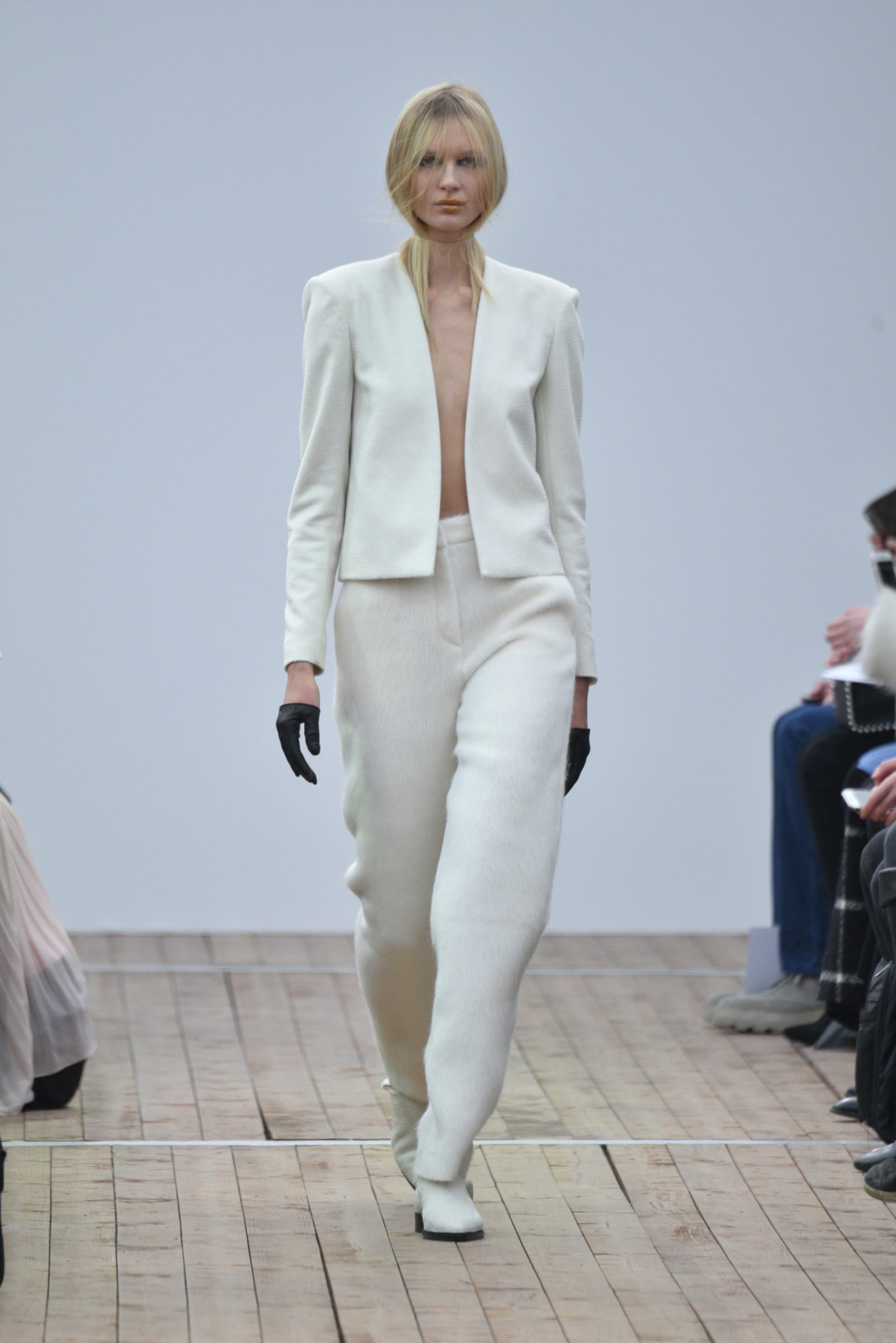 Cachemire zibeline, jersey compact, crêpe stretch imprimé « esquisse », poil de laine, carton lamé, néoprène contrecollé, cuir, mousseline rayures métal, « luminati », ruban de soie, broderies inachevées de baguettes de métal sont les supports de cette collection.