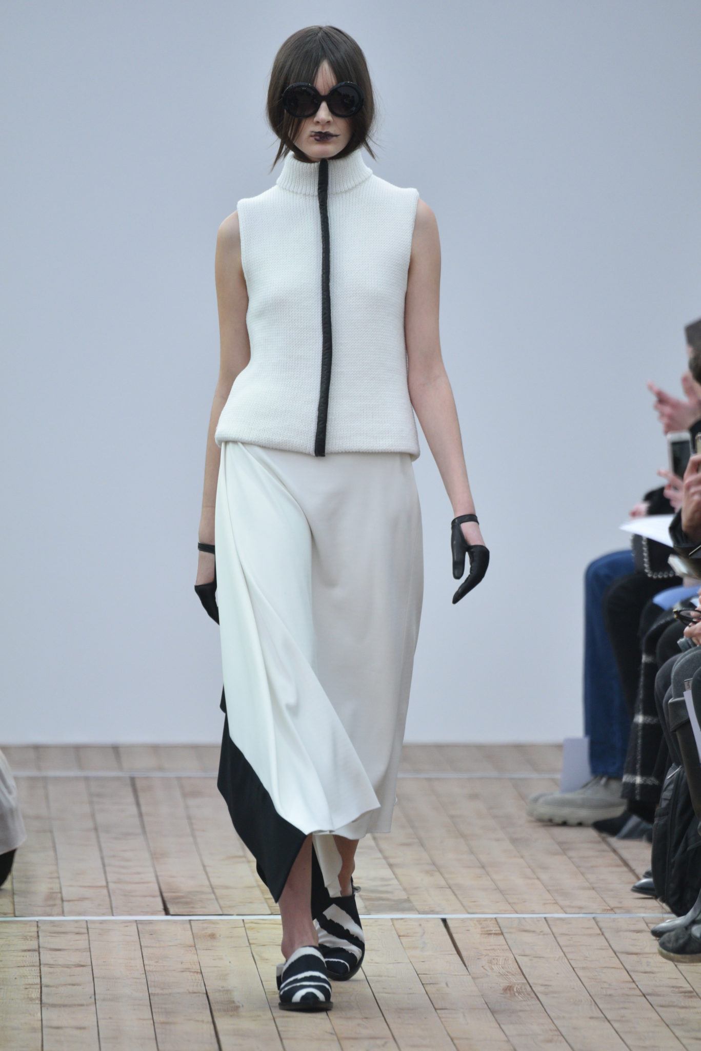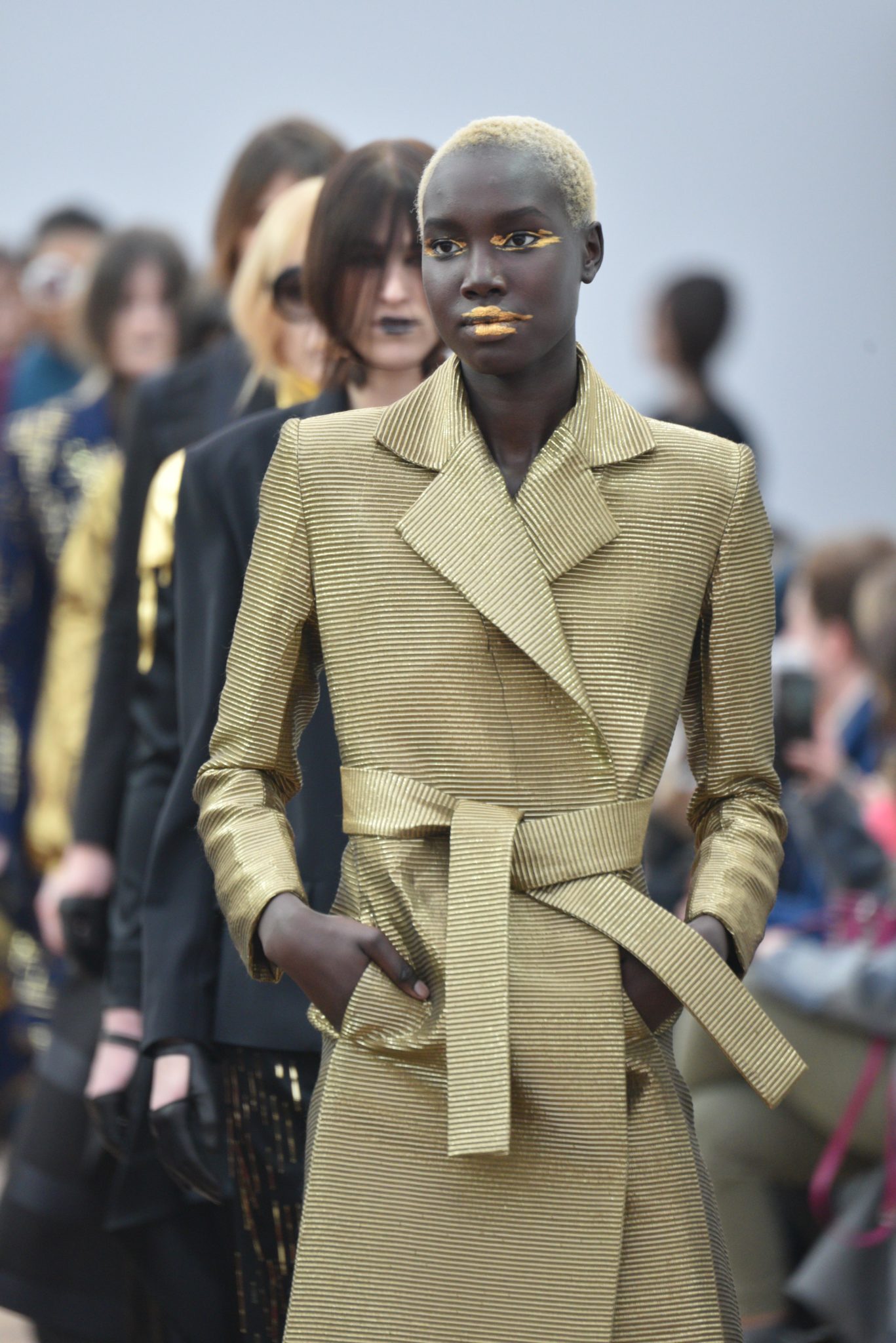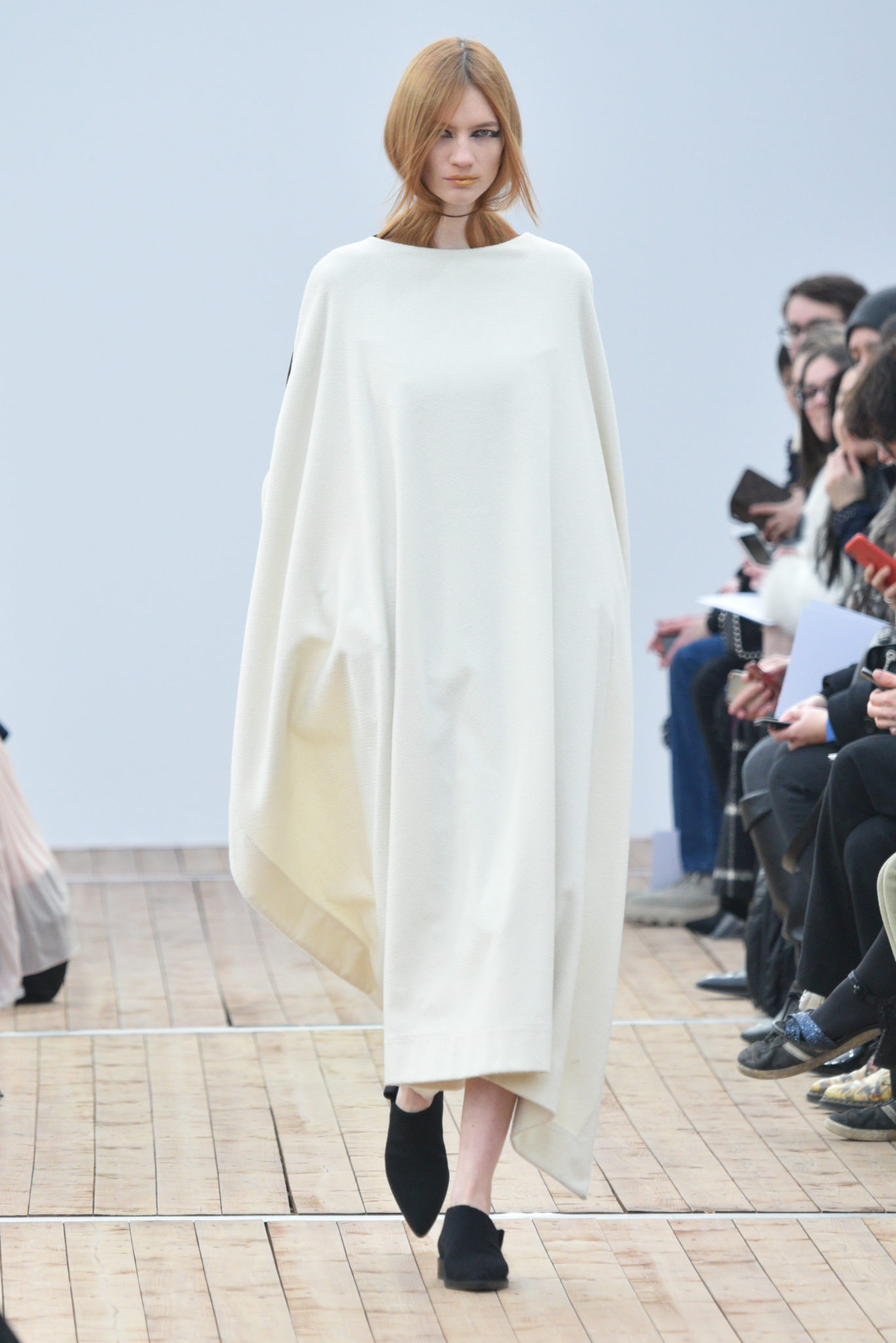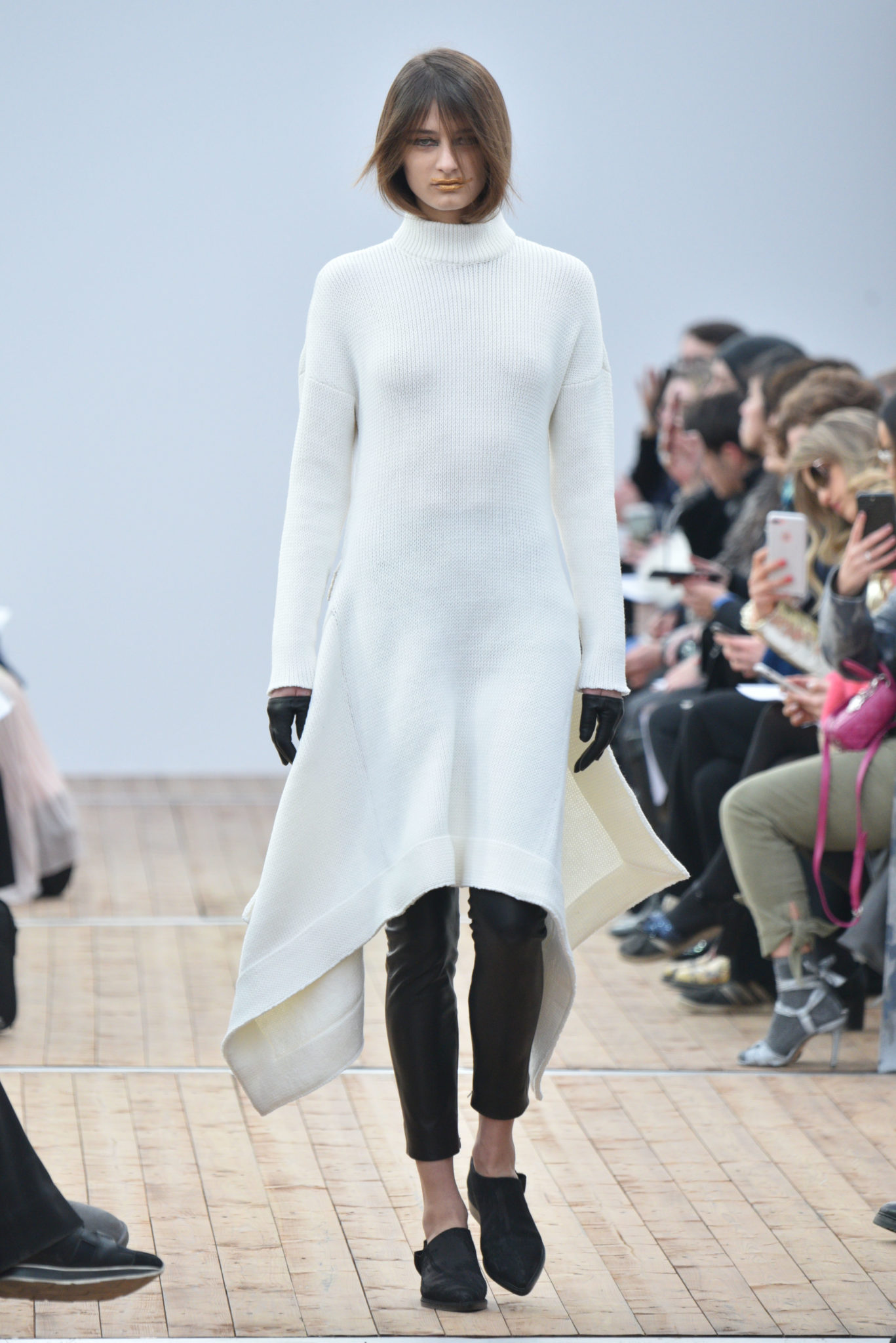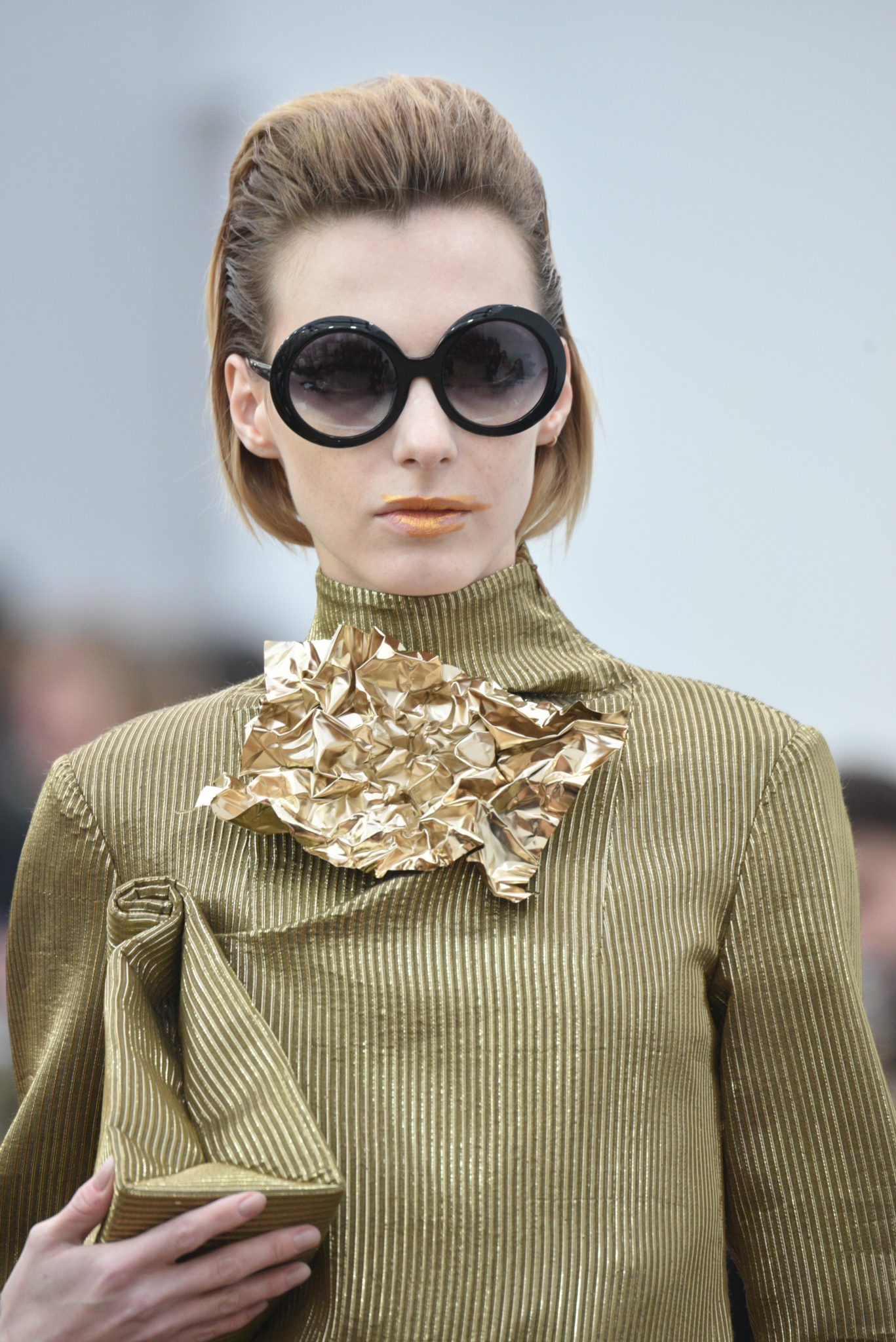 Cachemire zibeline, jersey compact, crêpe stretch imprimé « esquisse », poil de laine, carton lamé, néoprène contrecollé, cuir, mousseline rayures métal, « luminati », ruban de soie, broderies inachevées de baguettes de métal sont les supports de cette collection.