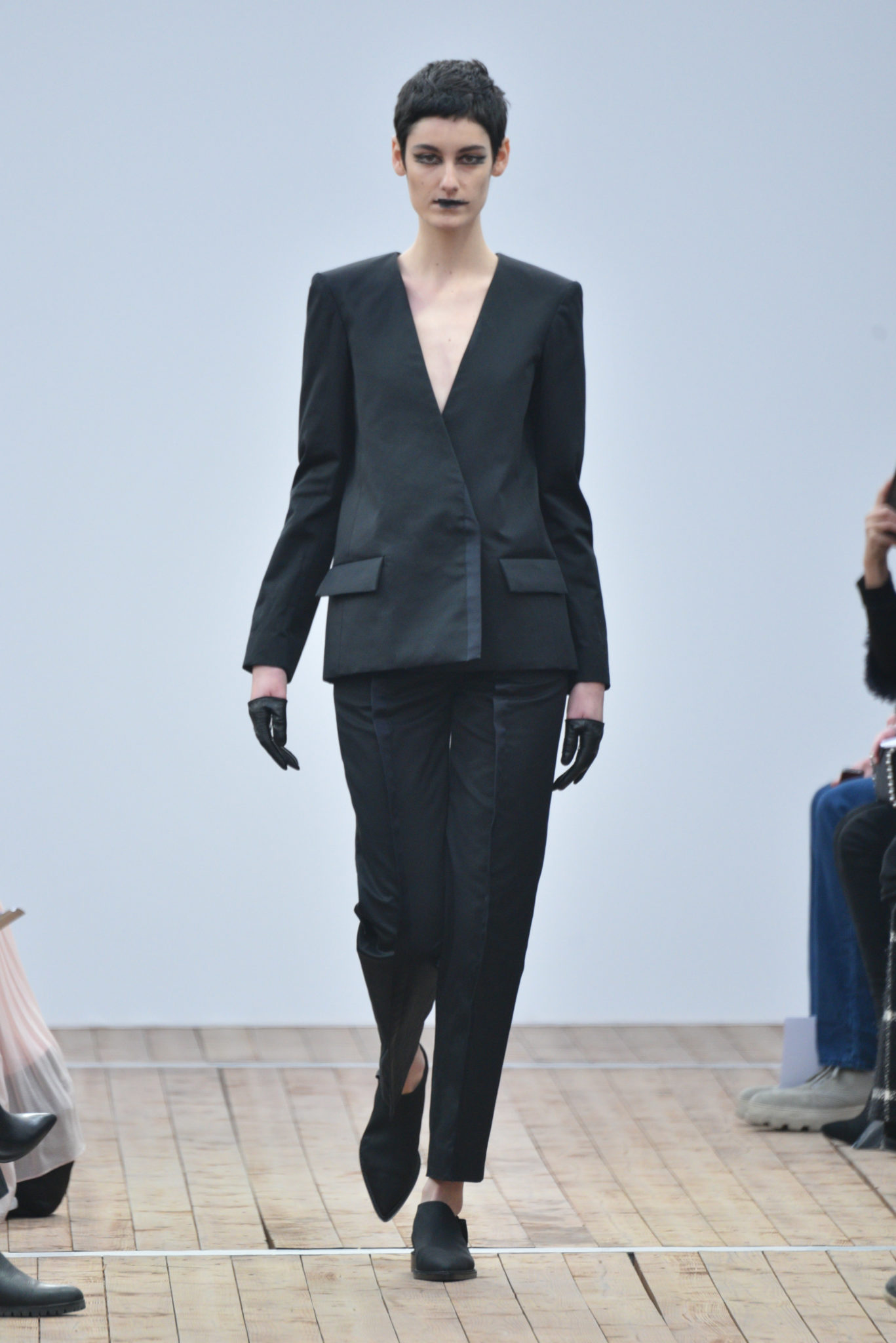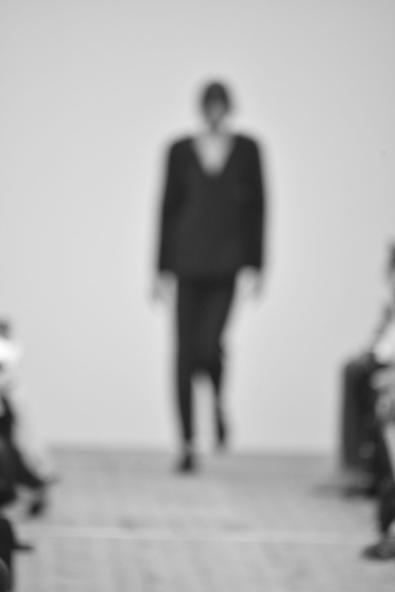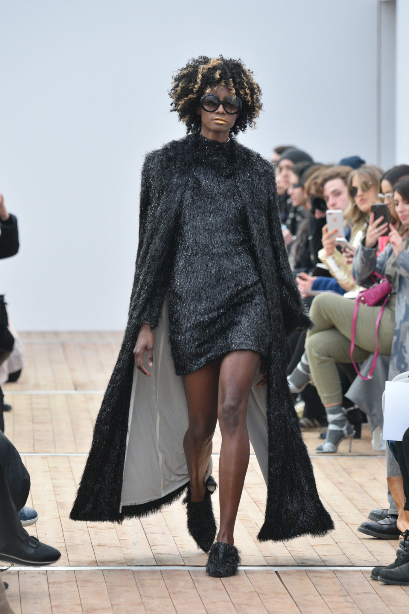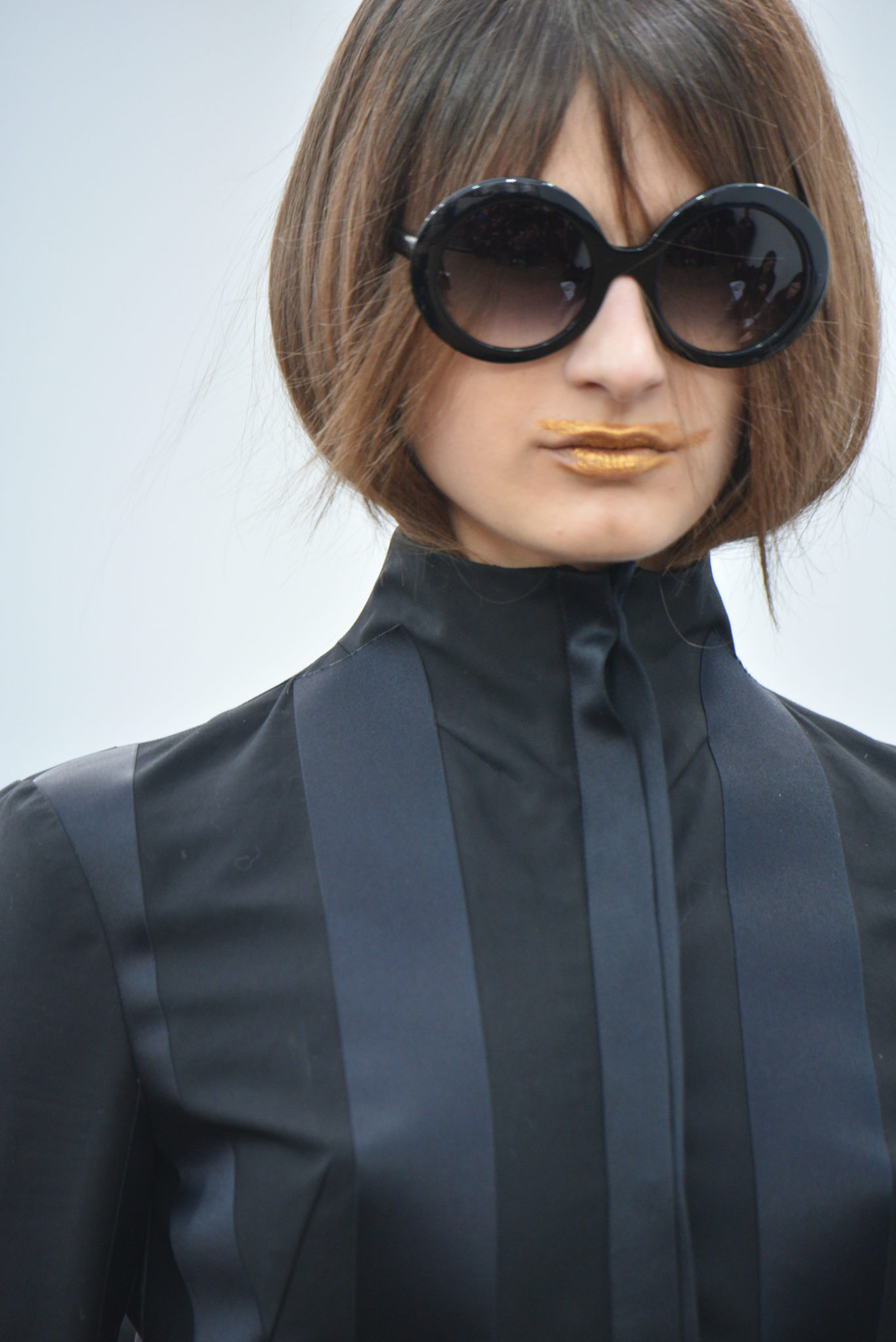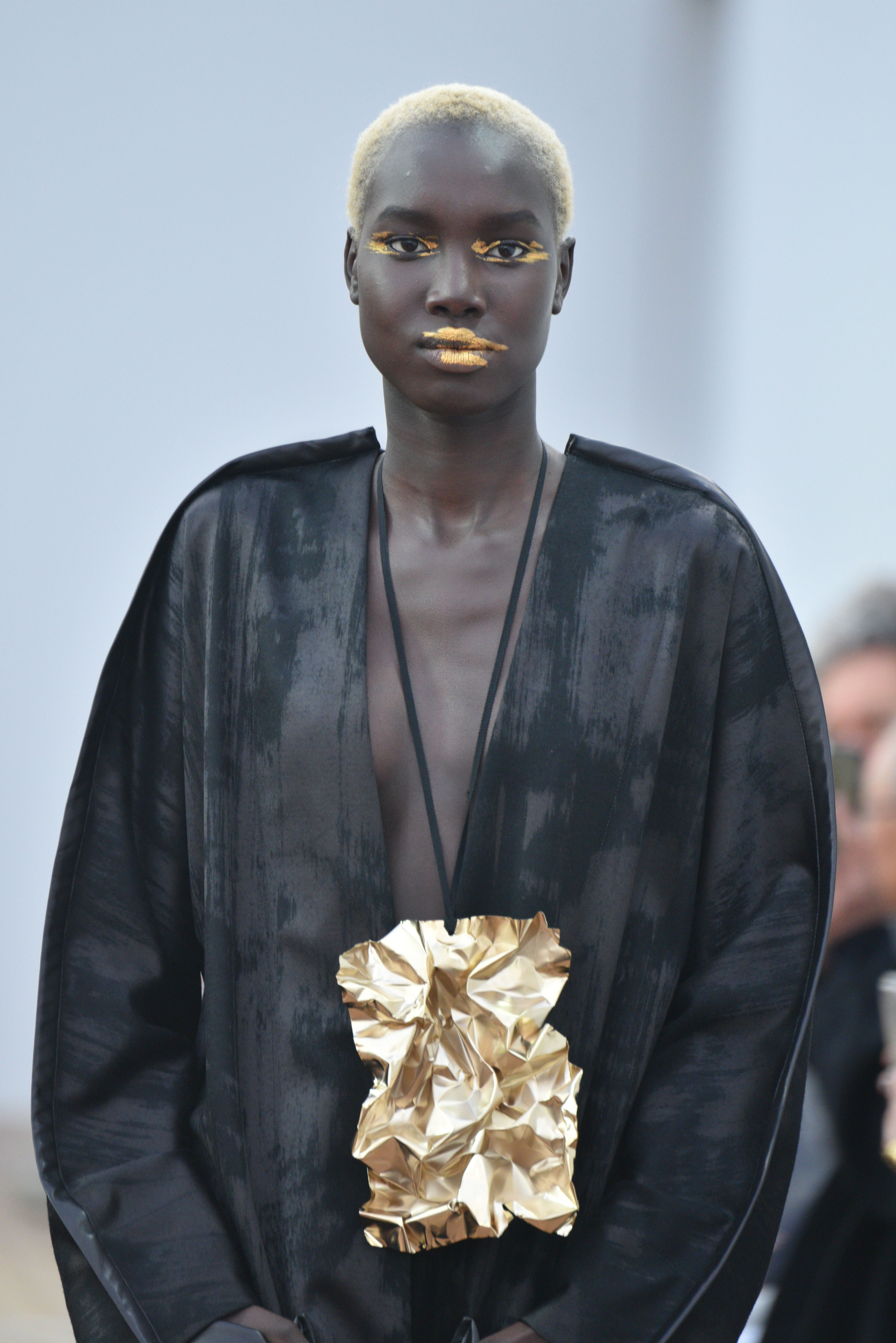 Cachemire zibeline, jersey compact, crêpe stretch imprimé « esquisse », poil de laine, carton lamé, néoprène contrecollé, cuir, mousseline rayures métal, « luminati », ruban de soie, broderies inachevées de baguettes de métal sont les supports de cette collection.